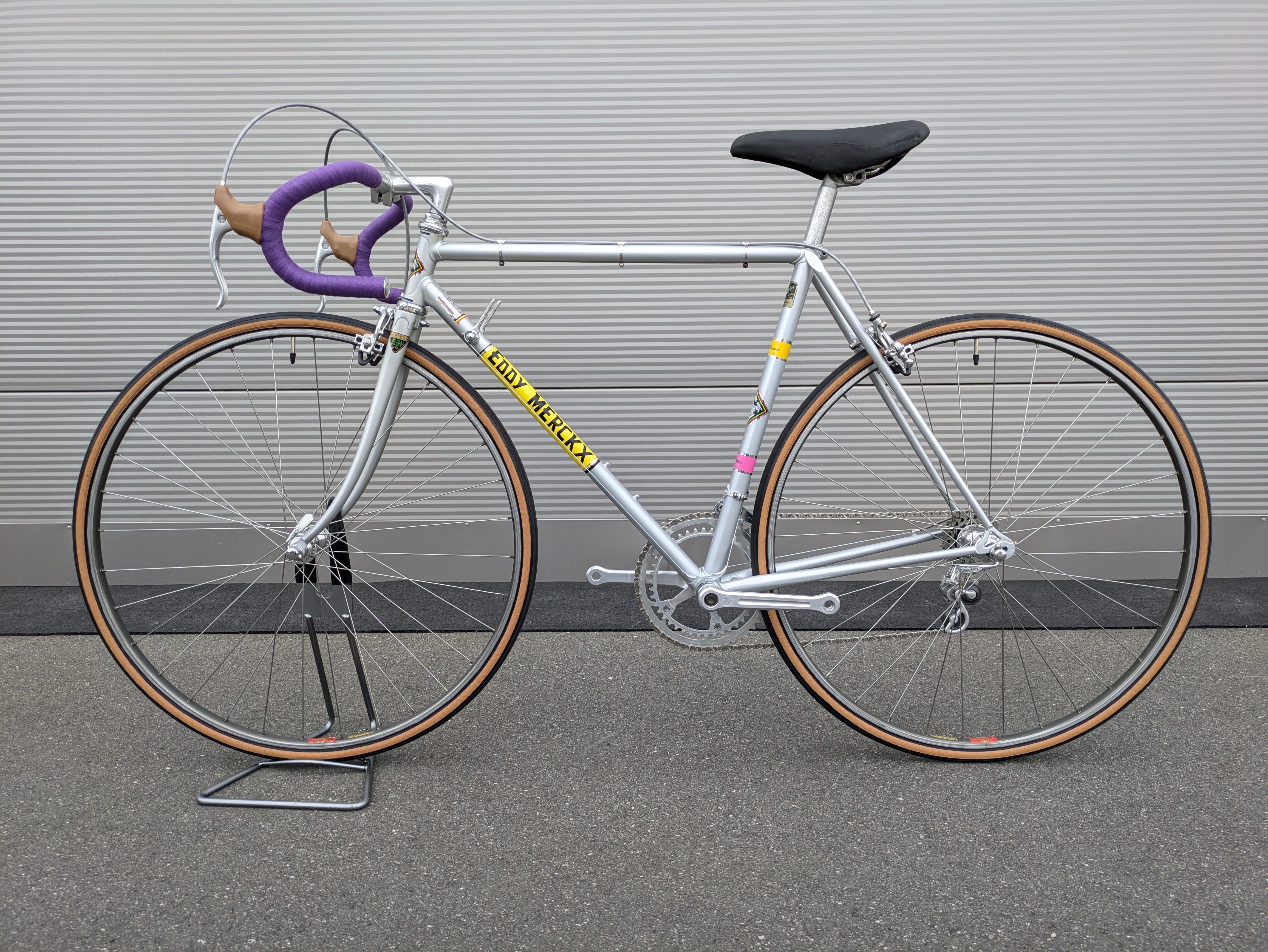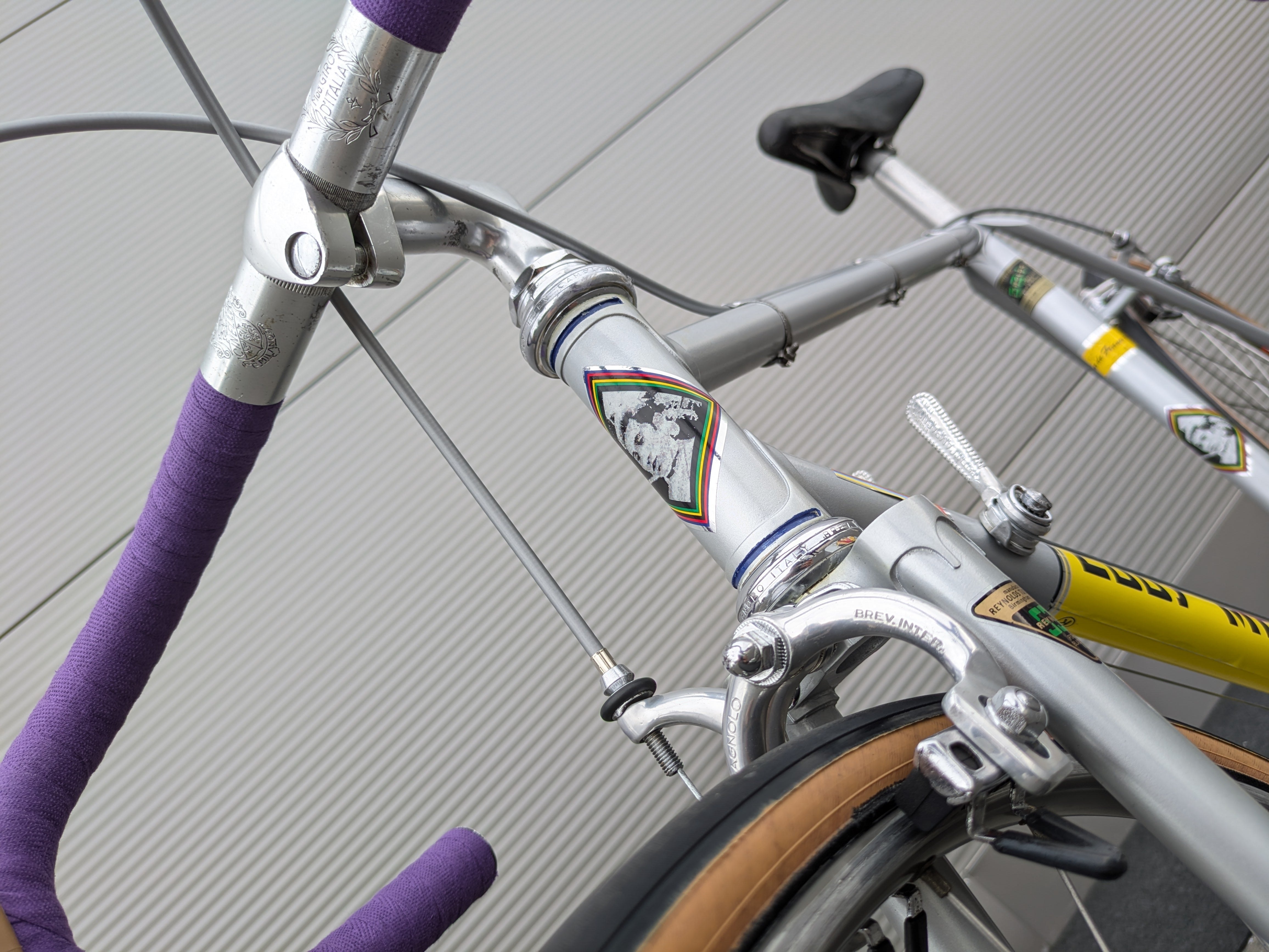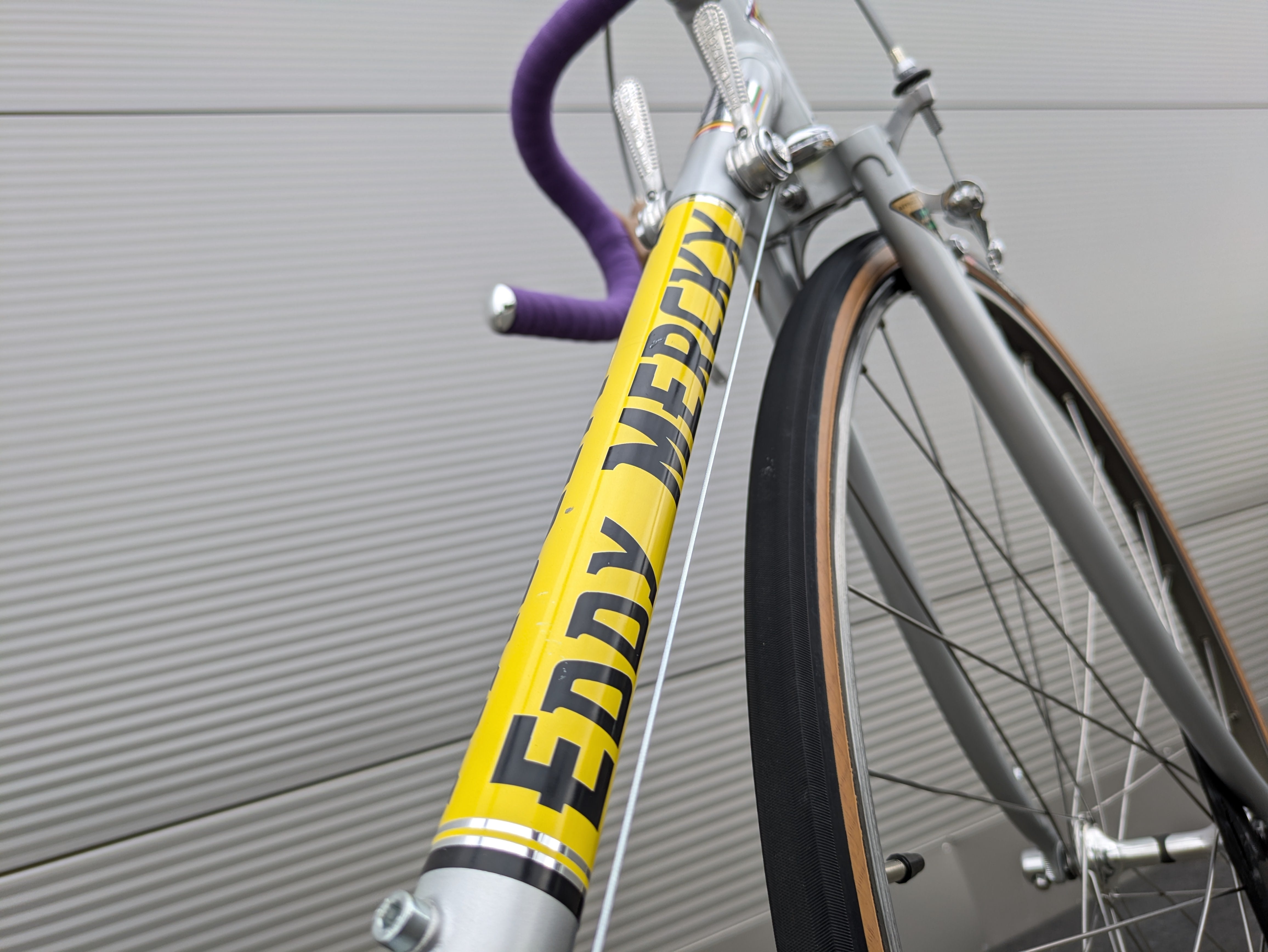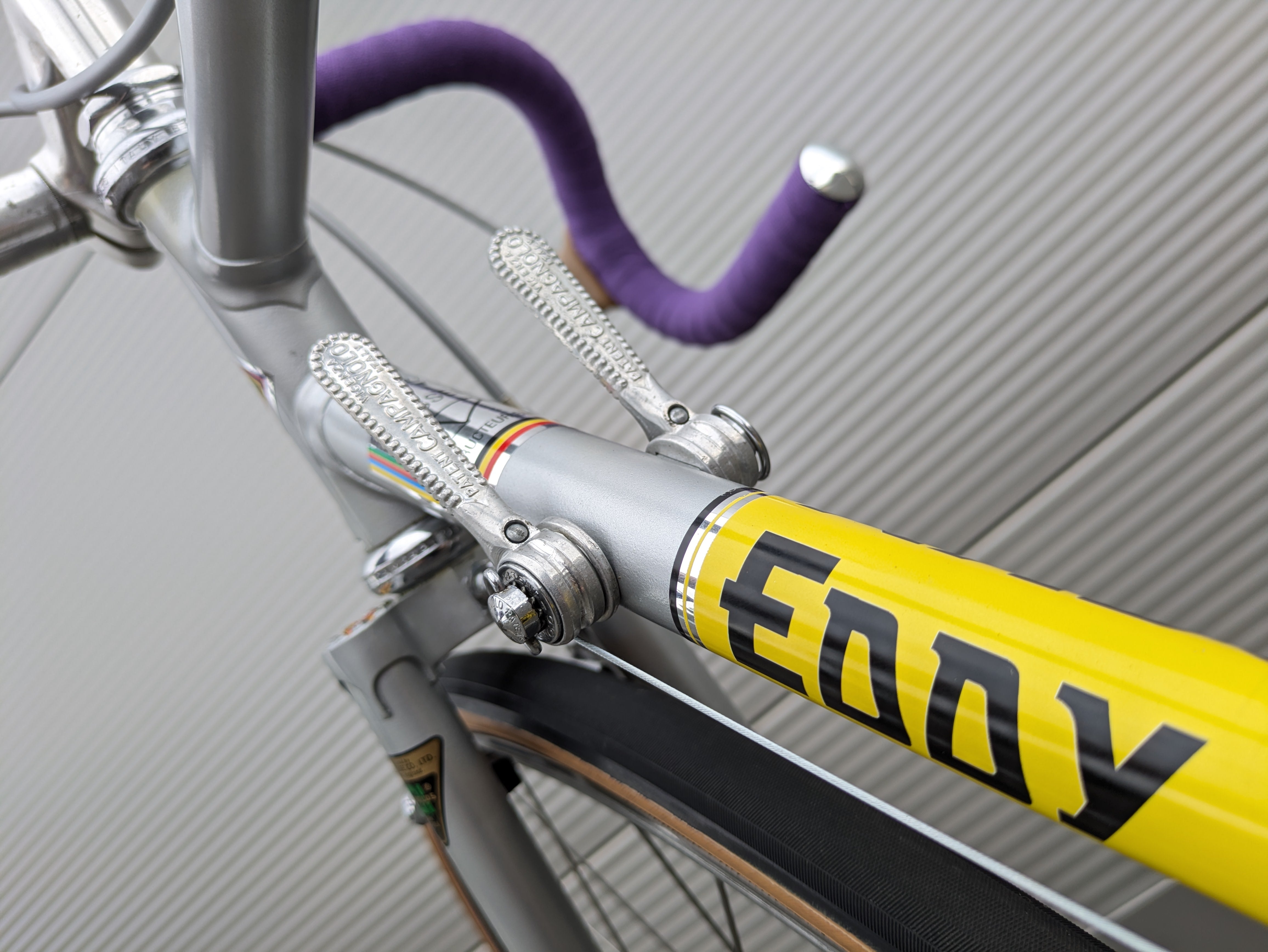 A true late-1970s team look: a slim, brazed steel frame with classic racing geometry, built by Kessels and badged as an Eddy Merckx Team C&A. Characteristic of premium frames of this era are the cleanly finished lugs, elegant fork crown, and precise alignment—responsive under acceleration, direct in handling, and stable at speed. Many period-correct Kessels/Merckx frames were constructed from Reynolds 531 tubing, with geometry clearly designed for racing and endurance.