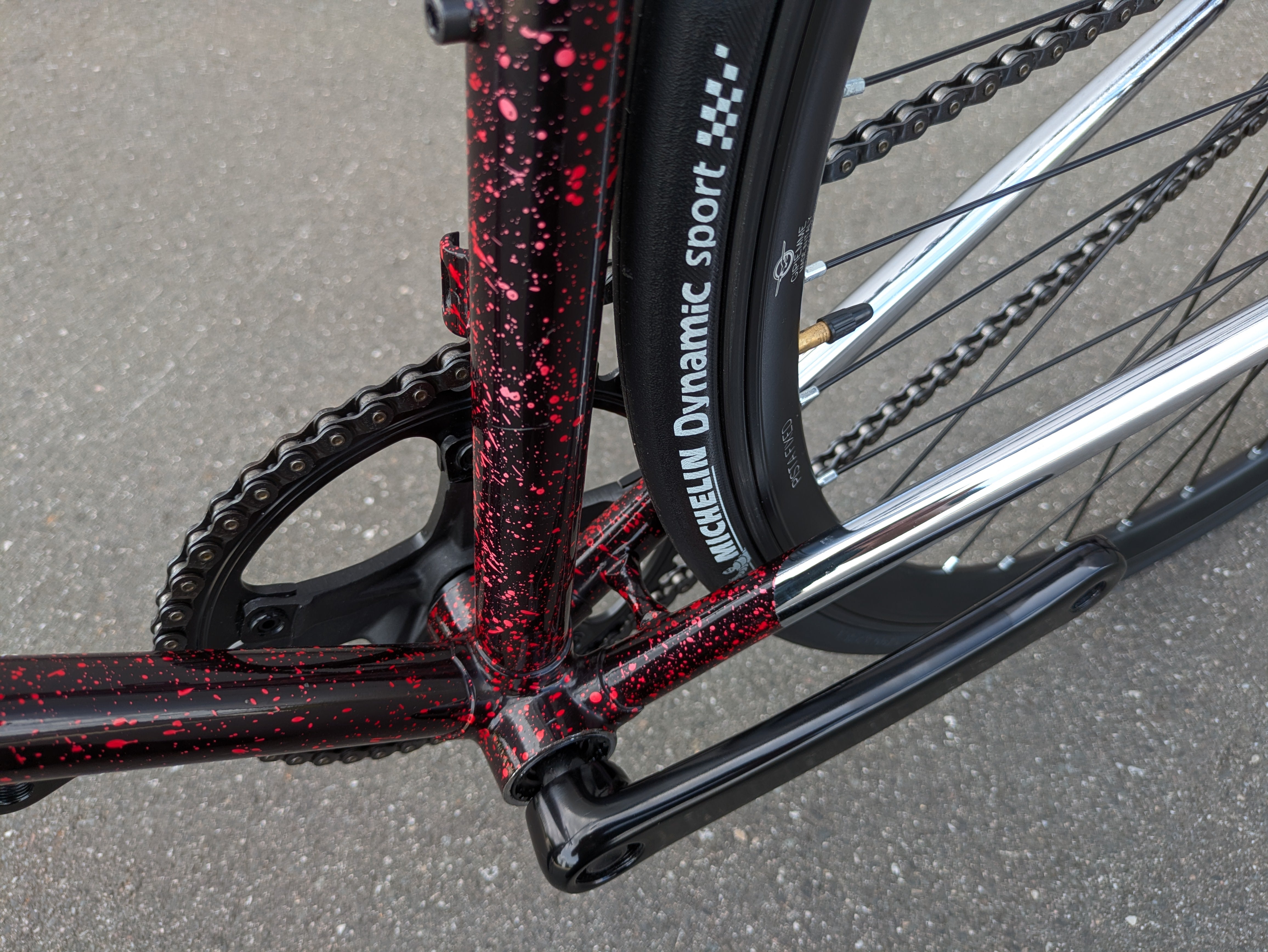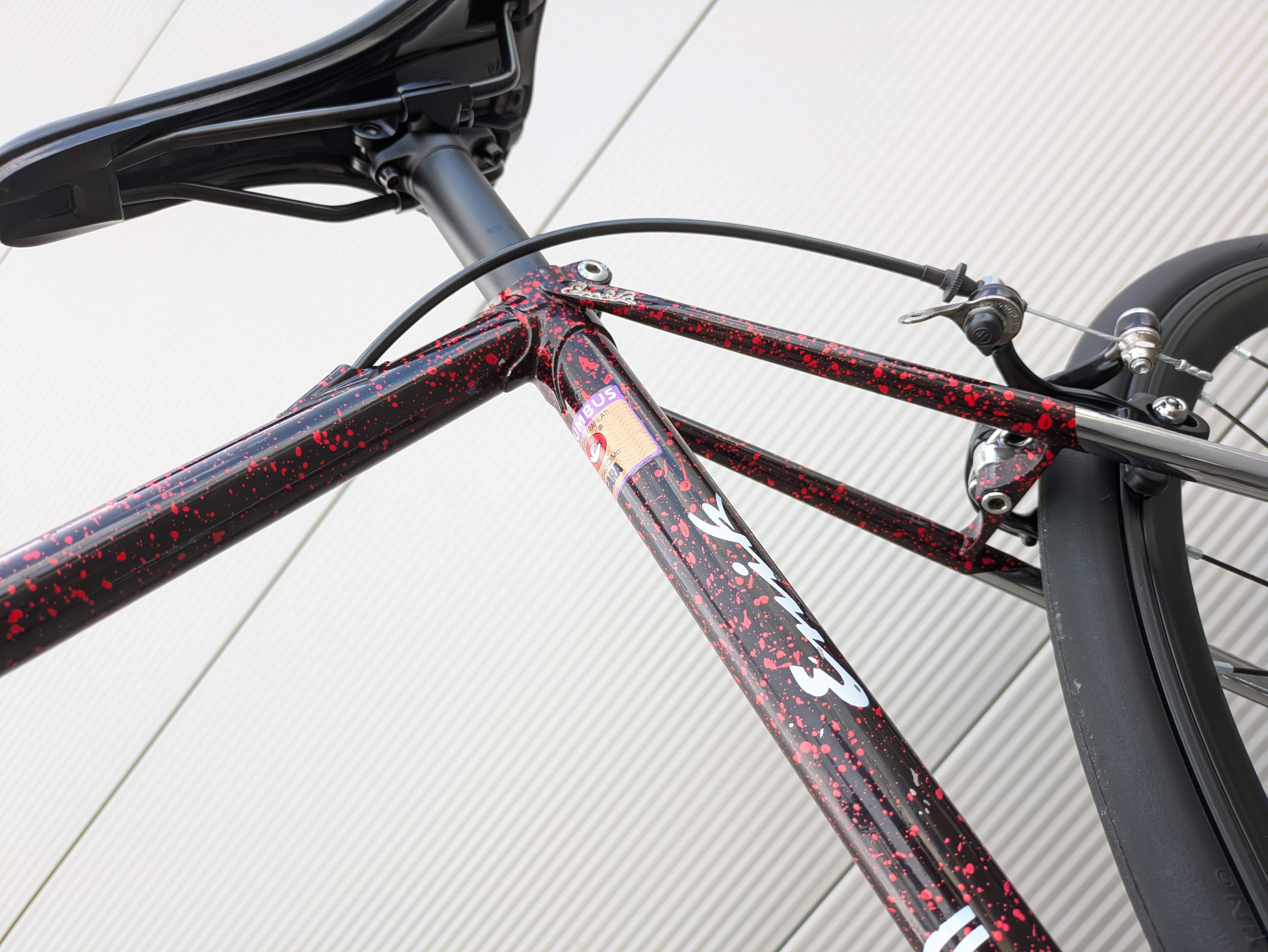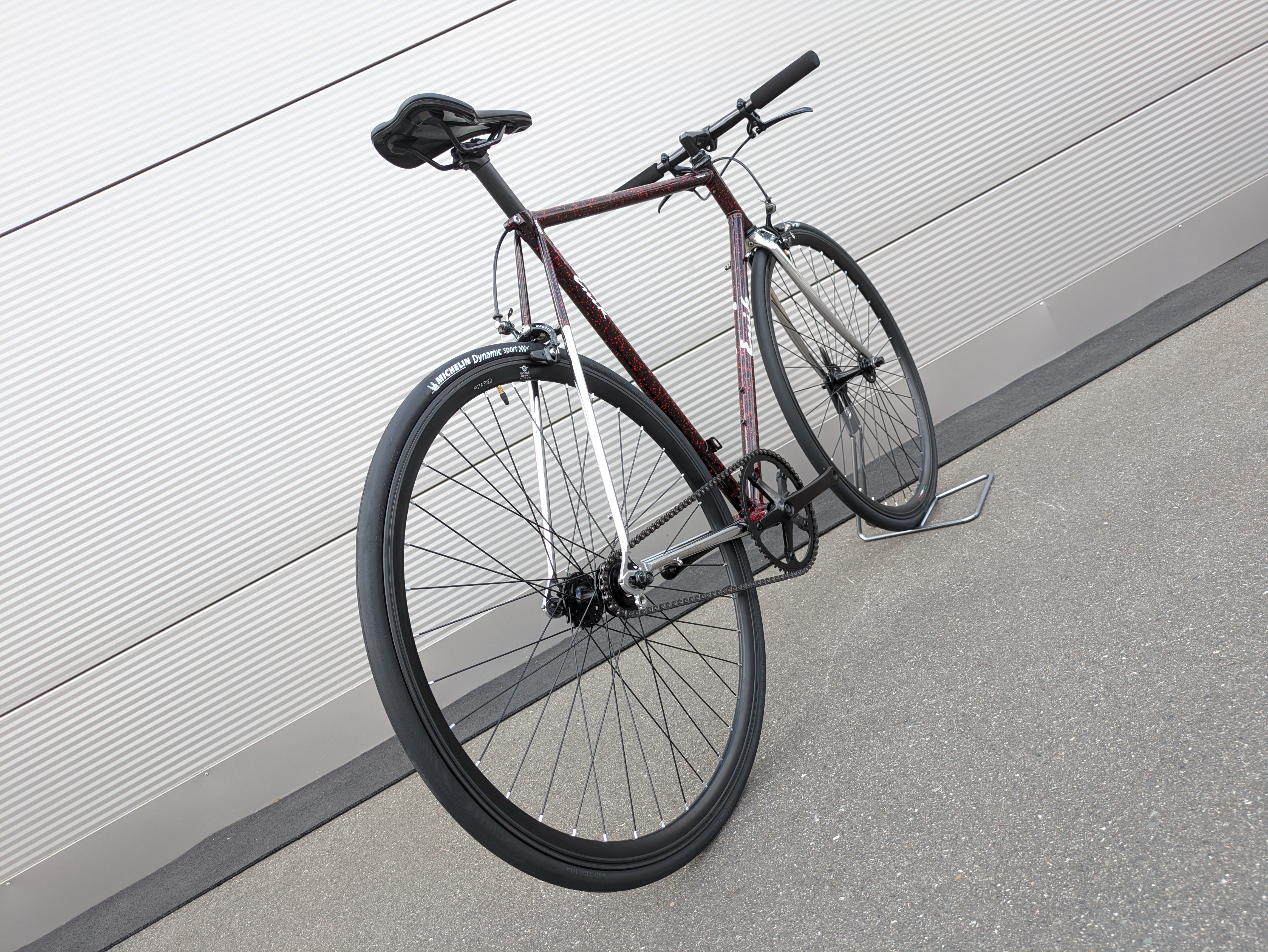 The bike was completely disassembled, all bearings were cleaned and re-greased, and it was carefully rebuilt with many new parts. The frame is free of cracks, dents, or deformations and remains structurally sound. On the right side of the top tube, near the head tube, the paint has slightly blistered, but it is hardly noticeable and has no functional impact ( Picture 9). The bike presents itself in excellent mechanical and visual condition and is ready to ride – a modern singlespeed in a vintage look that delivers both style and reliability.