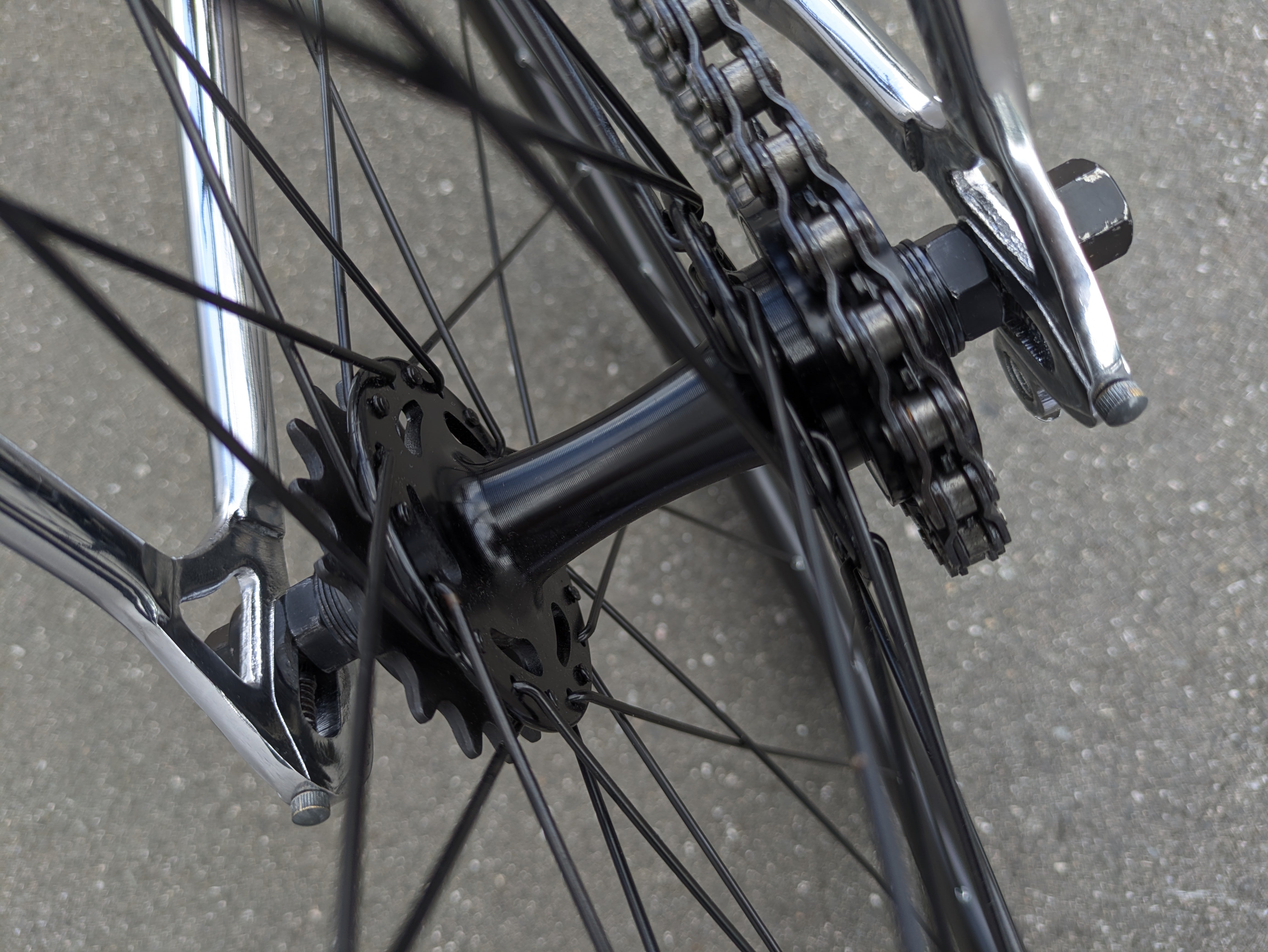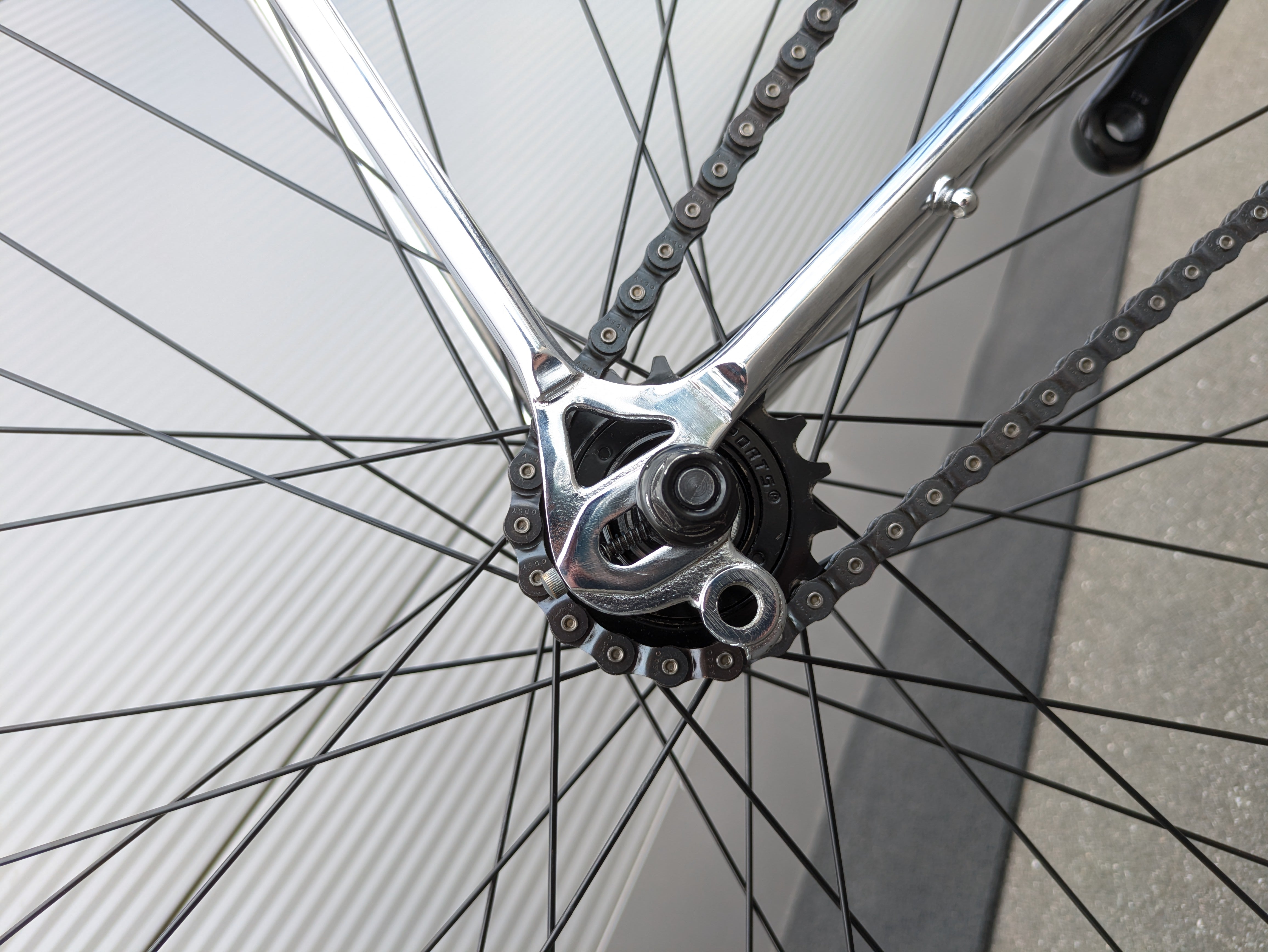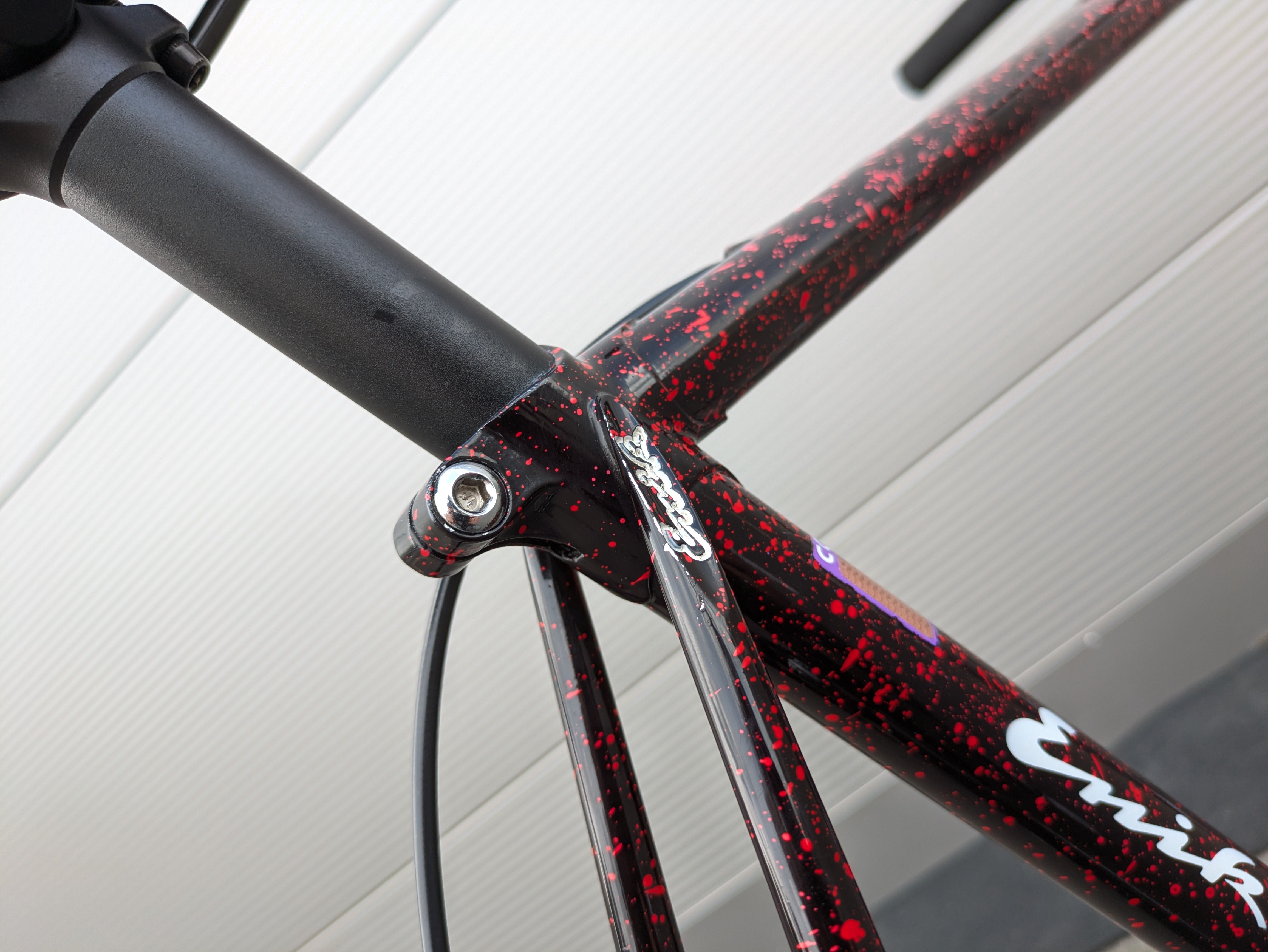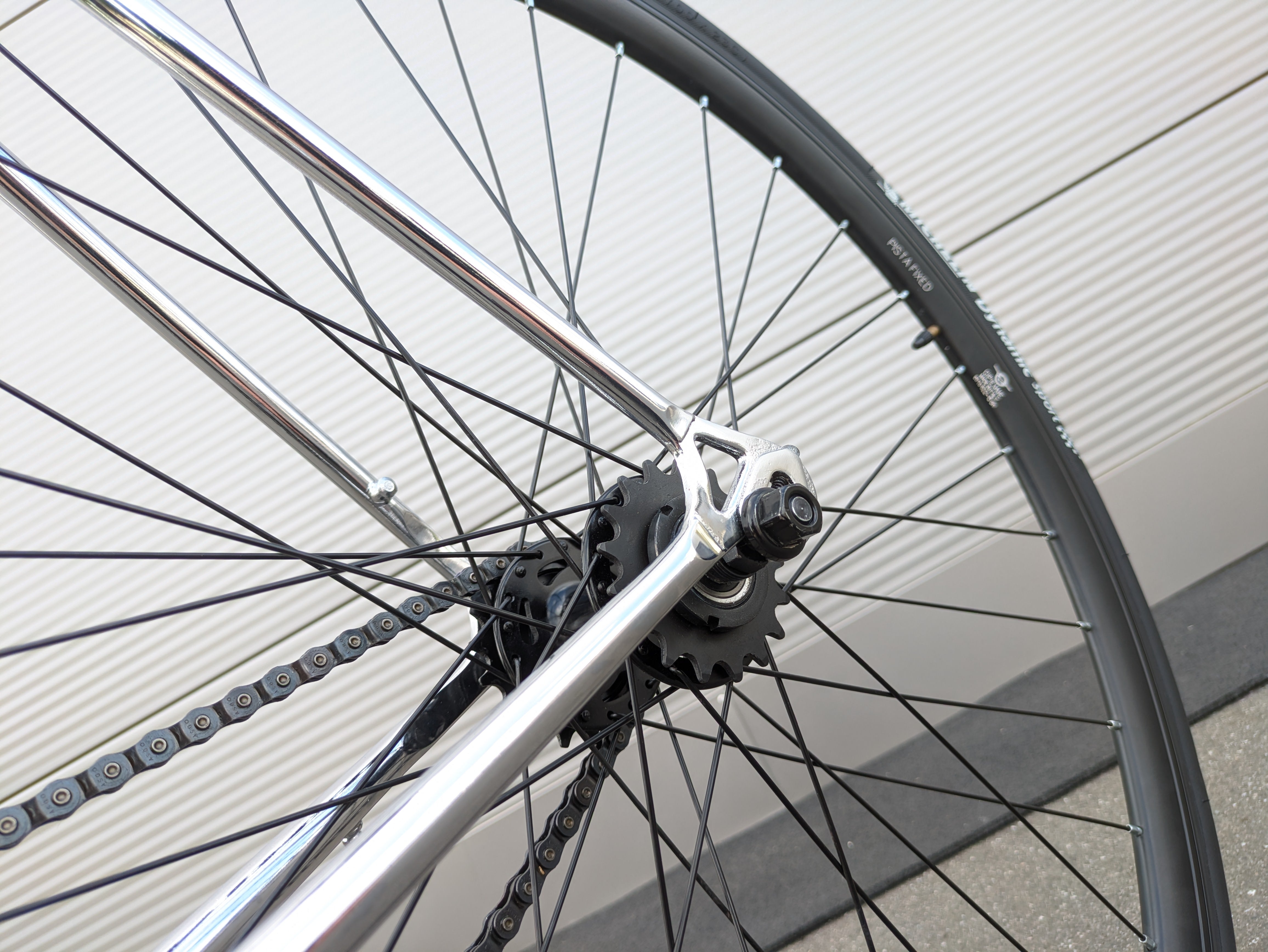 The bike was completely disassembled, all bearings were cleaned and re-greased, and it was carefully rebuilt with many new parts. The frame is free of cracks, dents, or deformations and remains structurally sound. On the right side of the top tube, near the head tube, the paint has slightly blistered, but it is hardly noticeable and has no functional impact ( Picture 9). The bike presents itself in excellent mechanical and visual condition and is ready to ride – a modern singlespeed in a vintage look that delivers both style and reliability.