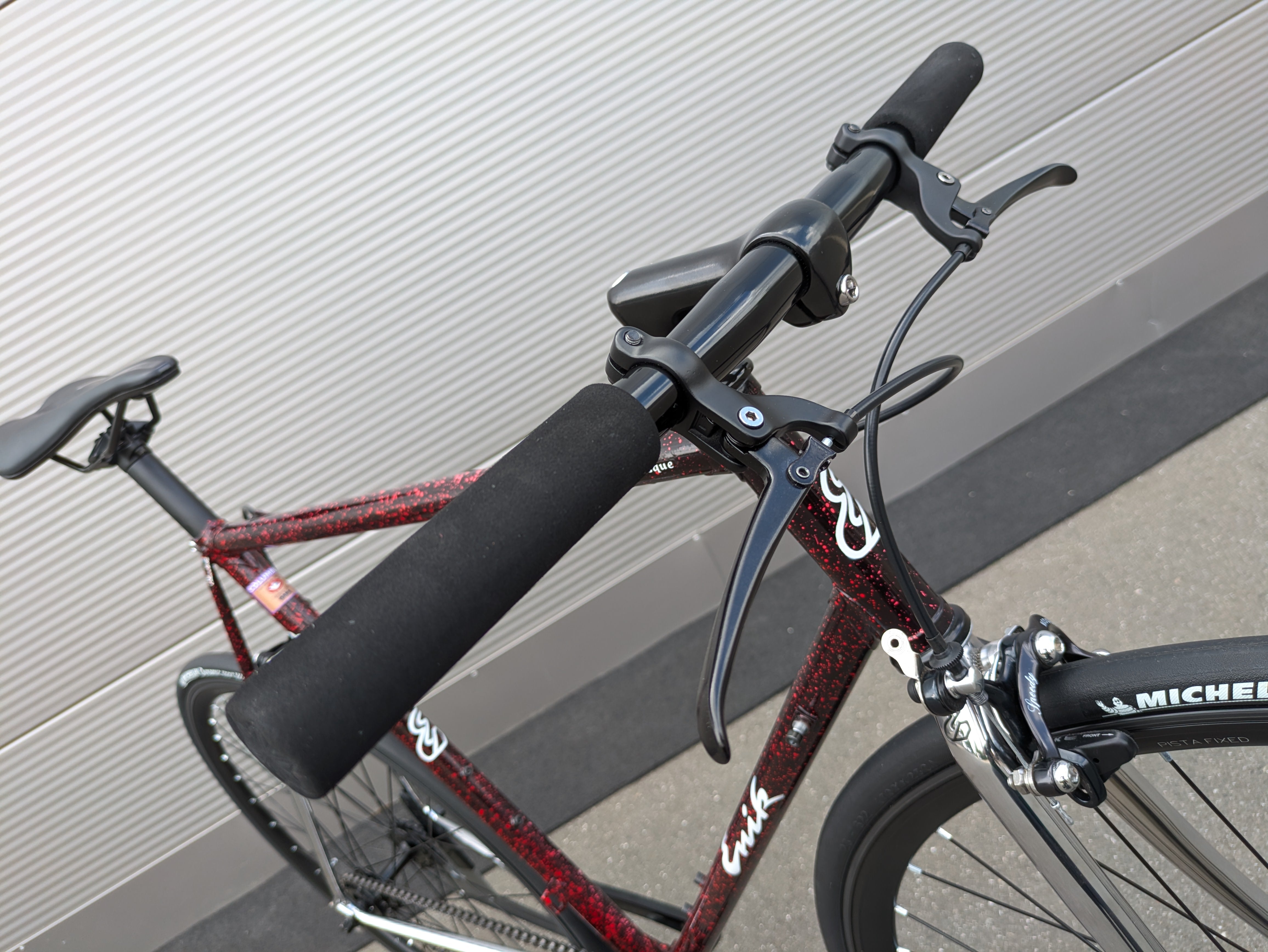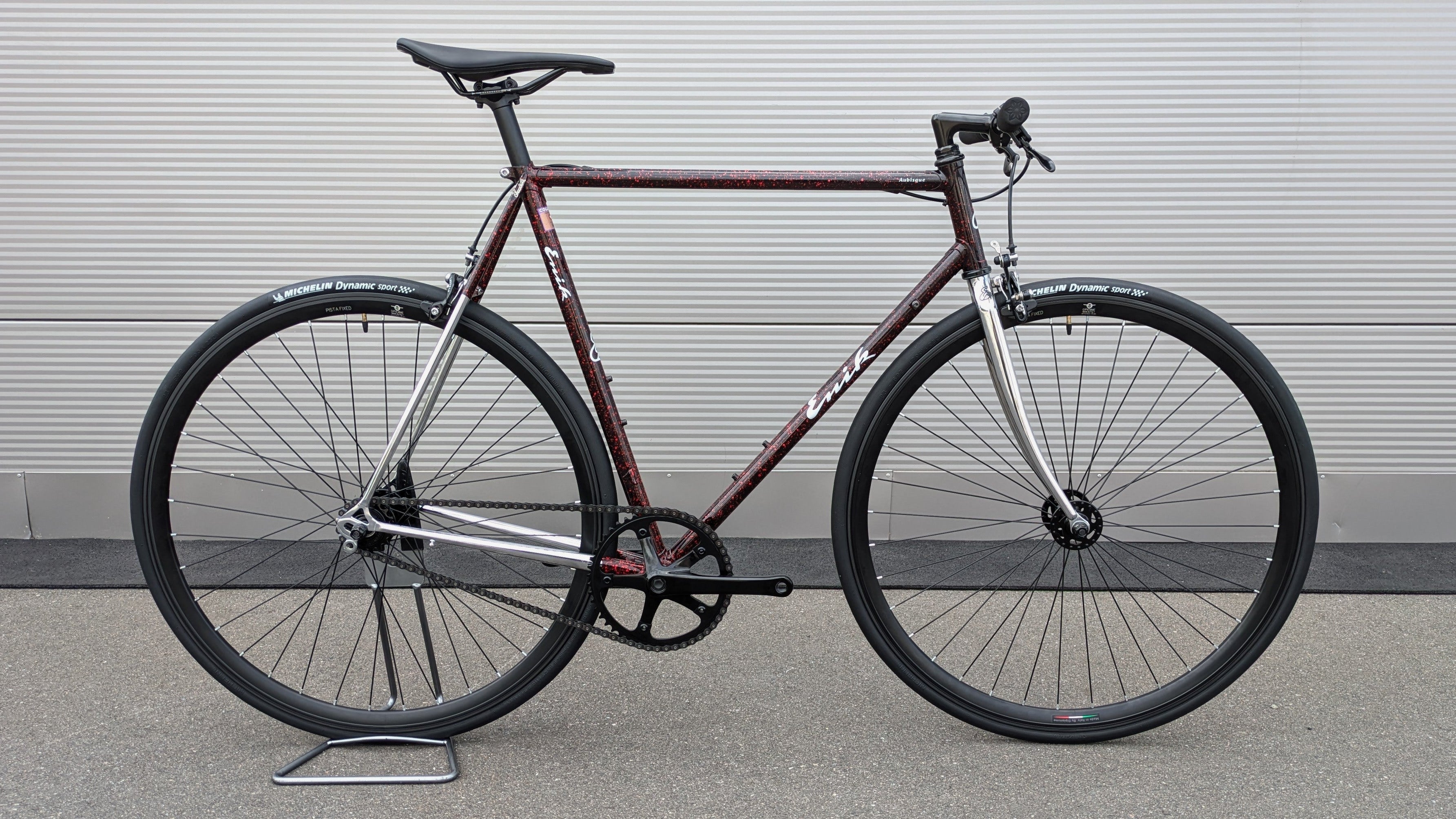 This Enik Aubisque from the 1990s has been stylishly converted into a singlespeed. The classic steel frame remains at its core, complemented by modern updates that give the bike a clean, urban look. Instead of the original drop bars, it now features a flat handlebar that ensures comfortable control in city traffic. New Gipiemme rims add both a fresh appearance and reliable performance.