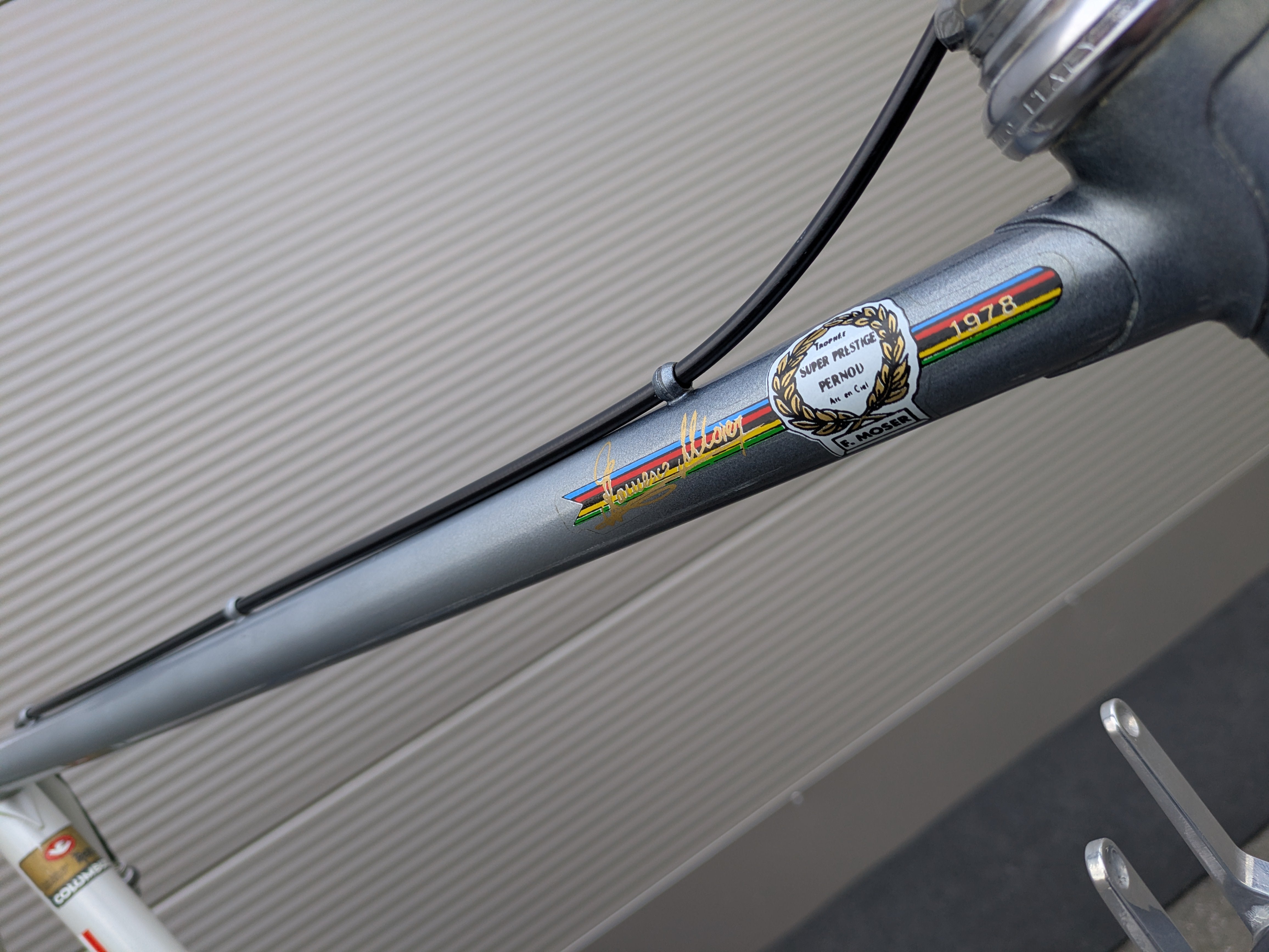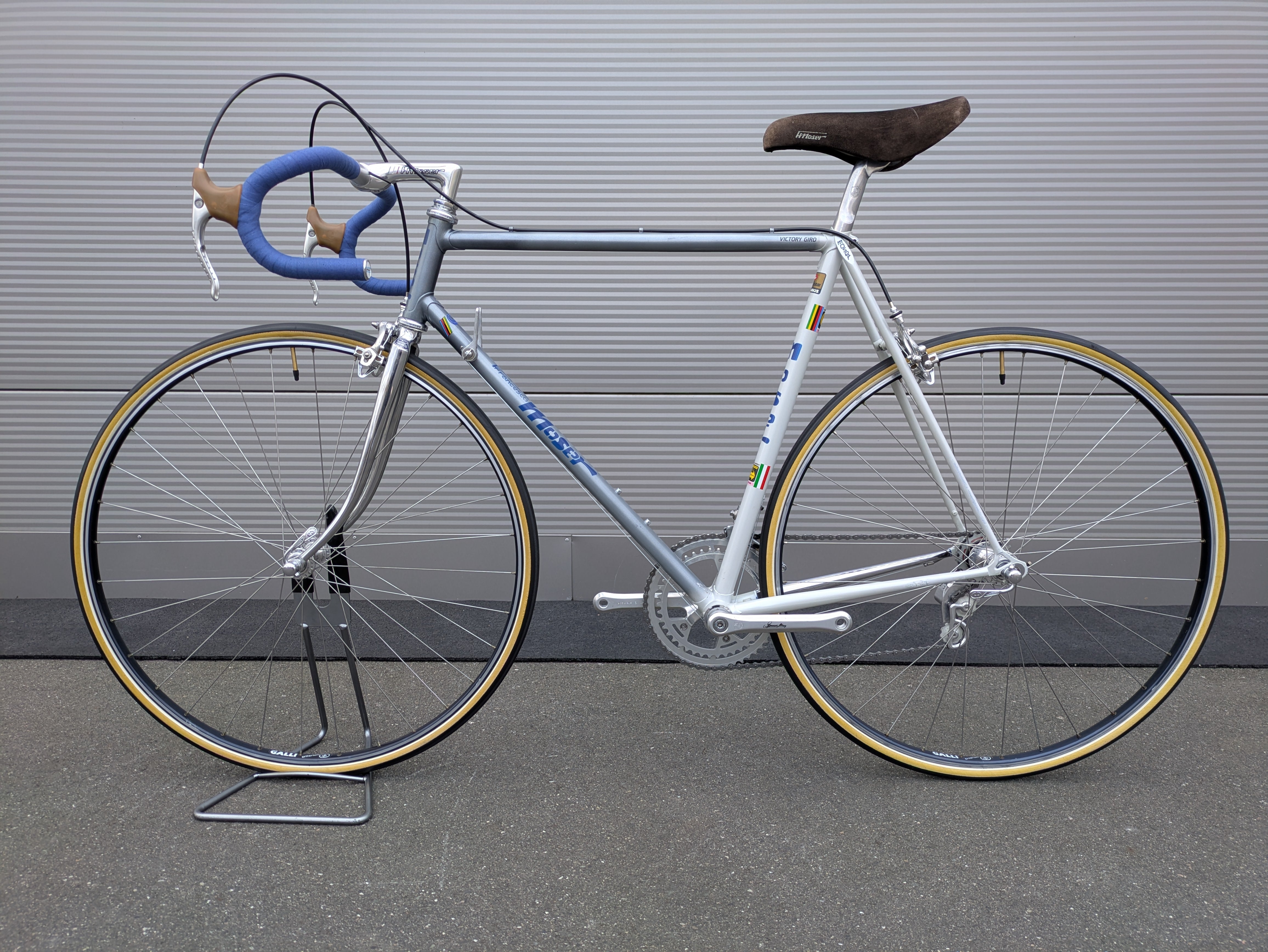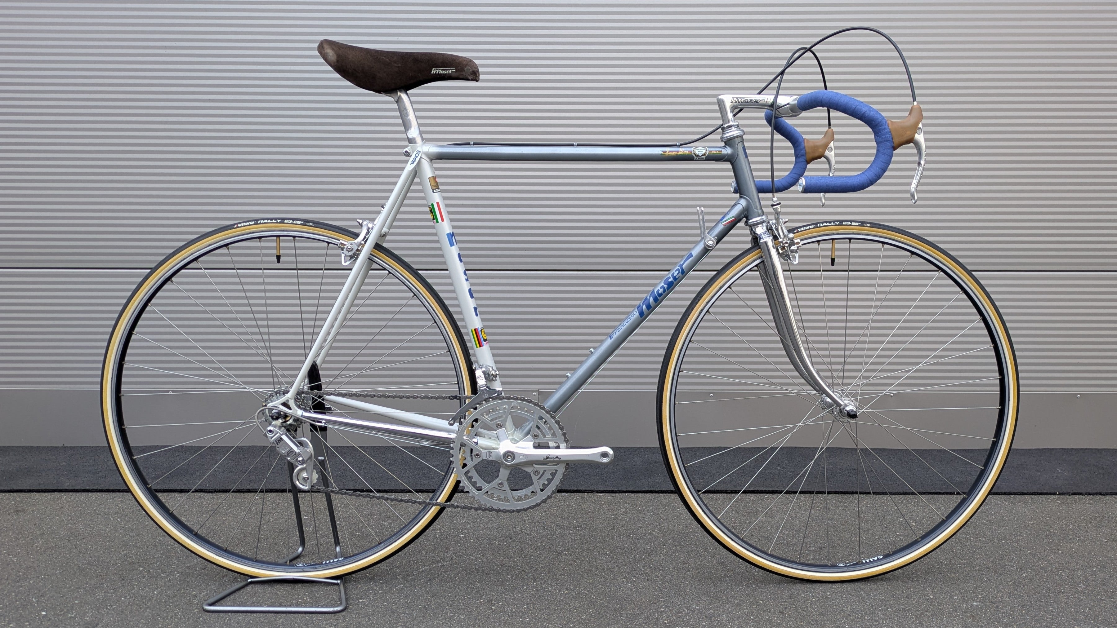 This mid-1980s Moser road bike is a tribute to the master's glorious record-breaking years and a true collector's item for lovers of classic steel road bikes. The foundation is a high-quality frame made of Columbus SL tubing, the reference material for professional racing bikes of that epoch. The bike is equipped with a complete Campagnolo Victory group, which stands out for its extraordinary level of detail: almost all components—from the rear derailleur and front derailleur to the crankset—feature elaborate Francesco Moser signatures and pantographs. The stem of the 3T (Tecno Tubo Torino) combination also bears the matching engraving. For a first-class ride, the bike features rare Galli Criterium rims fitted with new Vittoria Rally tubular tires. A technically and visually harmonious masterpiece that perfectly embodies the era of modern frame building.