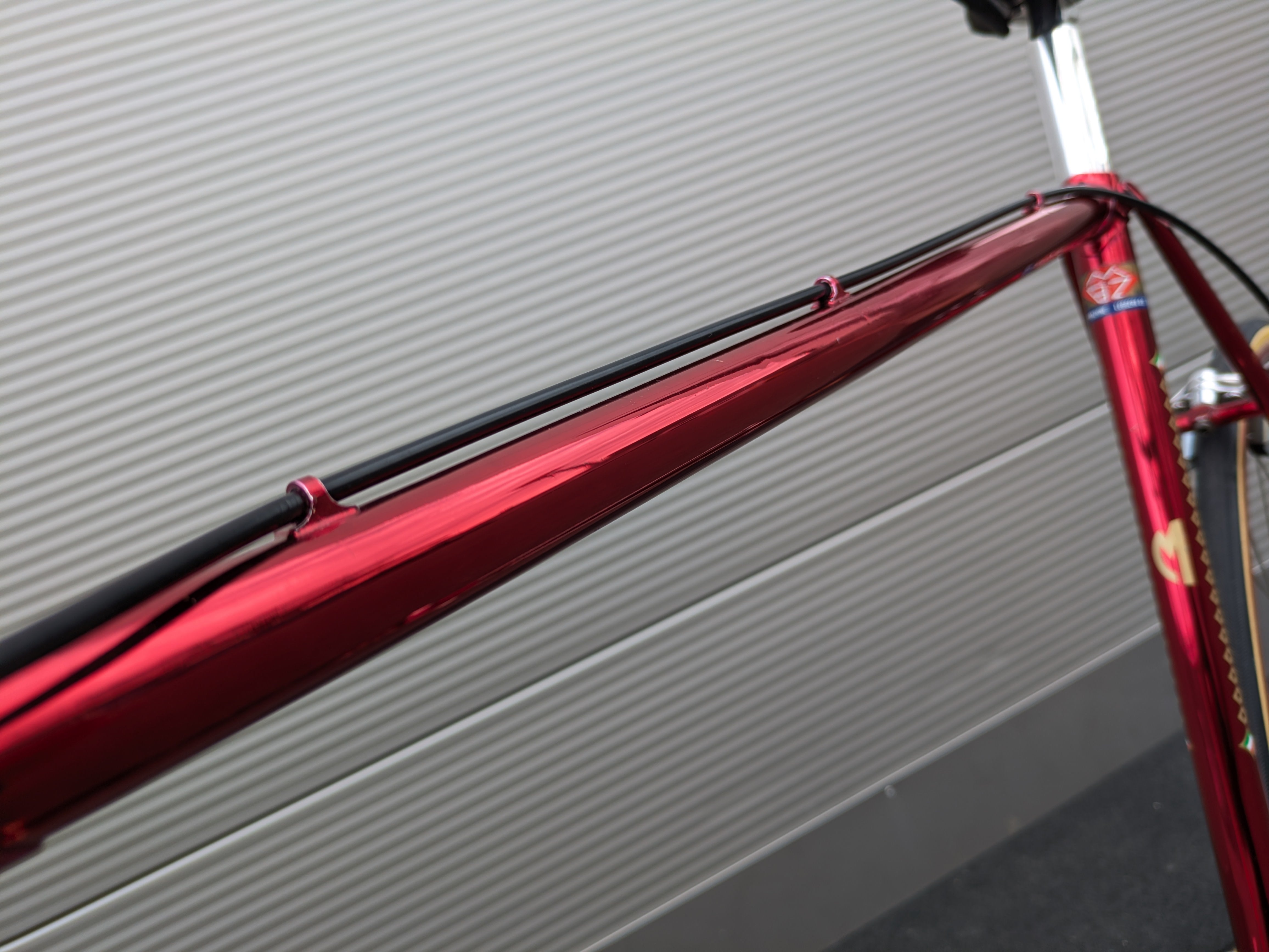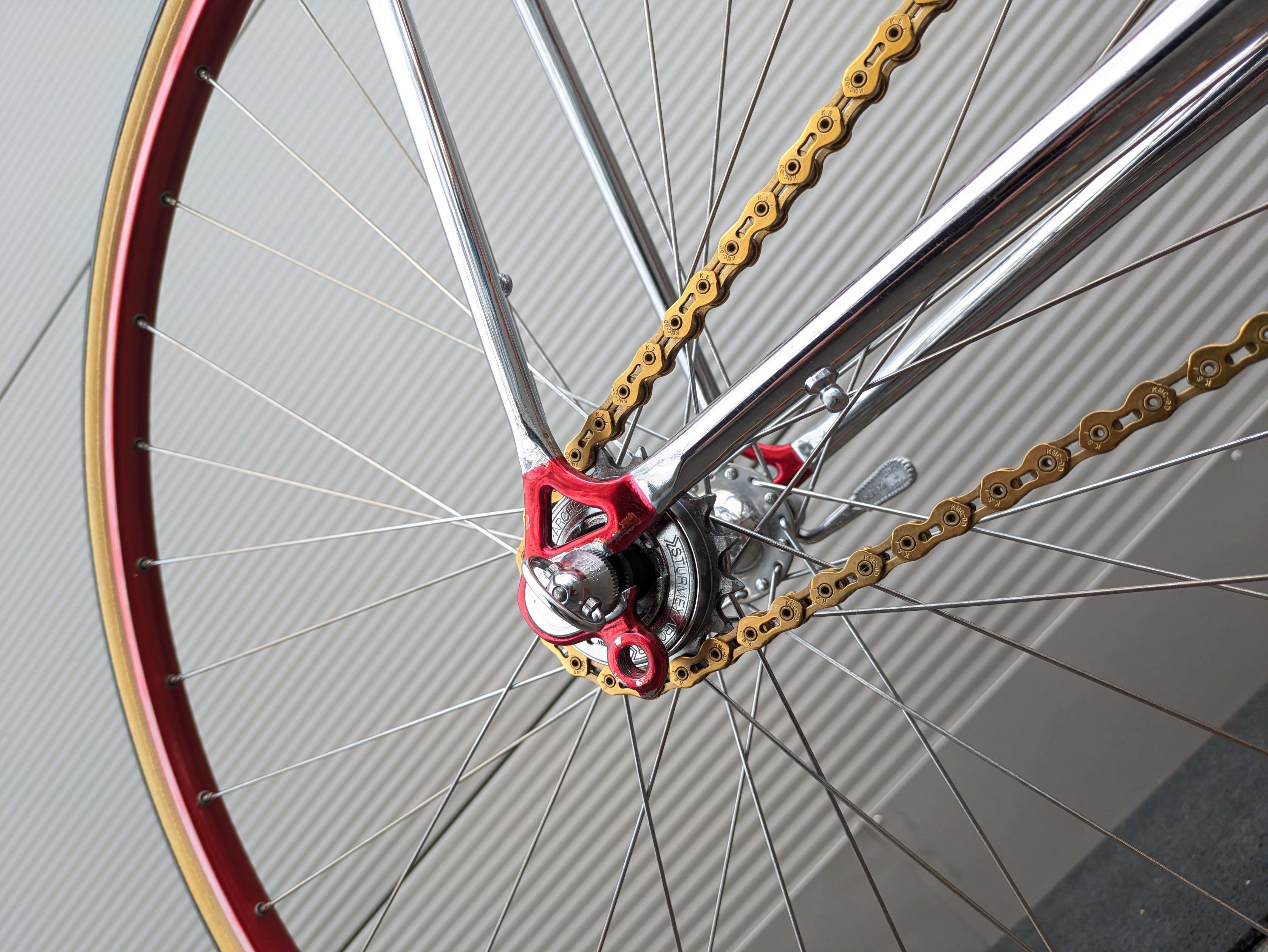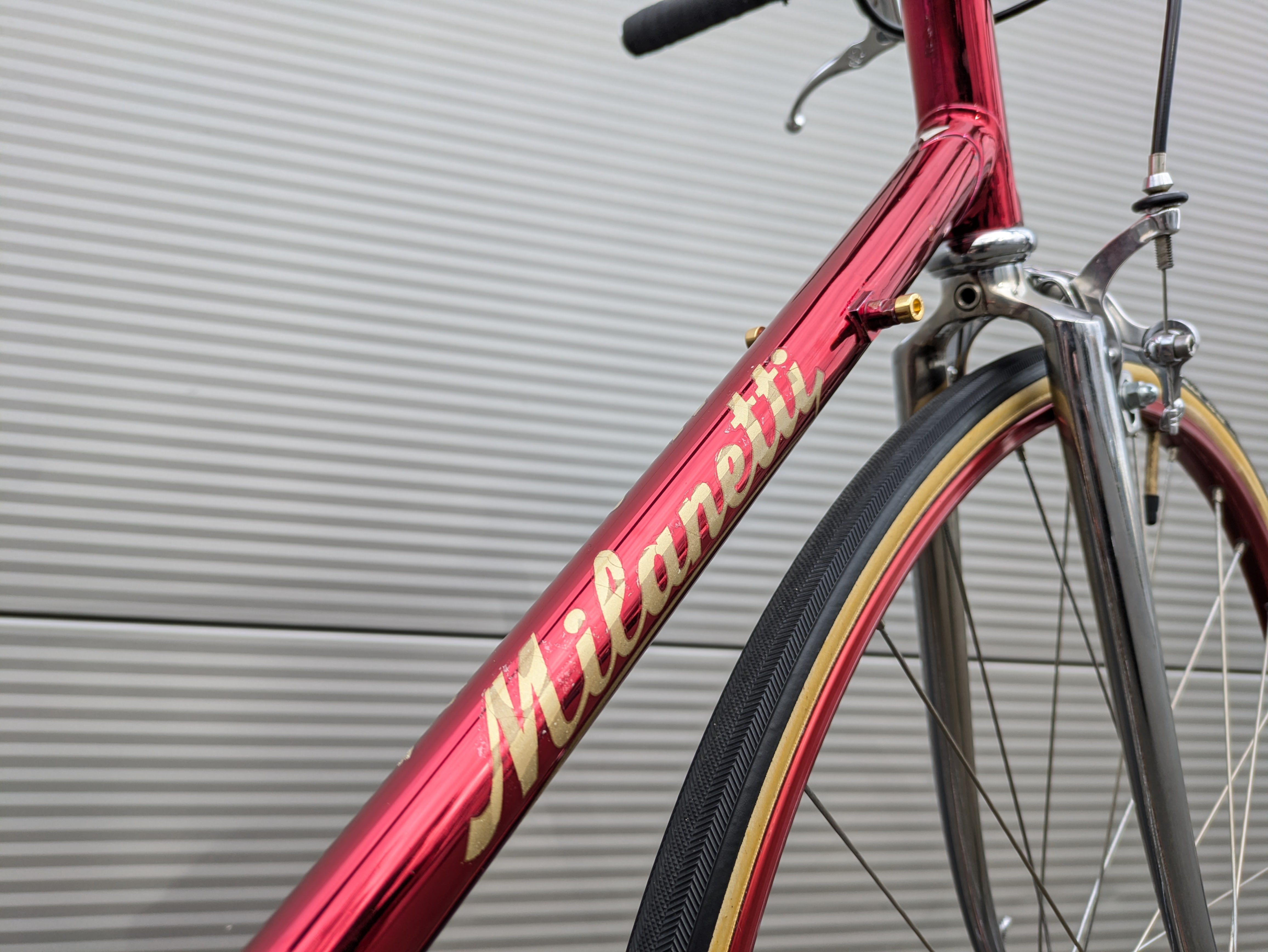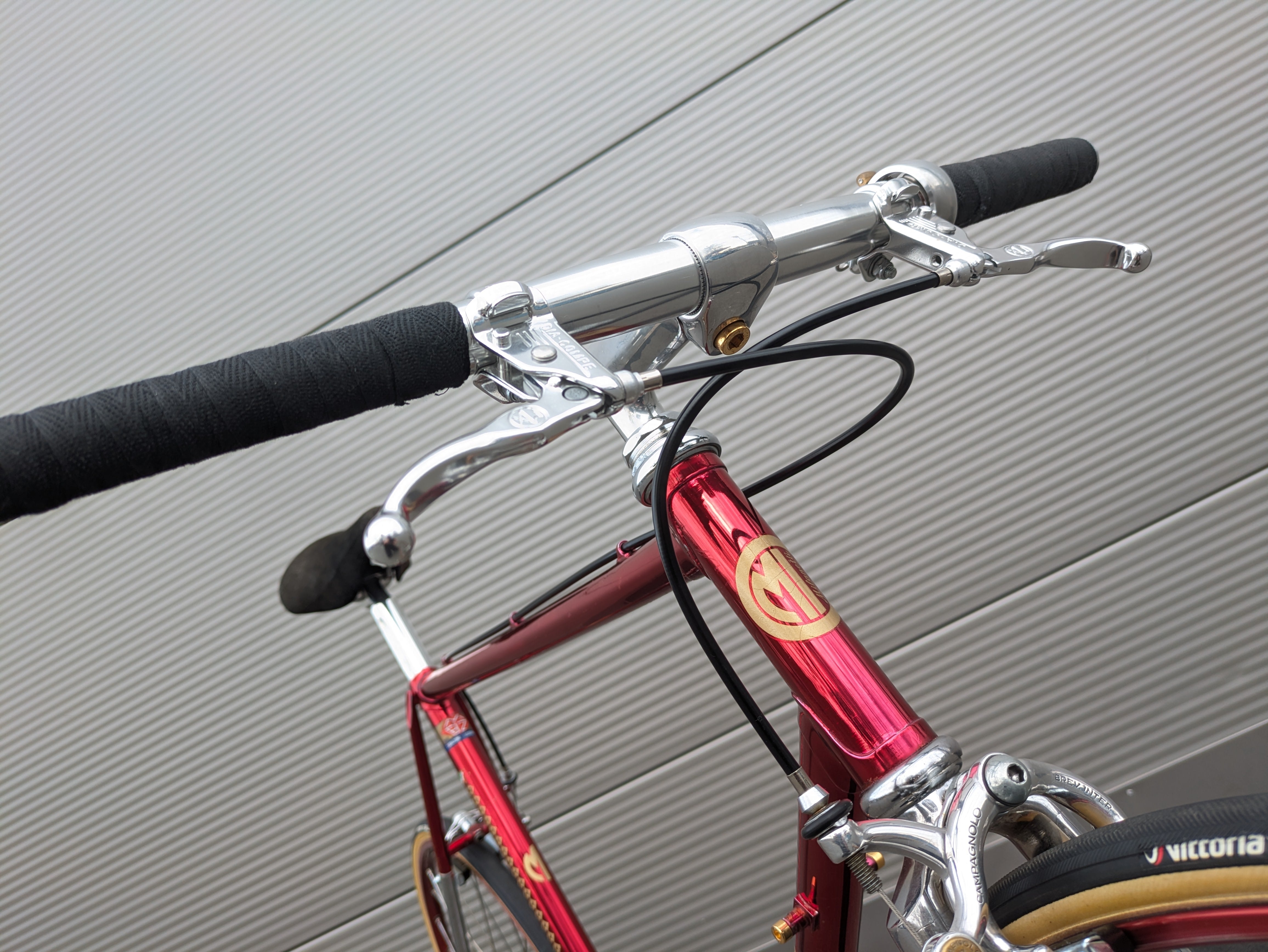 All aluminium components – including the stem, seatpost, brakes, hubs and crankset – were stripped of their old clearcoat and polished through multiple stages to achieve a mirror-like finish. The gold KMC chain and the 24-karat gold-plated bolts on the stem, seatpost and the former downtube shifter mounts add additional highlights, giving the bike an upscale and distinctive appearance.