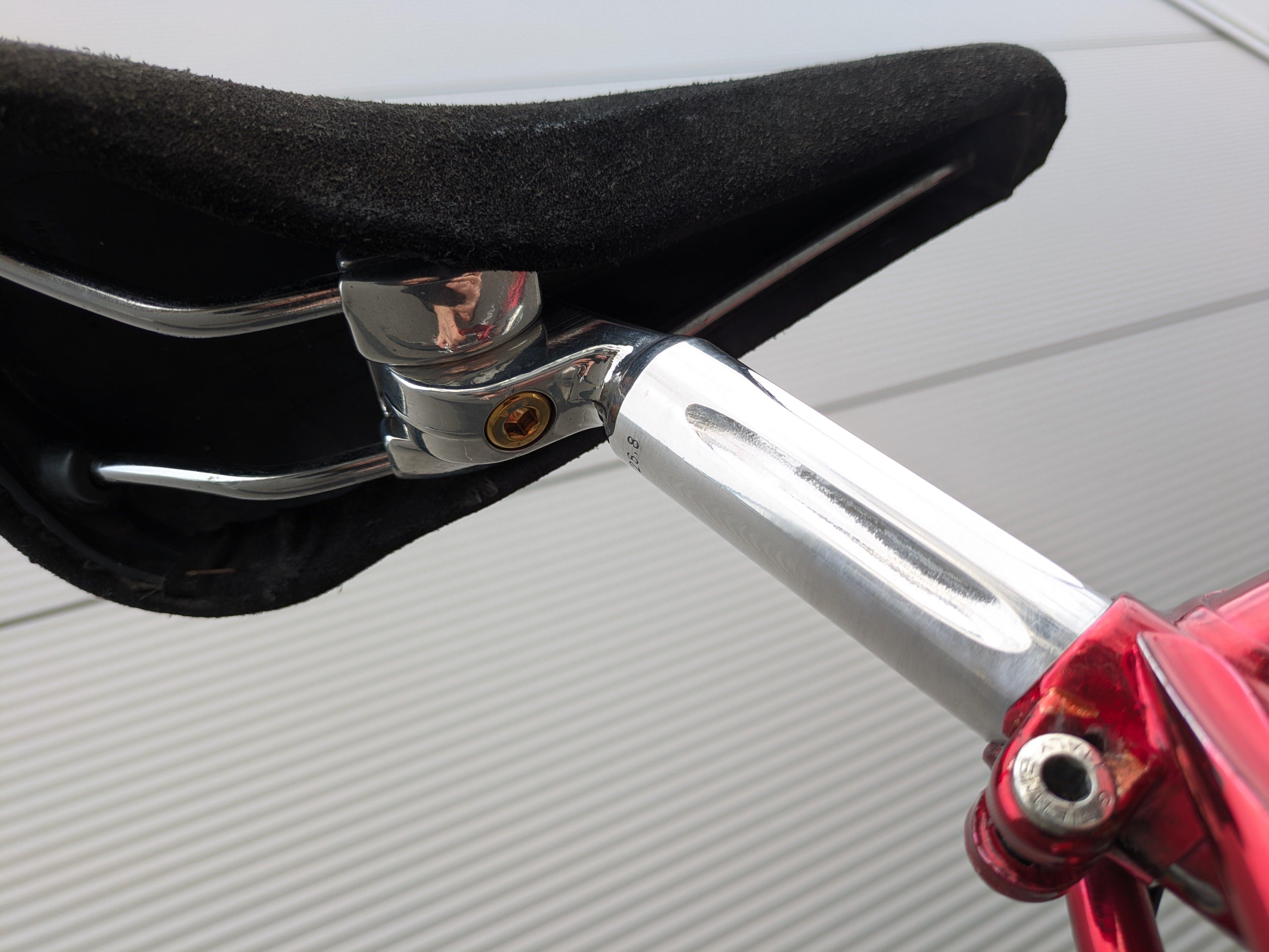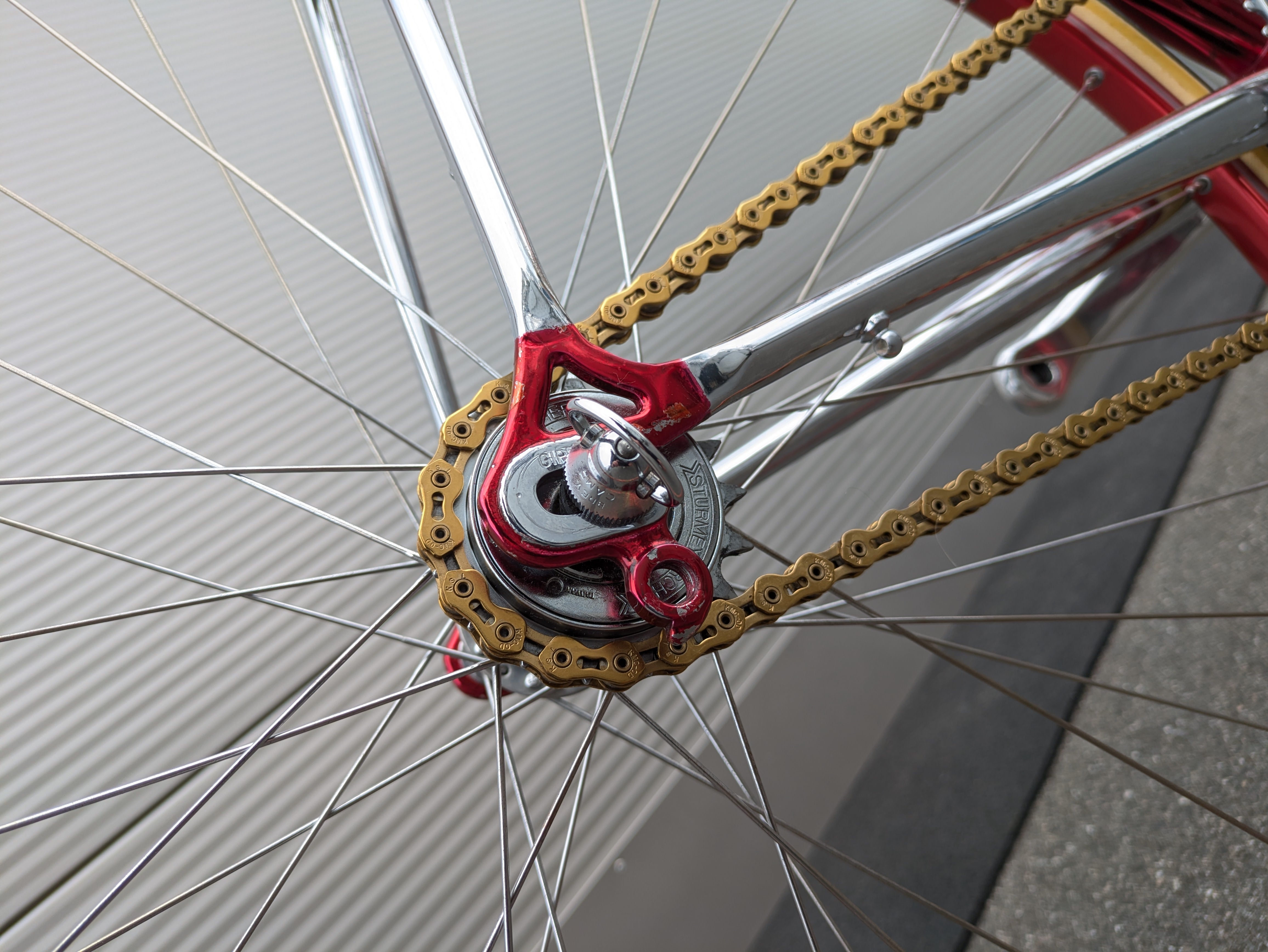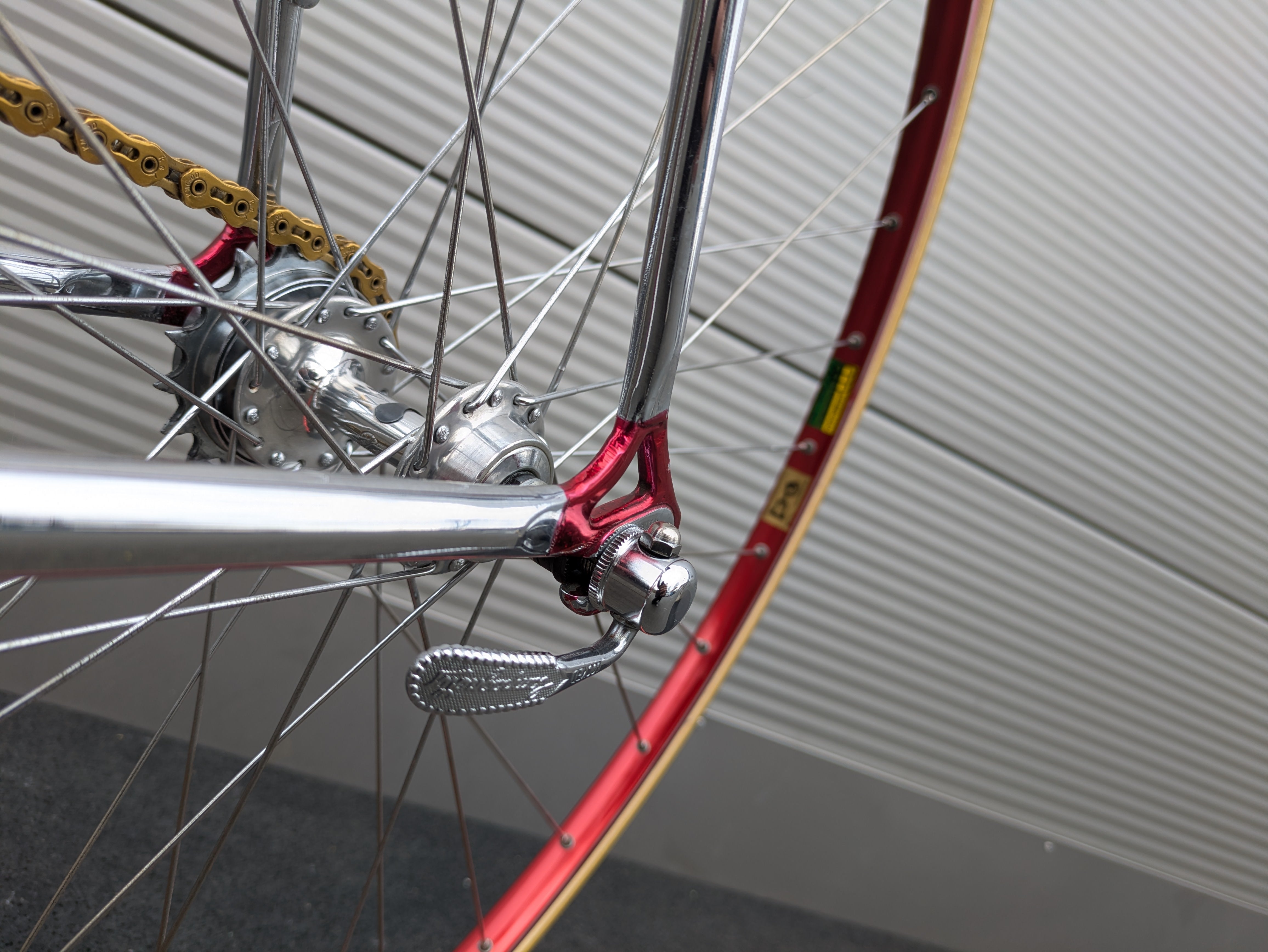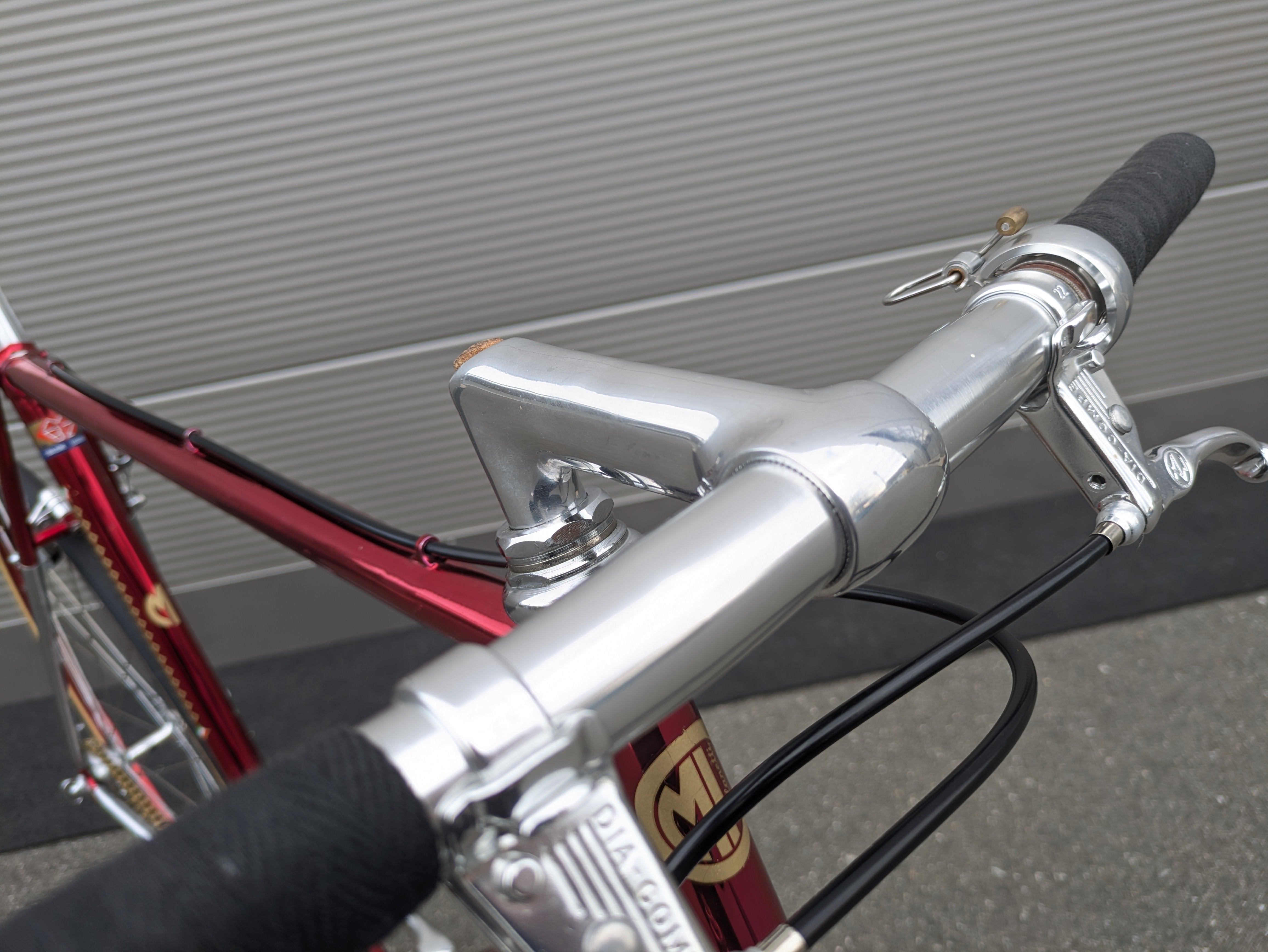 All aluminium components – including the stem, seatpost, brakes, hubs and crankset – were stripped of their old clearcoat and polished through multiple stages to achieve a mirror-like finish. The gold KMC chain and the 24-karat gold-plated bolts on the stem, seatpost and the former downtube shifter mounts add additional highlights, giving the bike an upscale and distinctive appearance.