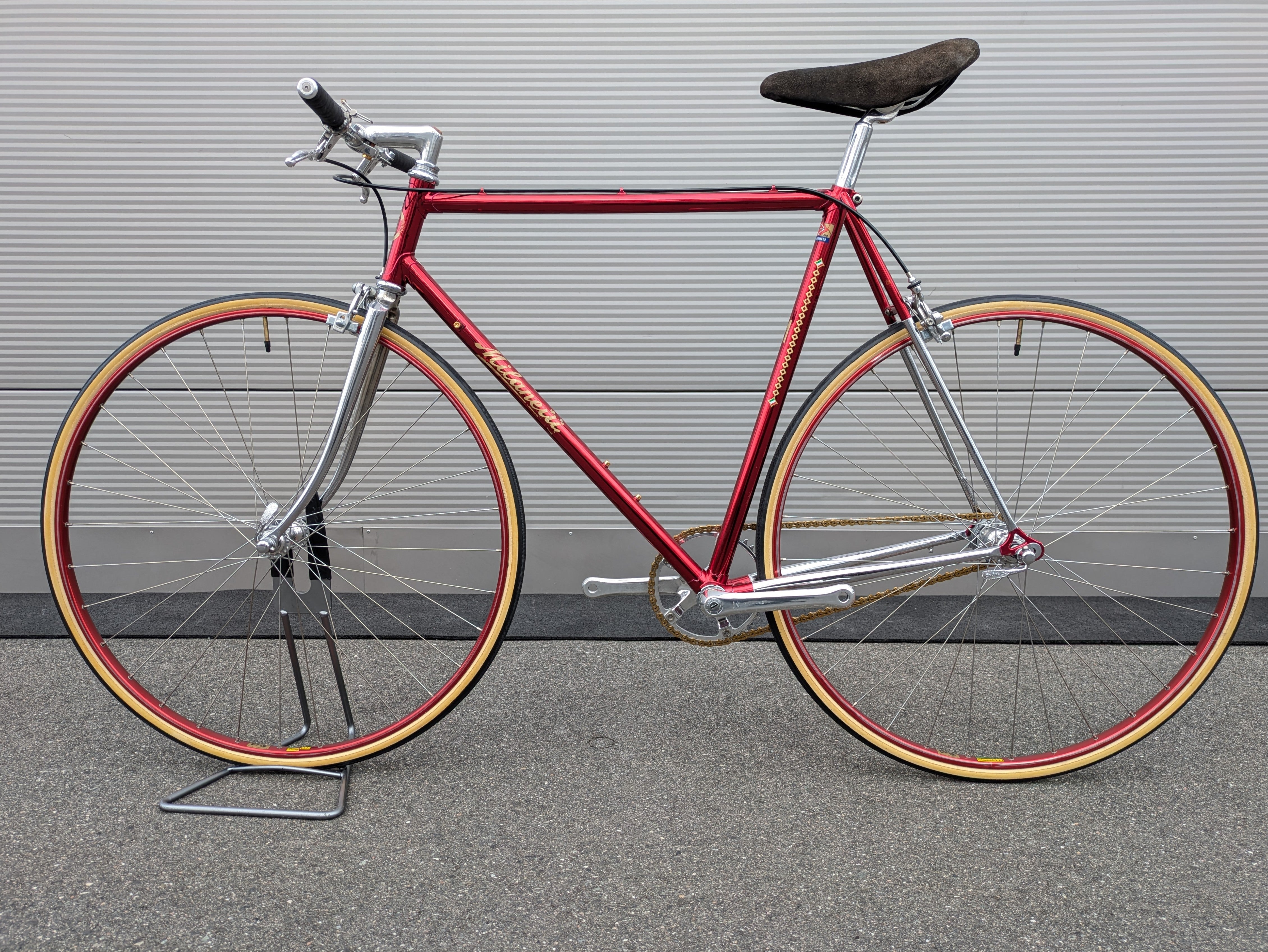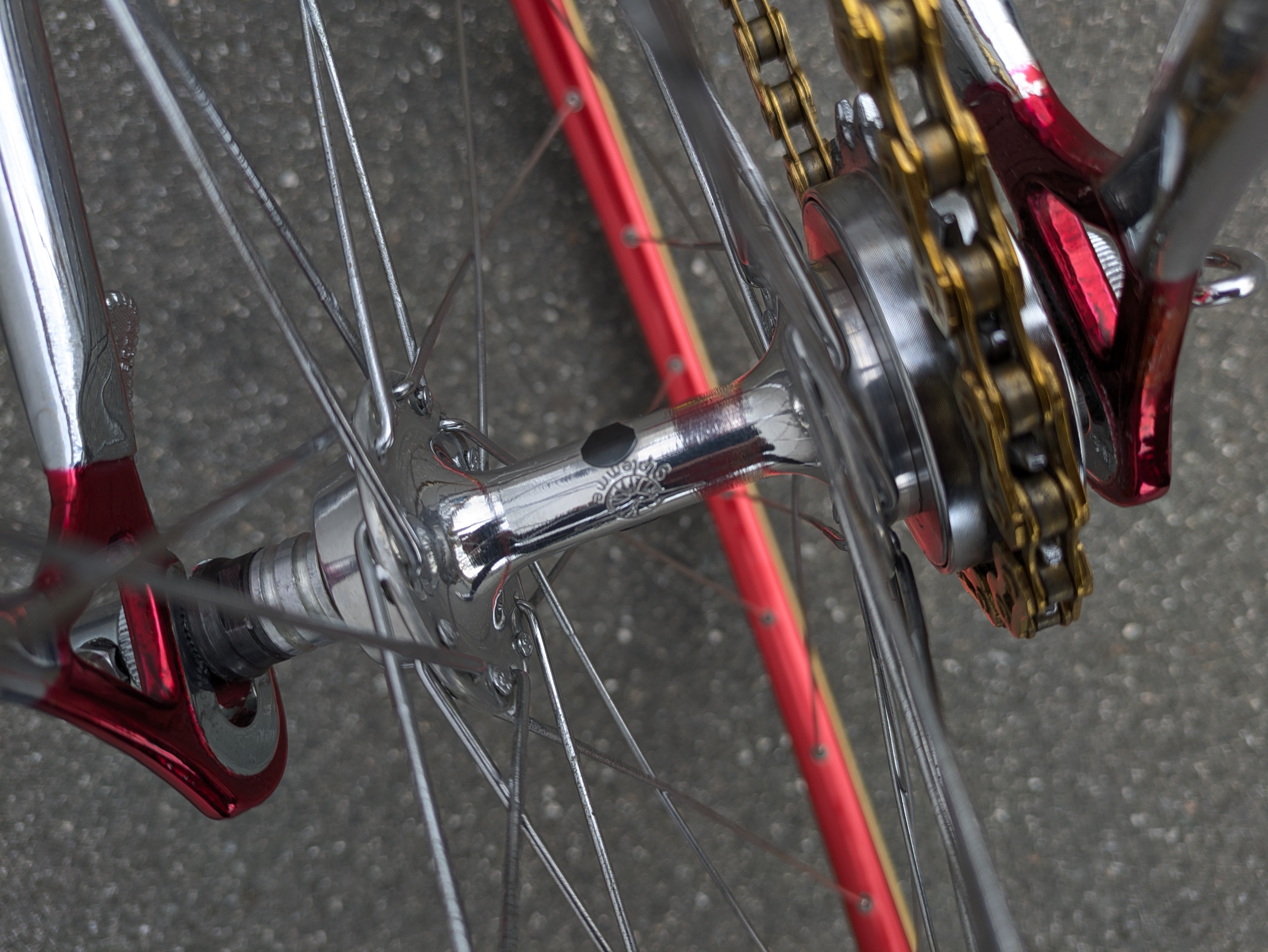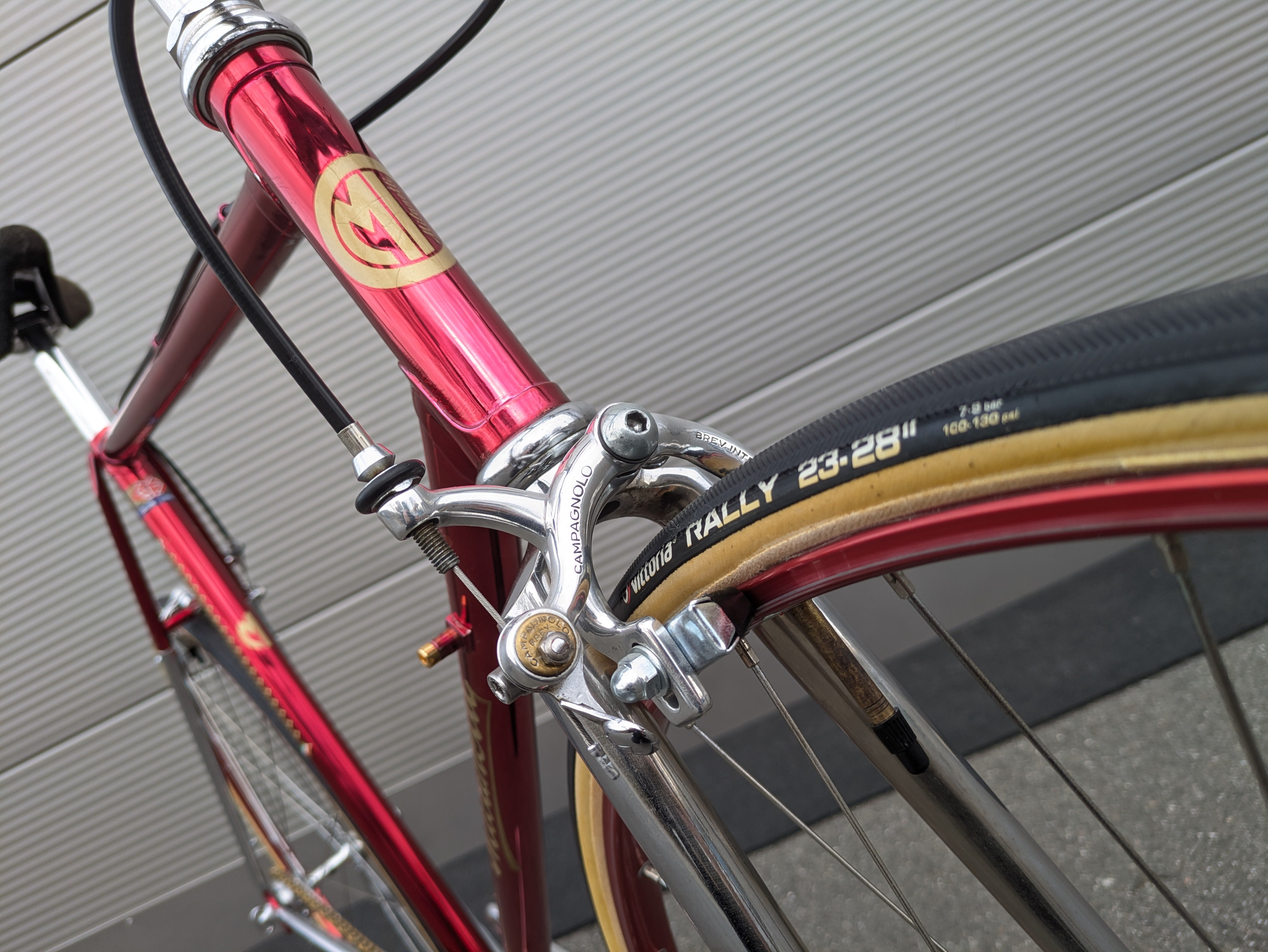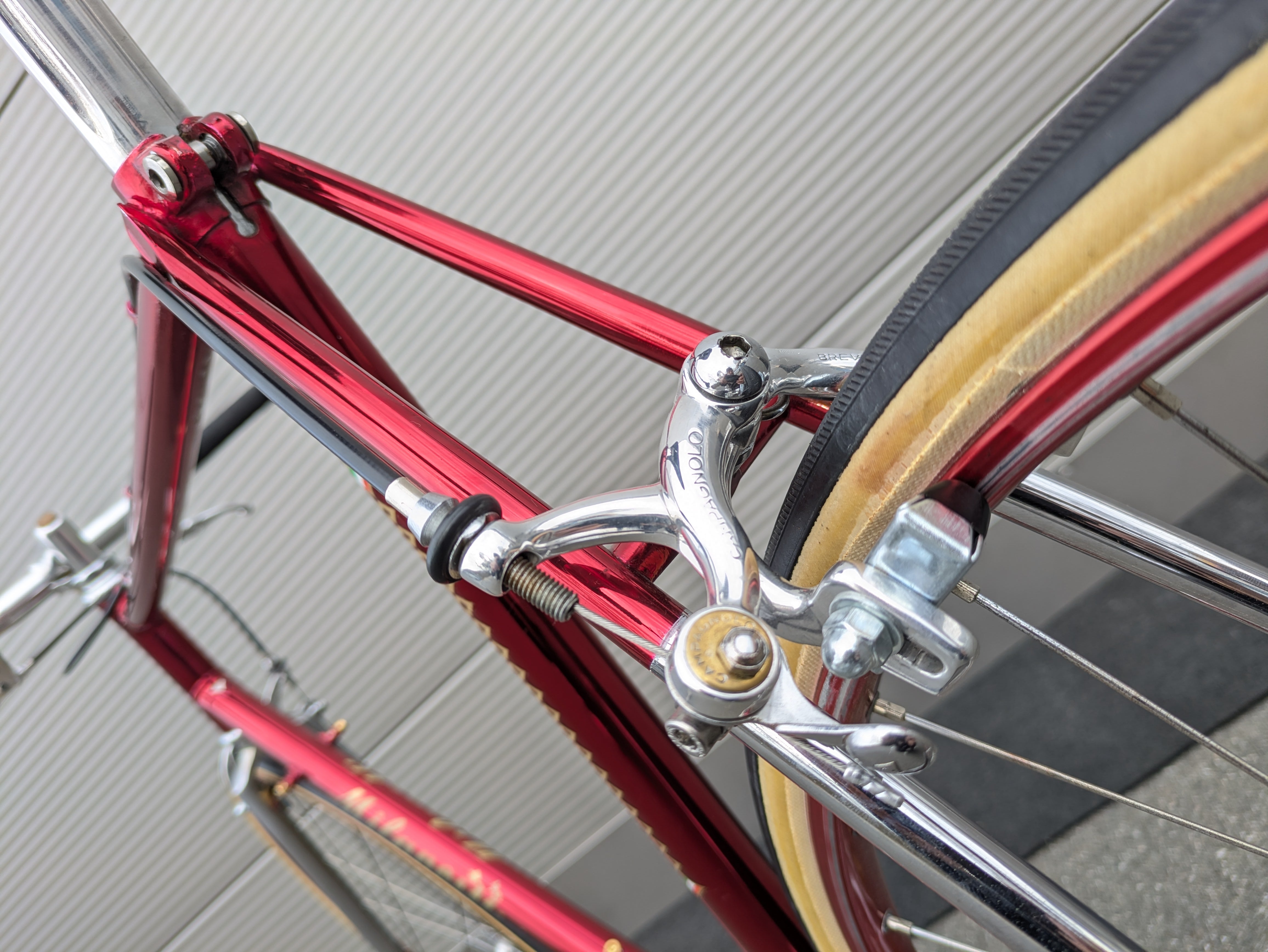 All aluminium components – including the stem, seatpost, brakes, hubs and crankset – were stripped of their old clearcoat and polished through multiple stages to achieve a mirror-like finish. The gold KMC chain and the 24-karat gold-plated bolts on the stem, seatpost and the former downtube shifter mounts add additional highlights, giving the bike an upscale and distinctive appearance.