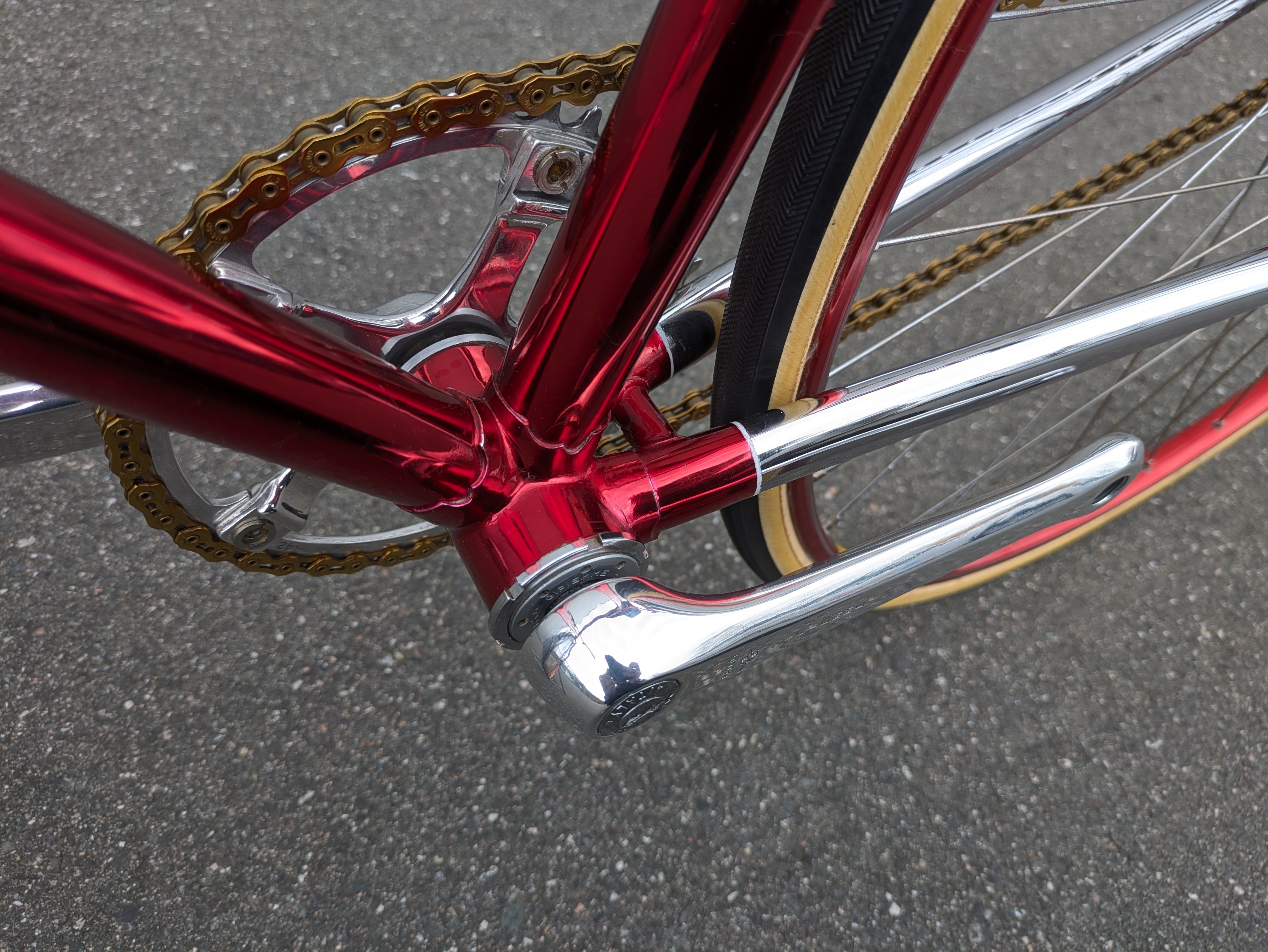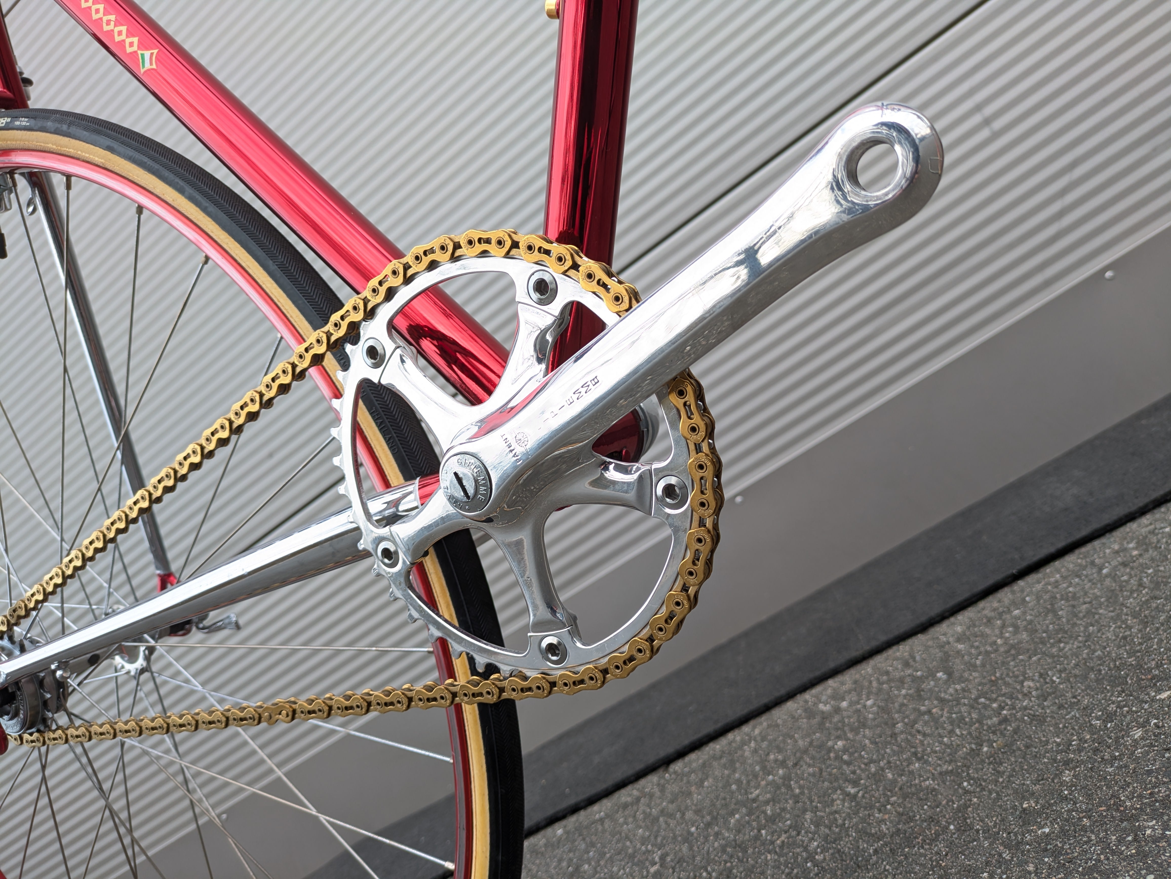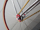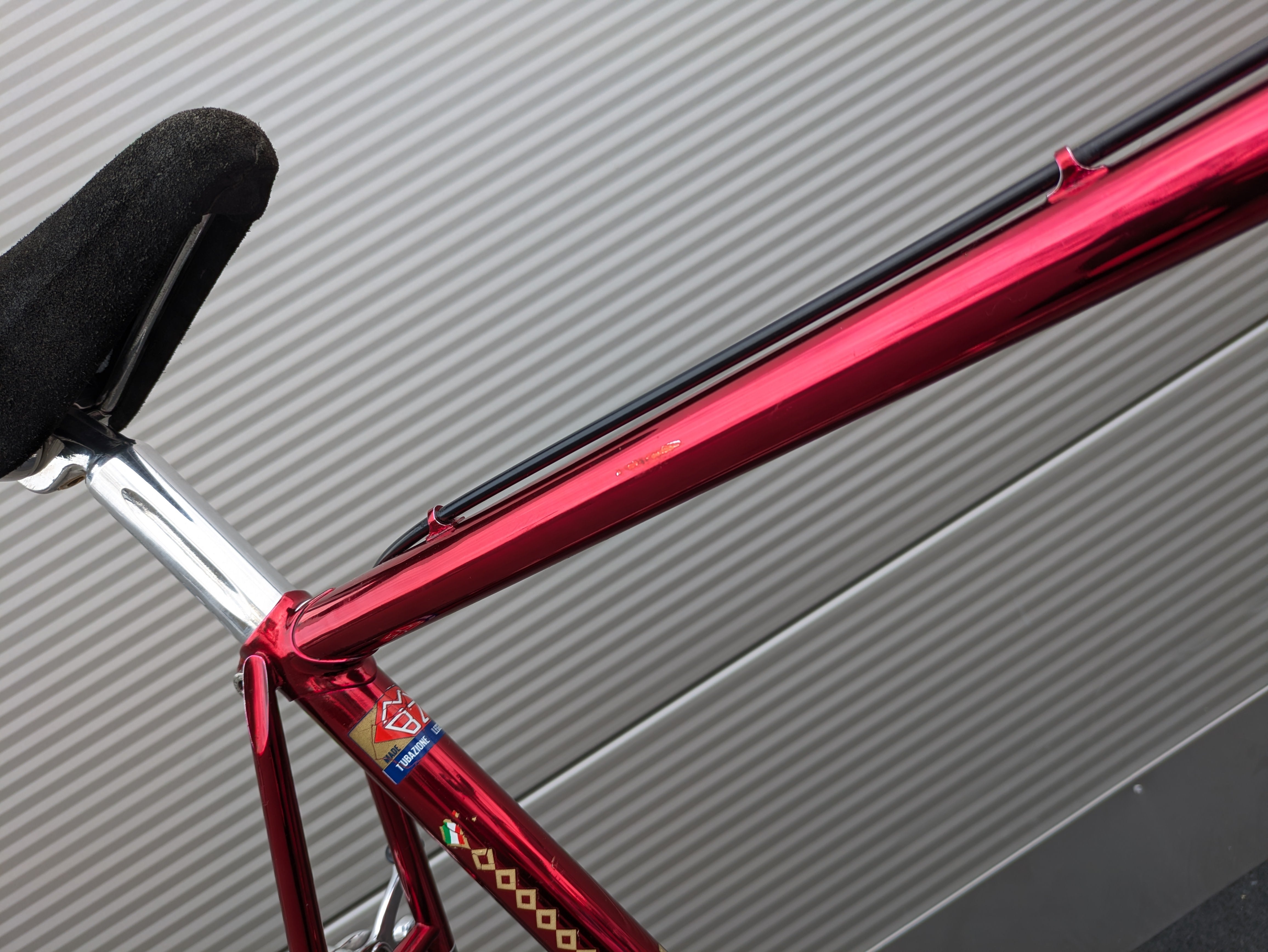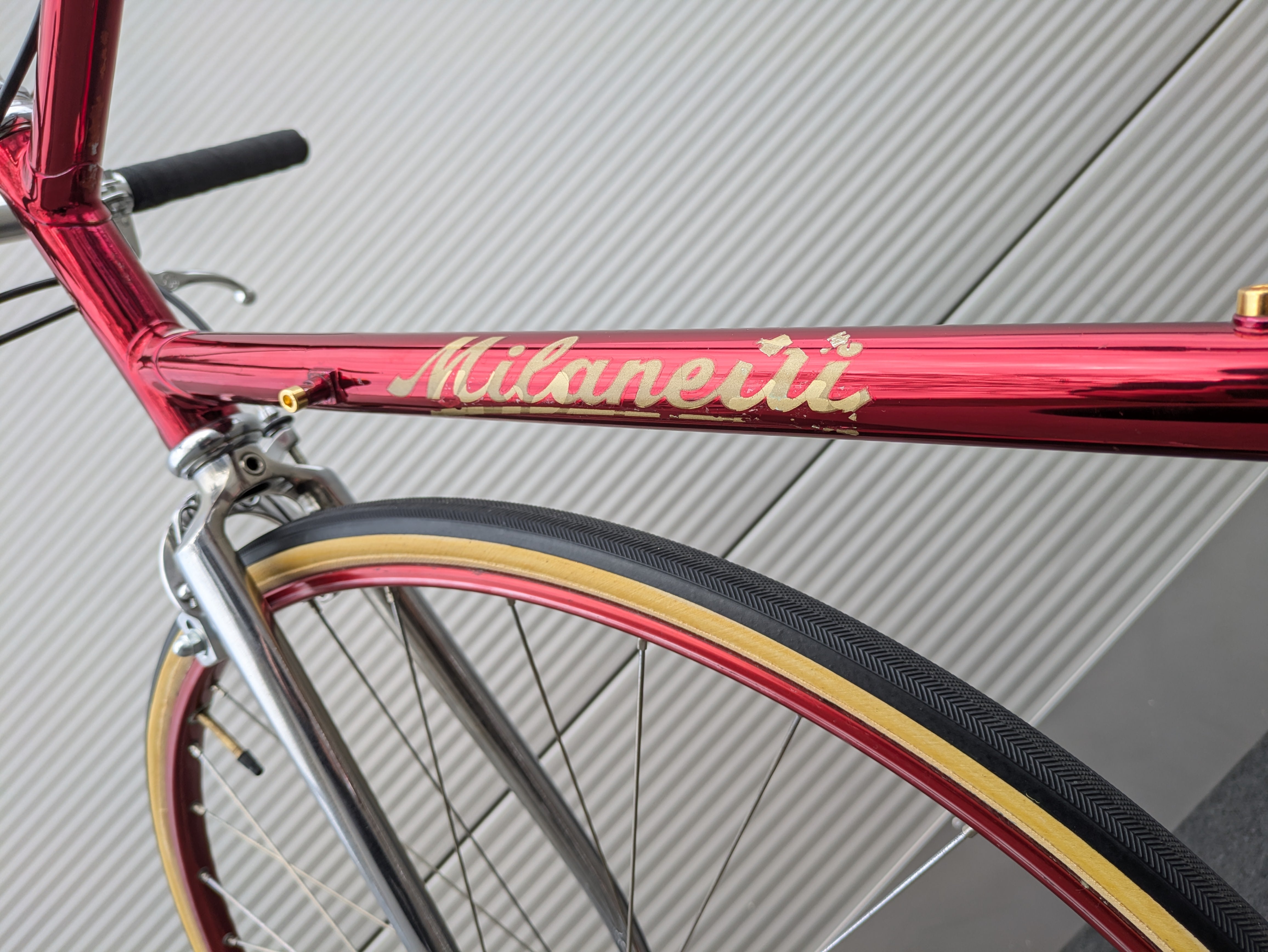 This exceptional singlespeed bike is based on a frame built by the small Milanese workshop Milanetti, known for producing finely crafted steel frames in limited numbers. The standout feature is the red cromovelato finish: the frame was first fully chrome-plated and then coated with an extremely thin, transparent tinted layer, giving the steel remarkable depth and luminosity. Combined with the chrome fork and red Ambrosio rims, the result is a striking and highly cohesive aesthetic.