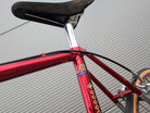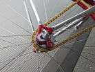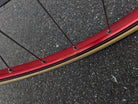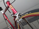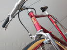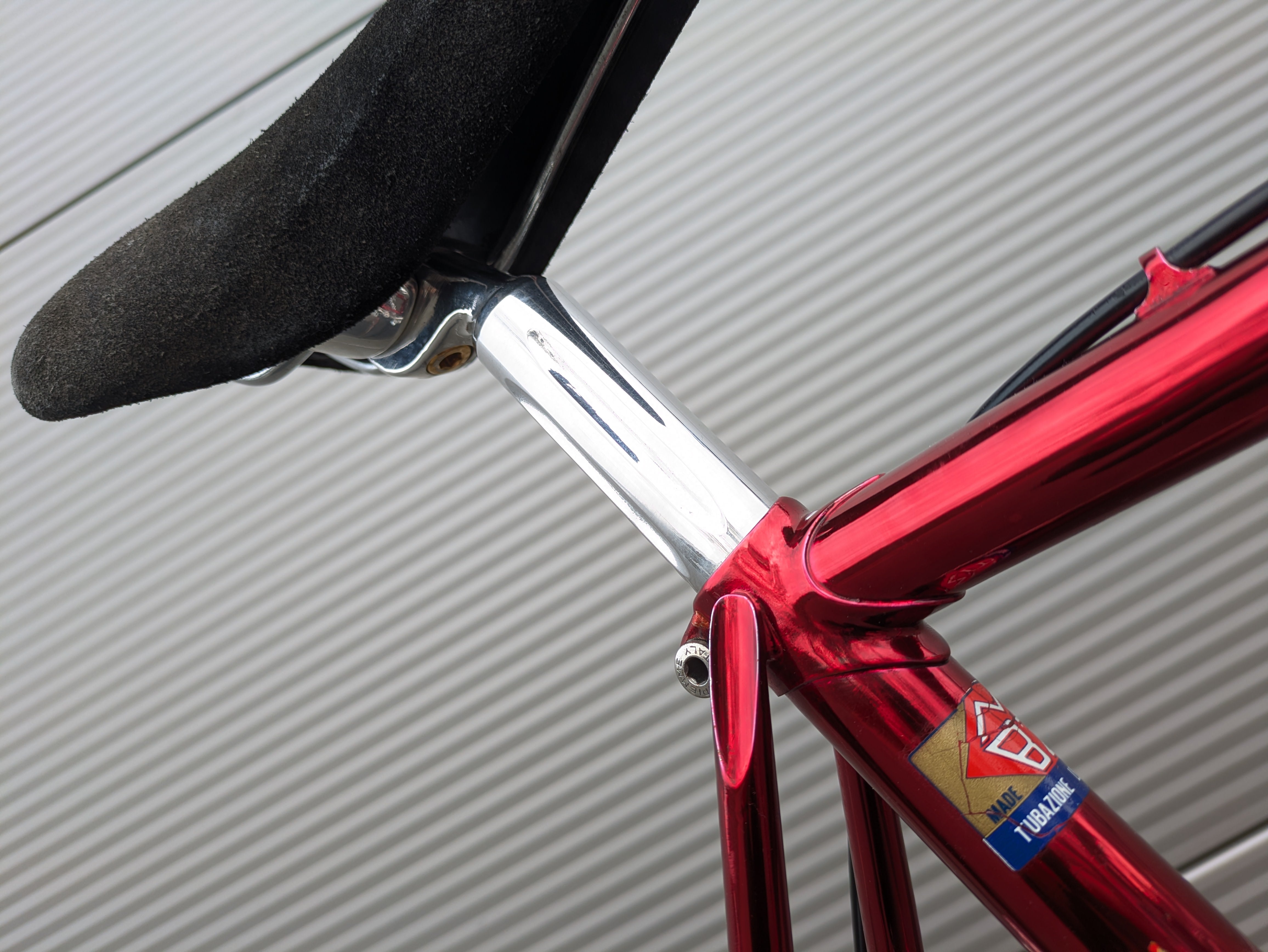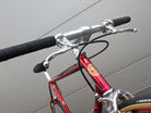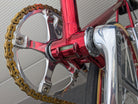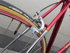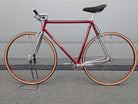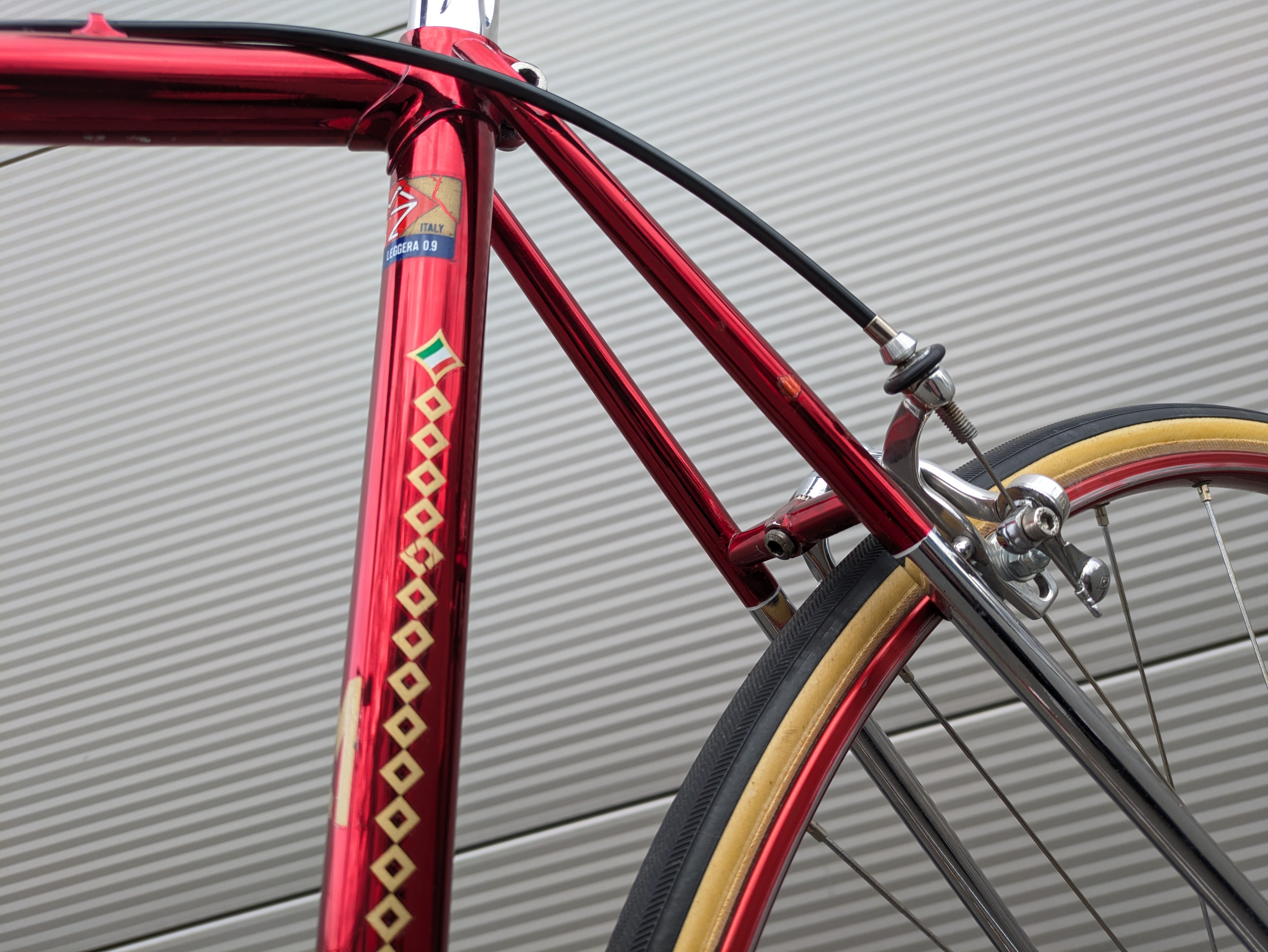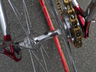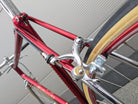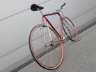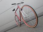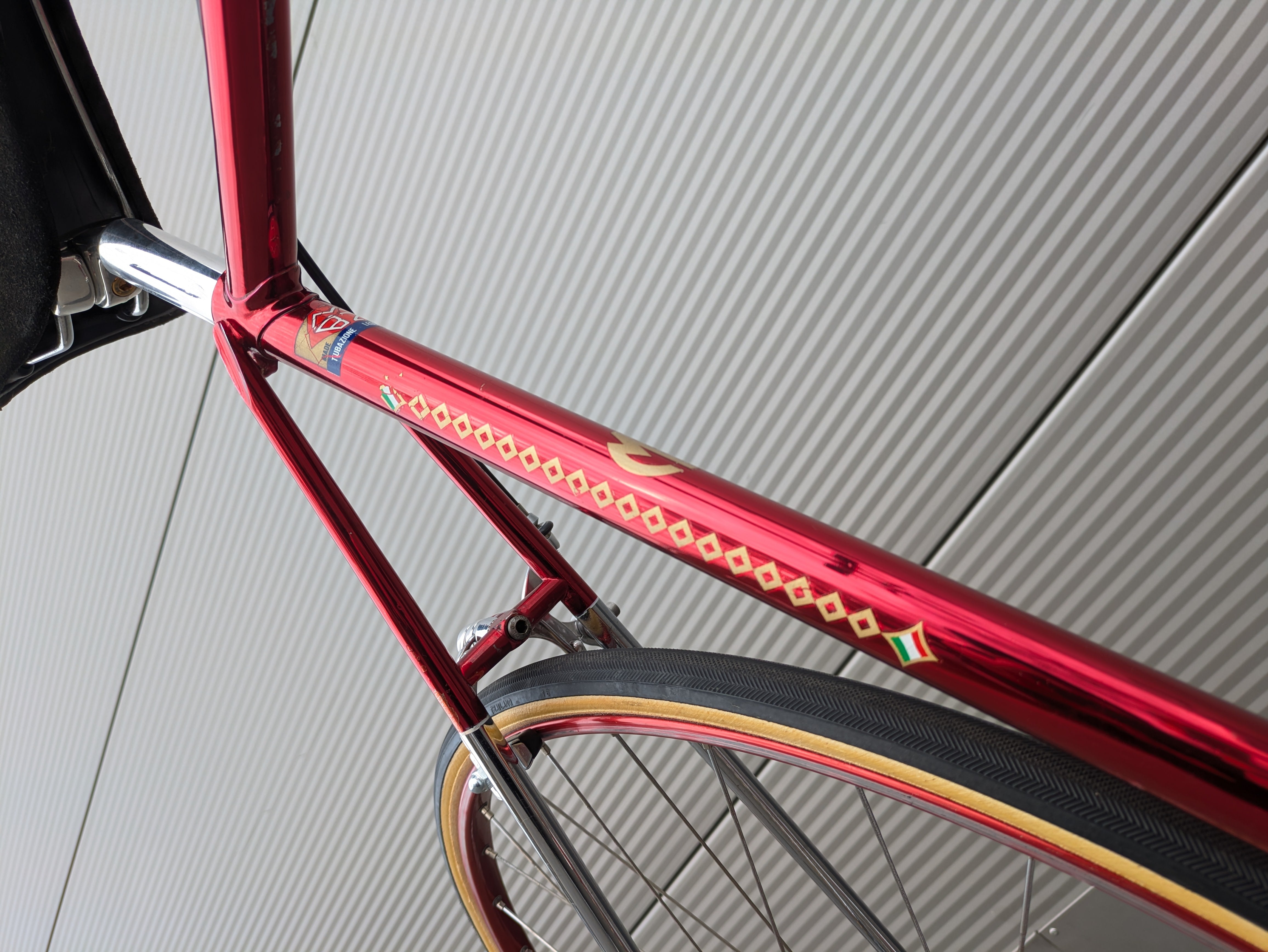 This exceptional singlespeed bike is based on a frame built by the small Milanese workshop Milanetti, known for producing finely crafted steel frames in limited numbers. The standout feature is the red cromovelato finish: the frame was first fully chrome-plated and then coated with an extremely thin, transparent tinted layer, giving the steel remarkable depth and luminosity. Combined with the chrome fork and red Ambrosio rims, the result is a striking and highly cohesive aesthetic.