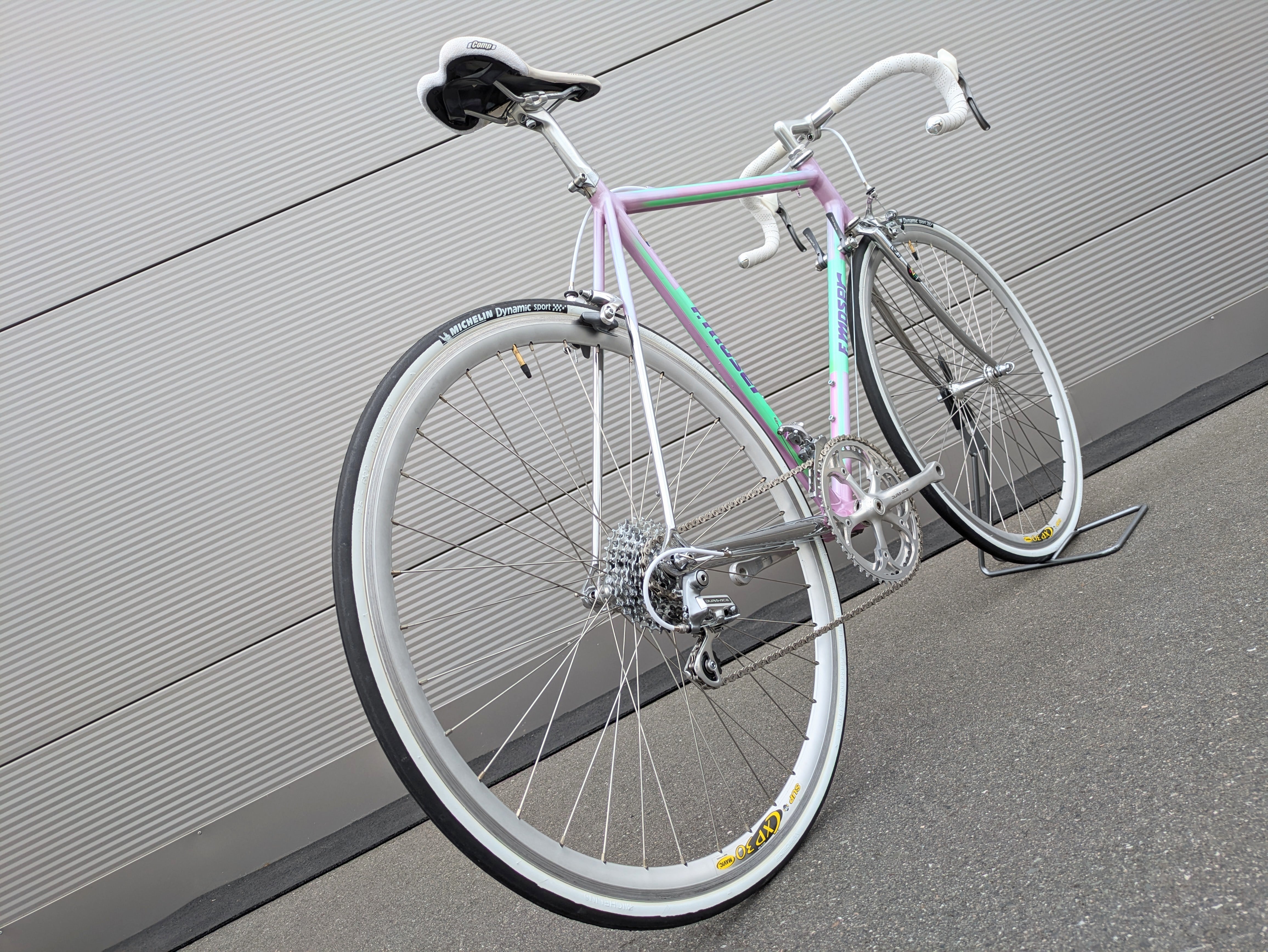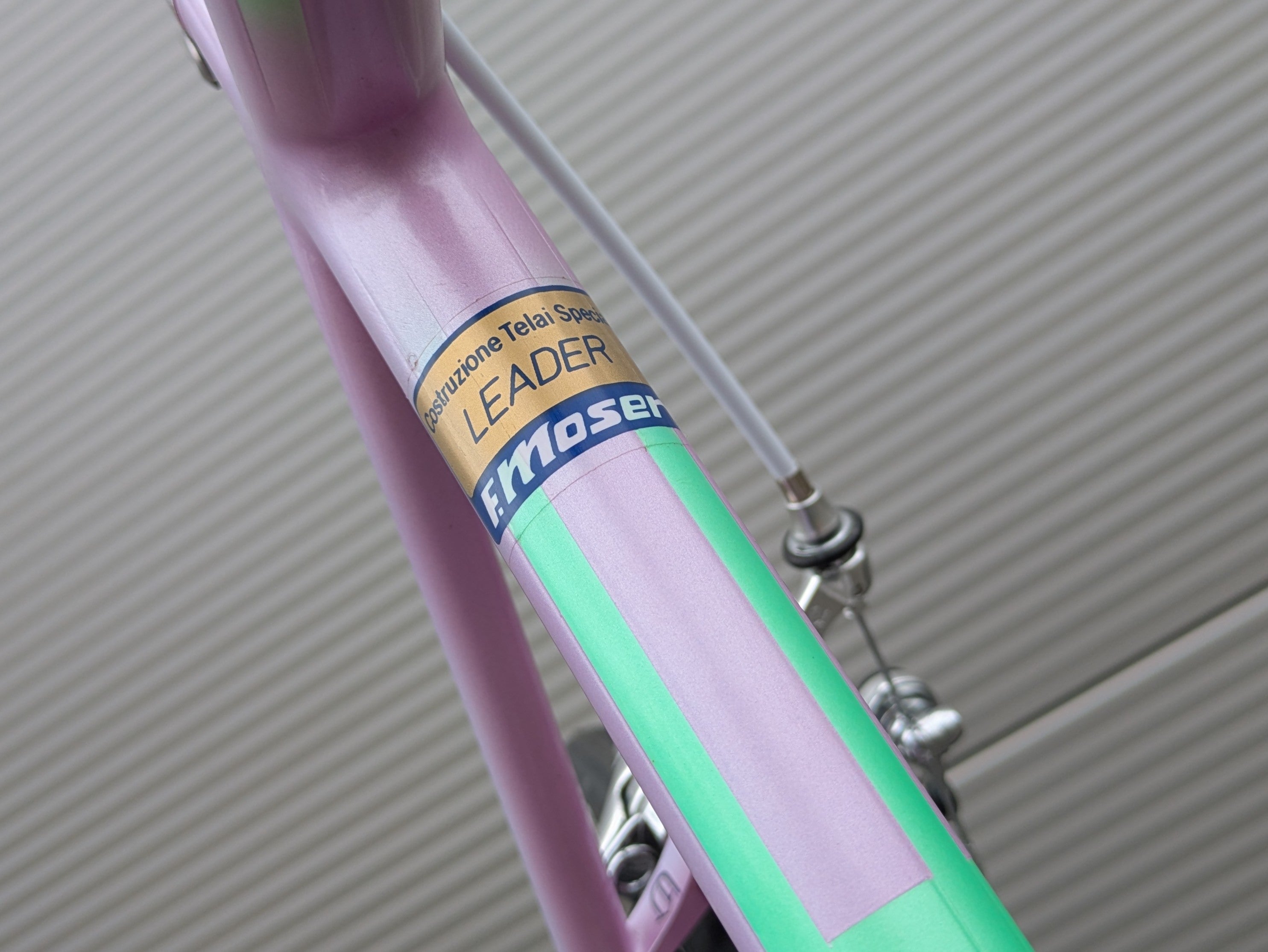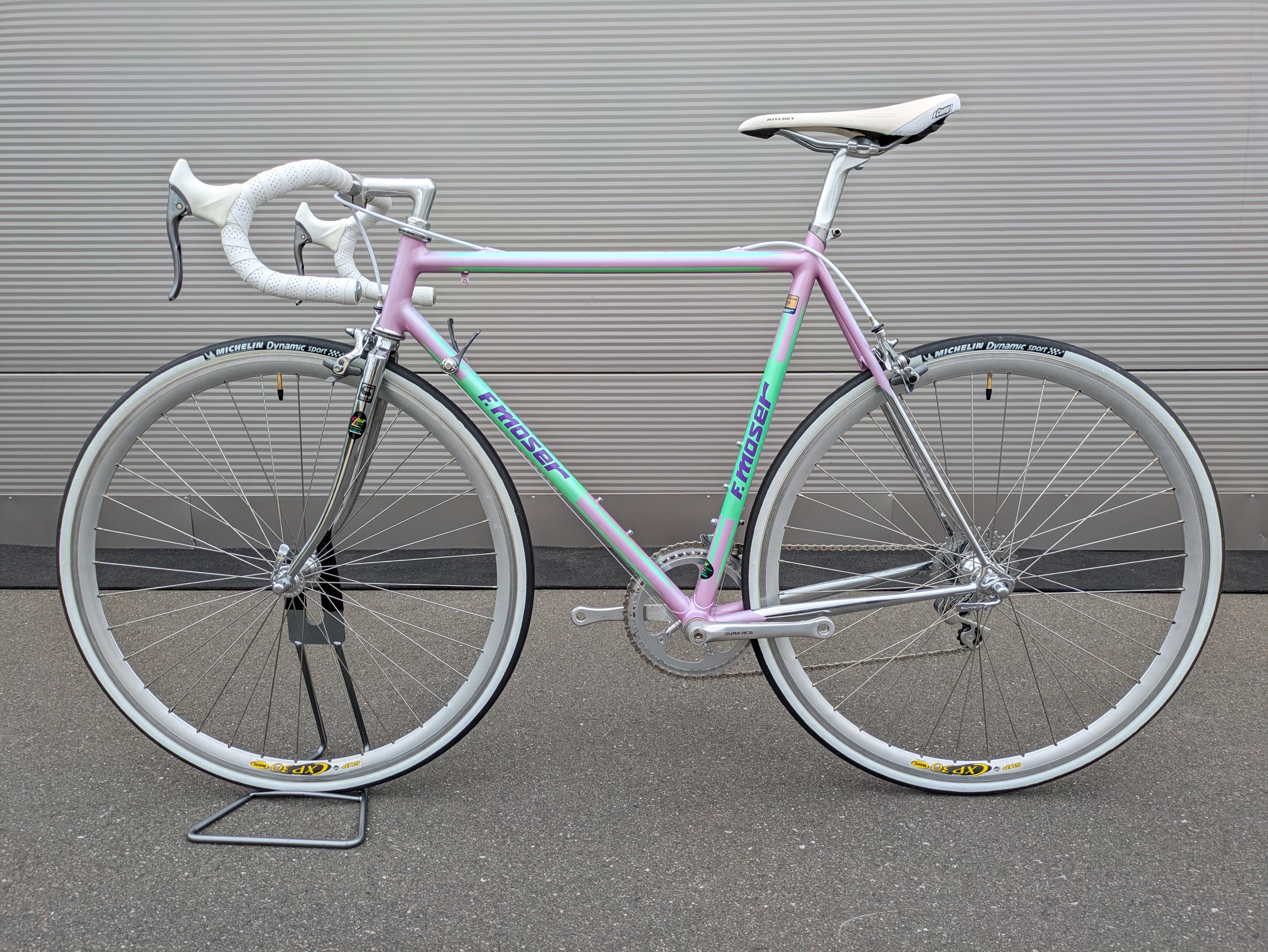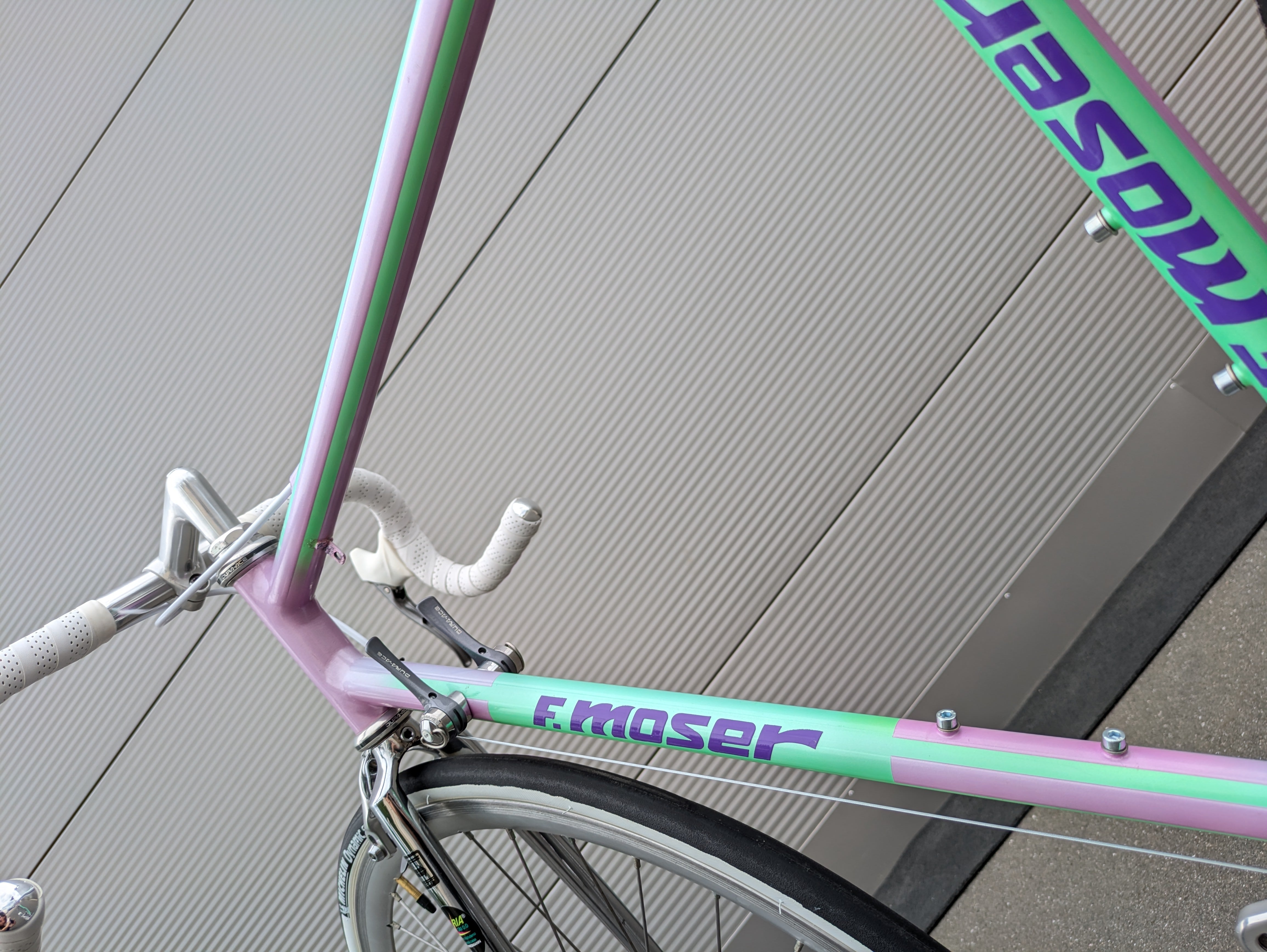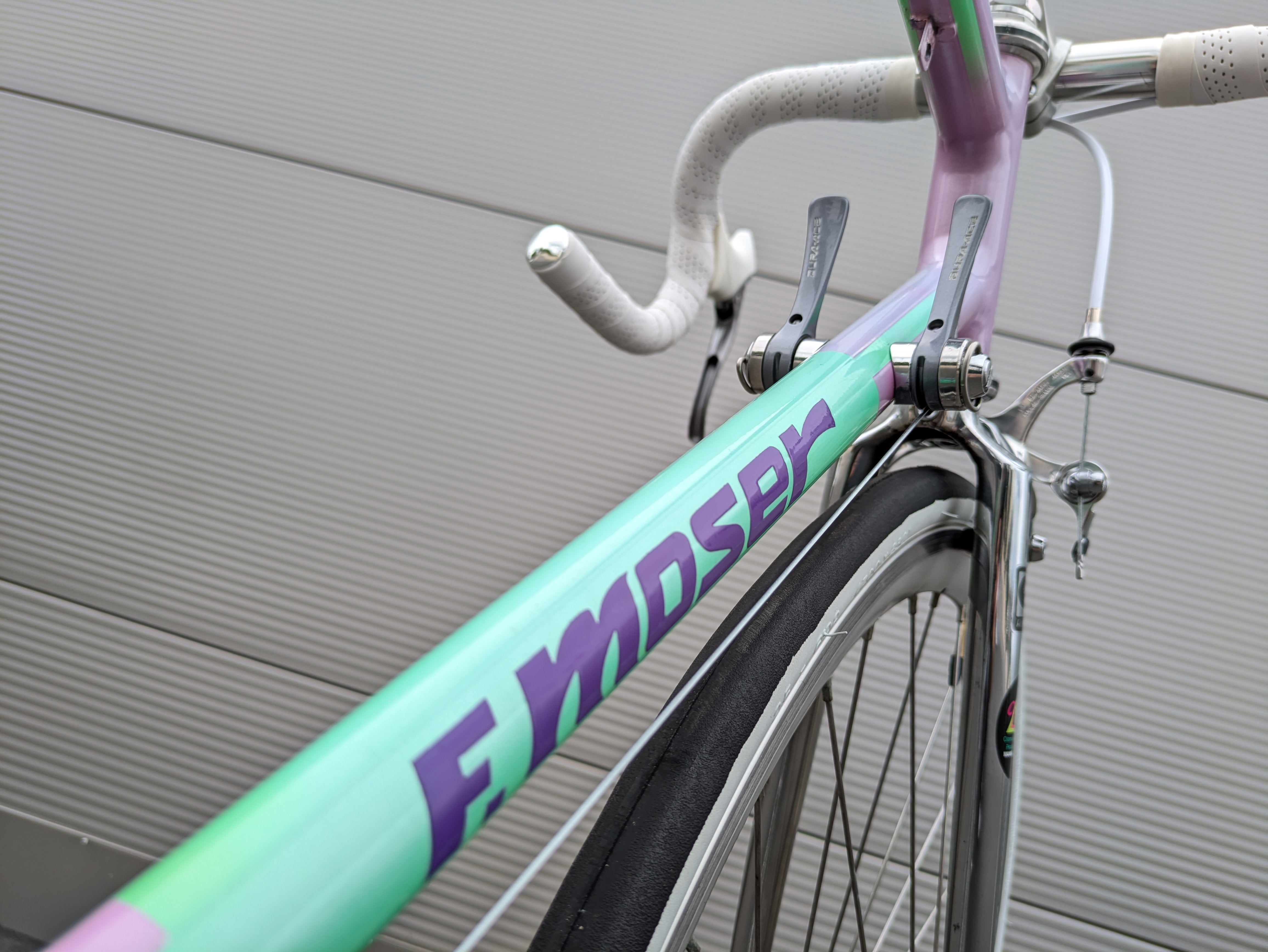 This Moser Leader from the 1990s stands out with a rare and striking color scheme: turquoise and violet. The combination is a real eye-catcher, setting it apart from other road bikes of its era.