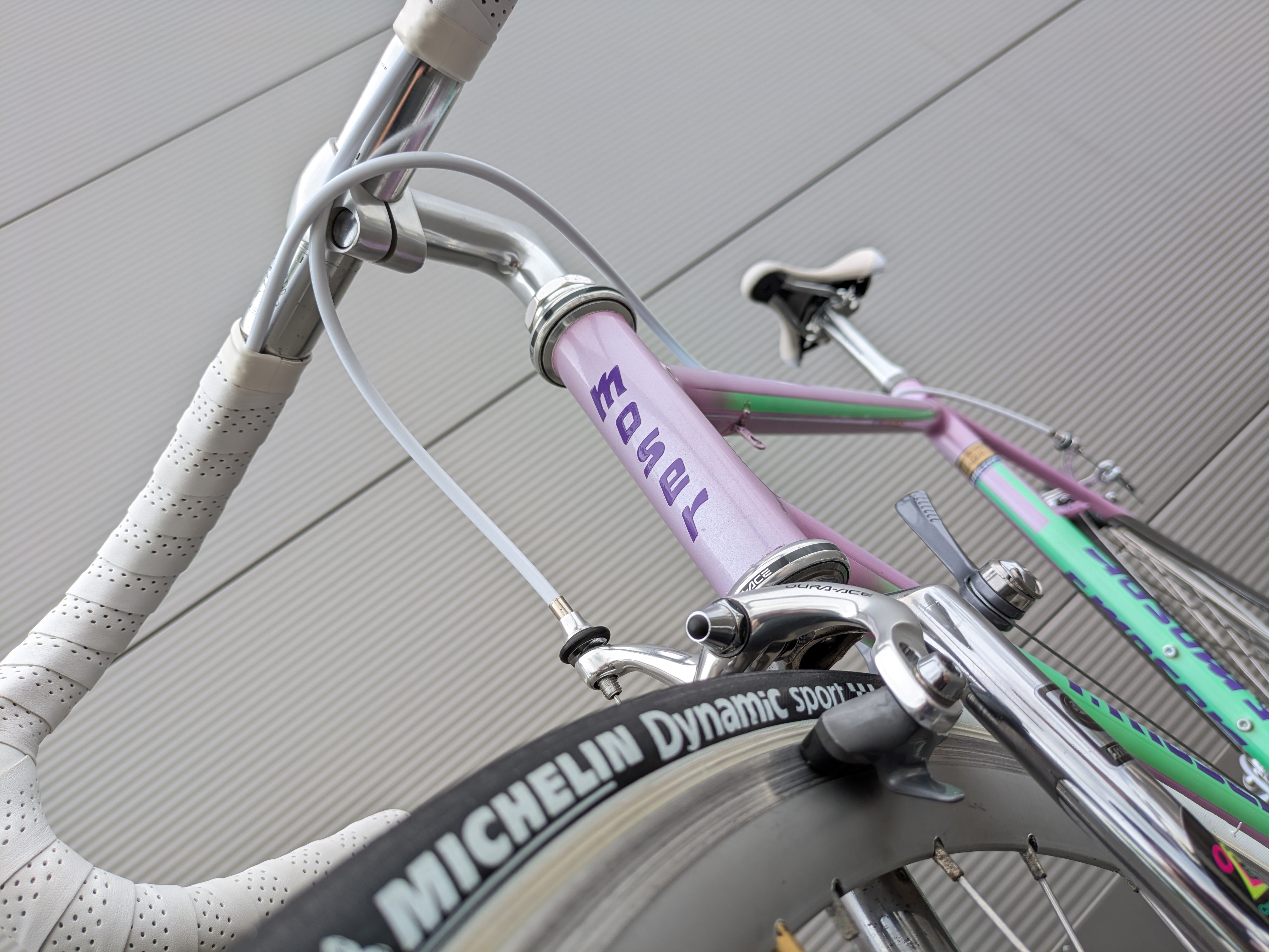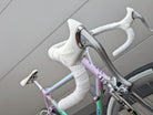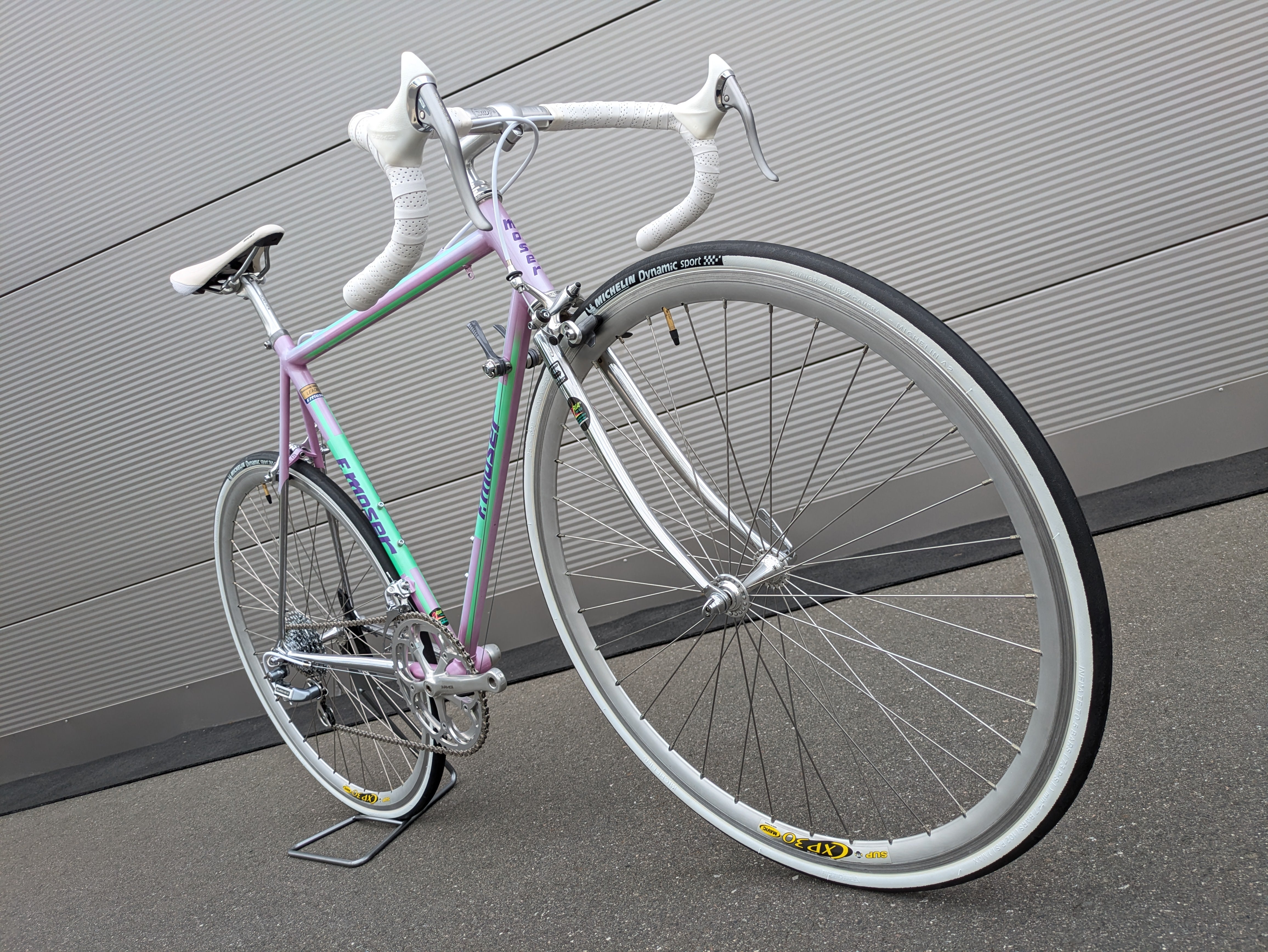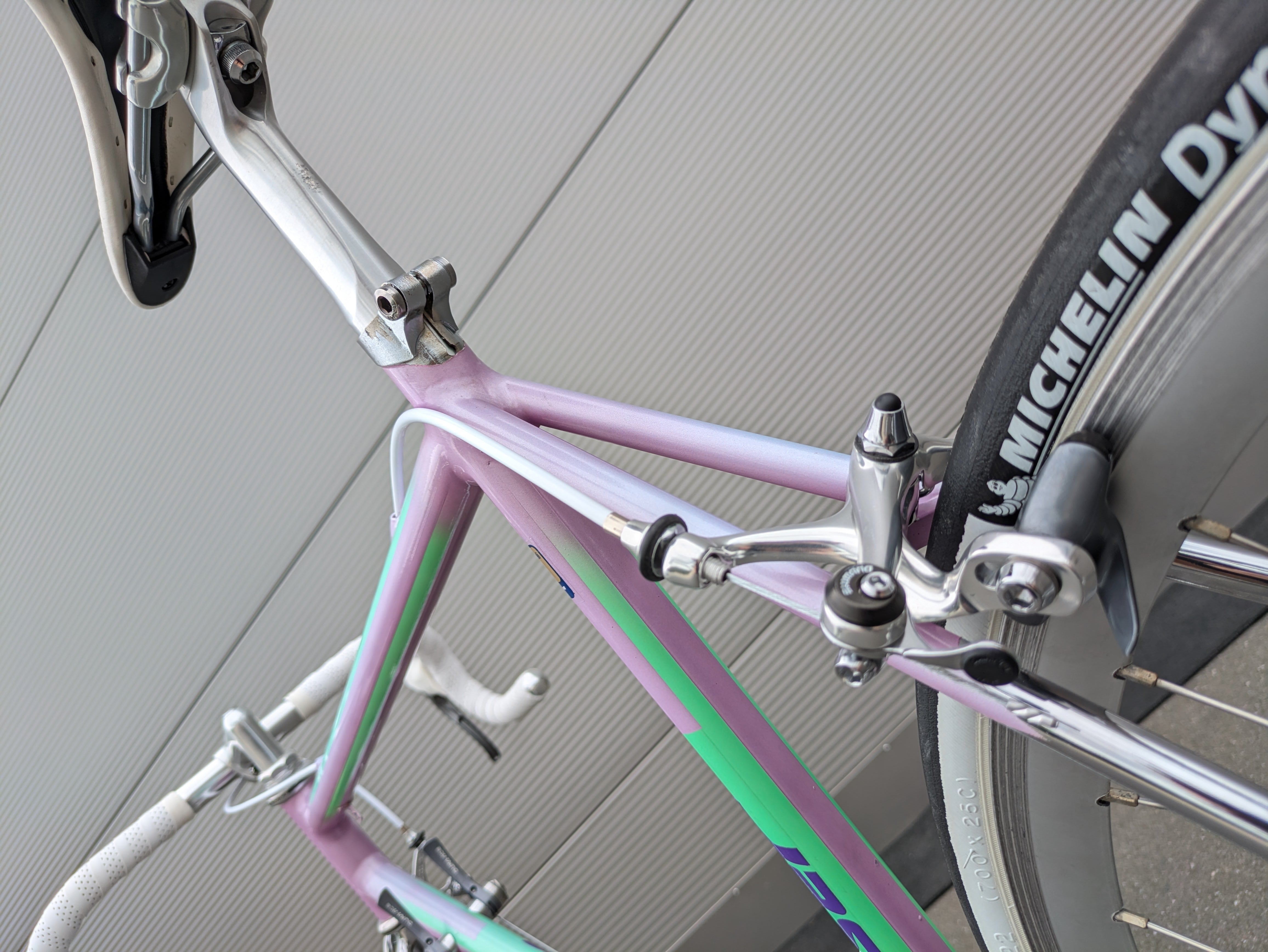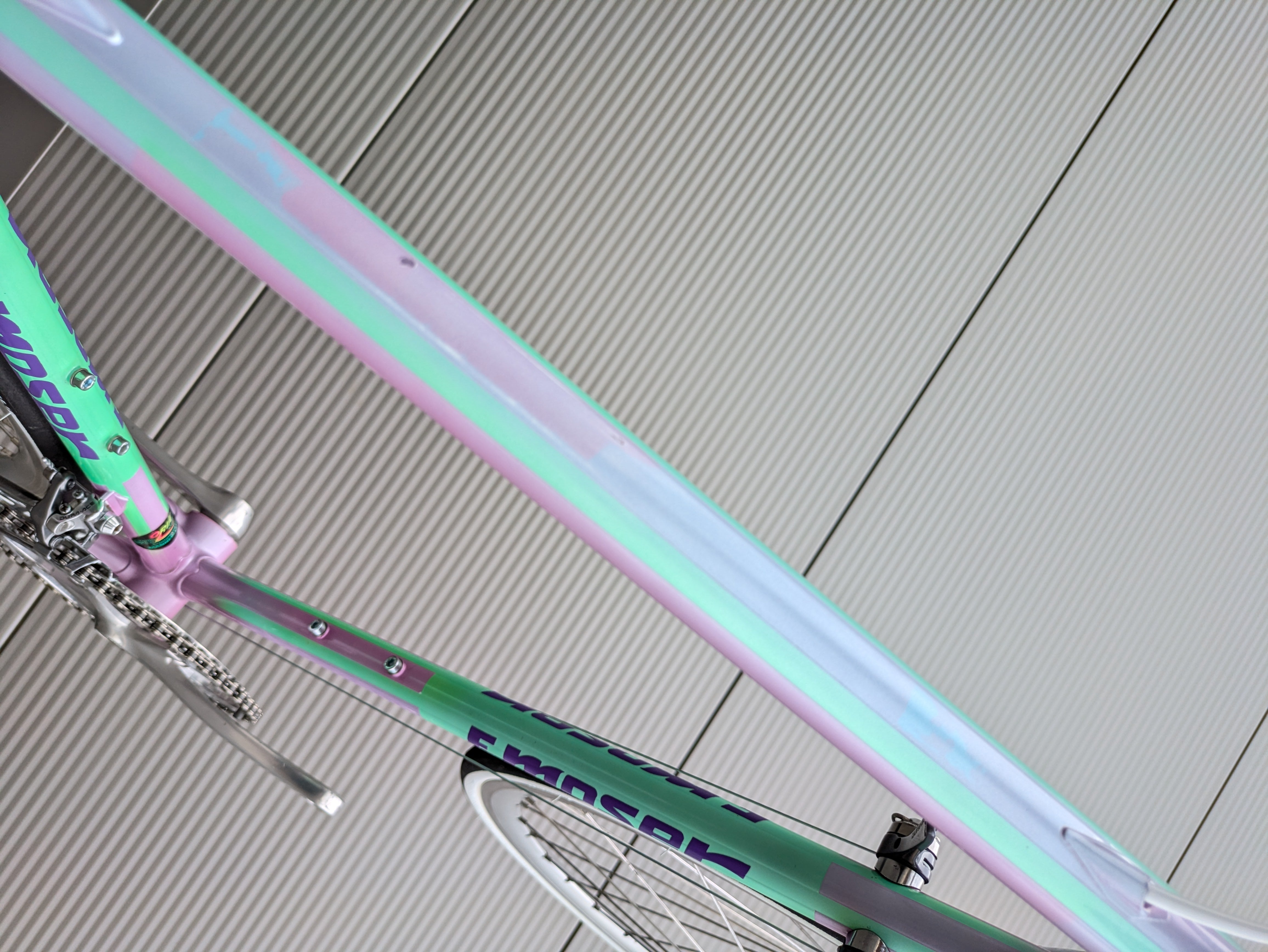 This Moser Leader from the 1990s stands out with a rare and striking color scheme: turquoise and violet. The combination is a real eye-catcher, setting it apart from other road bikes of its era.