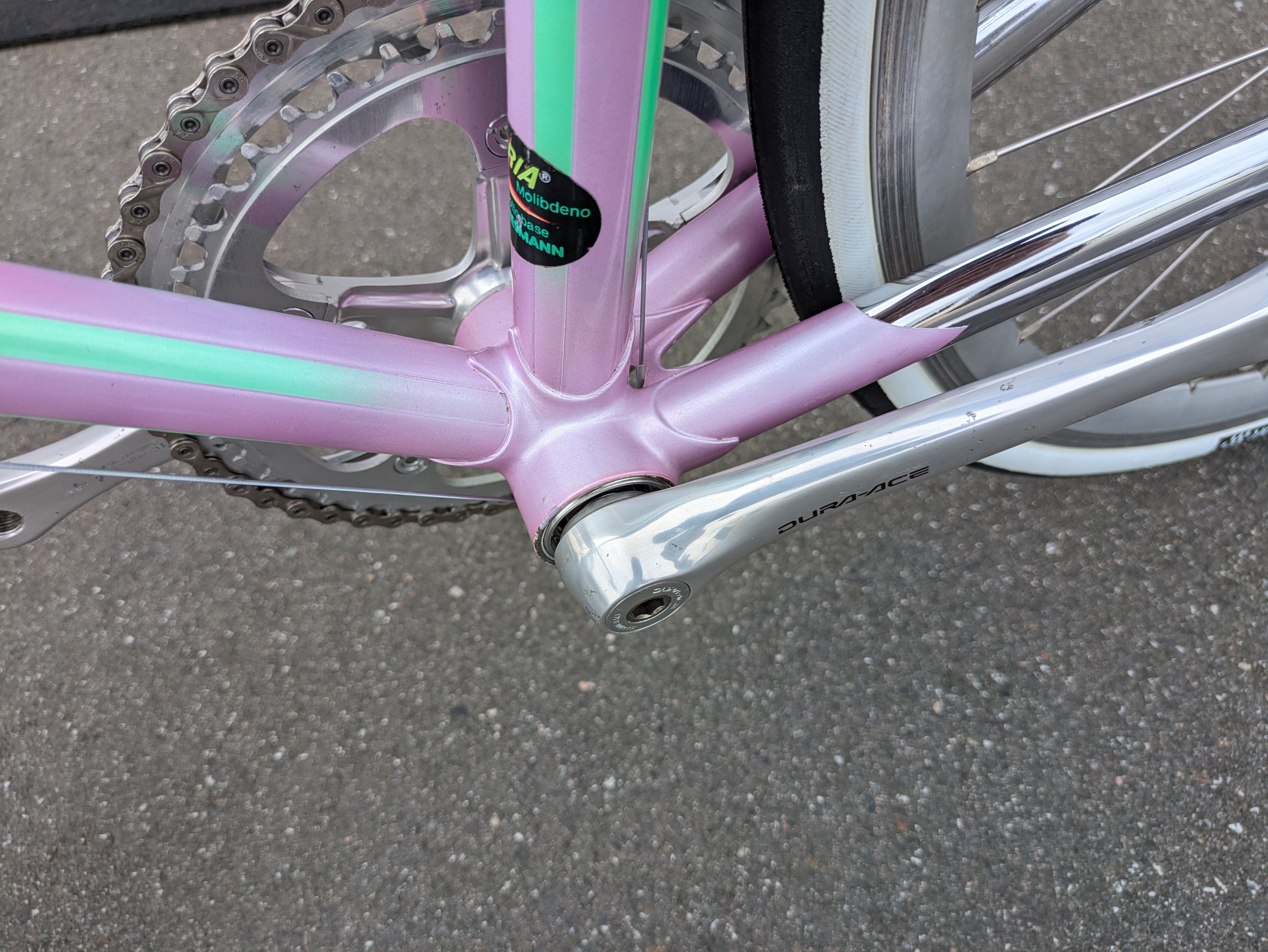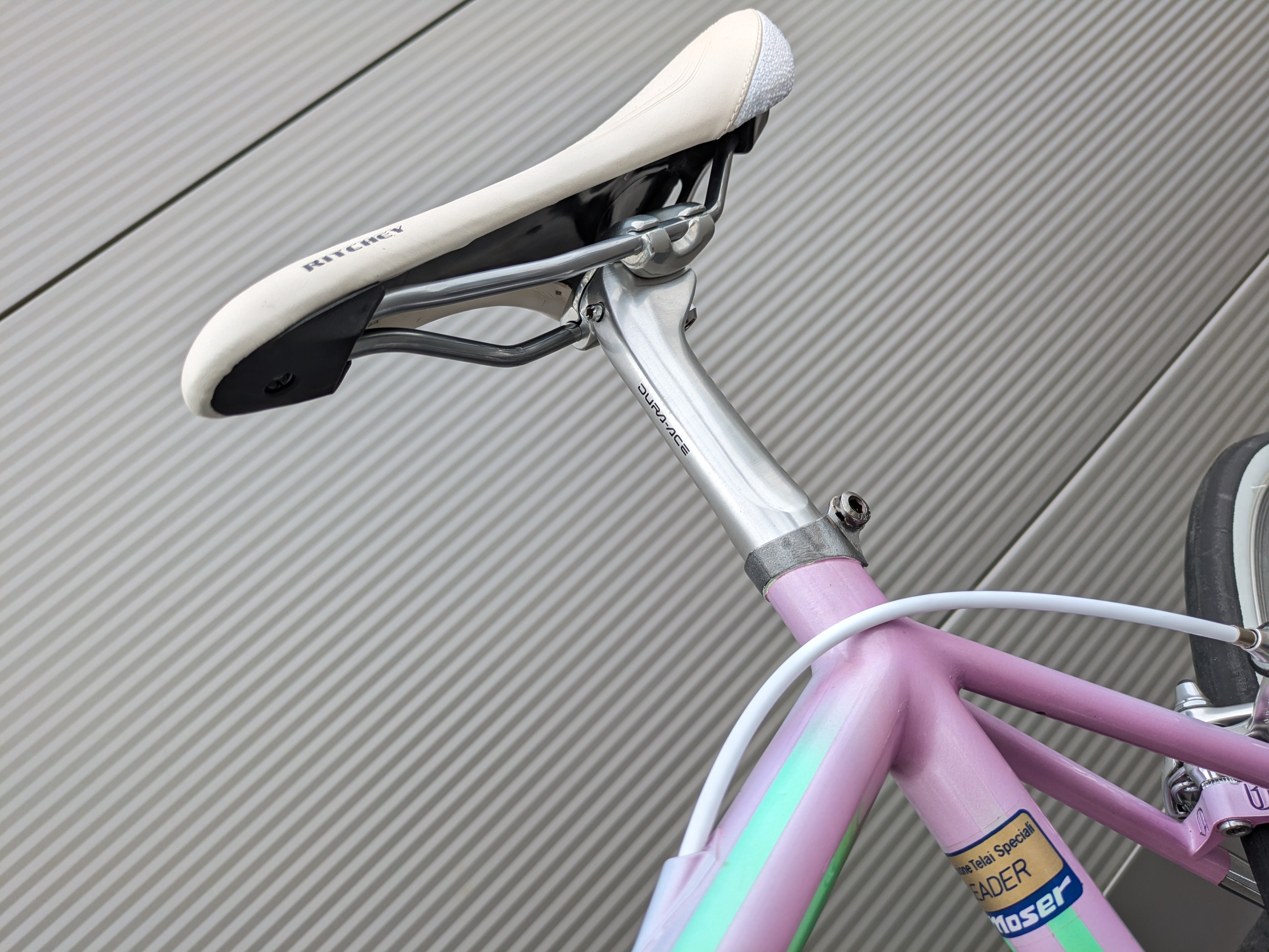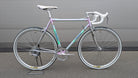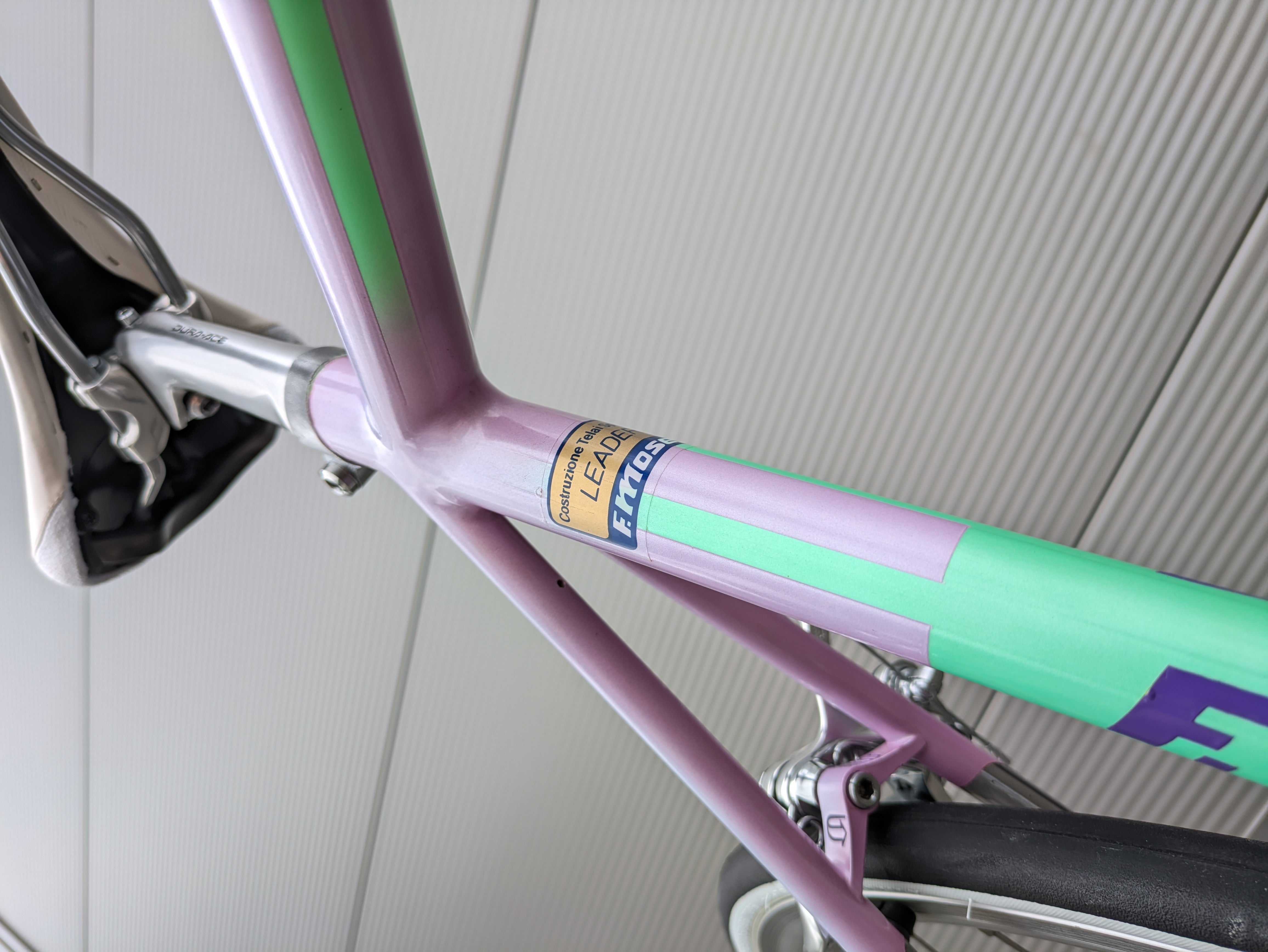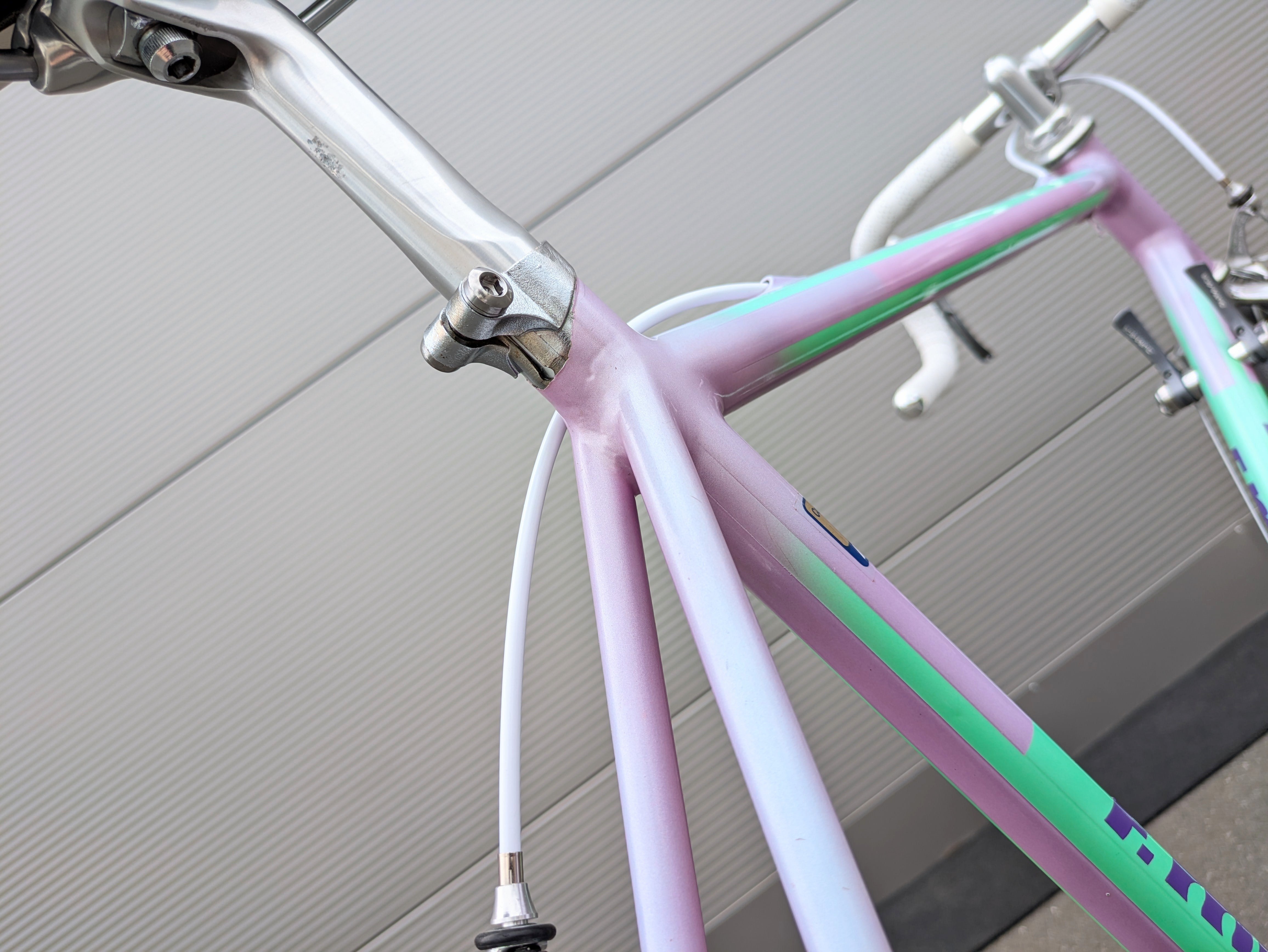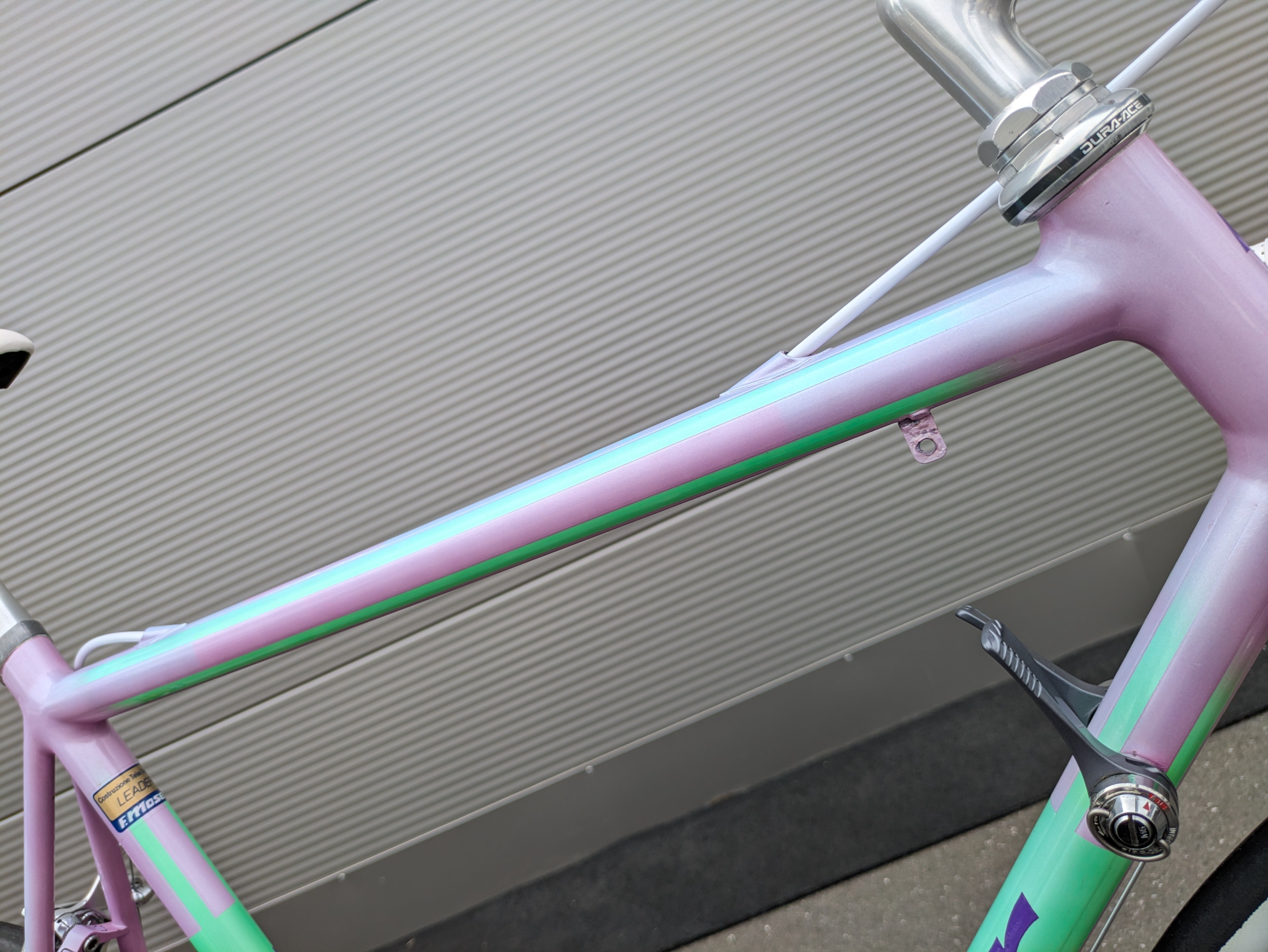 This Moser Leader from the 1990s stands out with a rare and striking color scheme: turquoise and violet. The combination is a real eye-catcher, setting it apart from other road bikes of its era.