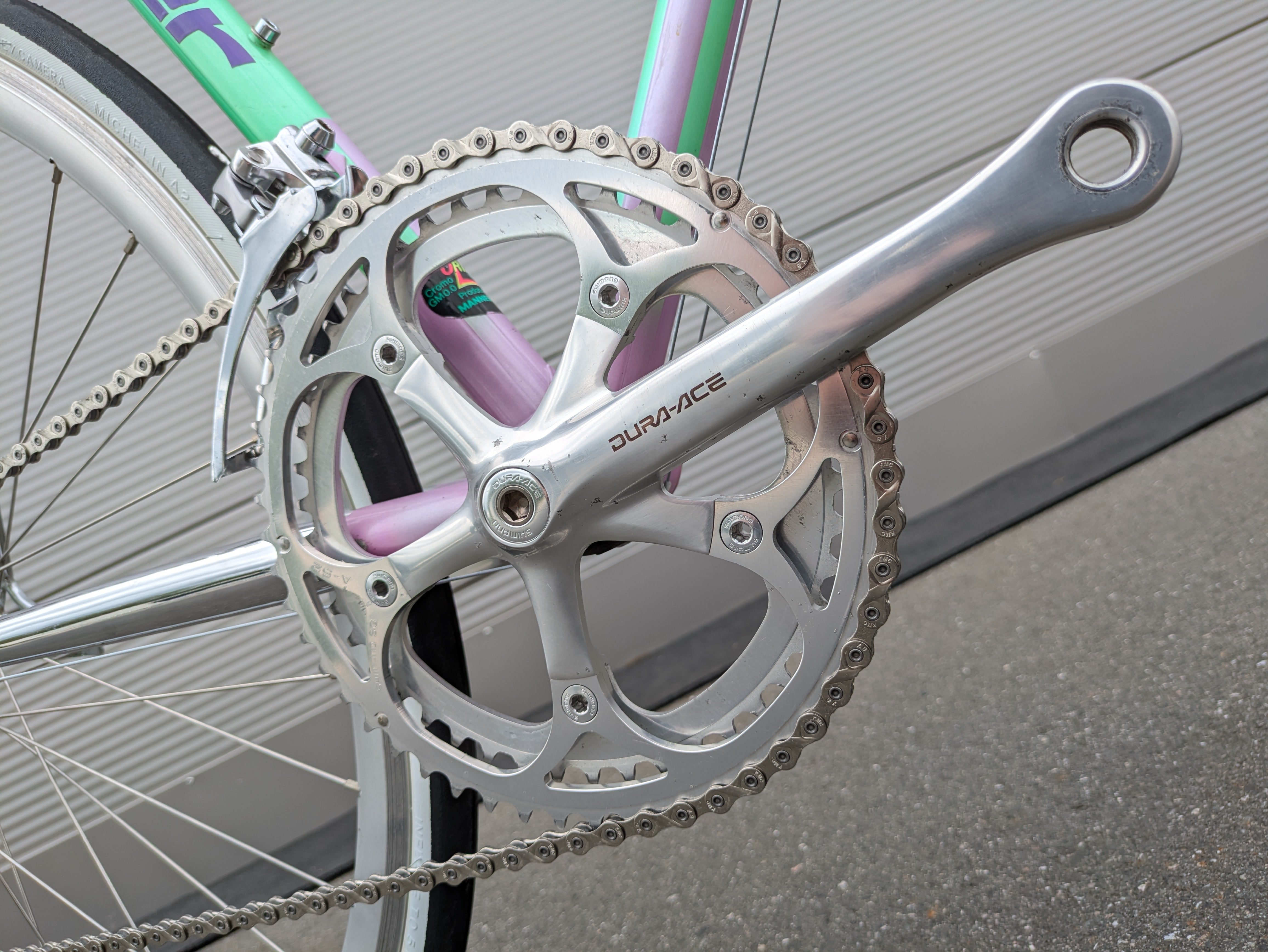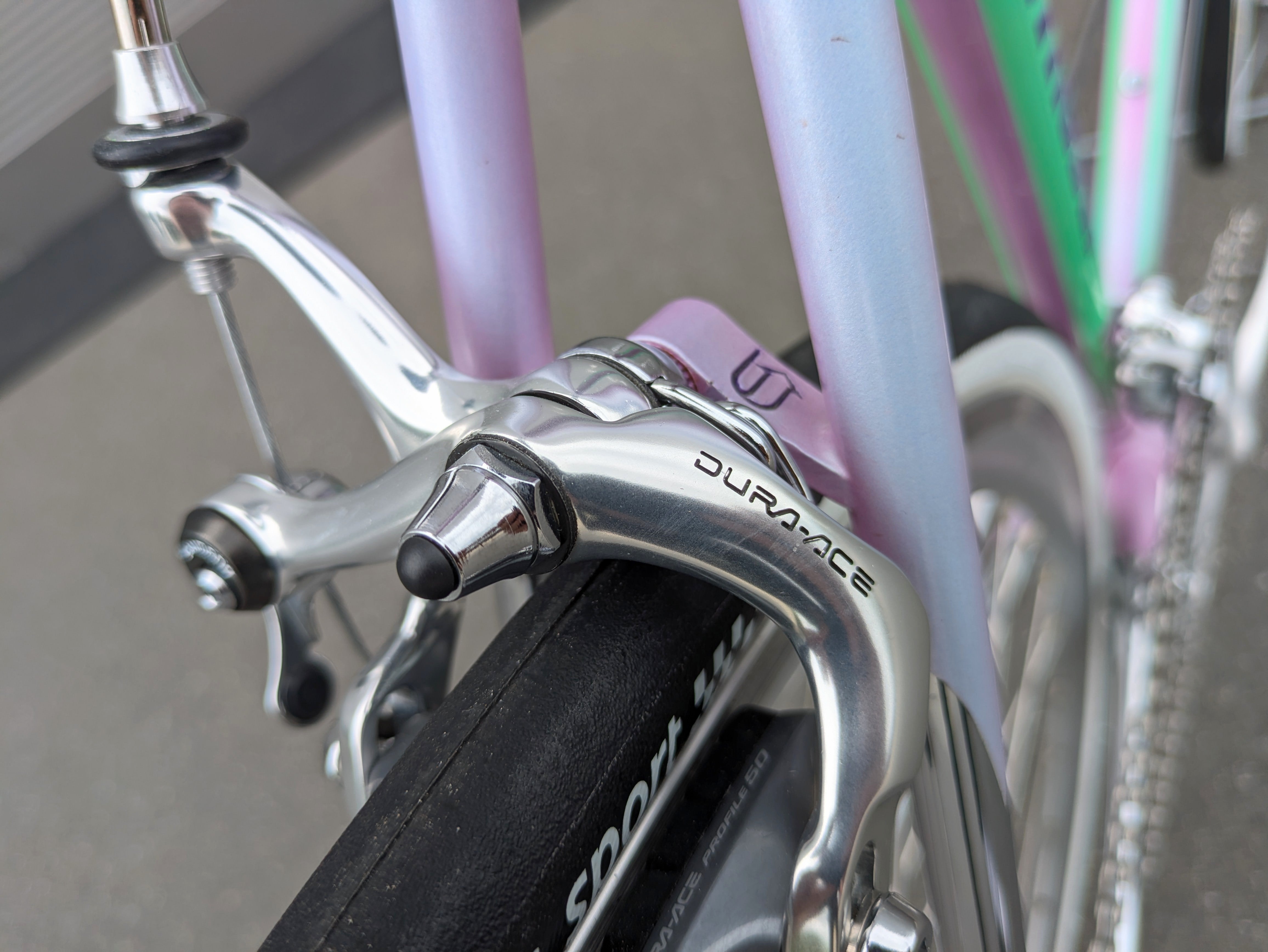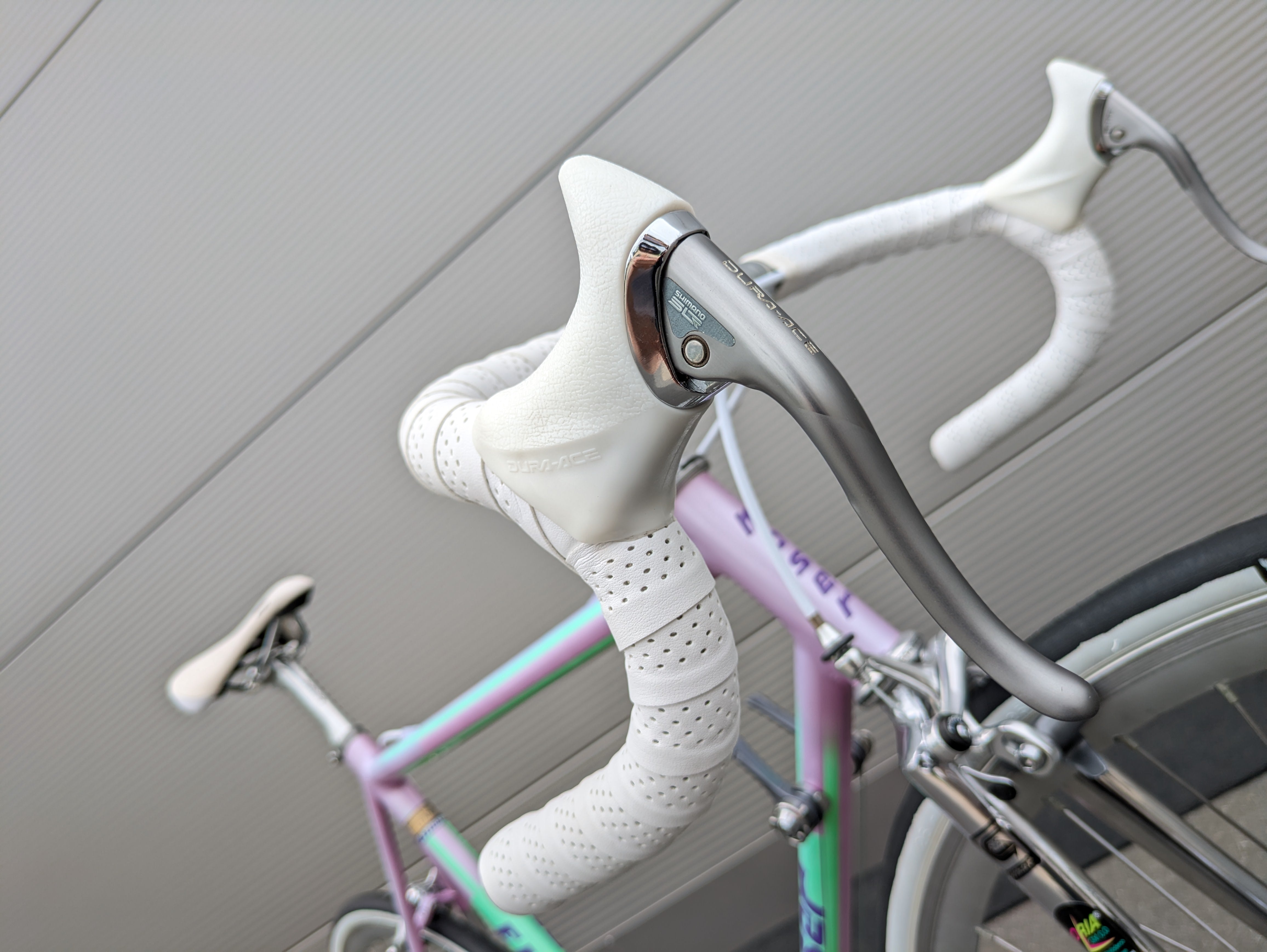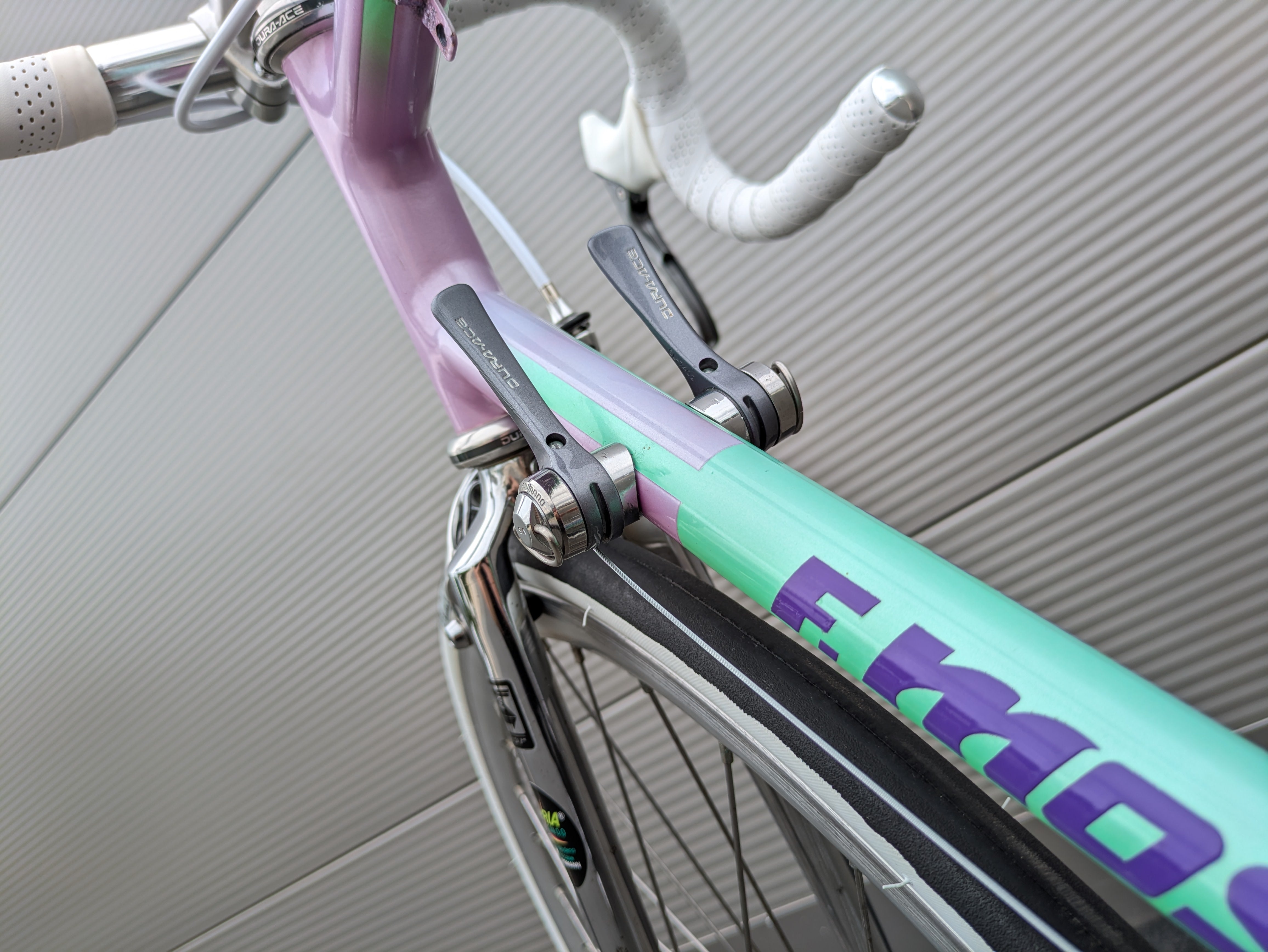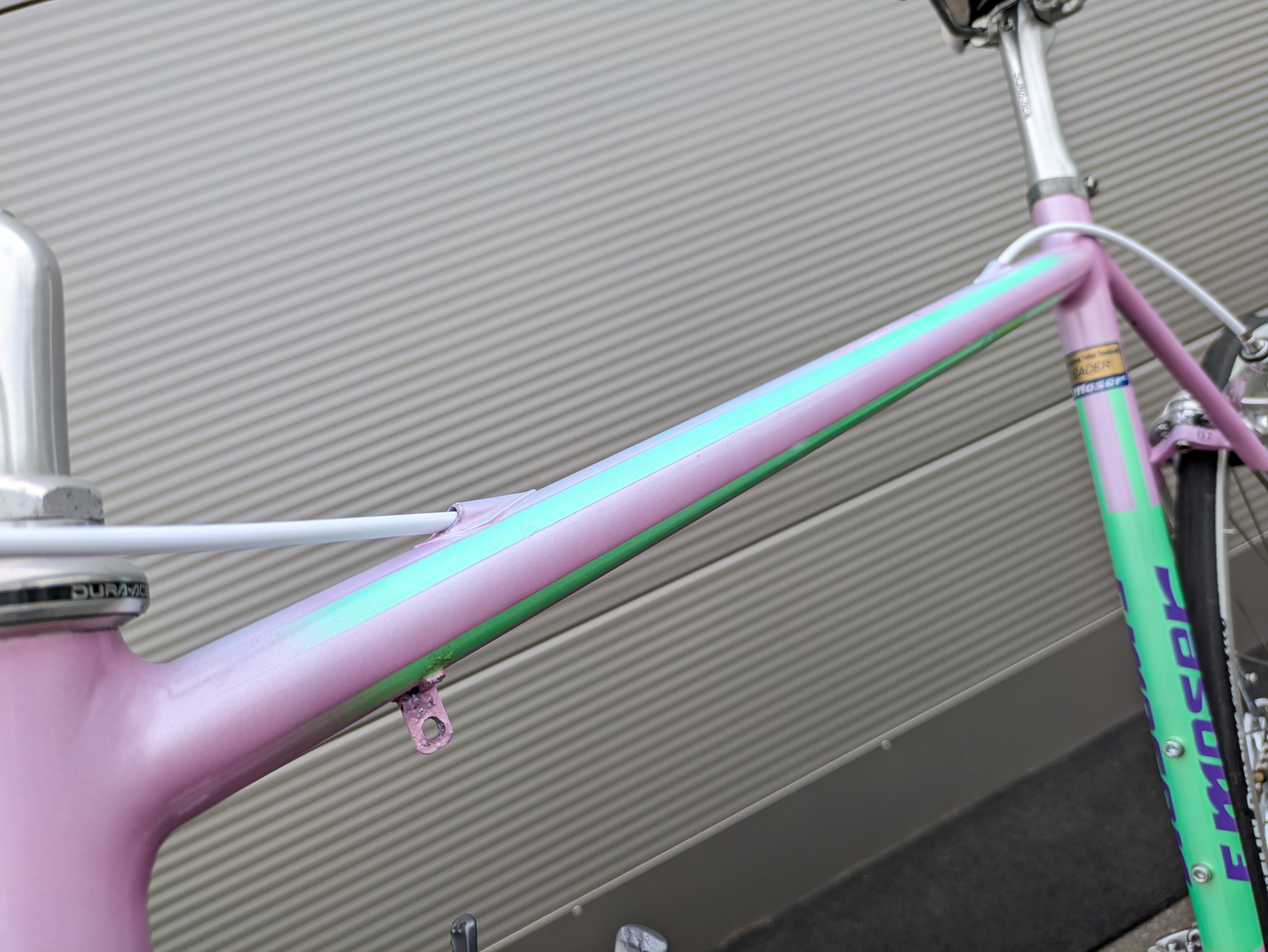 This Moser Leader from the 1990s stands out with a rare and striking color scheme: turquoise and violet. The combination is a real eye-catcher, setting it apart from other road bikes of its era.