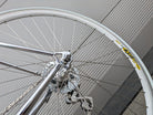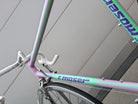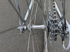 The frame is crafted from high-quality steel and finished with fillet-brazing, giving it both stability and a refined appearance. It features a race plate holder on the top tube, often an indicator of professional or semi-professional racing bikes. The bike is equipped with a complete Shimano Dura-Ace groupset, renowned for its precision and durability. This top-tier setup delivers an unmatched riding experience and reflects the high standards of this classic racing bike.