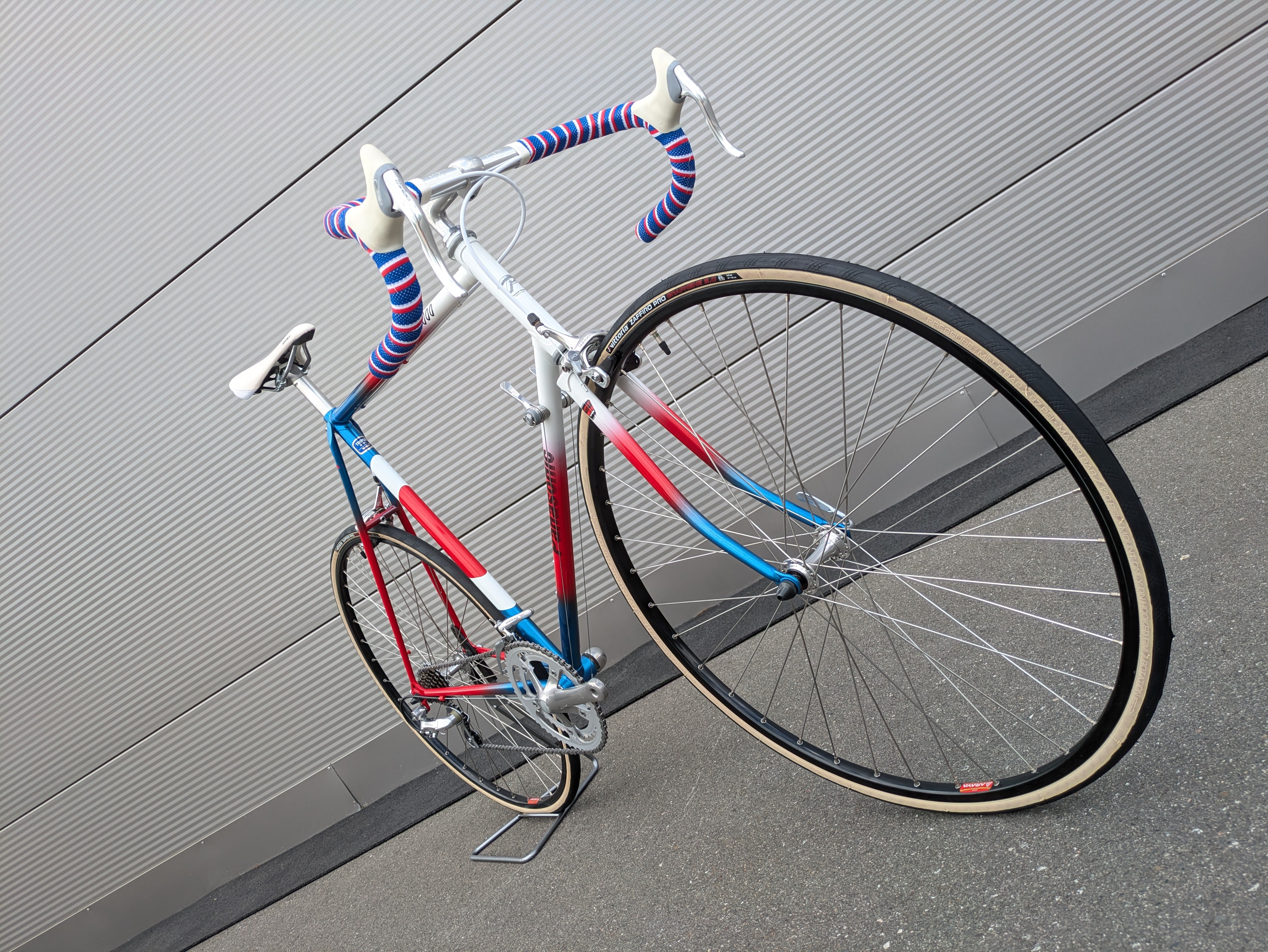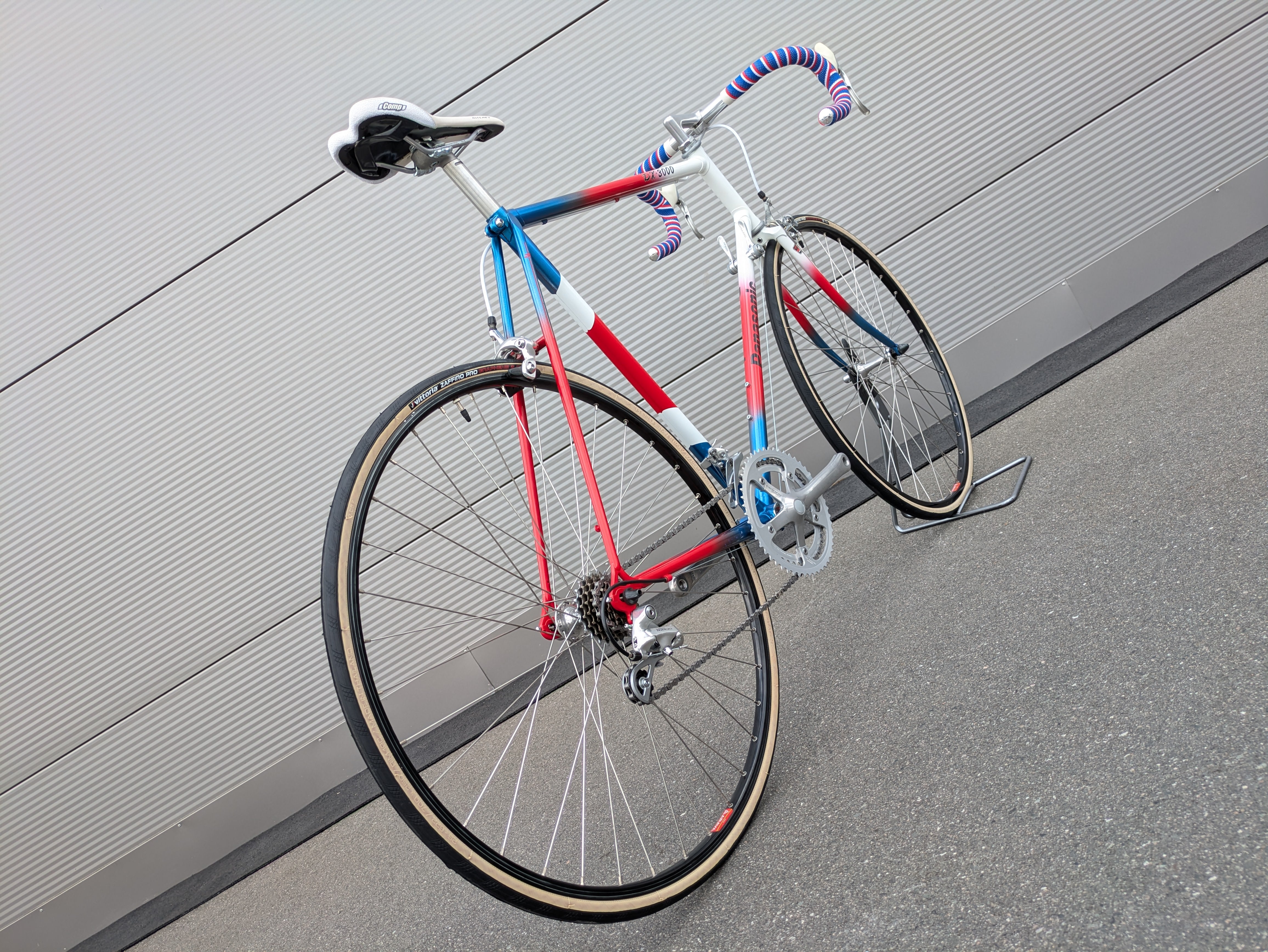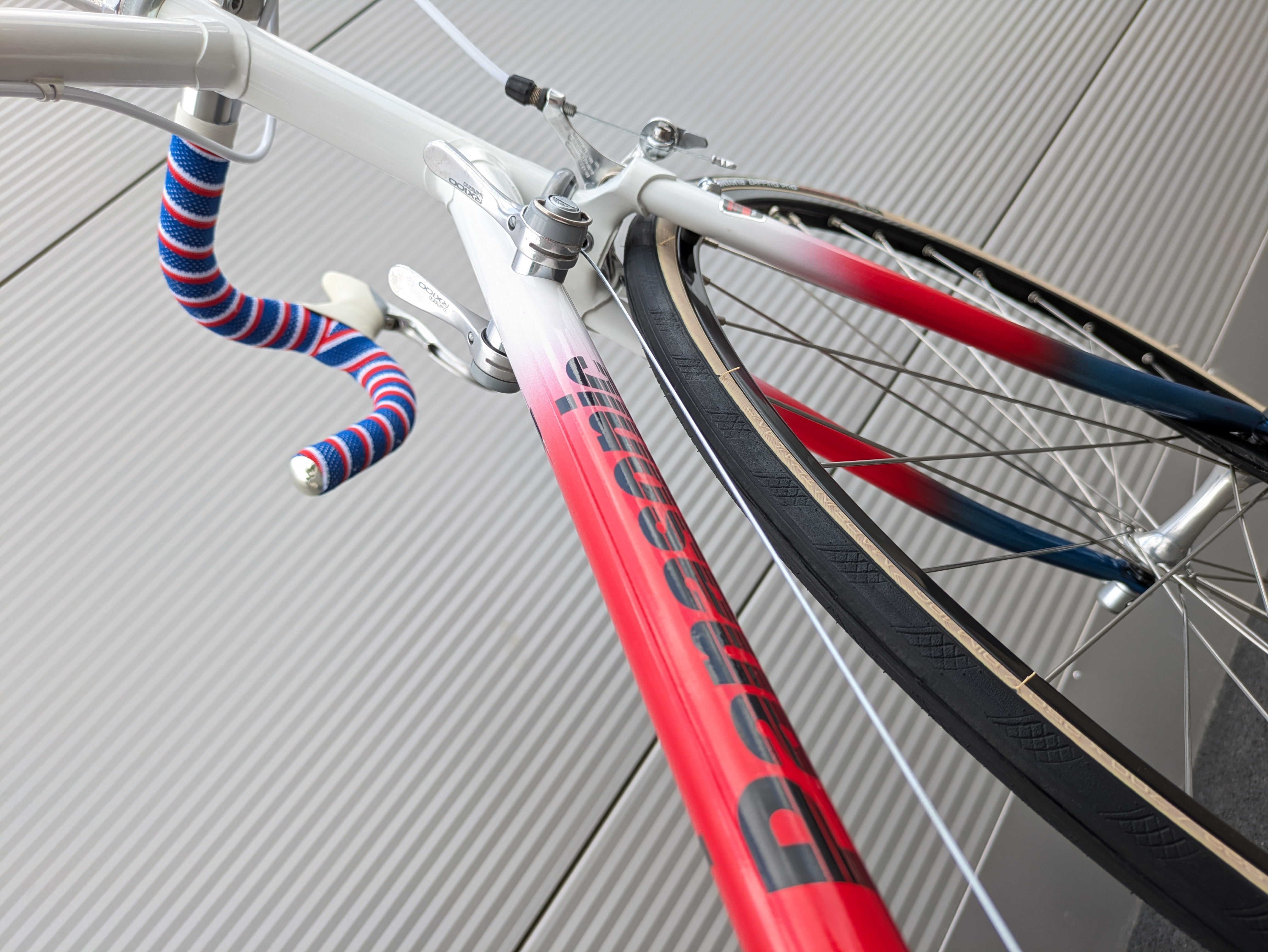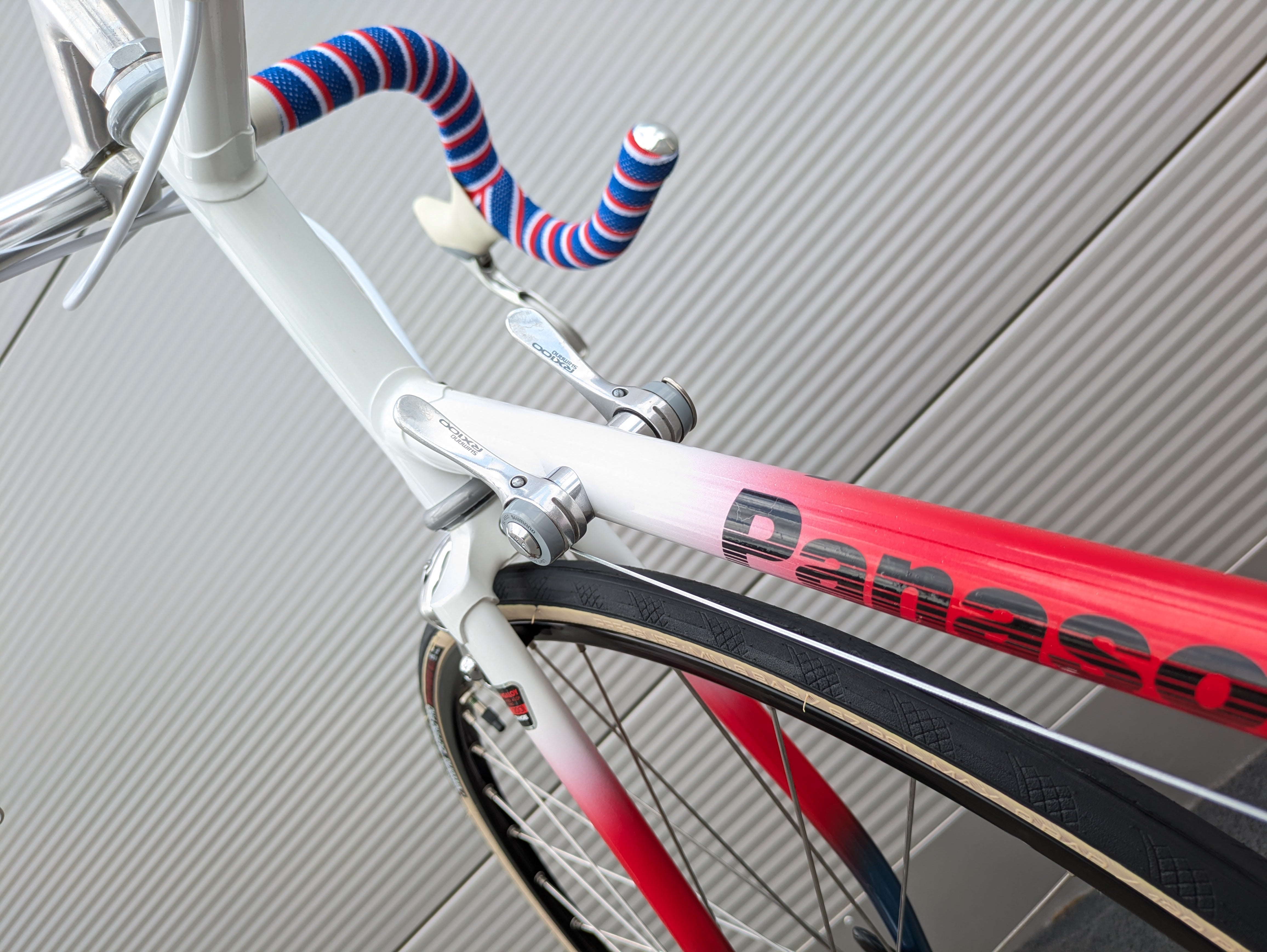 This example is equipped with a complete Shimano RX100 group, introduced in 1989. The RX100 was positioned as a robust, precise mid-range group and offered many features of the higher-end Shimano 105, including indexed downtube shifters, aero brake levers, a reliable double-chainring crankset, and precise caliper brakes. This made the DX3000 technically state-of-the-art at the time and an attractive choice for ambitious riders.