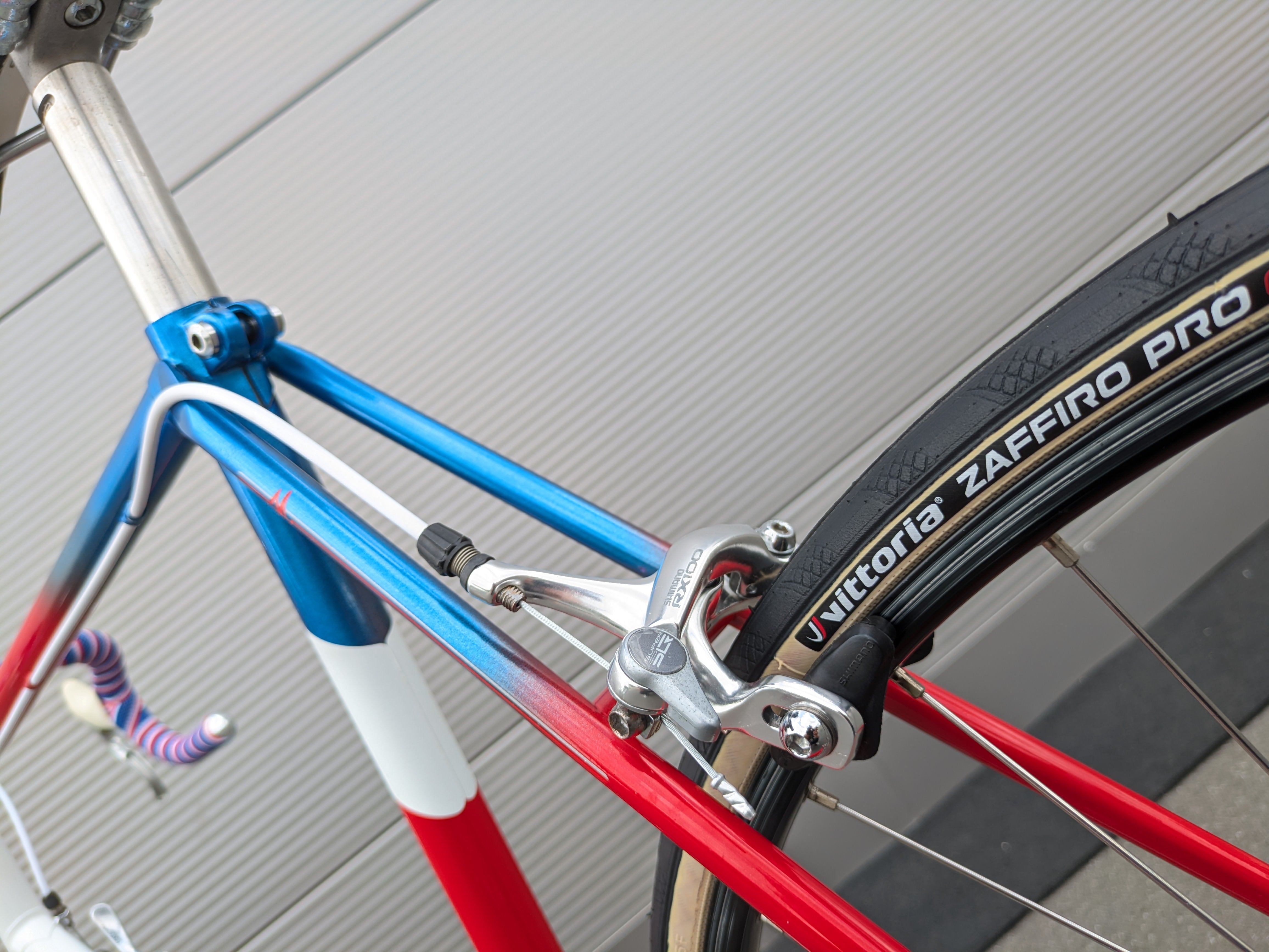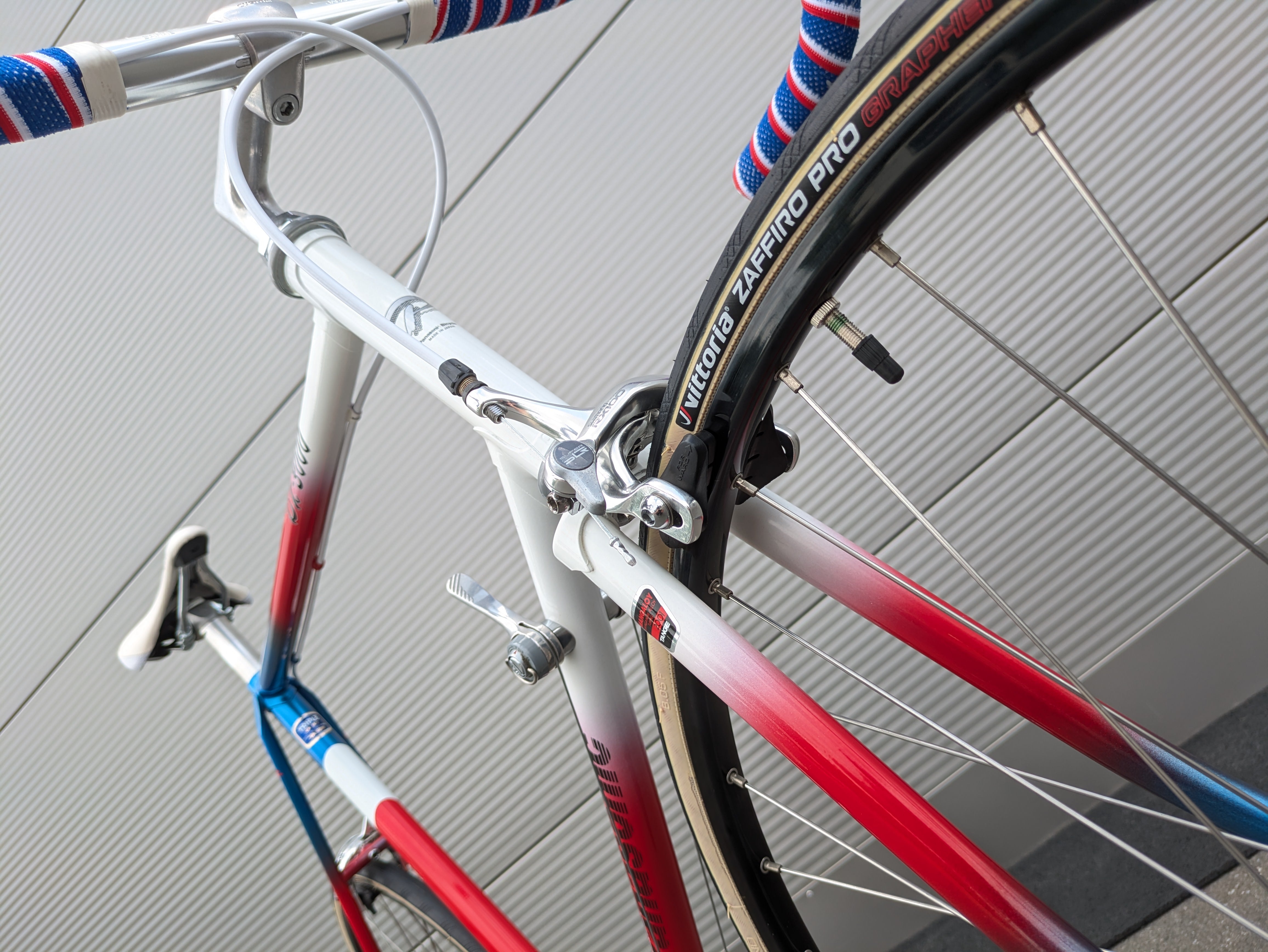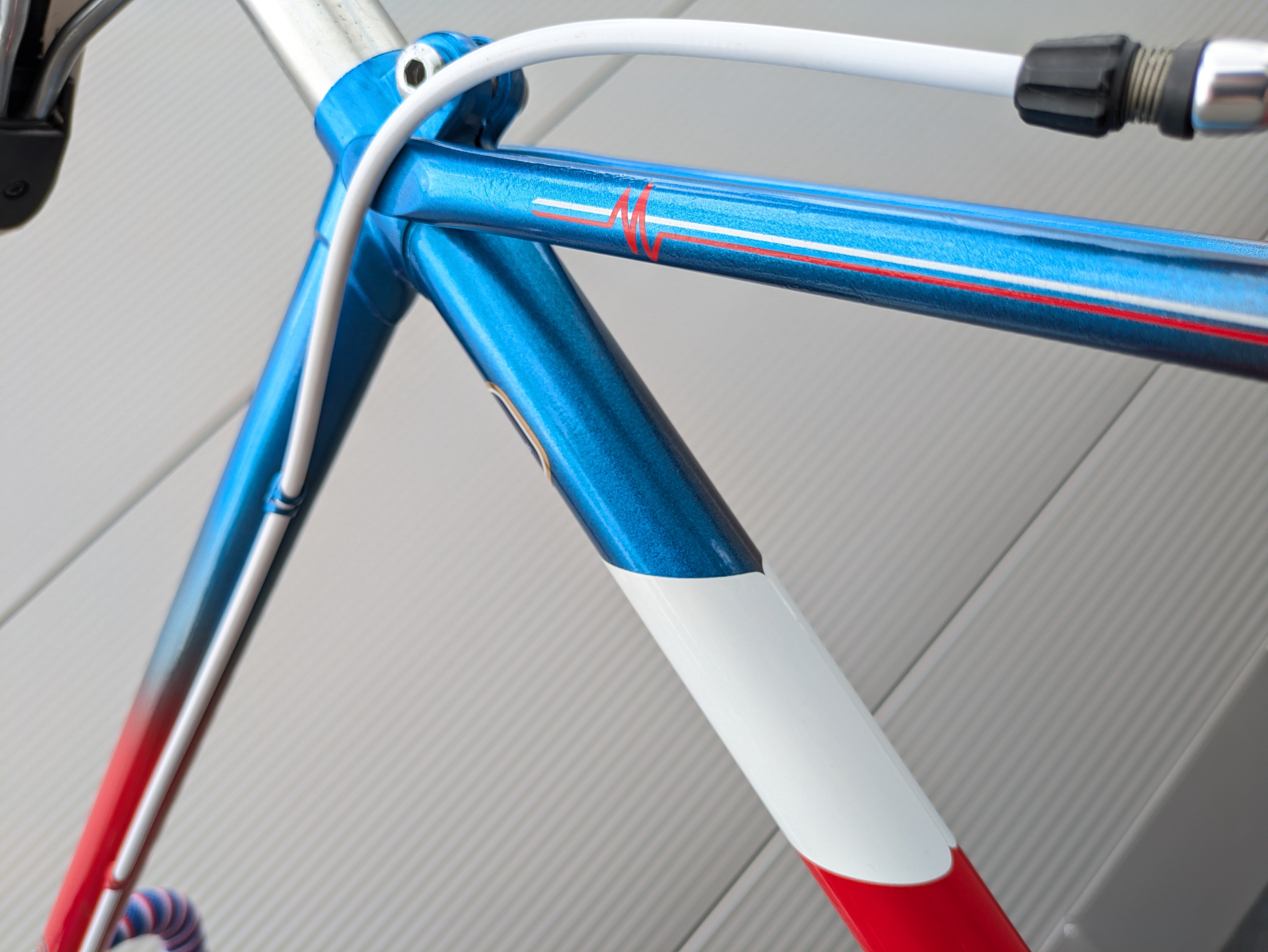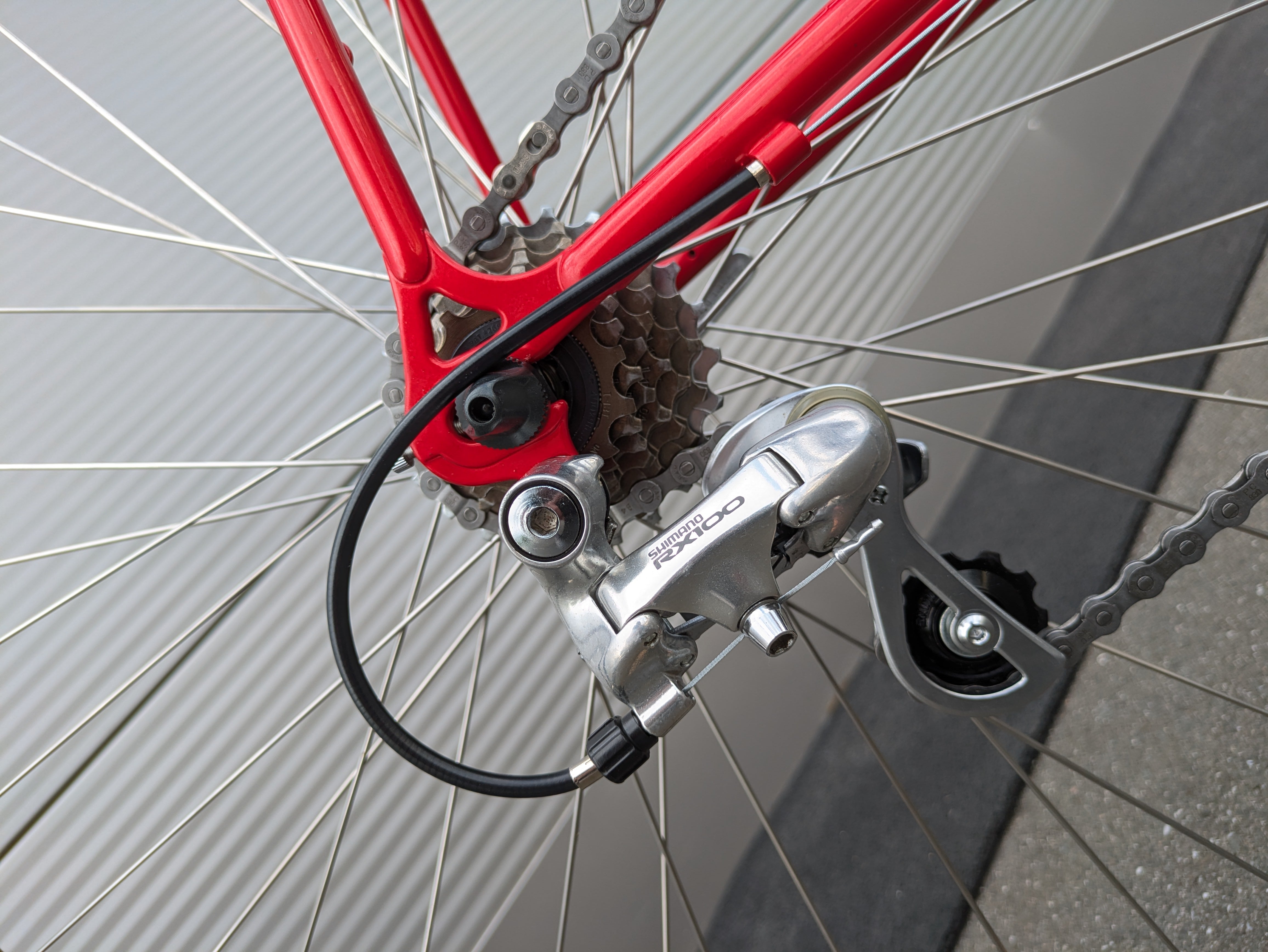 This example is equipped with a complete Shimano RX100 group, introduced in 1989. The RX100 was positioned as a robust, precise mid-range group and offered many features of the higher-end Shimano 105, including indexed downtube shifters, aero brake levers, a reliable double-chainring crankset, and precise caliper brakes. This made the DX3000 technically state-of-the-art at the time and an attractive choice for ambitious riders.