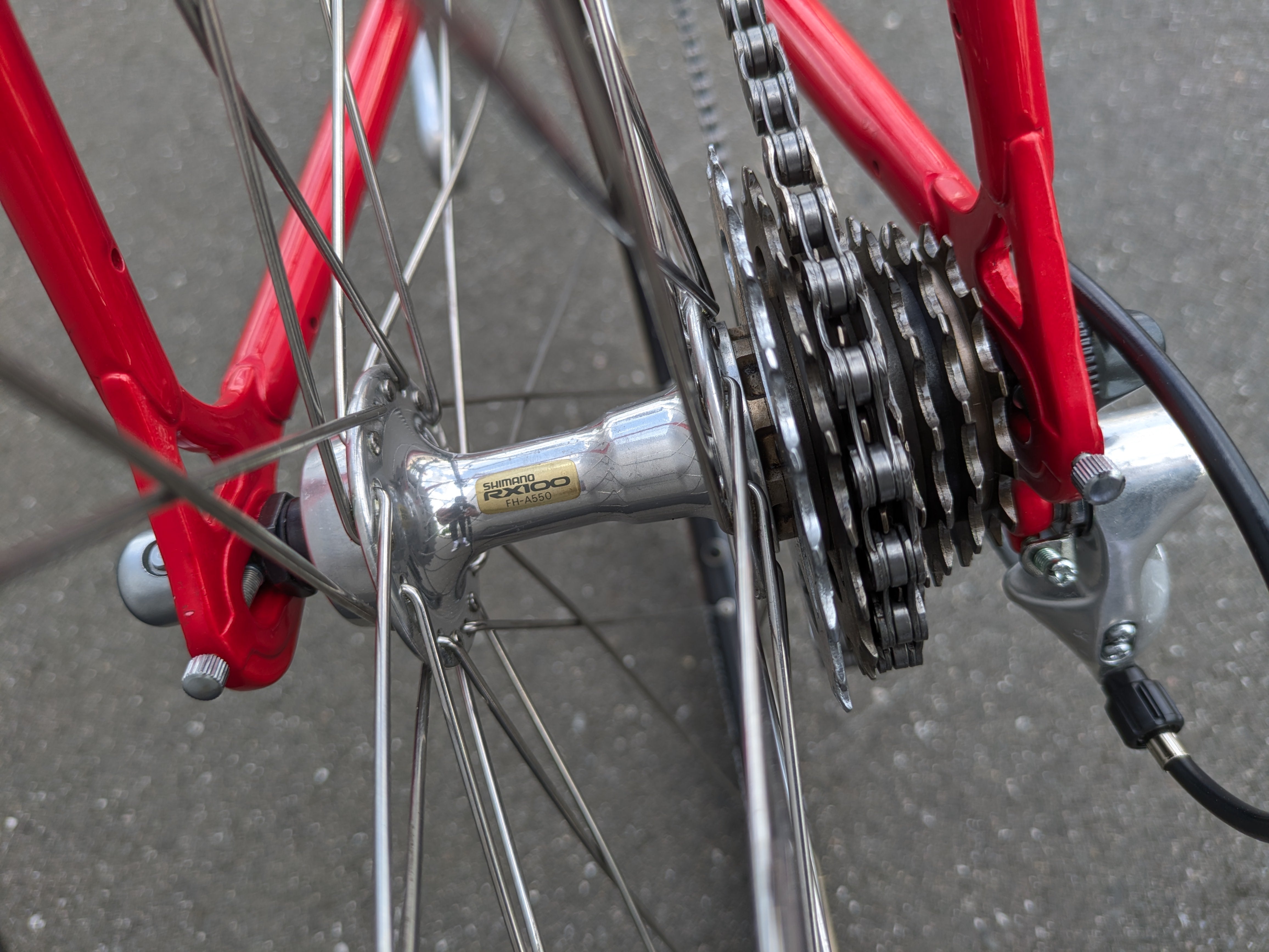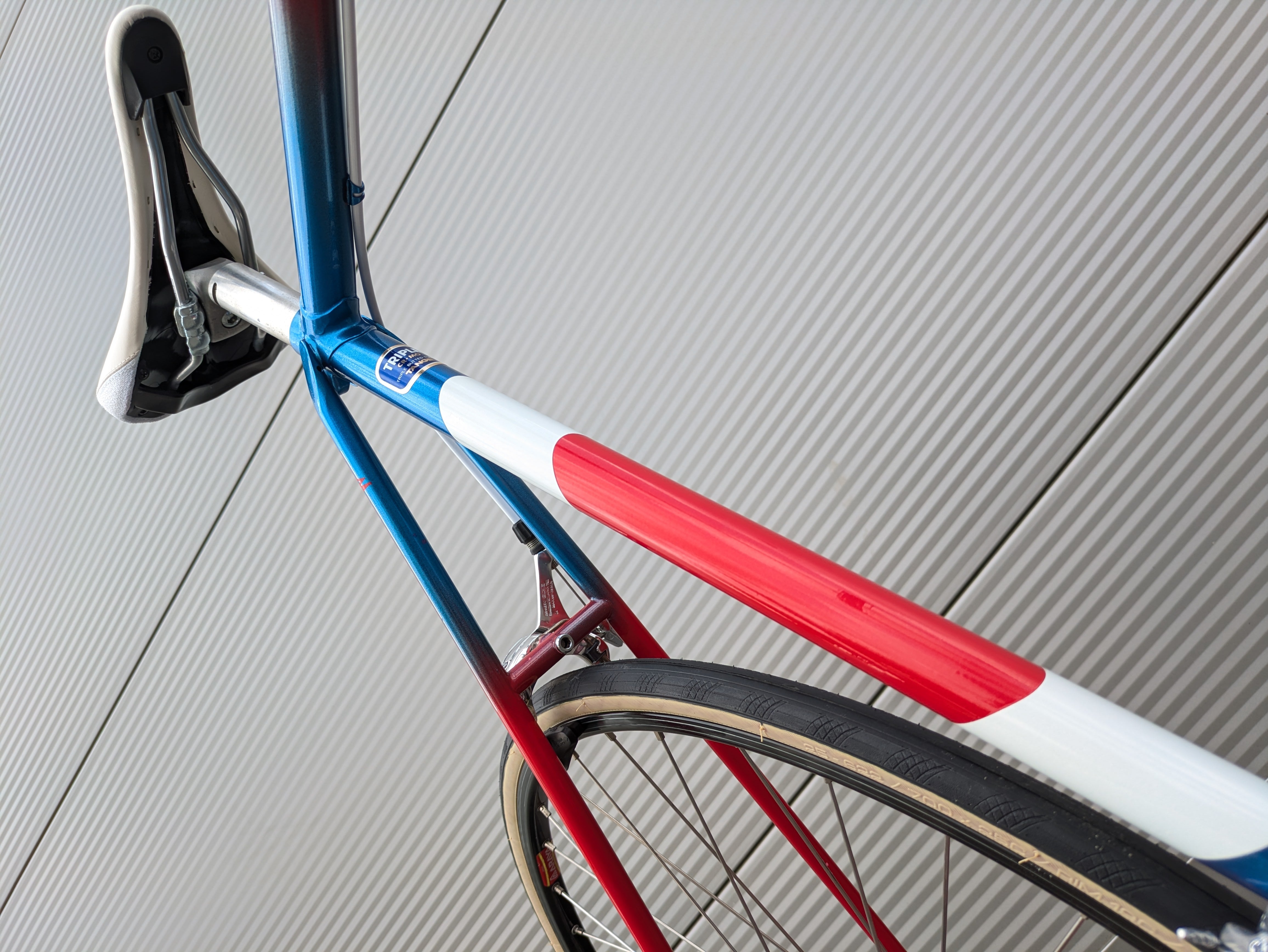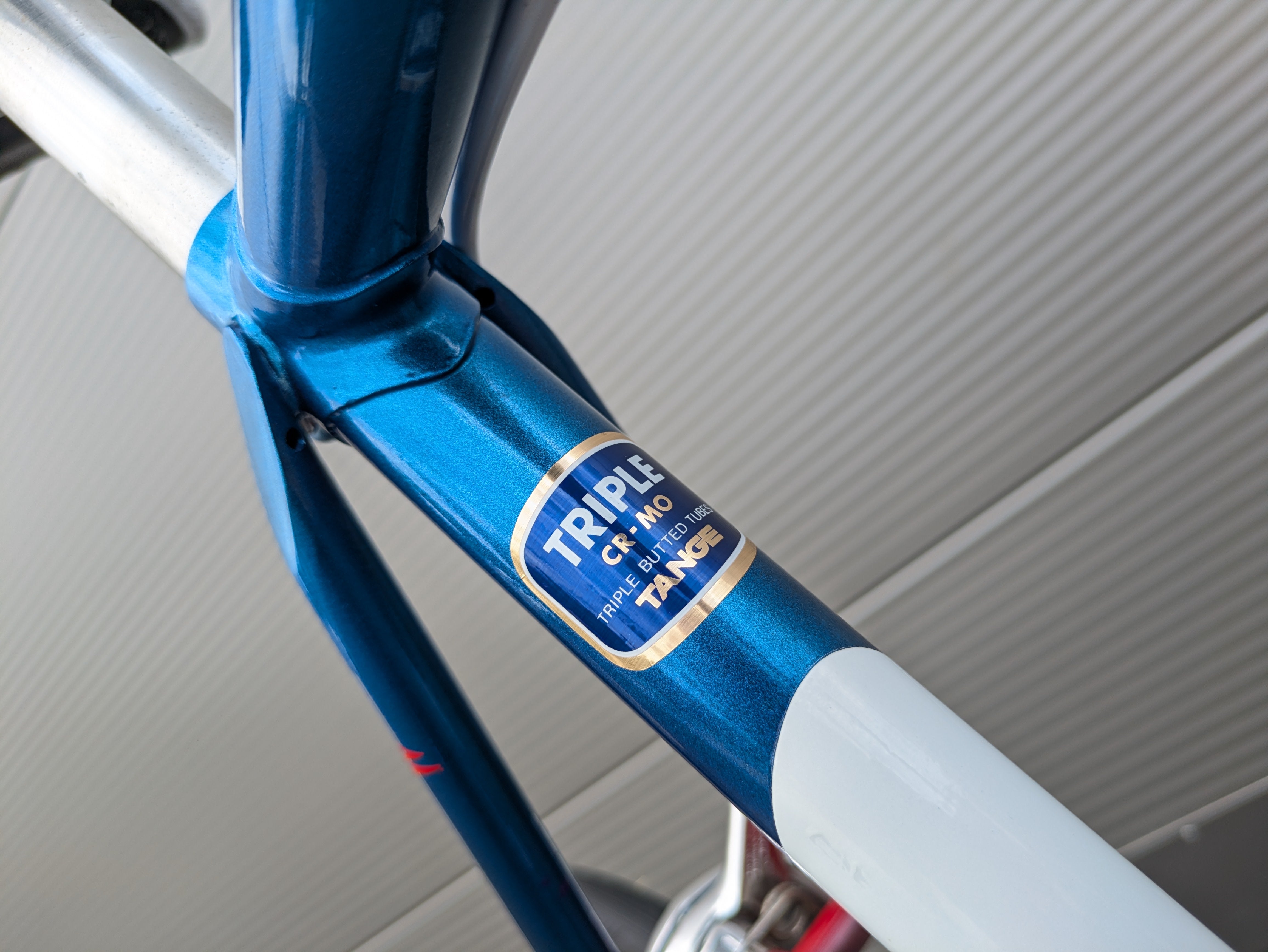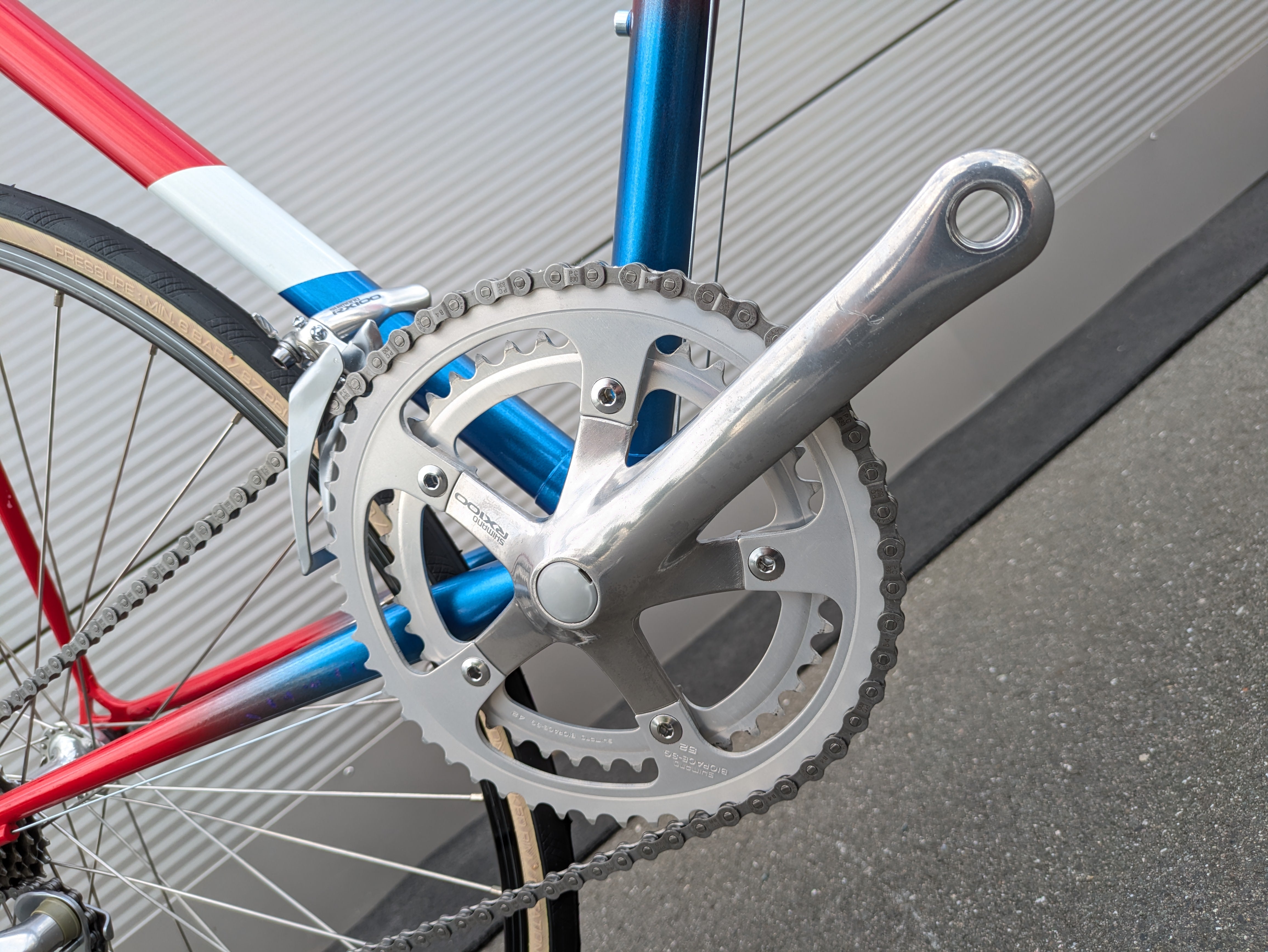This example is equipped with a complete Shimano RX100 group, introduced in 1989. The RX100 was positioned as a robust, precise mid-range group and offered many features of the higher-end Shimano 105, including indexed downtube shifters, aero brake levers, a reliable double-chainring crankset, and precise caliper brakes. This made the DX3000 technically state-of-the-art at the time and an attractive choice for ambitious riders.
