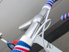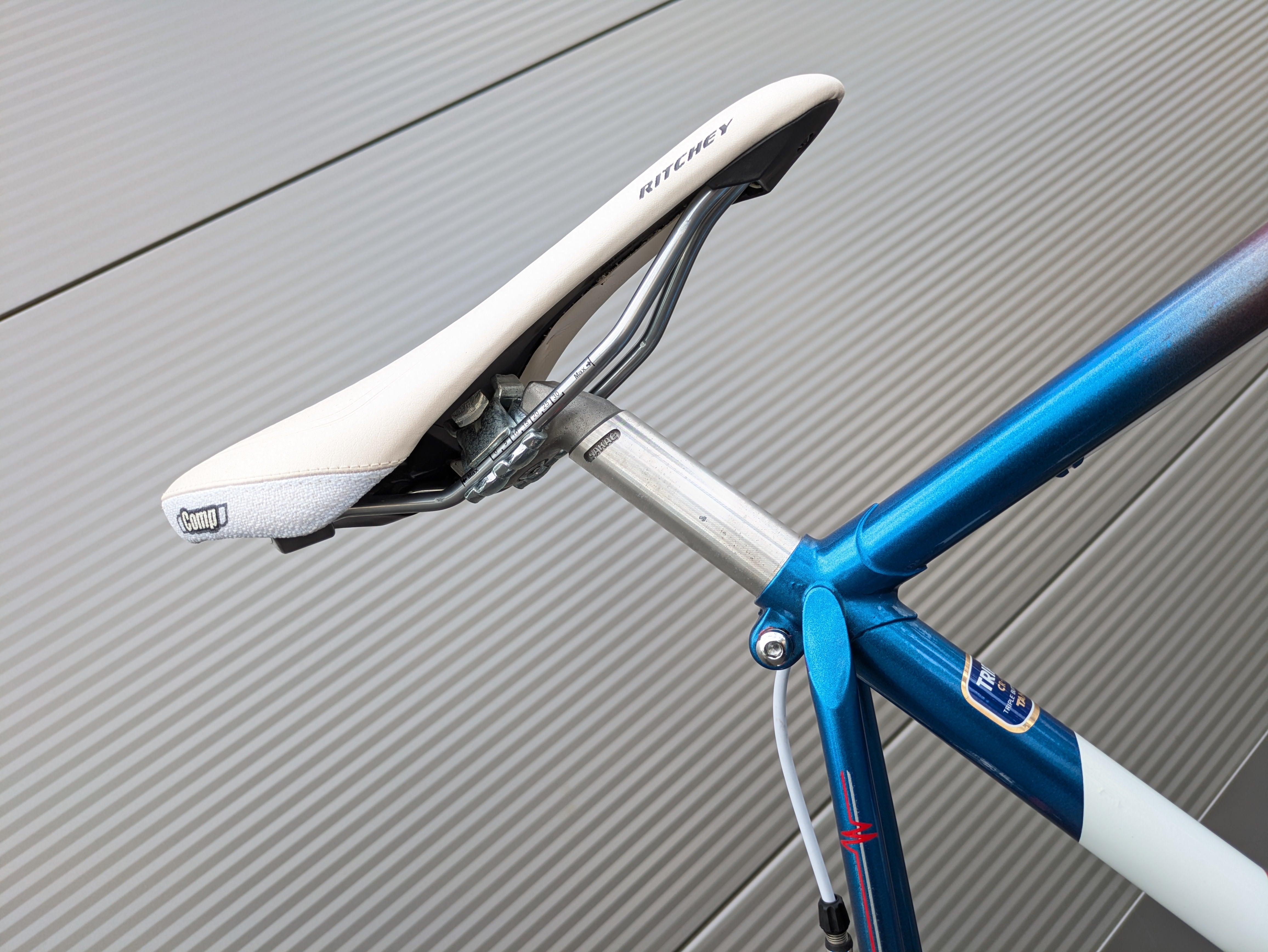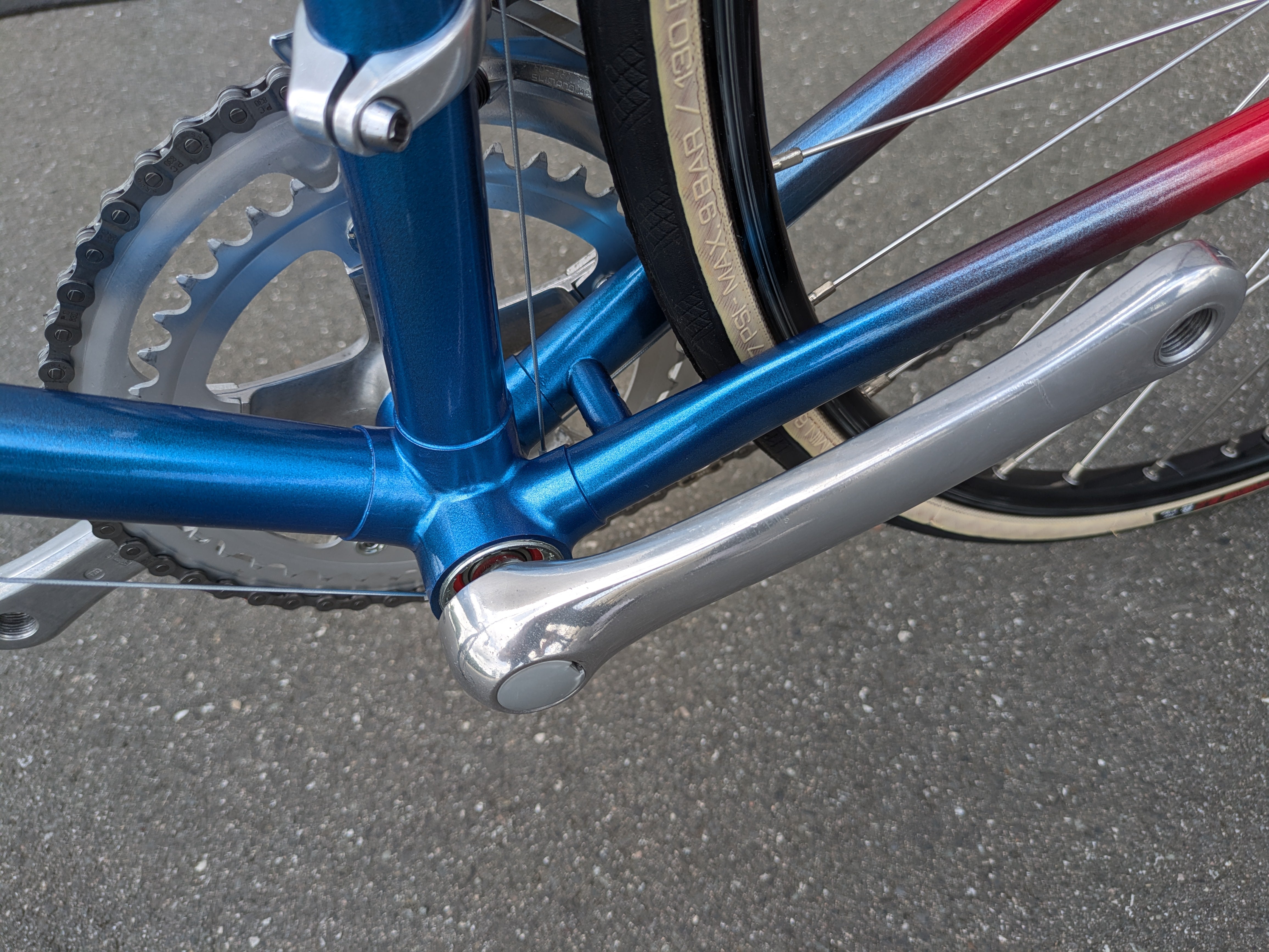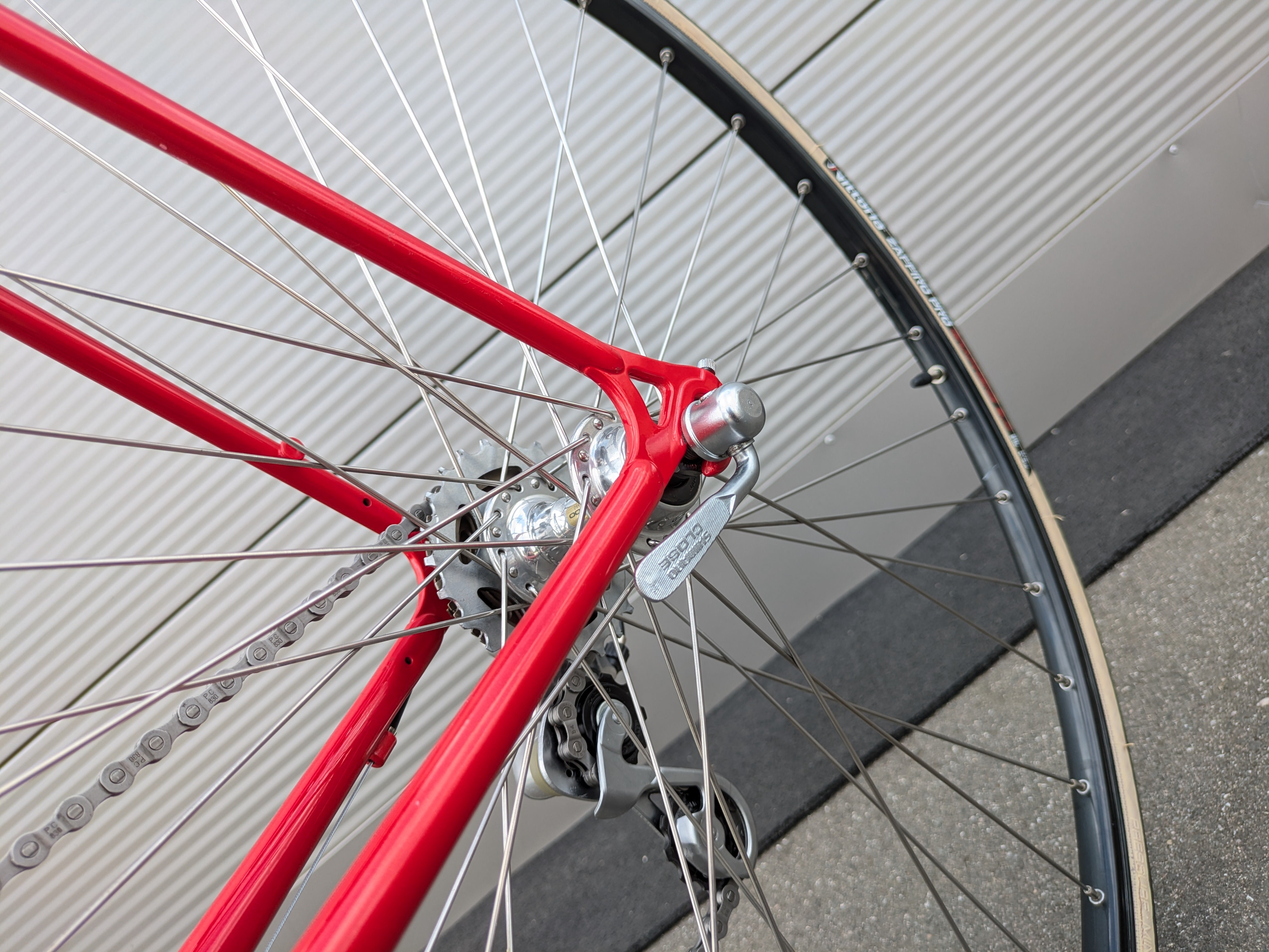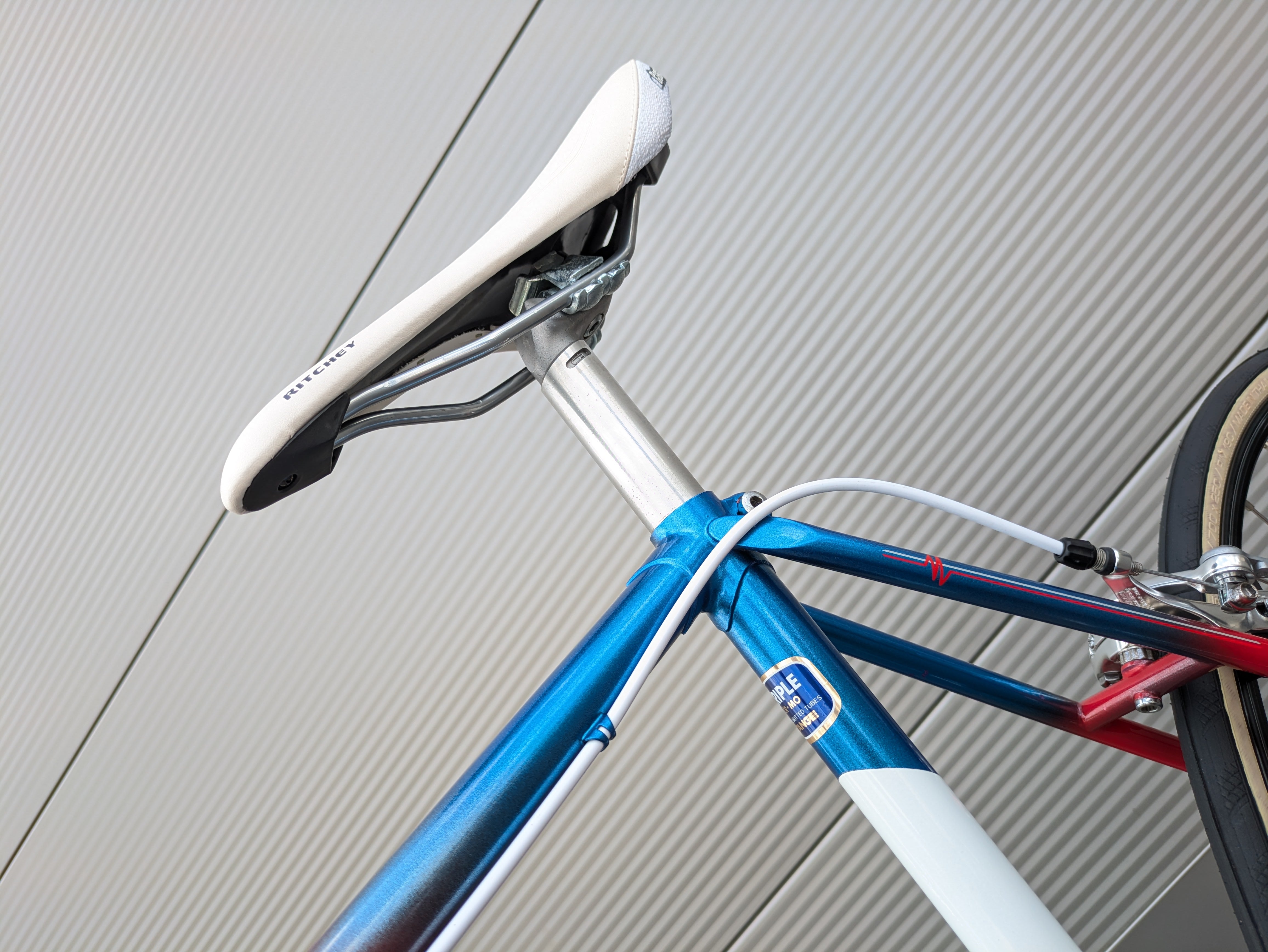 This example is equipped with a complete Shimano RX100 group, introduced in 1989. The RX100 was positioned as a robust, precise mid-range group and offered many features of the higher-end Shimano 105, including indexed downtube shifters, aero brake levers, a reliable double-chainring crankset, and precise caliper brakes. This made the DX3000 technically state-of-the-art at the time and an attractive choice for ambitious riders.