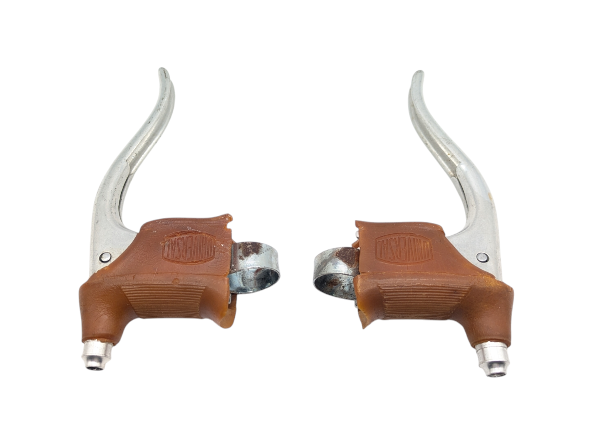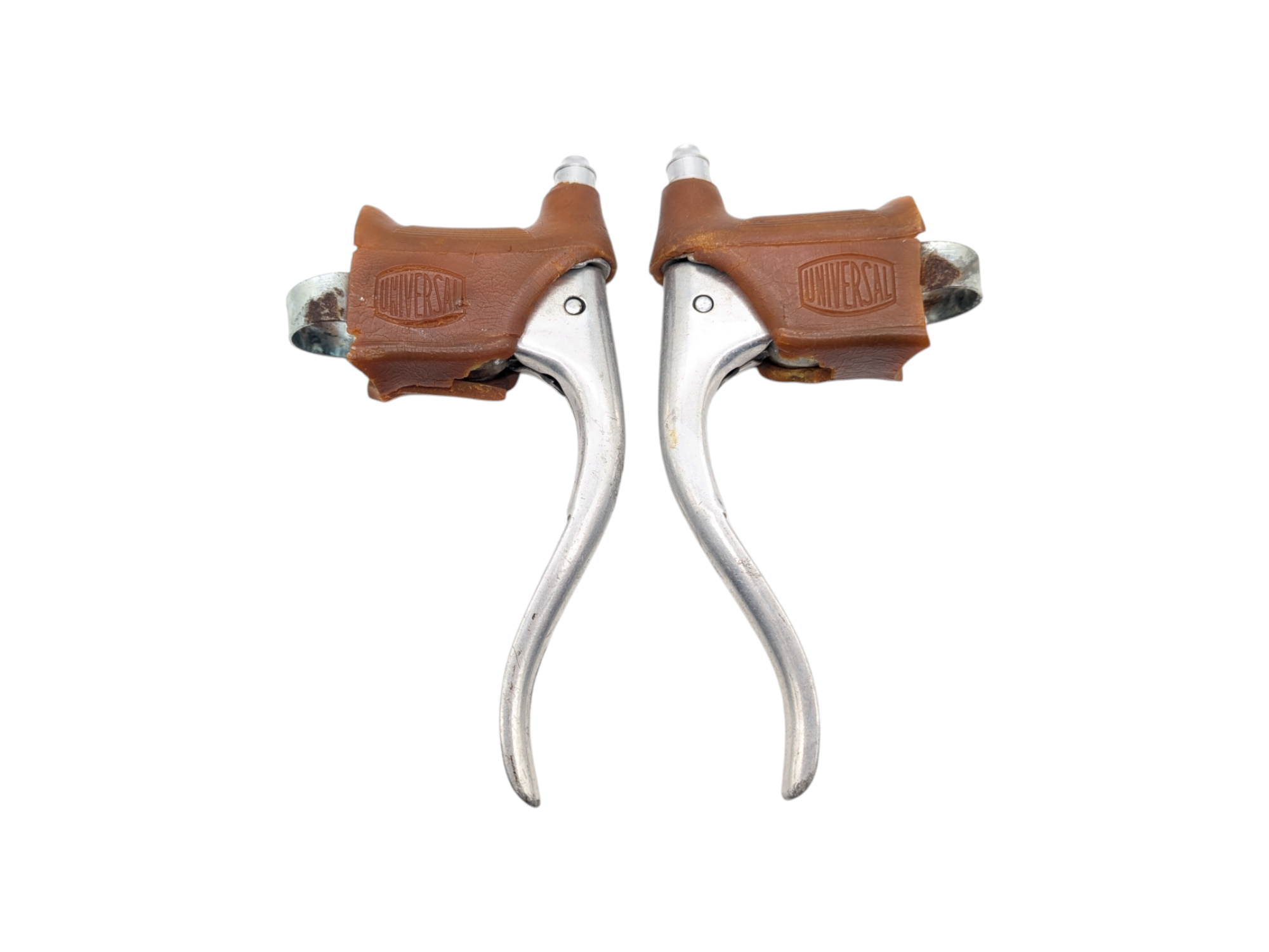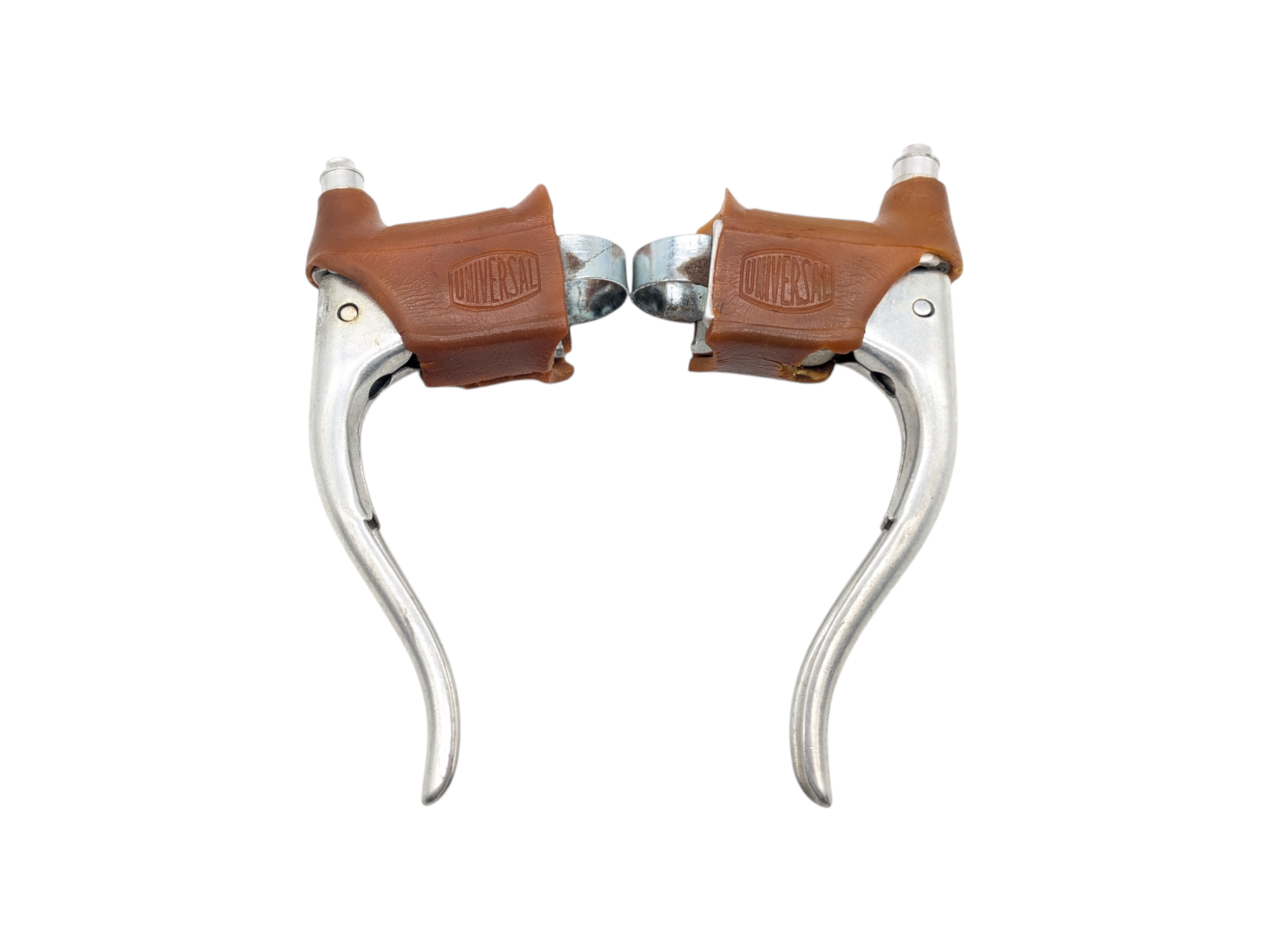 Universal brake levers pair, Italian-made vintage component from the classic era. Known for reliable operation and timeless design, these levers are a solid choice for restorations or retro road bike builds that require authentic period parts.