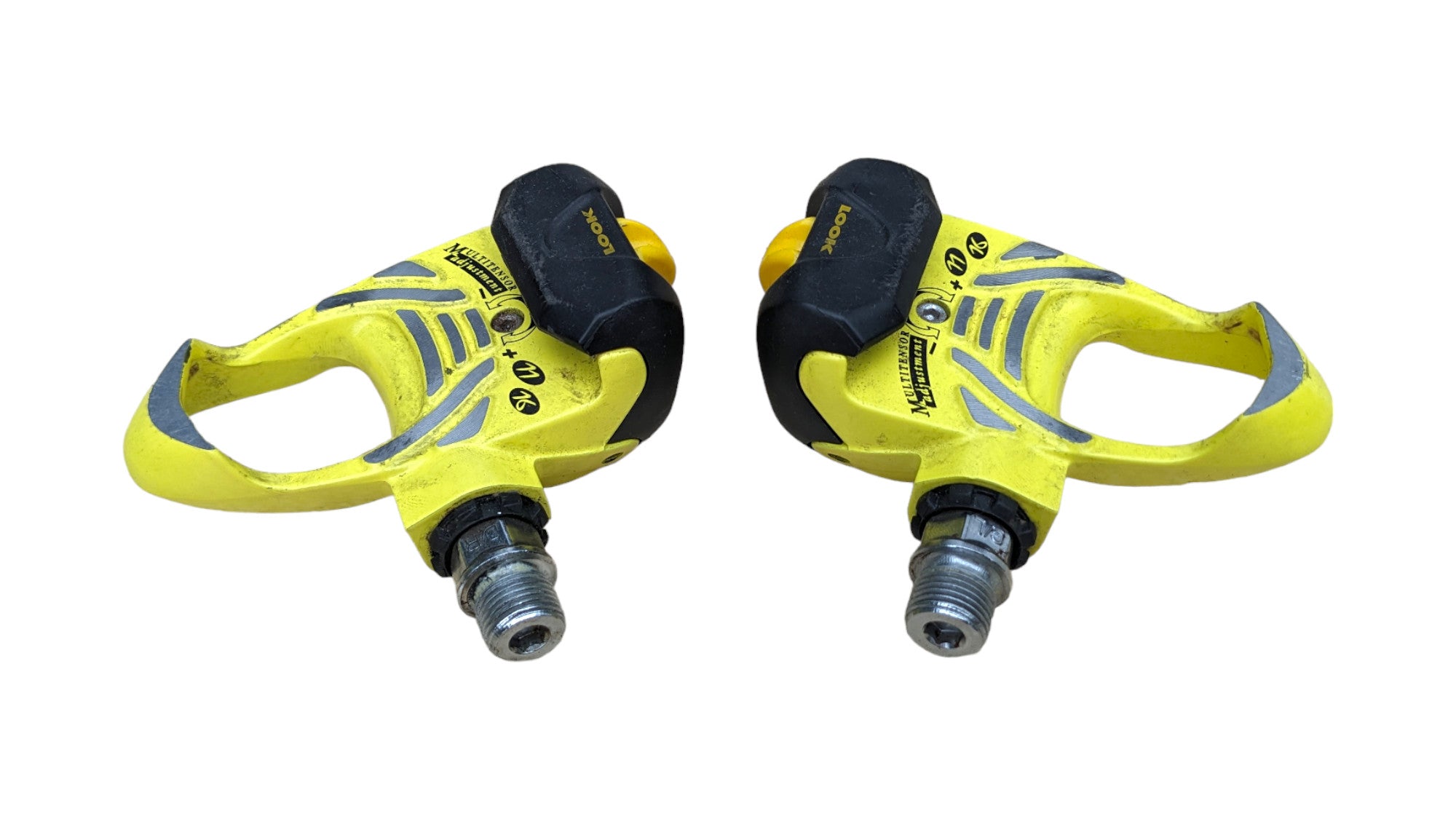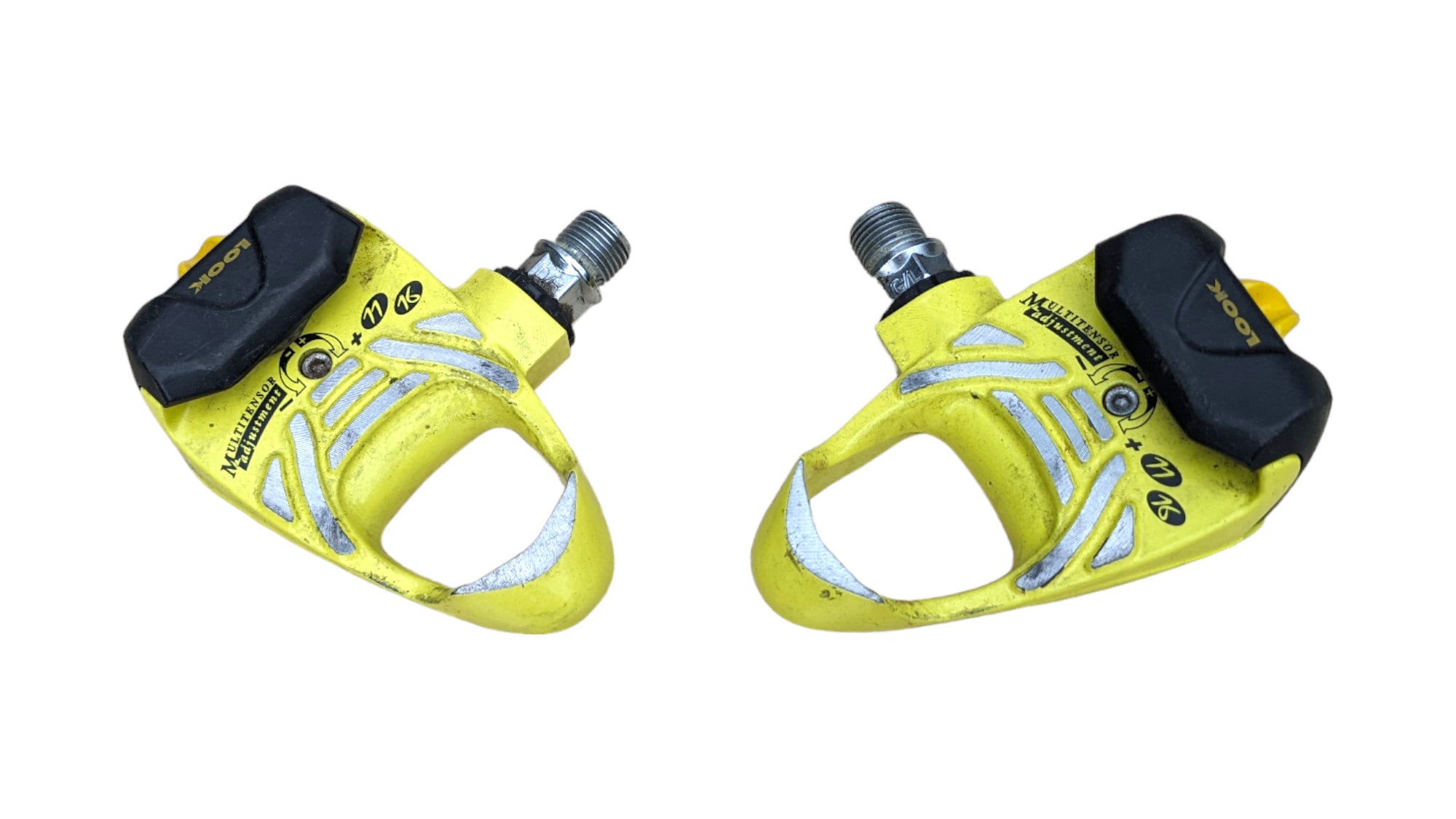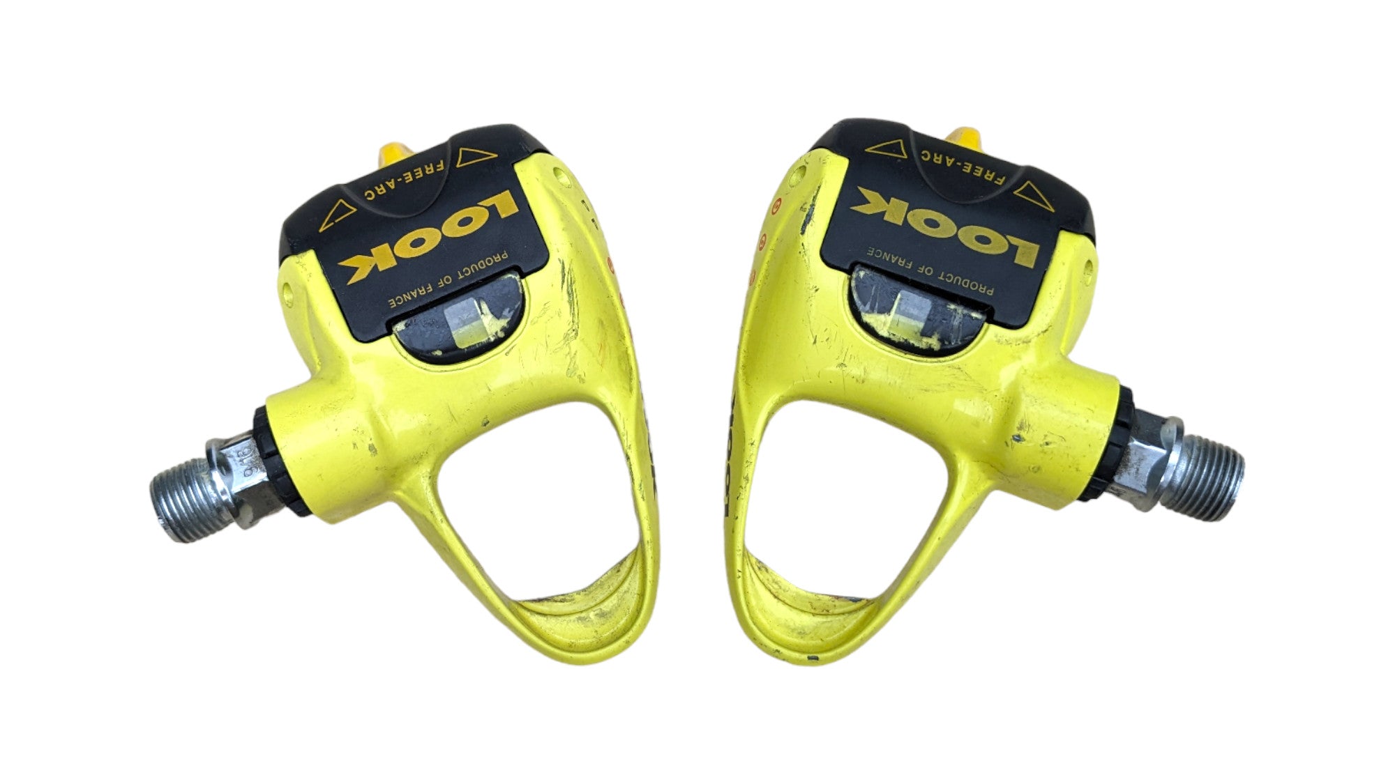 Look Clipless pedals “Click” in neon yellow and black. Used, cleaned and fully functional. Bold French clipless design — perfect for vintage road builds seeking eye-catching pedals with historical appeal.