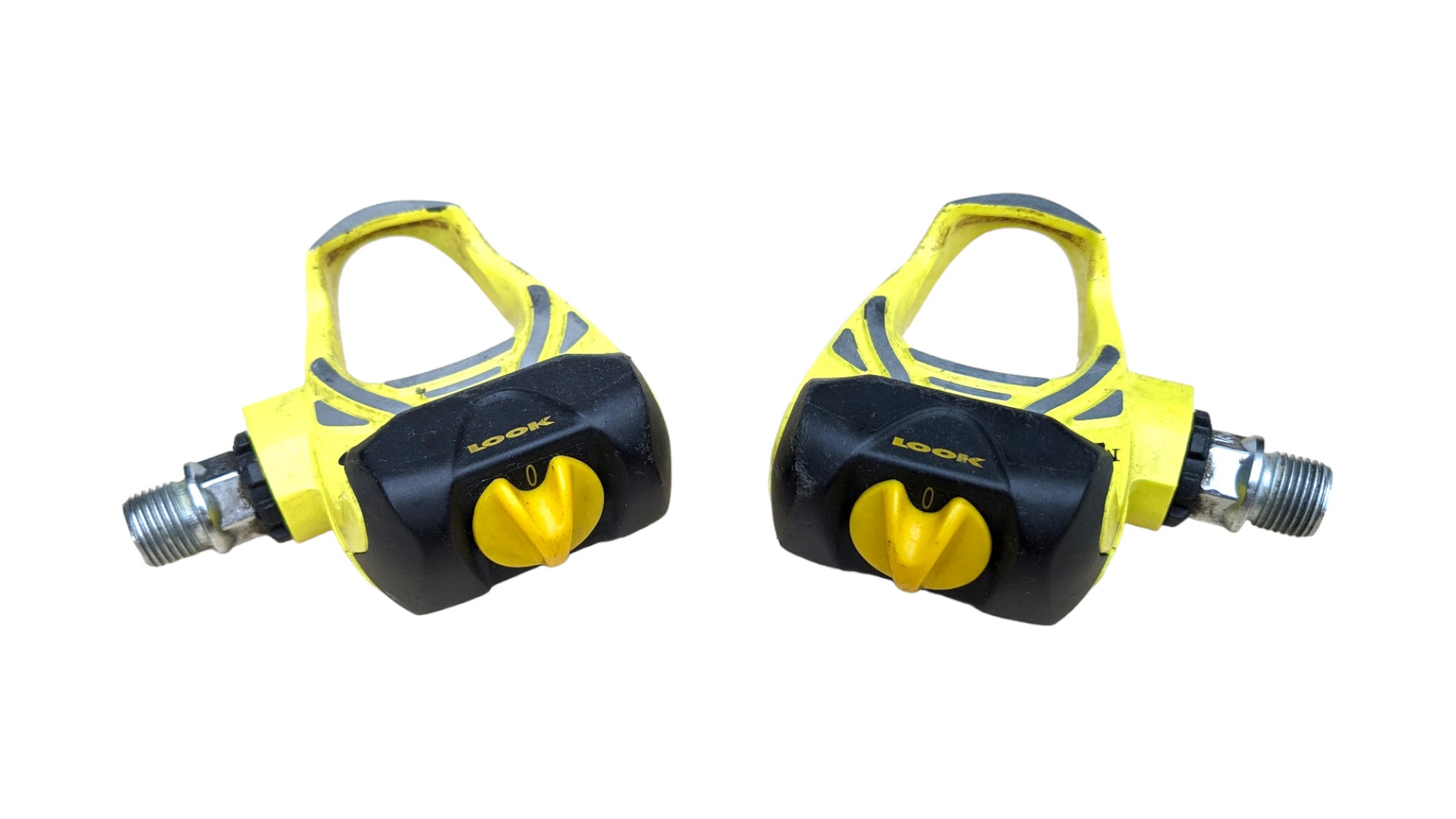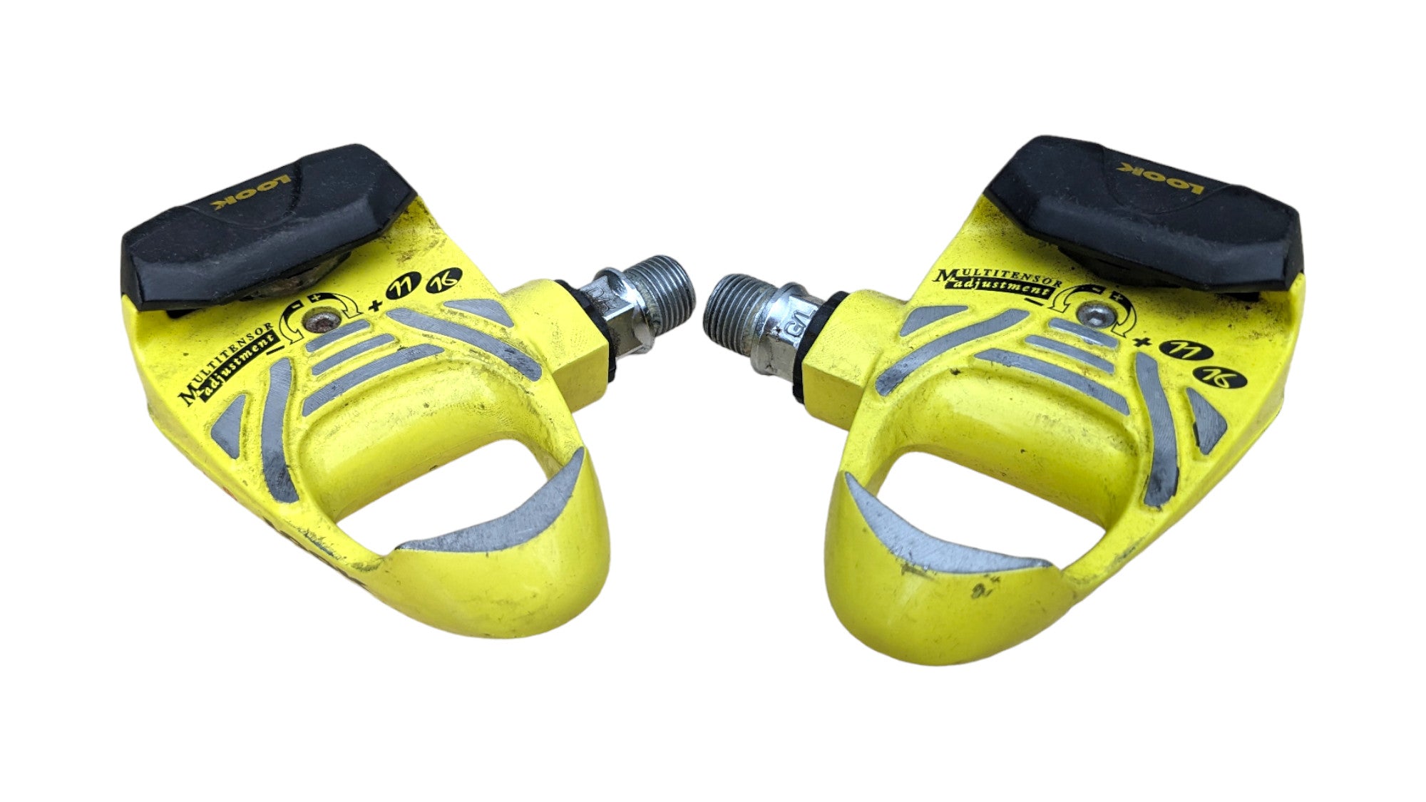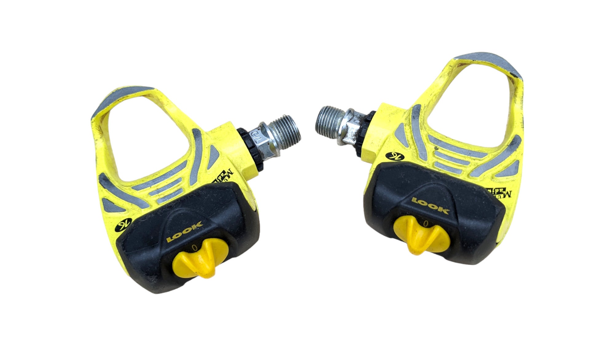 Look Clipless pedals “Click” in neon yellow and black. Used, cleaned and fully functional. Bold French clipless design — perfect for vintage road builds seeking eye-catching pedals with historical appeal.