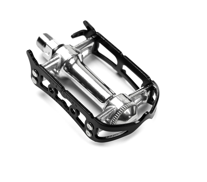 MKS Sylvan Road pedals in black, 9/16" thread, 99 × 61 mm, with aluminium cage and steel axle. New. Classic, durable platform pedals for vintage road builds and everyday city riding.