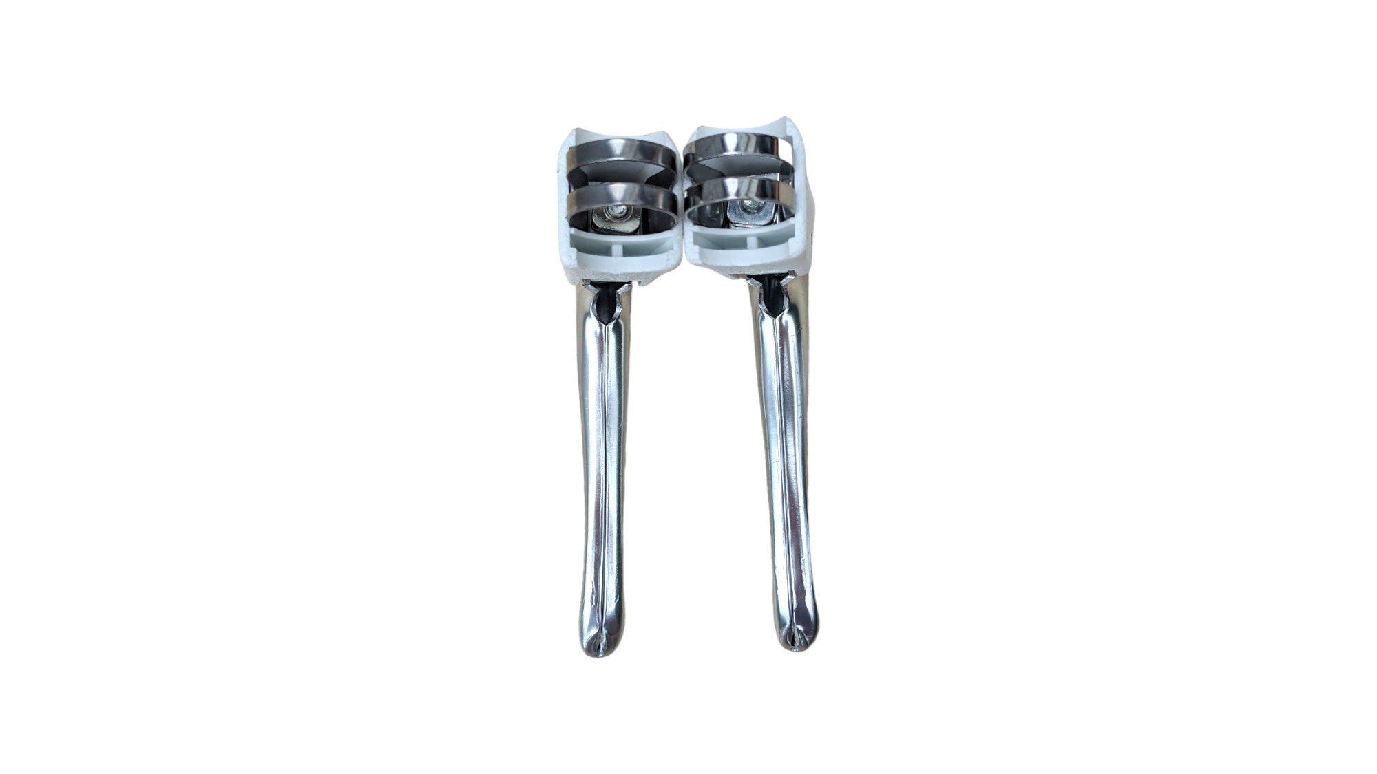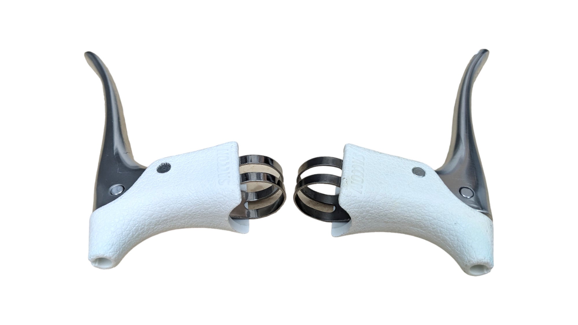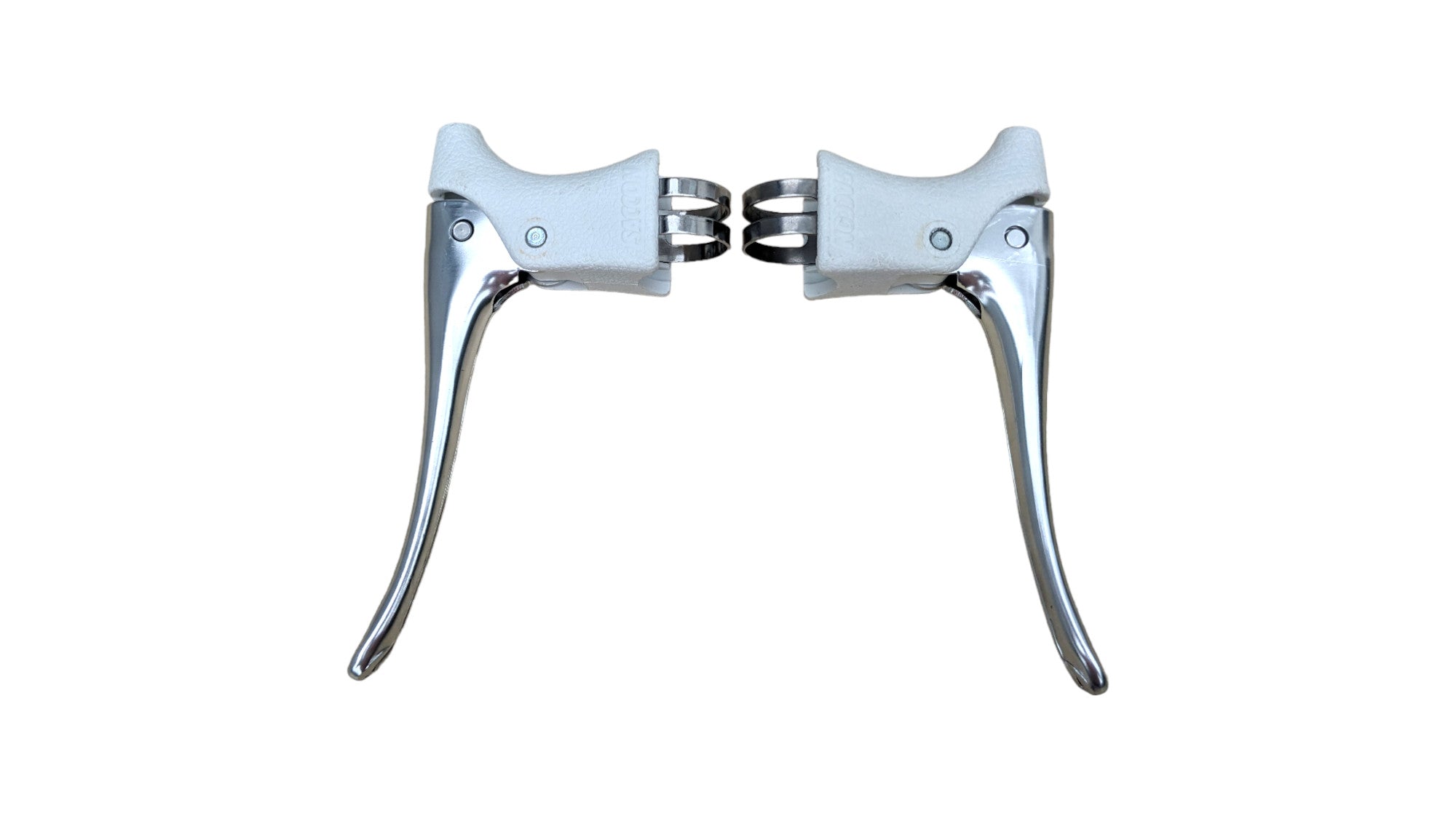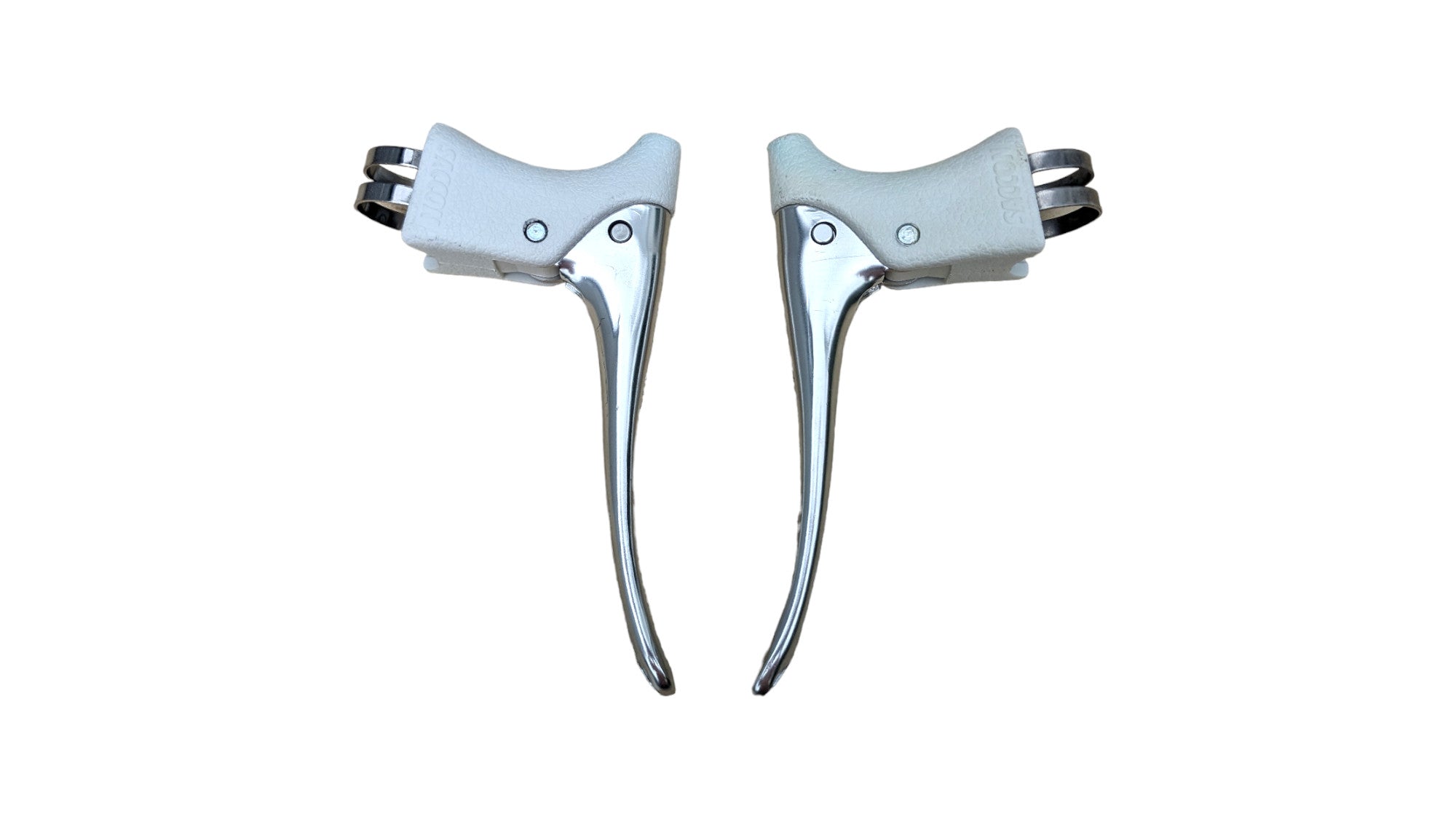 Saccon Universal brake lever pair in white. New. Clean, practical levers for classic road setups—ideal as fresh replacements for vintage cockpit builds.