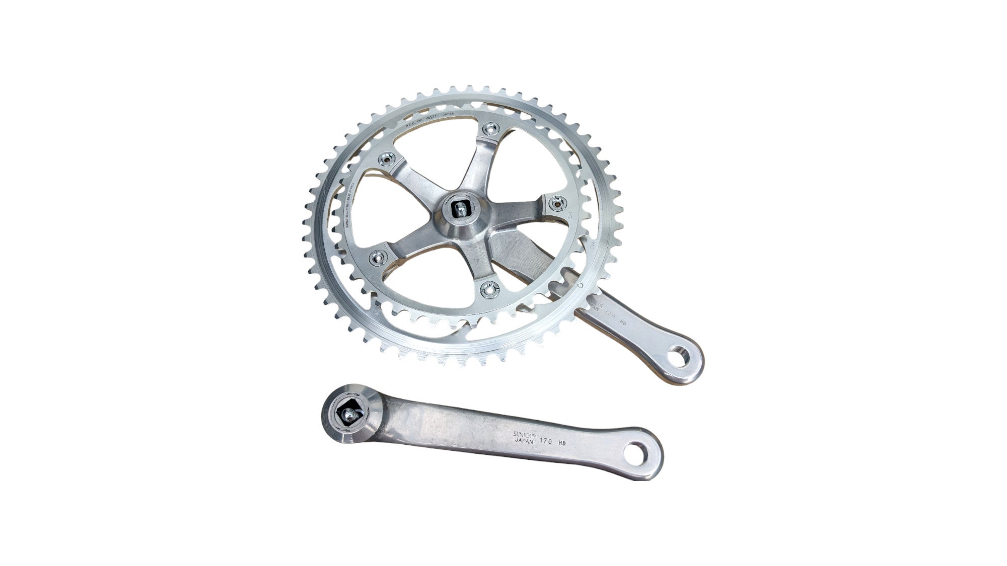 Suntour Superbe Pro CW-SB10 crankset with 170 mm arms and 53/42 chainrings. New Old Stock. Top-tier Japanese quality from the Superbe Pro line—ideal for retro race builds and period-correct drivetrains.
