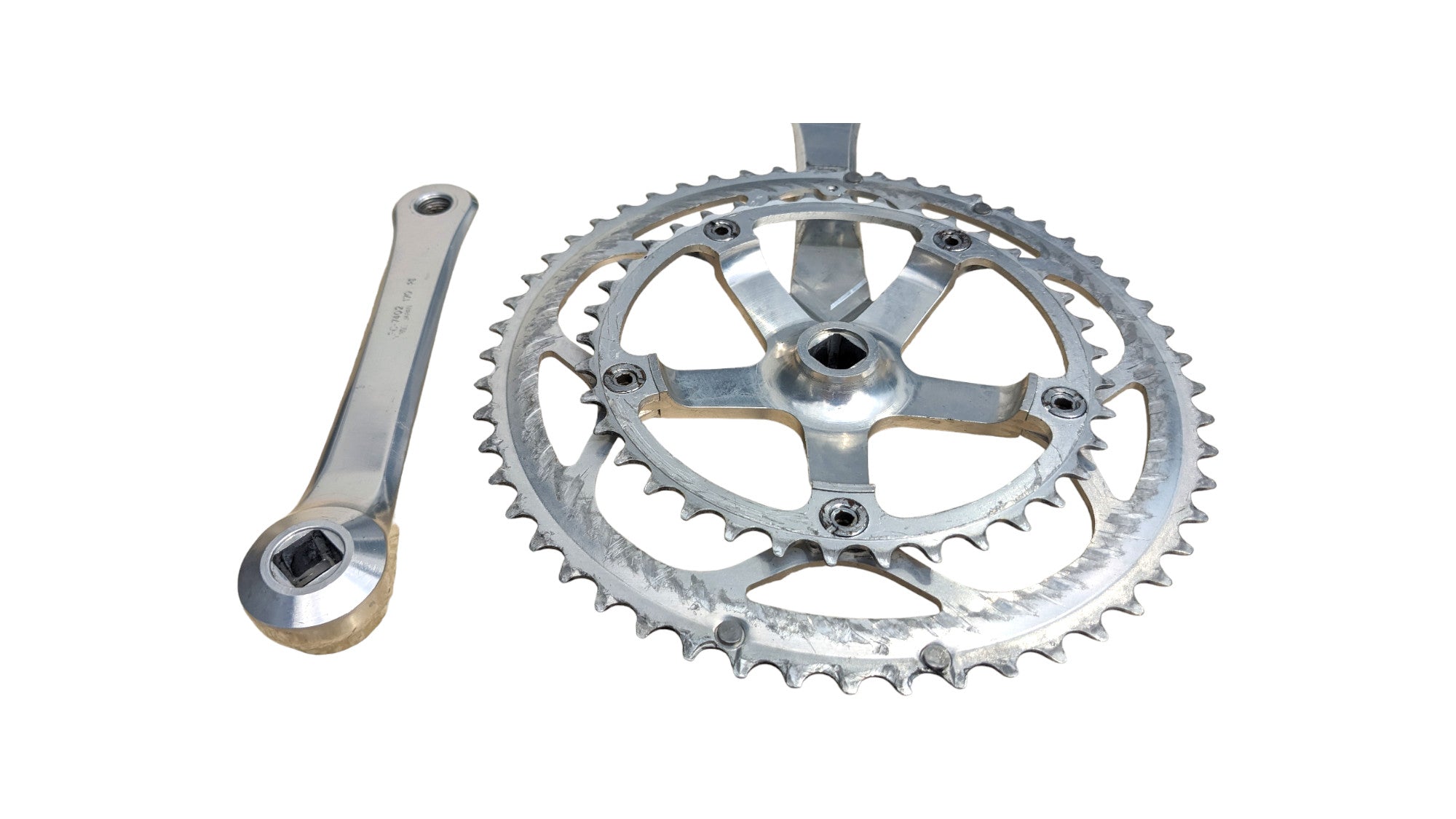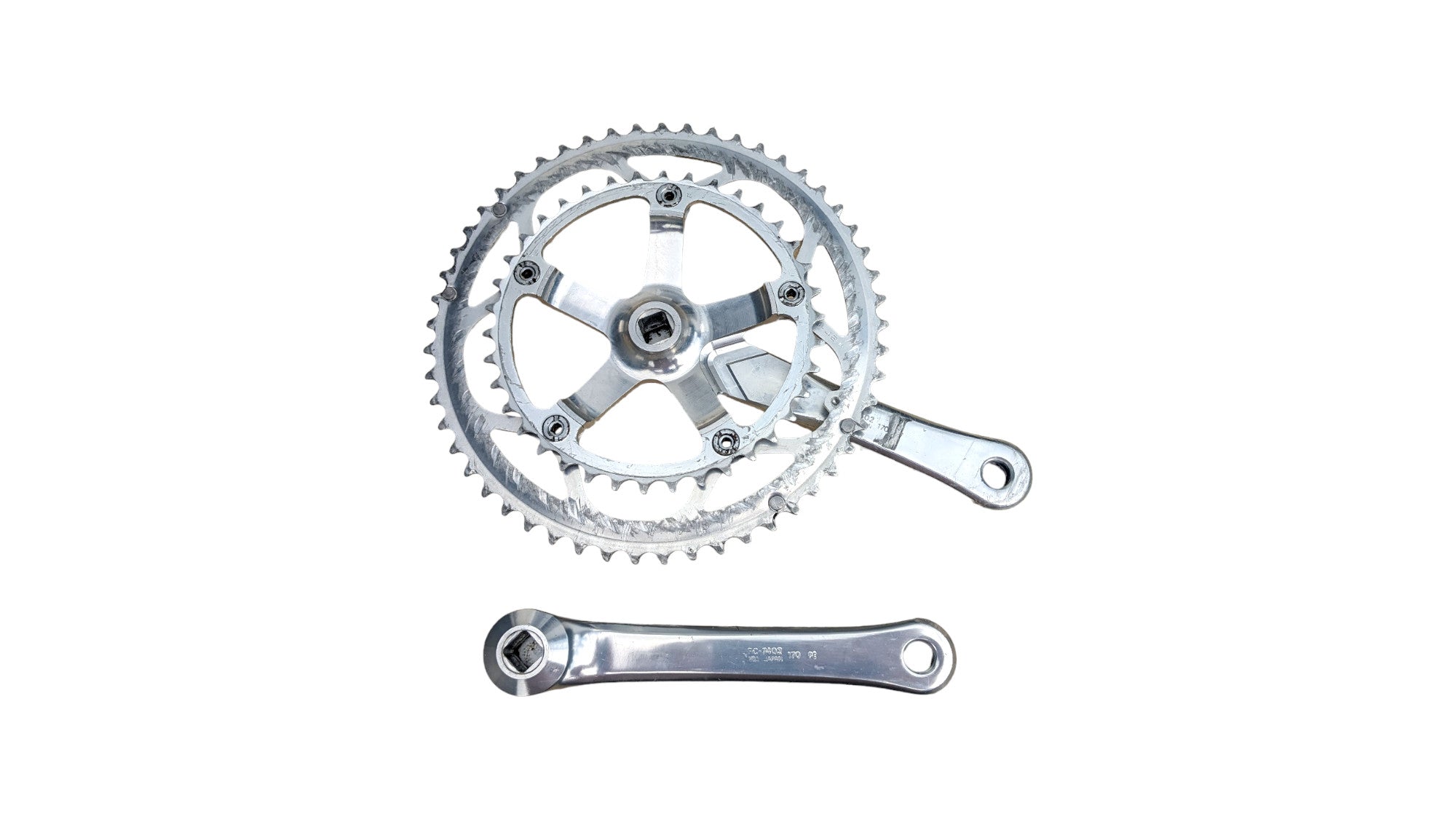 Shimano Dura-Ace FC-7402 crankset with 170 mm arms and 53/38 rings. Used, cleaned and fully functional. A solid Dura-Ace choice for vintage road builds and period-correct Shimano drivetrains.