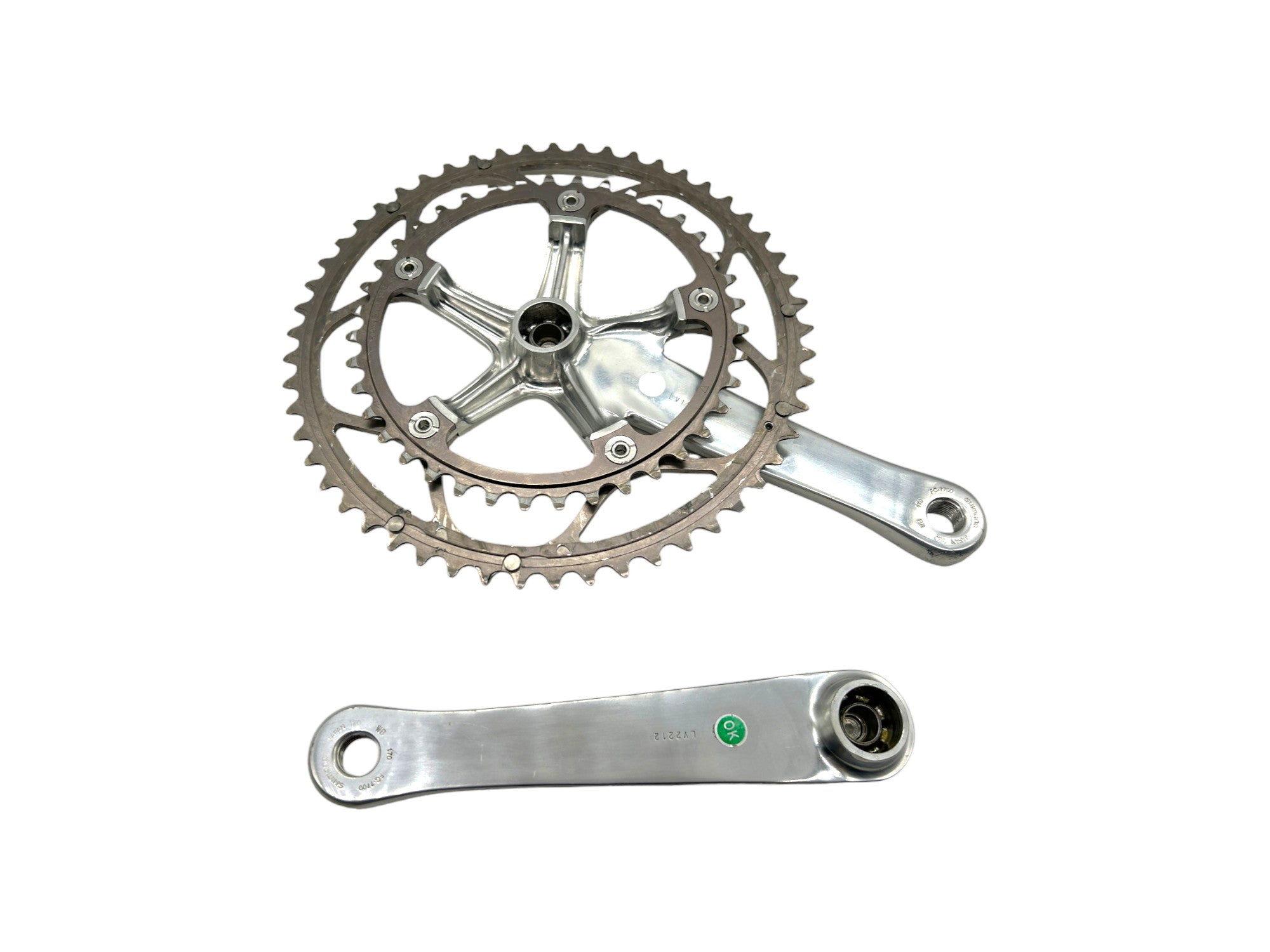 Shimano Dura-Ace FC-7700 Octalink crankset, 170 mm arms with 53/39 rings. Used, cleaned and fully functional — a premium Japanese crankset for vintage road bikes and steel frame restorations.