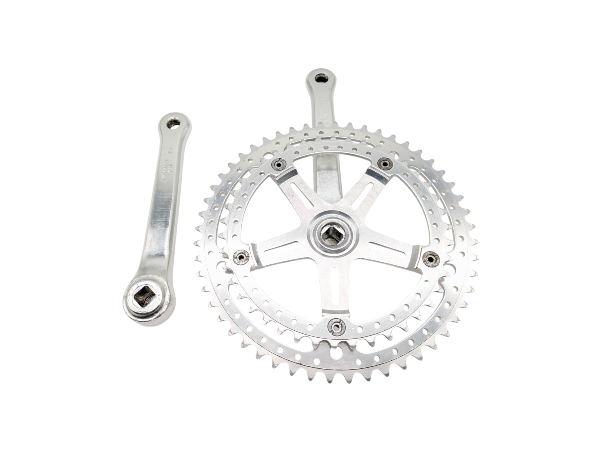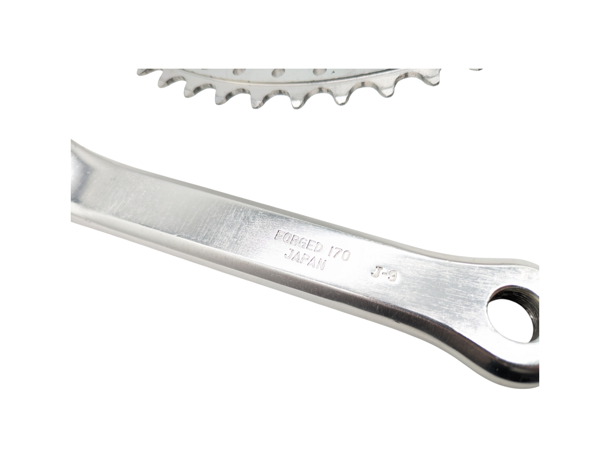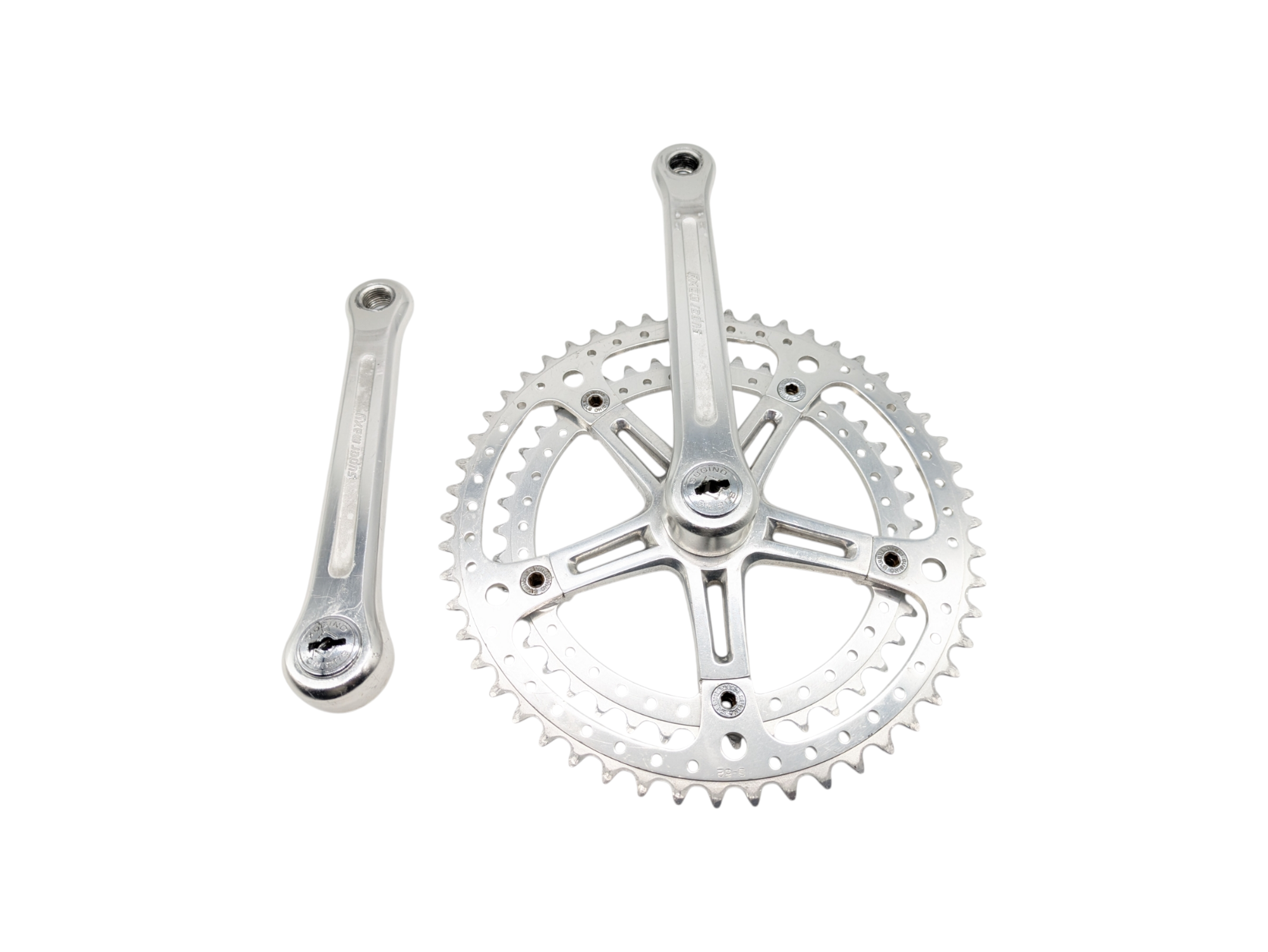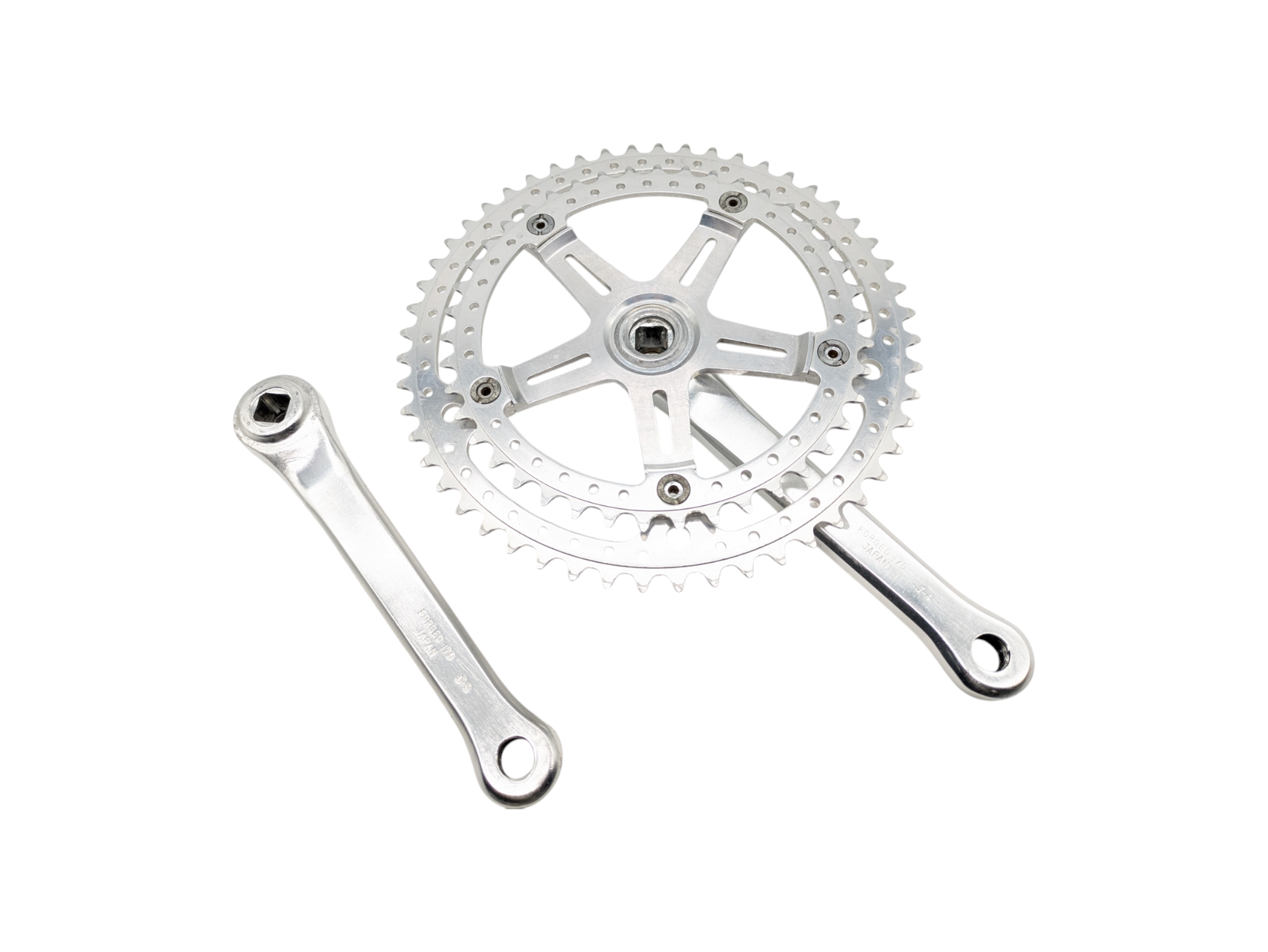 Sugino Super Maxy crankset with 170 mm arms and 52/42 chainrings. Japanese-made classic known for precise machining and dependable service life. Suitable for period-correct restorations of vintage road bicycles and clean, functional drivetrain builds.