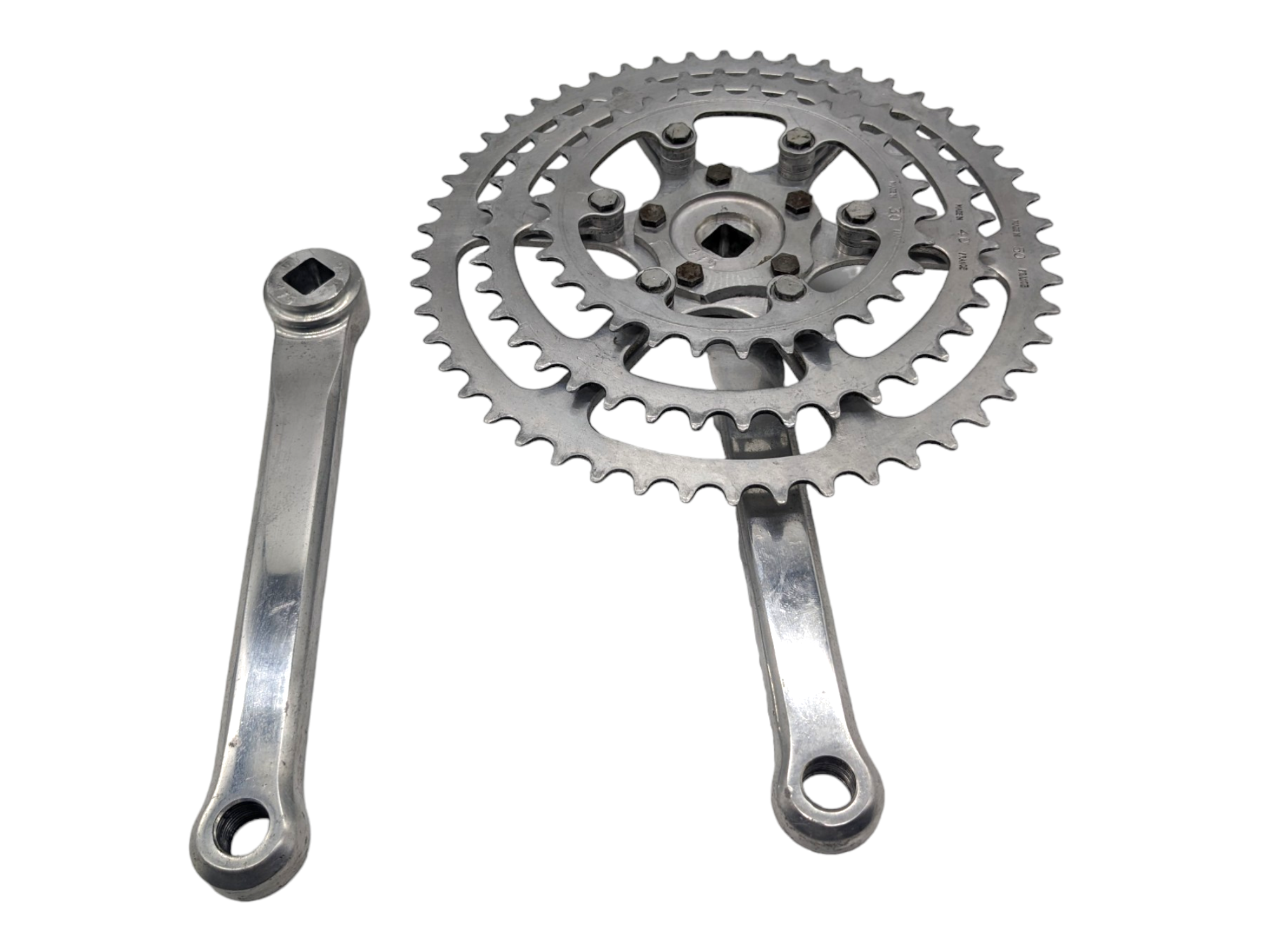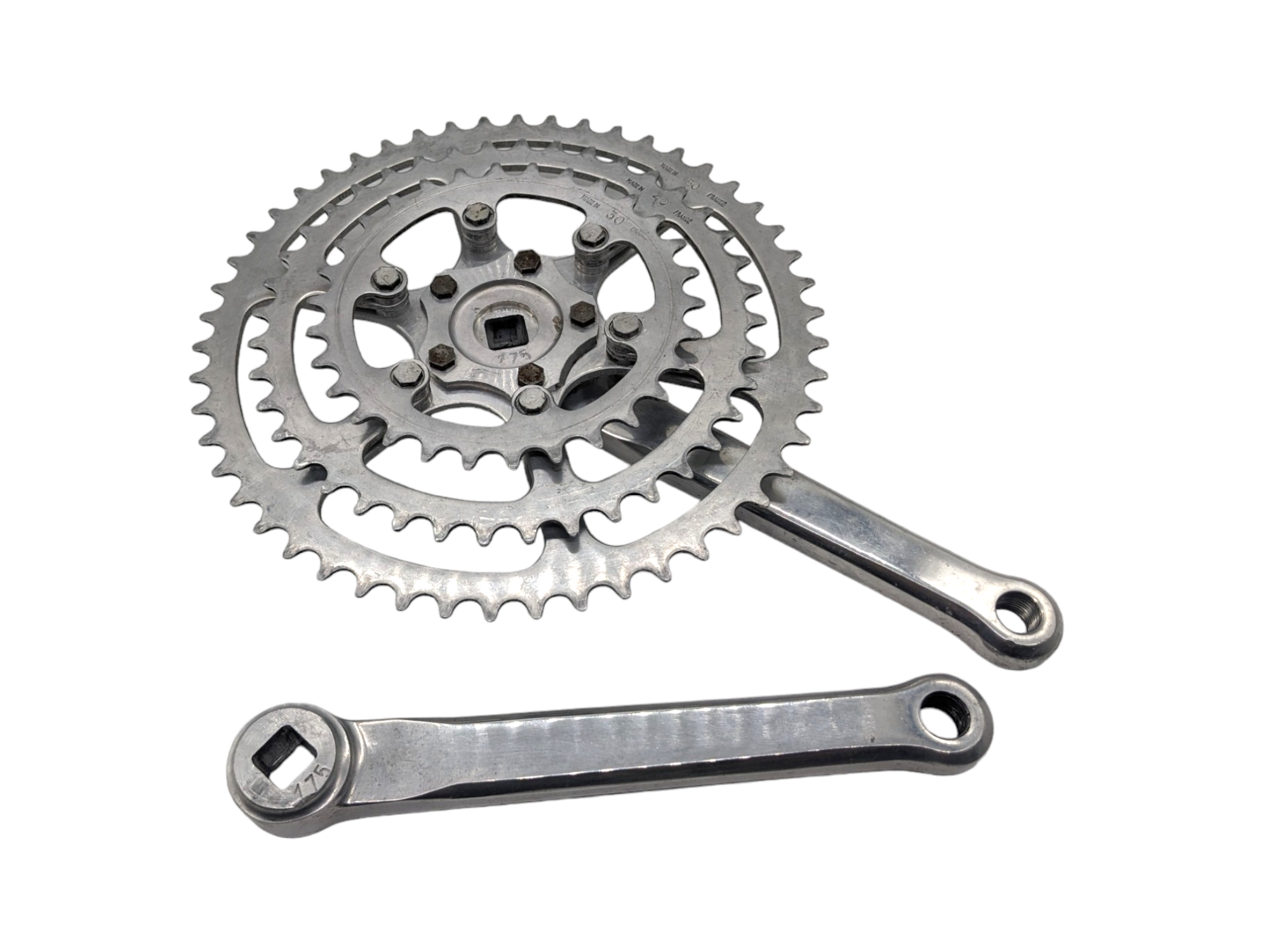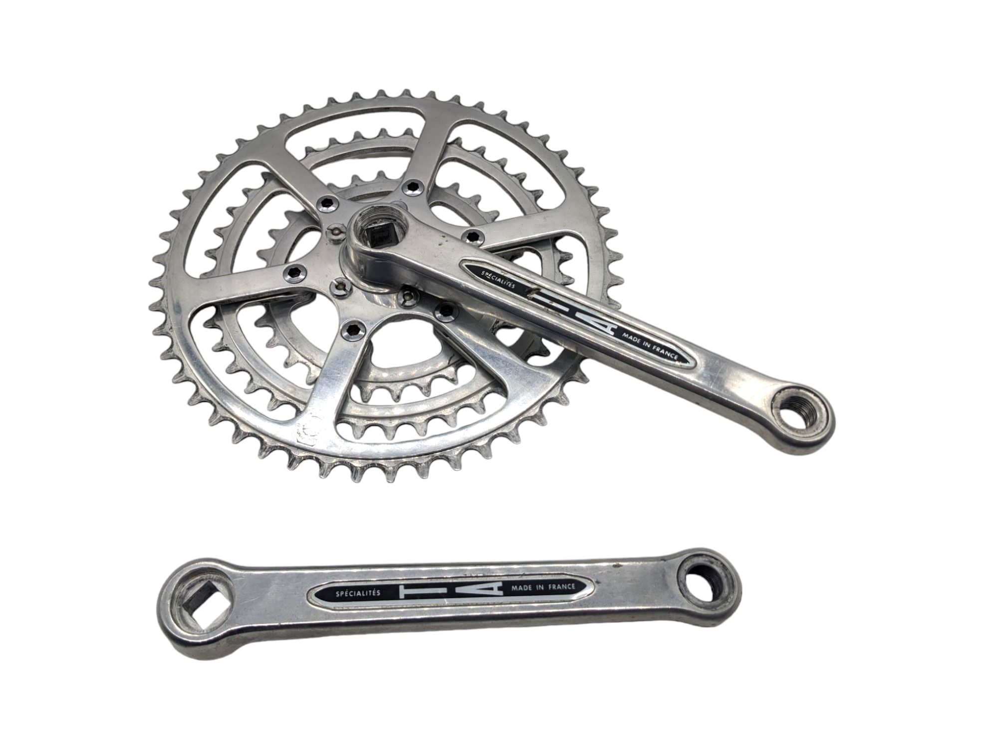 TA Specialites 3-speed crankset, with 175 mm arms and 50/40/30 chainrings. Fully restored and ready for use — a classic French component ideal for vintage builds or period drivetrain setups.