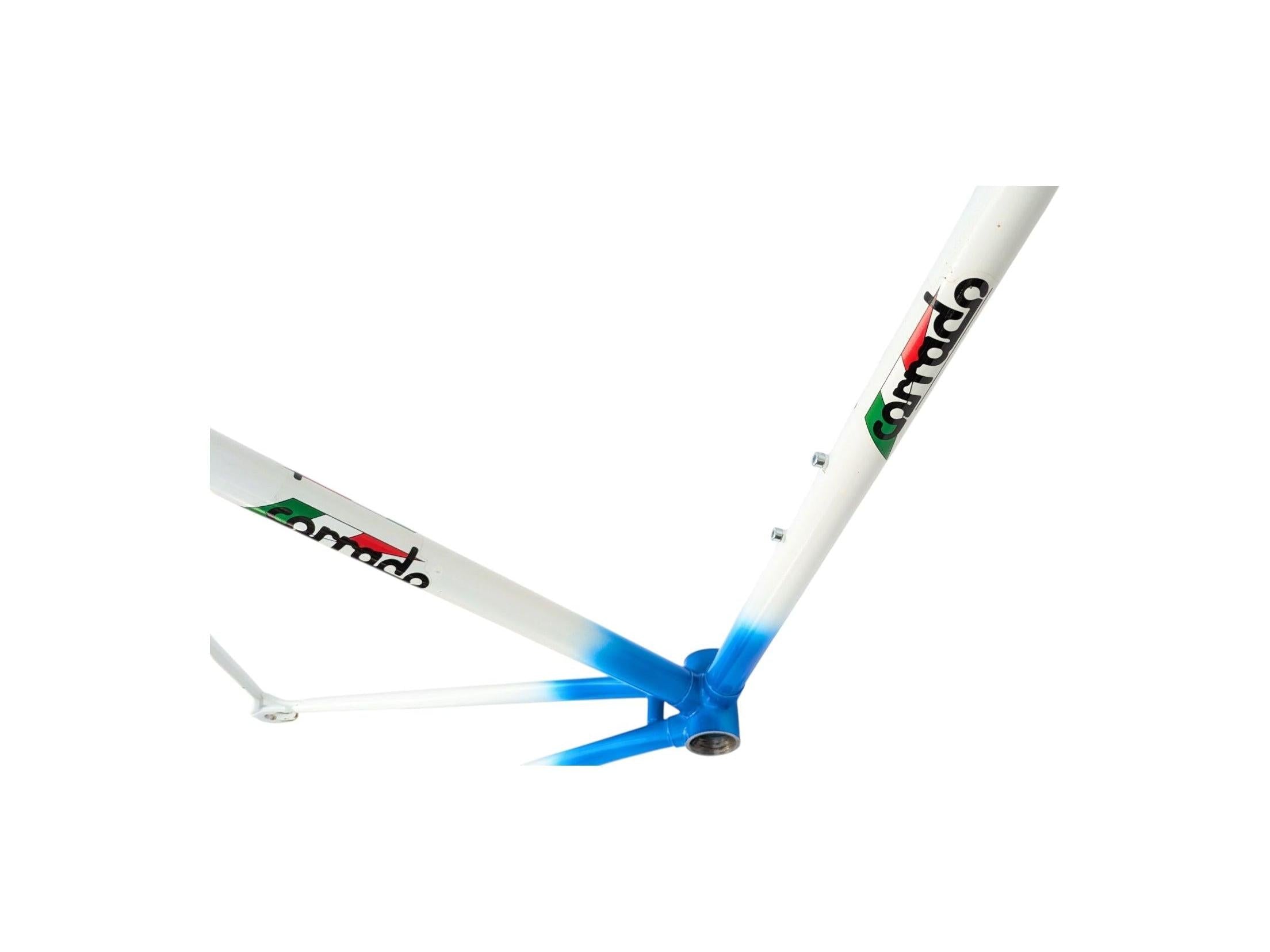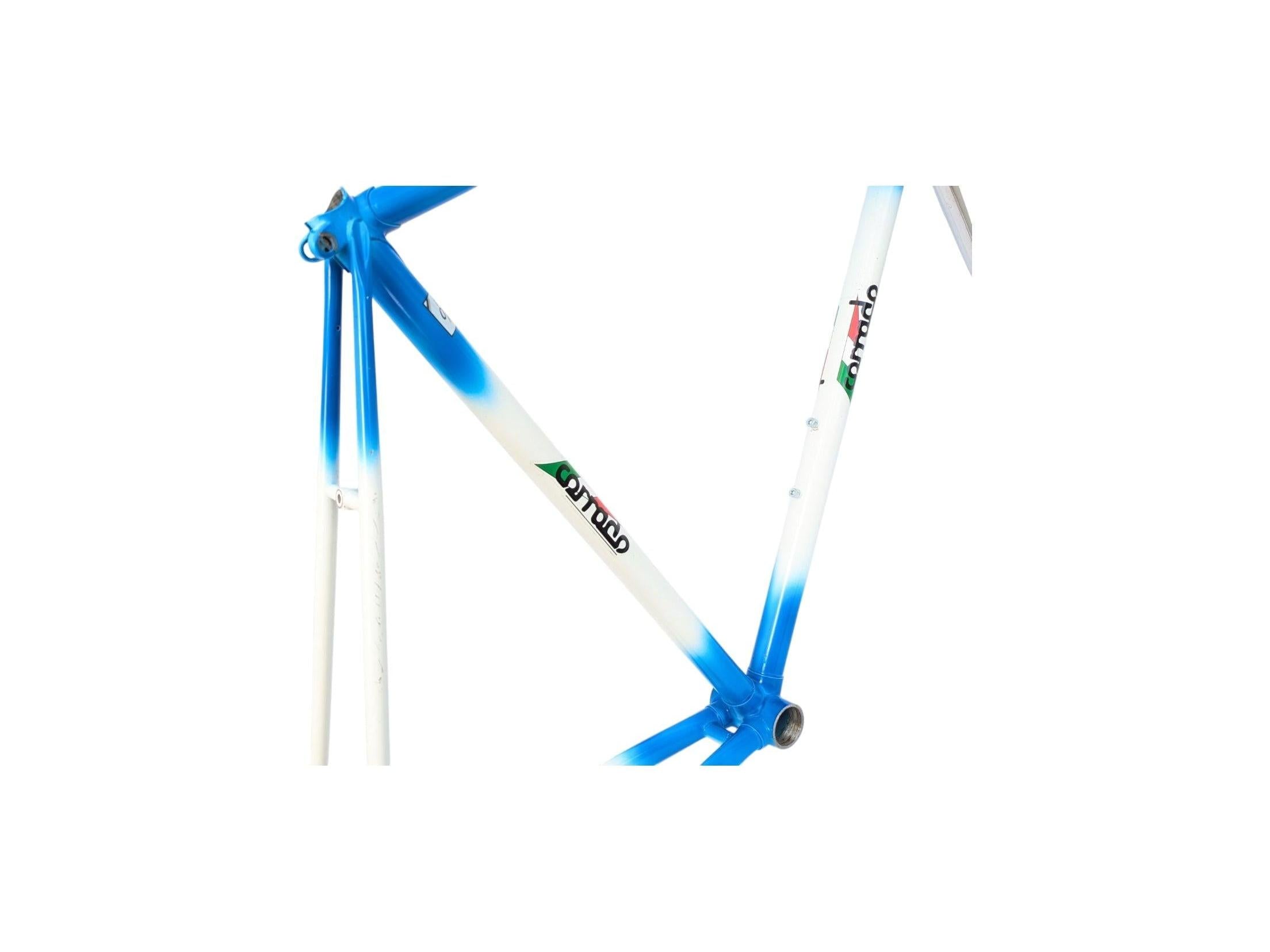 Corrado road bike frame built from Tubi Oria steel tubing, showcasing elegant Italian craftsmanship from the 1980s.