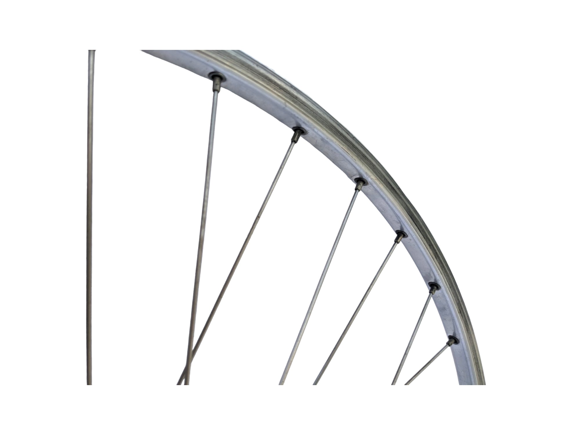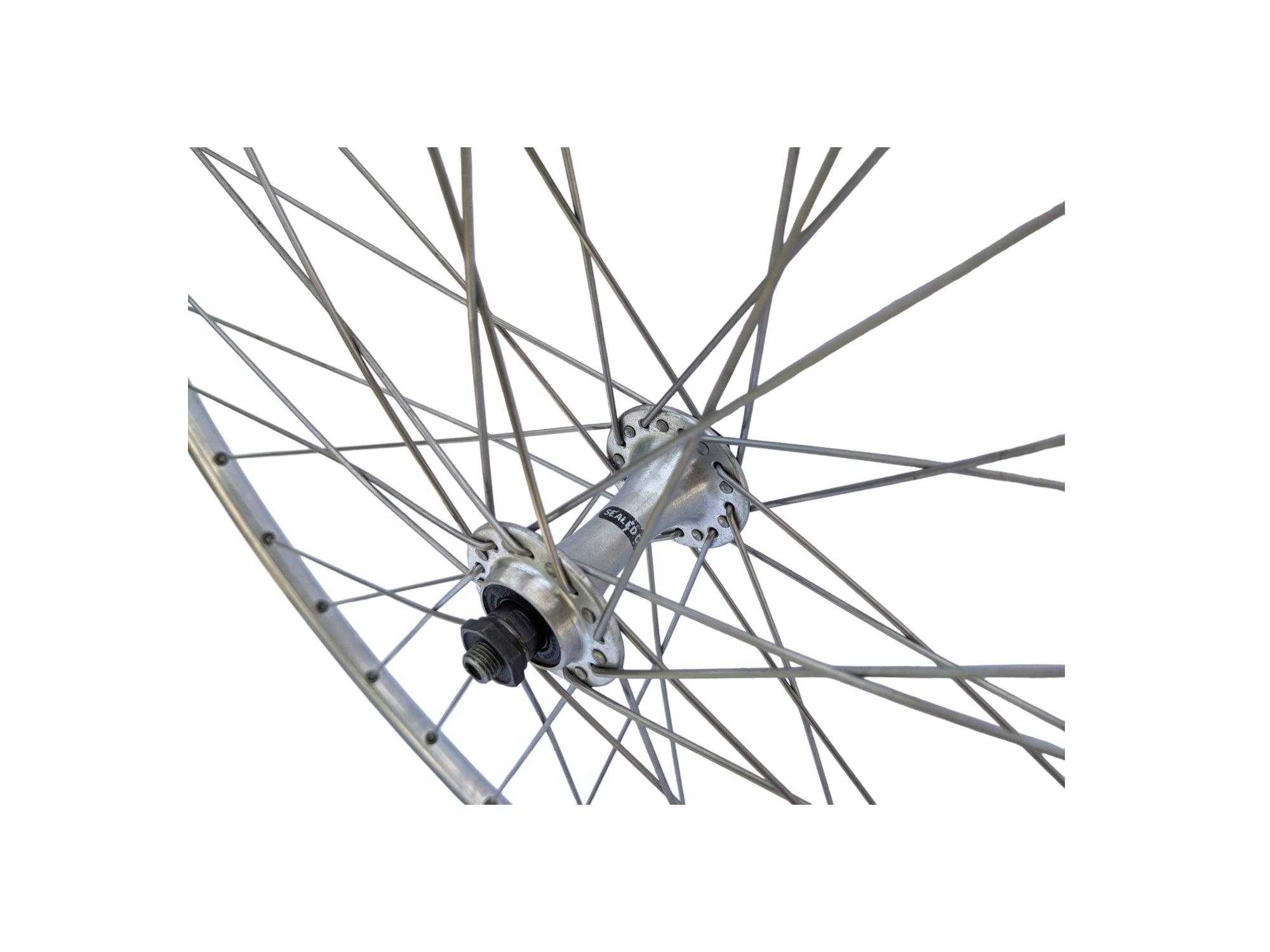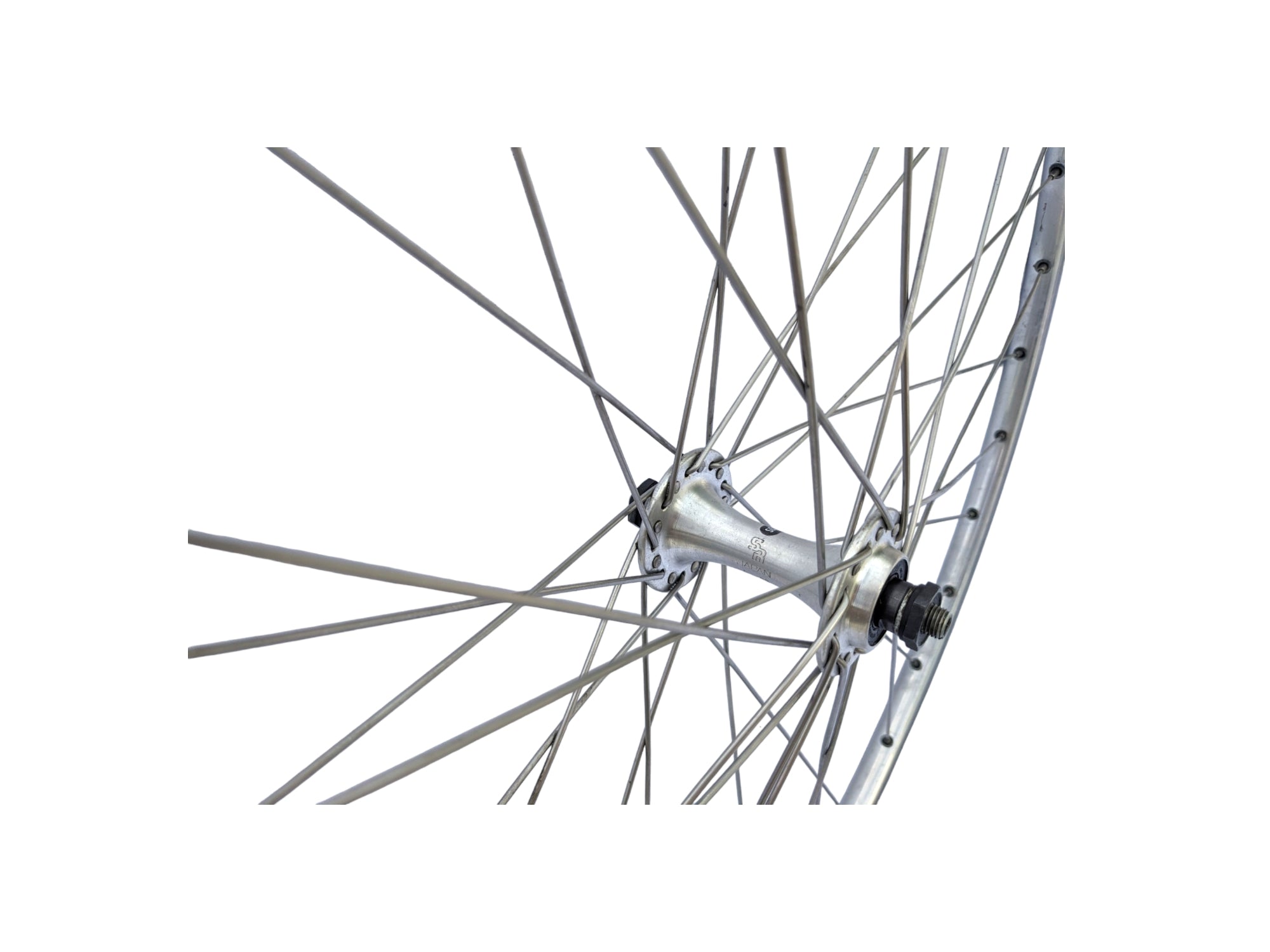 SR Sakae clincher front wheel, 28″ (622 mm), with 100 mm spacing and a 13/19 mm rim profile. Used, cleaned and fully functional — a classic Japanese component that complements steel frames and period-correct restorations.