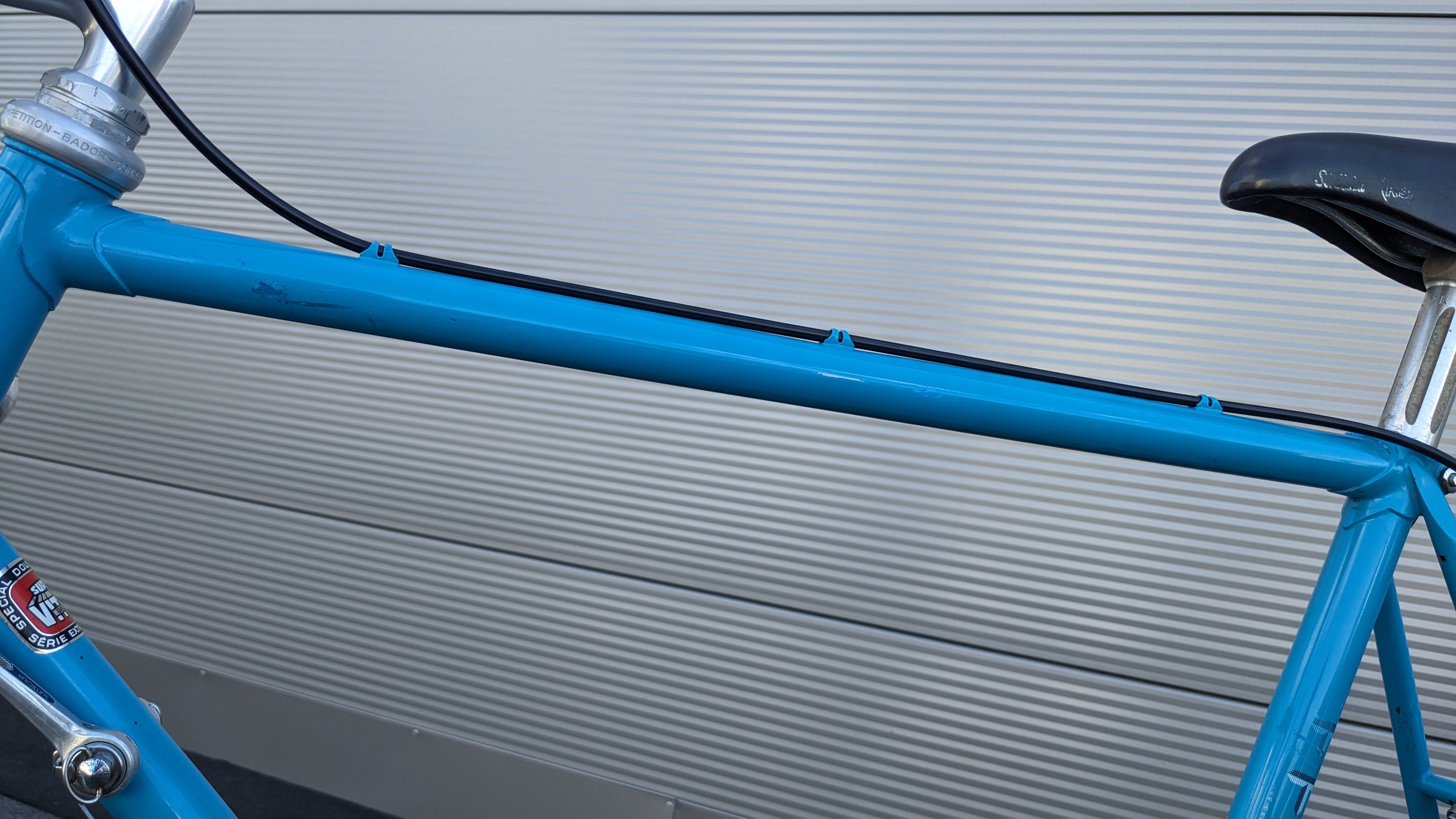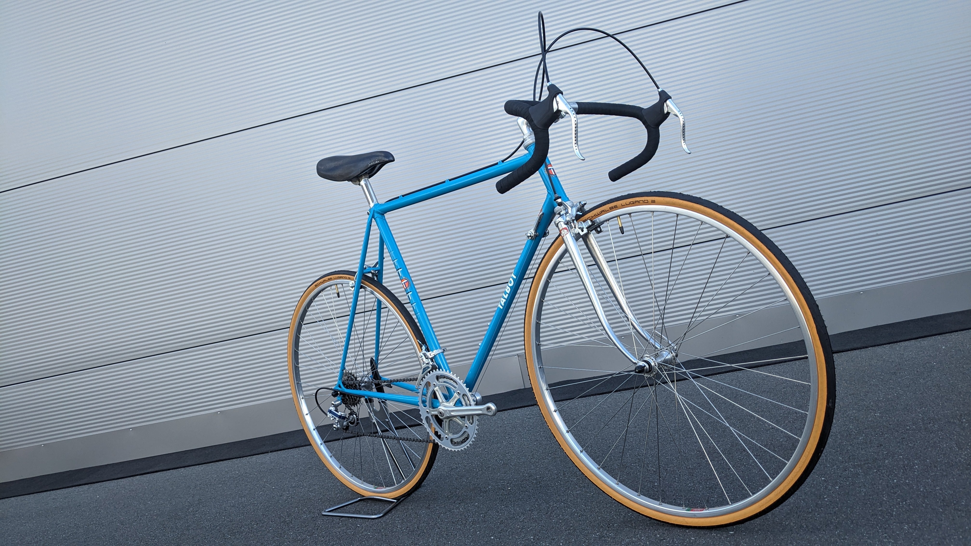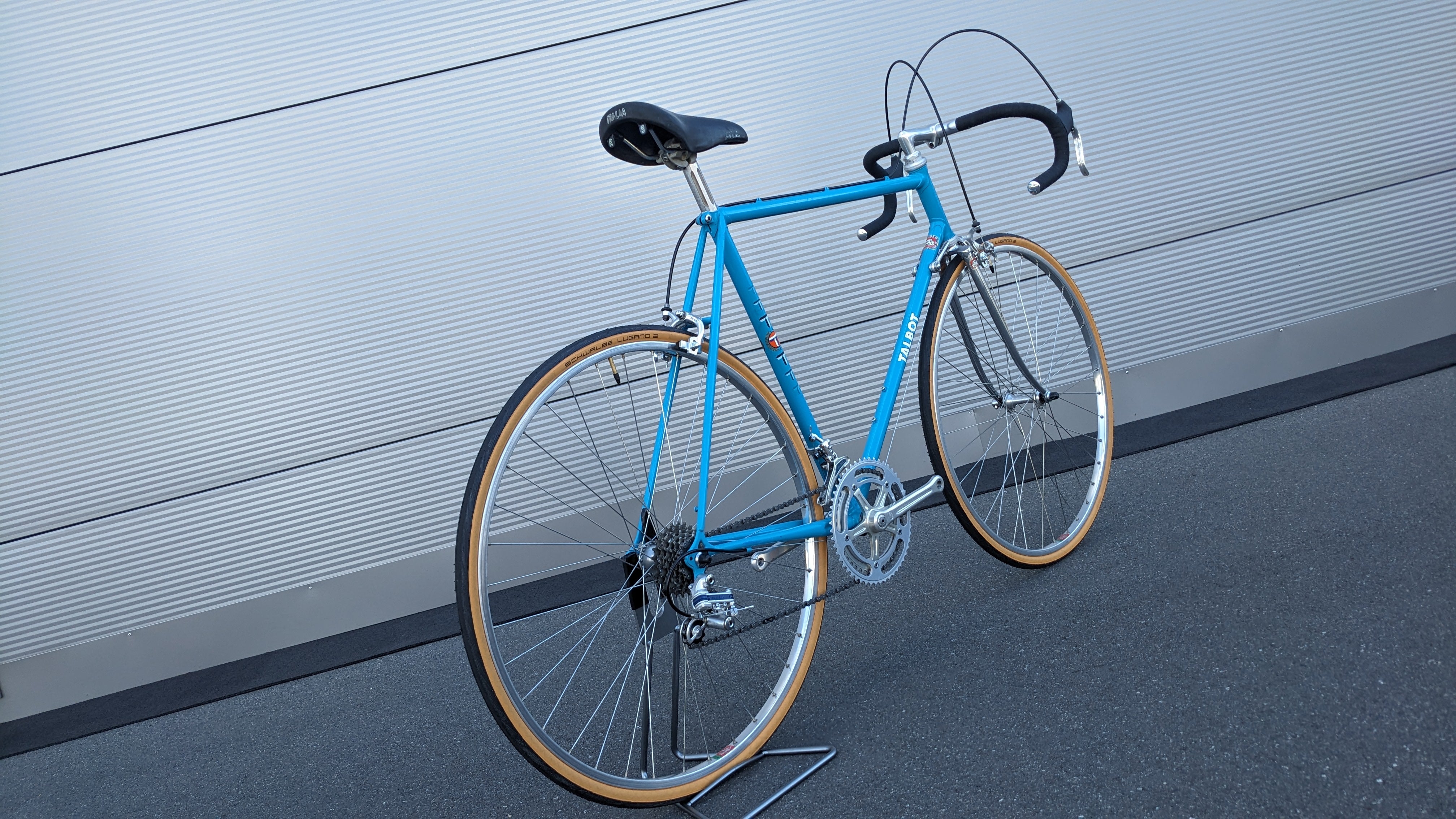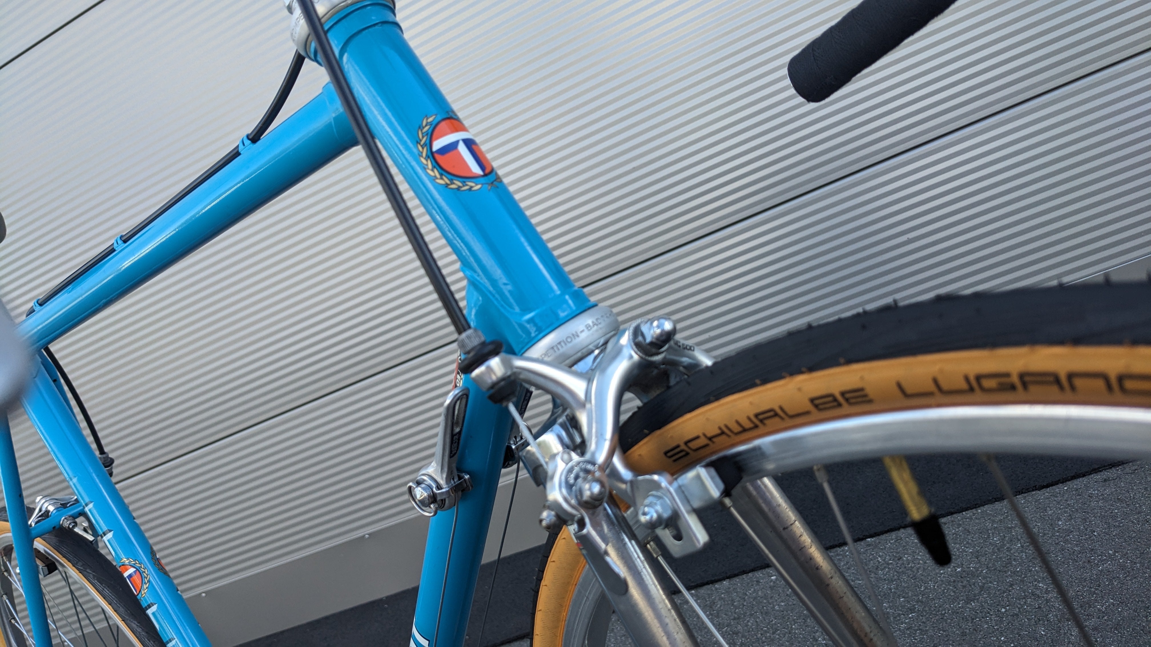 The bike is in a used condition, but has been fully restored with all relevant wearing parts replaced. The frame is free of dents, cracks, and bends, with only minor paint wear. Any paint defects have been carefully touched up to maintain and enhance its aesthetics. This retro racing bike is available in a fully functional state and is perfect for your first vintage bike tour.