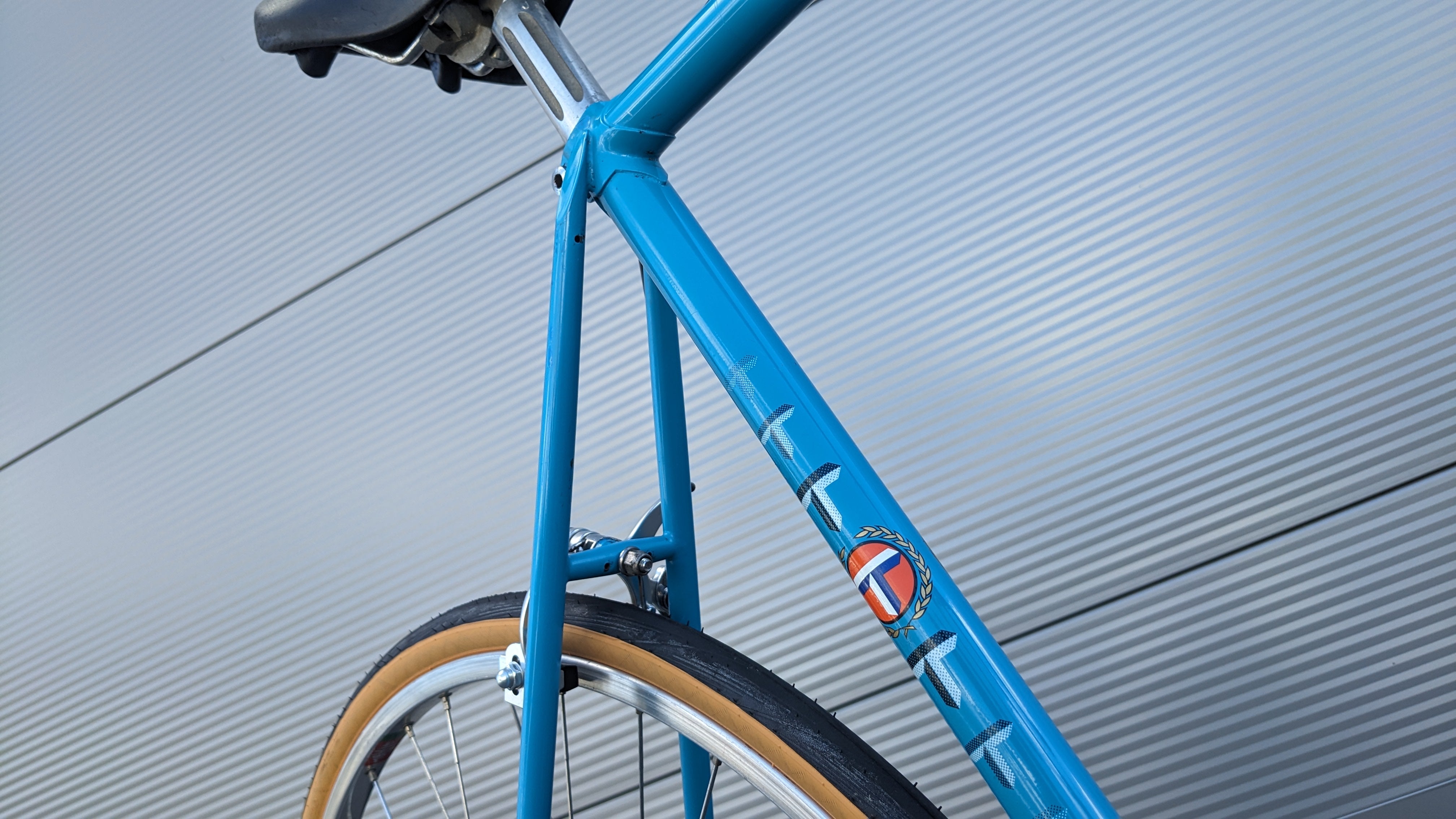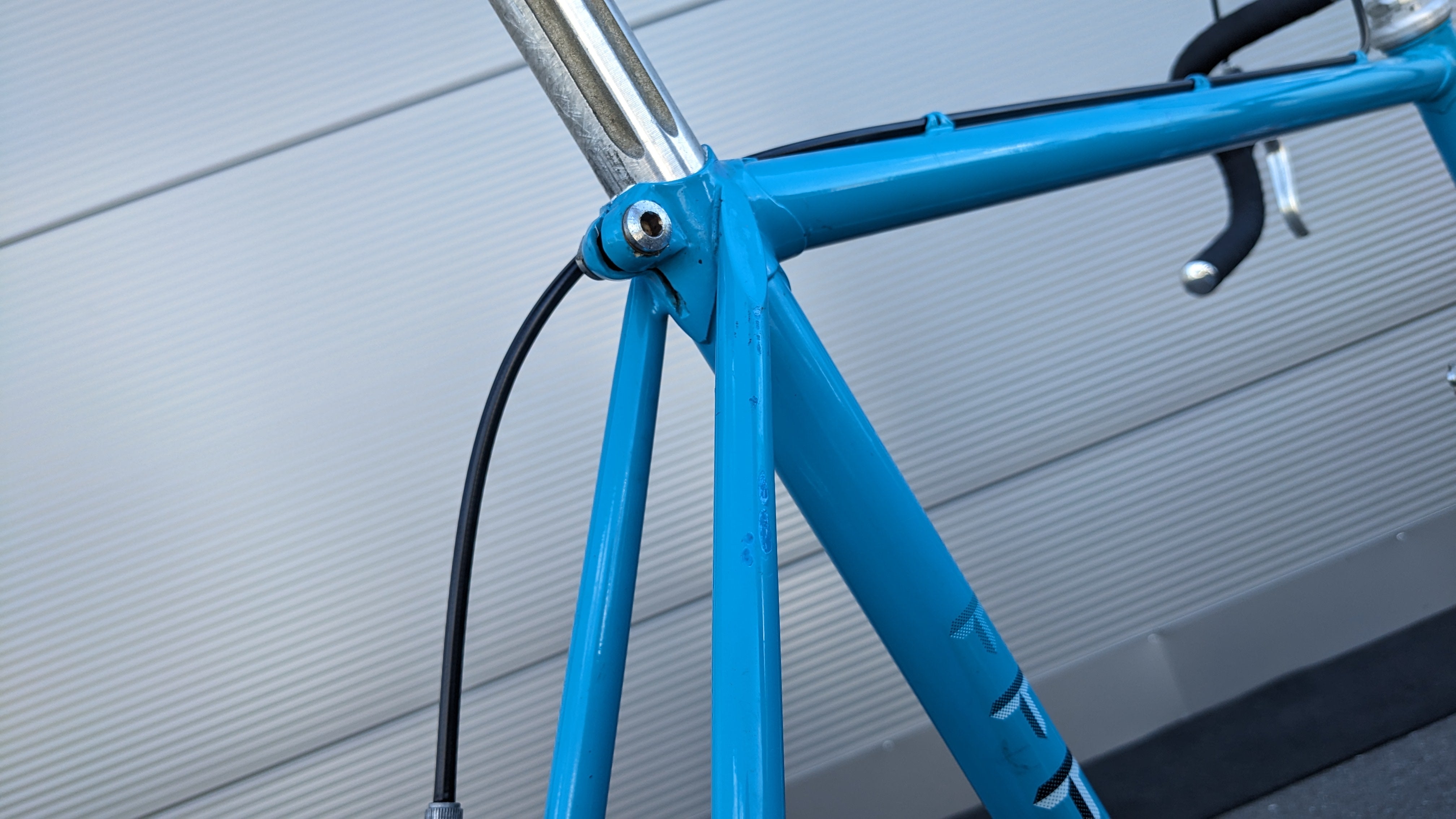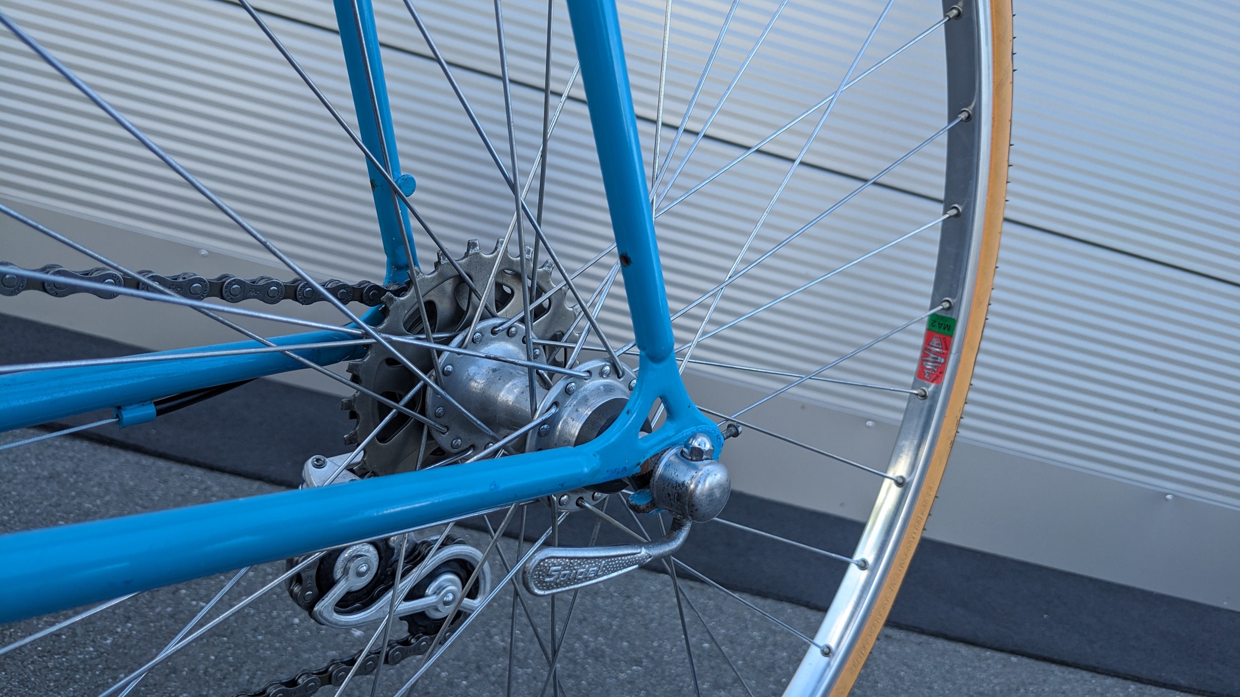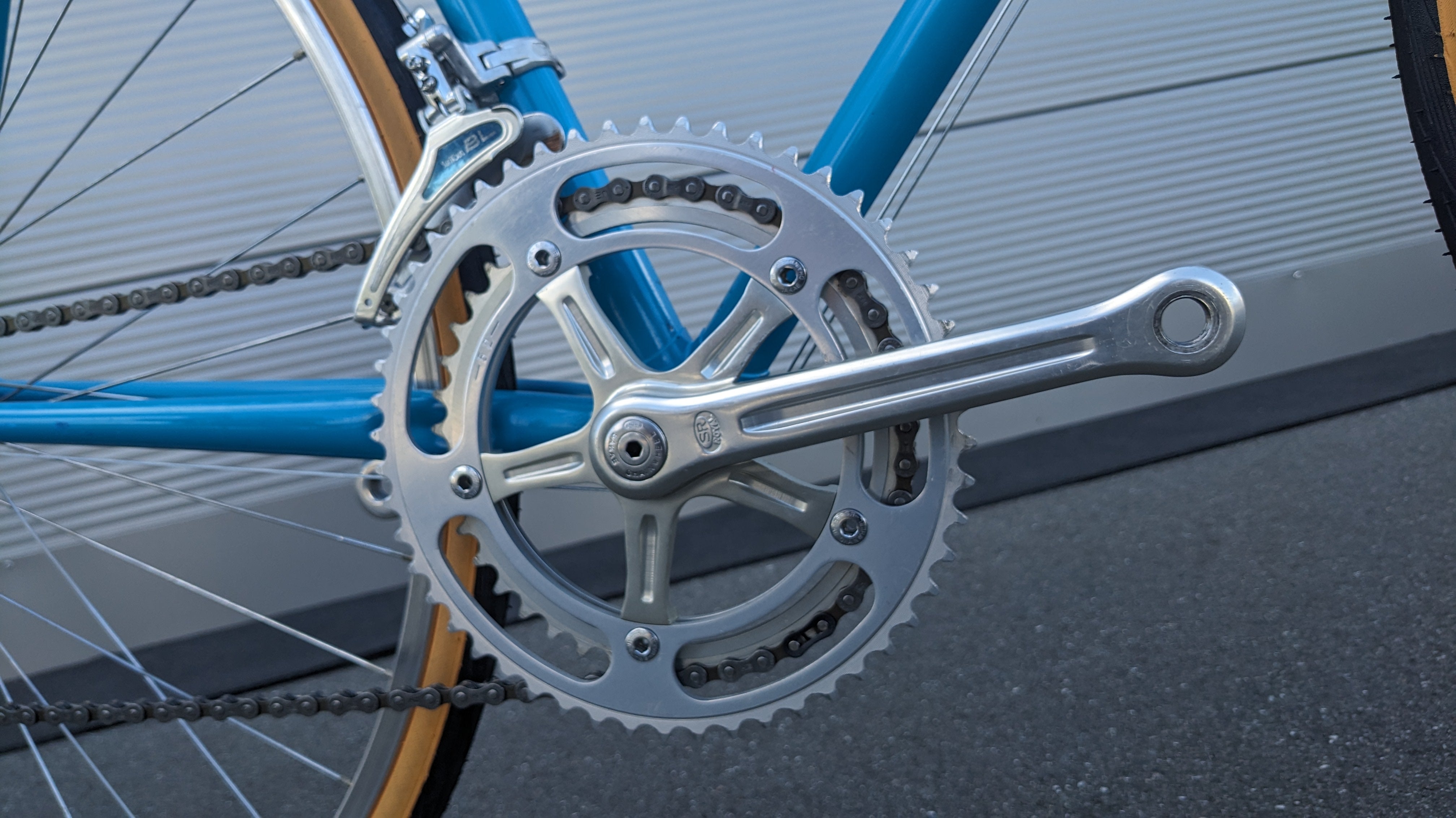 The bike is in a used condition, but has been fully restored with all relevant wearing parts replaced. The frame is free of dents, cracks, and bends, with only minor paint wear. Any paint defects have been carefully touched up to maintain and enhance its aesthetics. This retro racing bike is available in a fully functional state and is perfect for your first vintage bike tour.