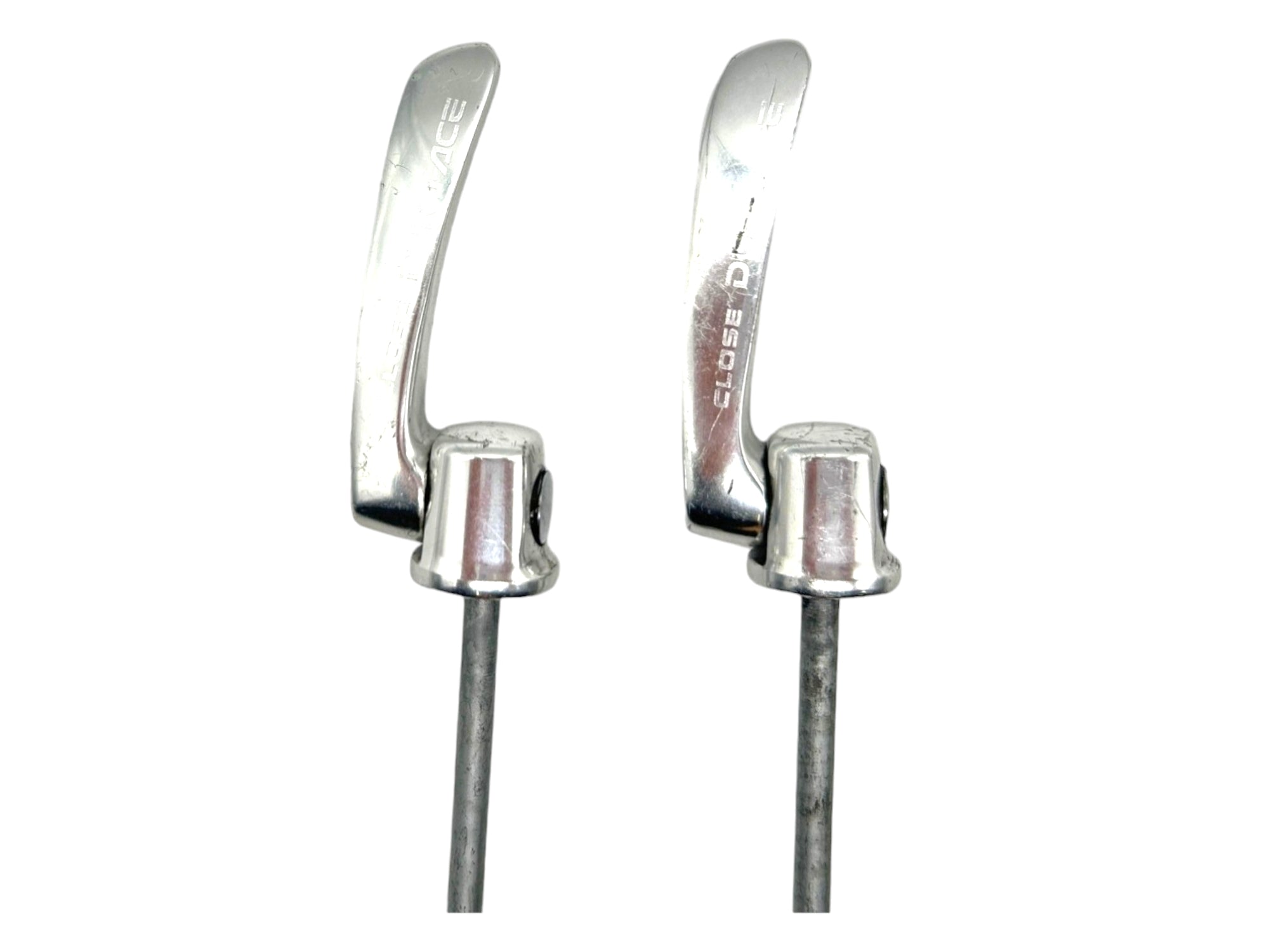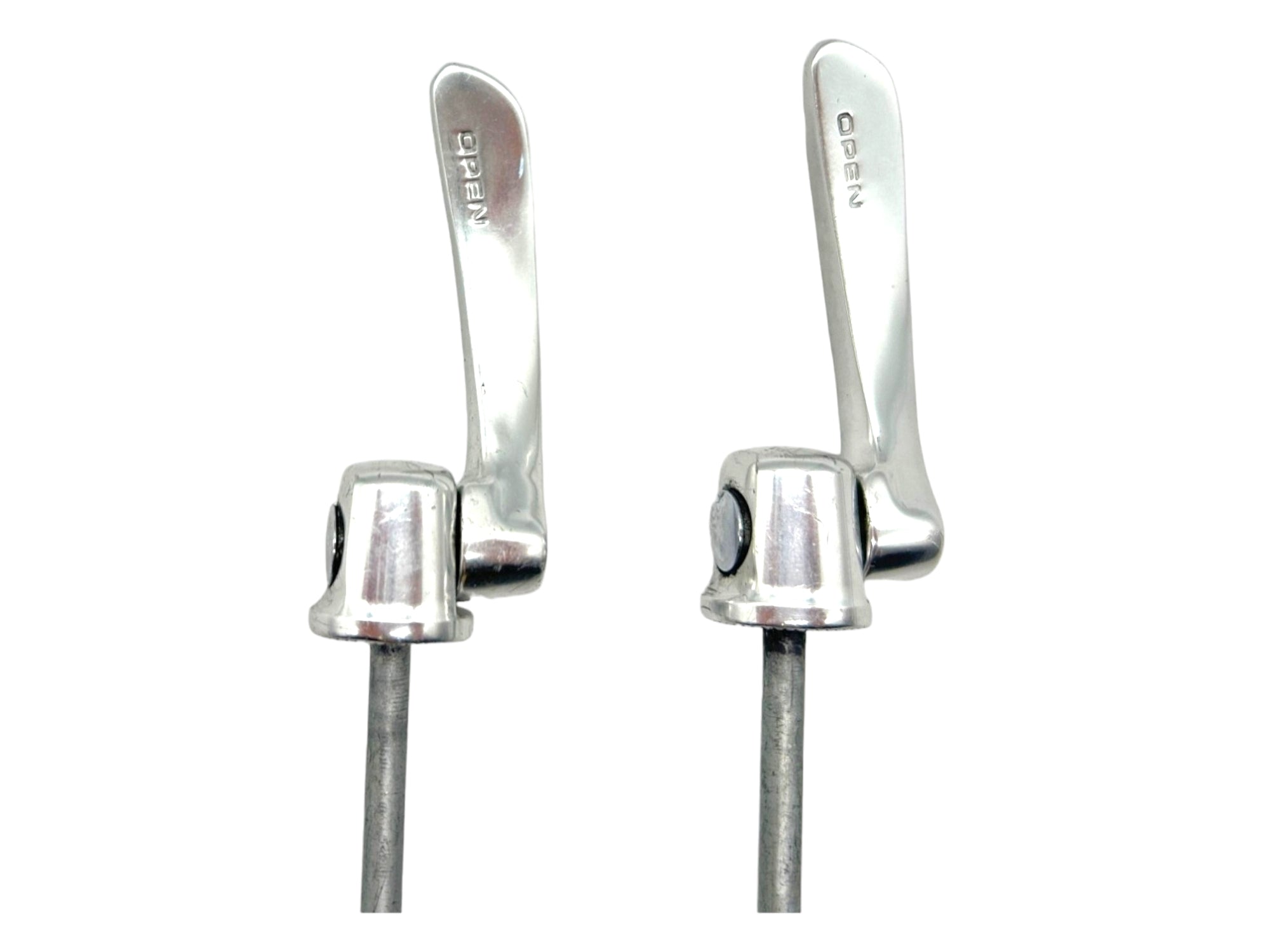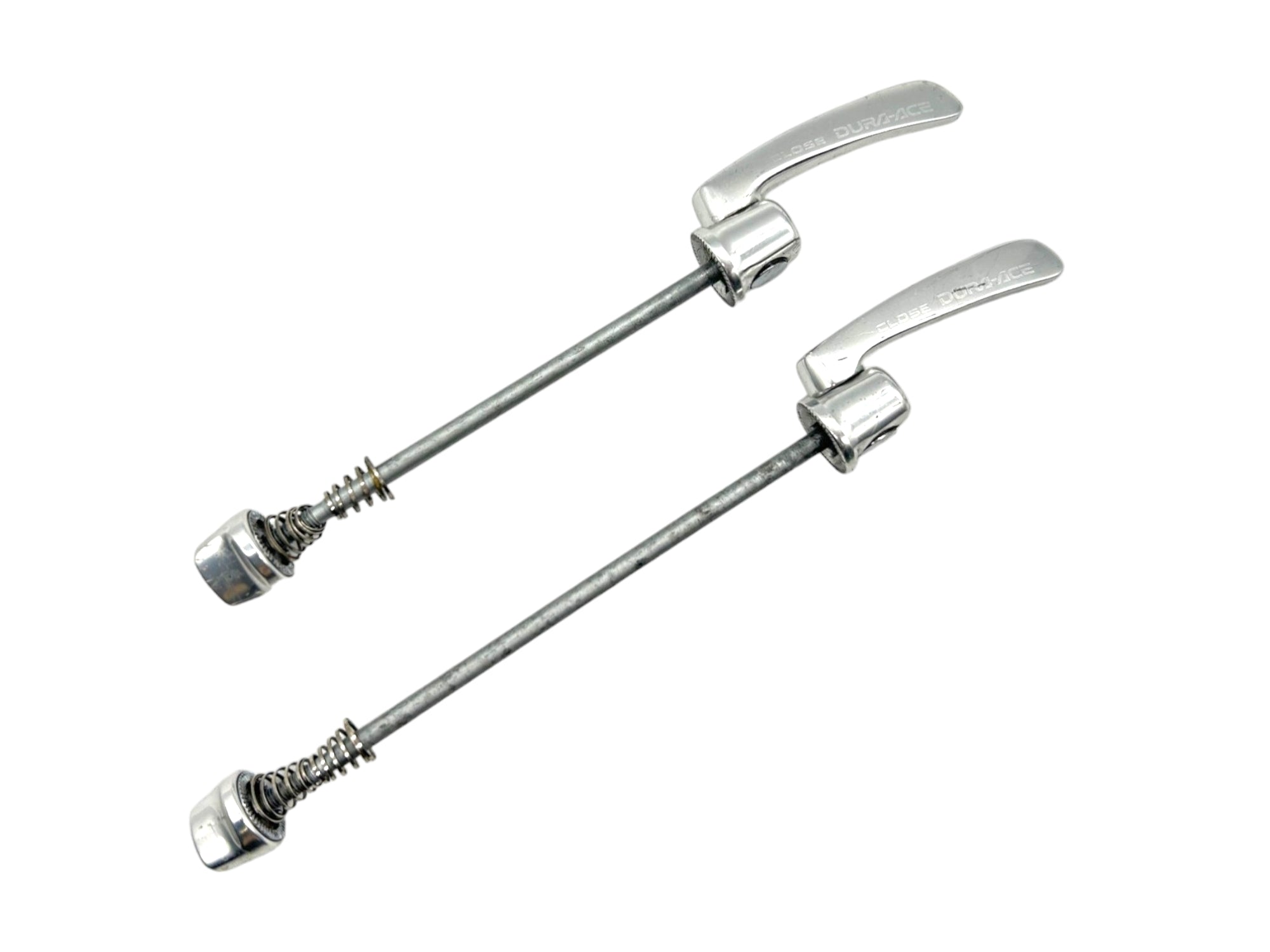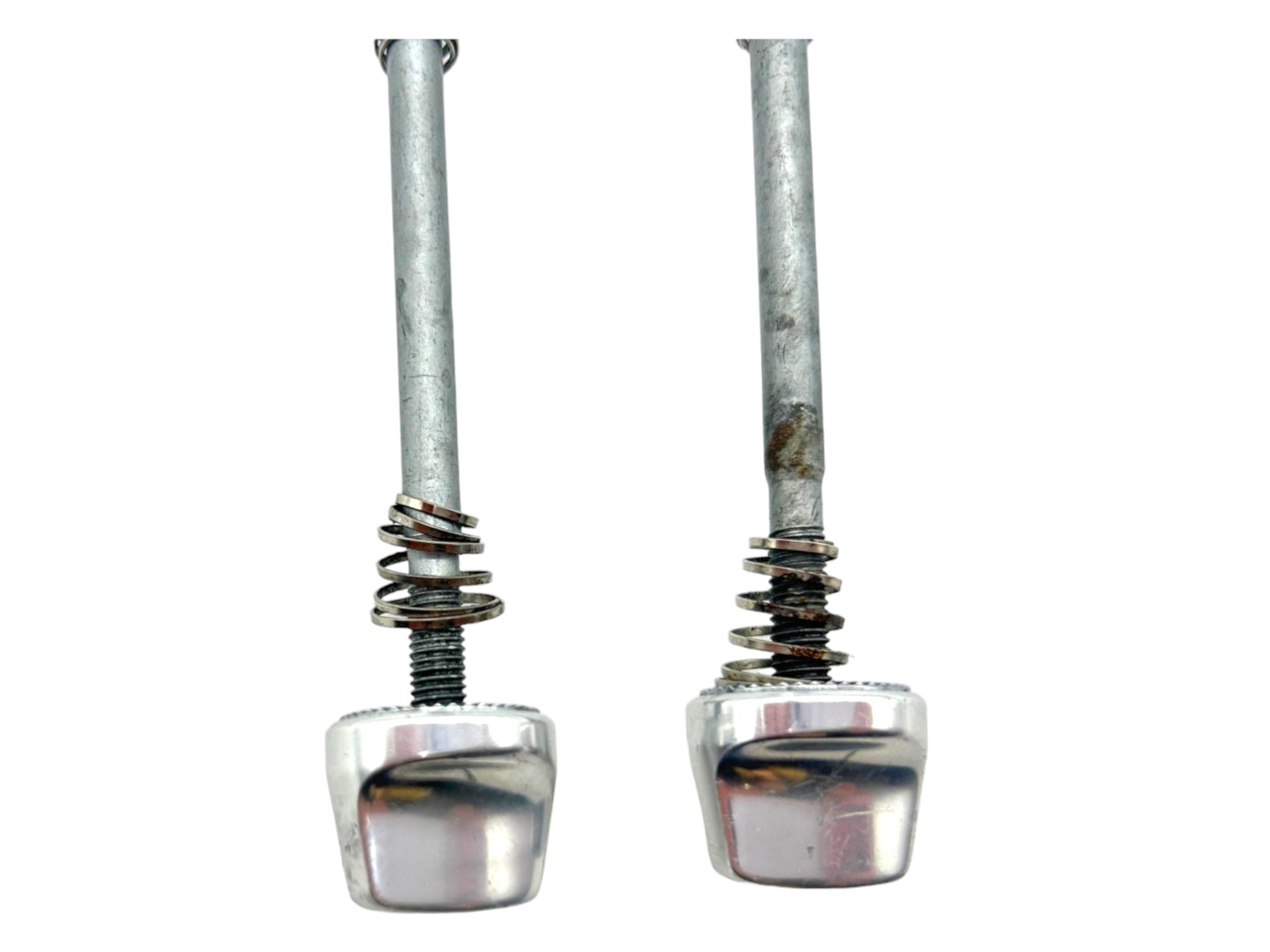 Shimano Dura Ace 7700 quick release skewers with 130 / 160 mm axles, cleaned and fully functional. A precision Japanese set, ideal for steel frame builds or classic road wheel restorations seeking authentic 7700 components.