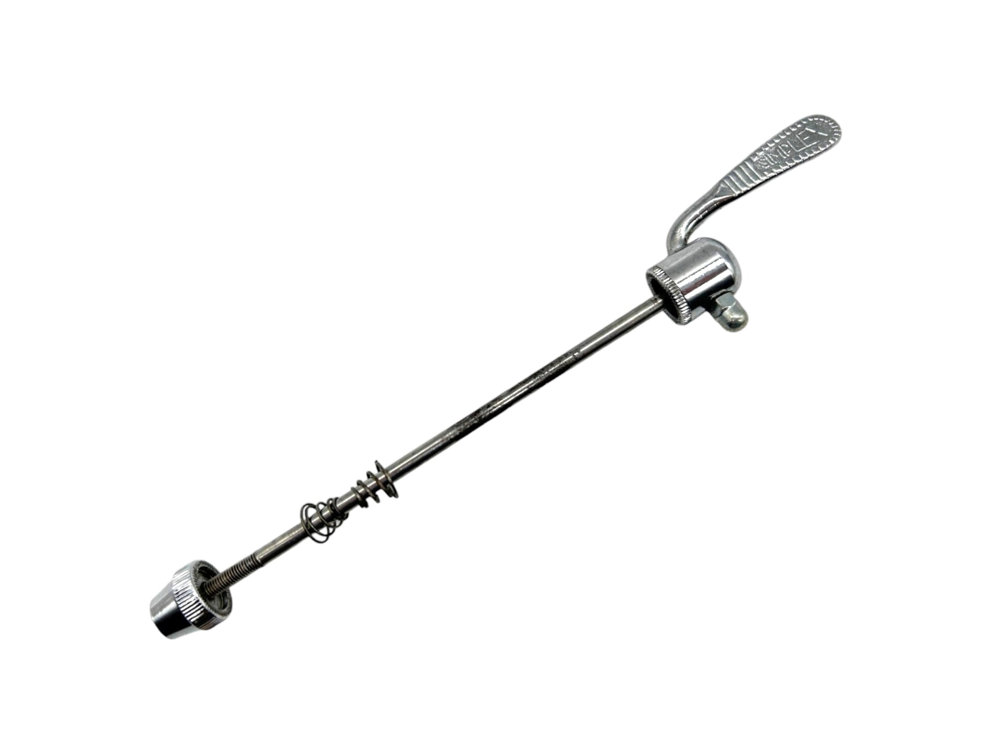 Simplex rear quick release skewer with a 160 mm axle length, fully cleaned and functional. A classic French part — ideal for vintage wheelsets and steel frame restorations needing authentic period components.