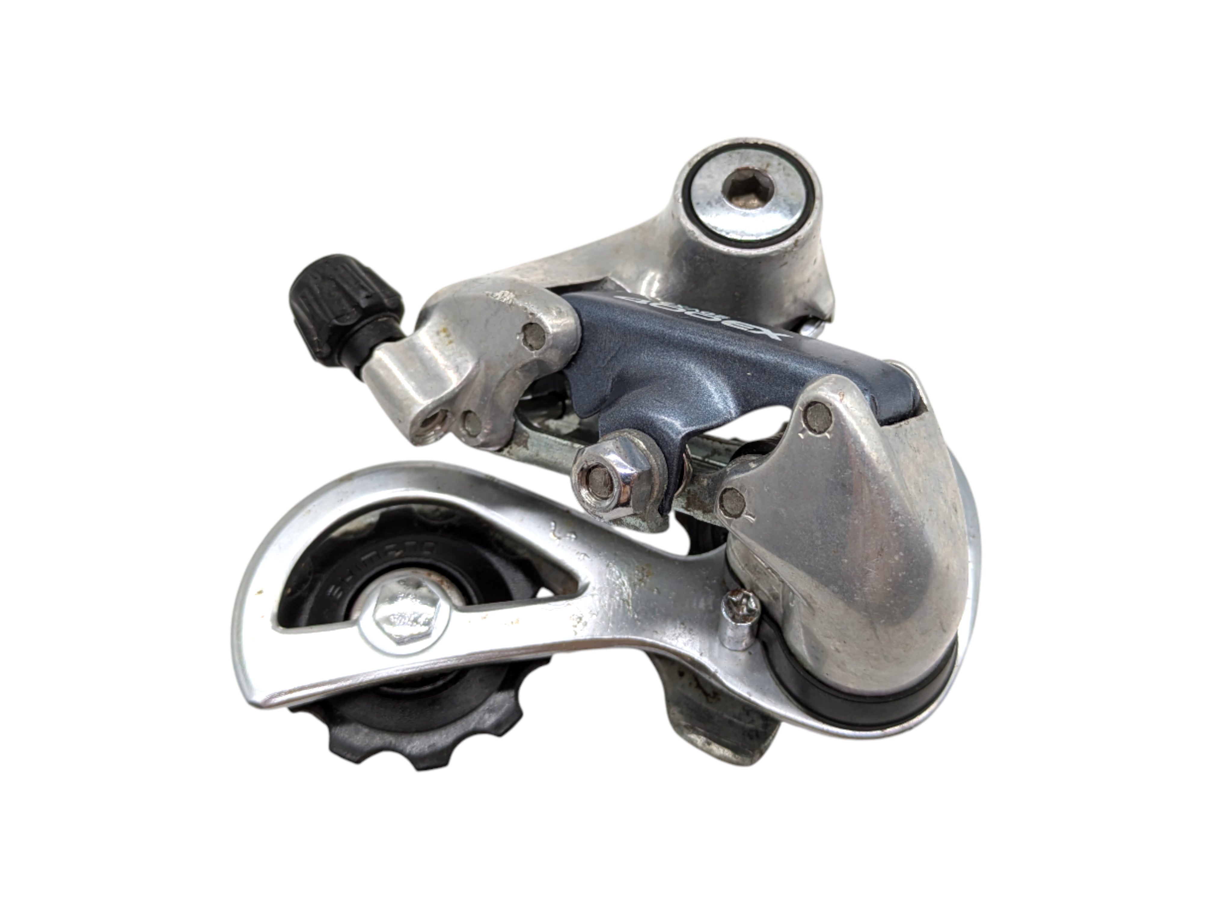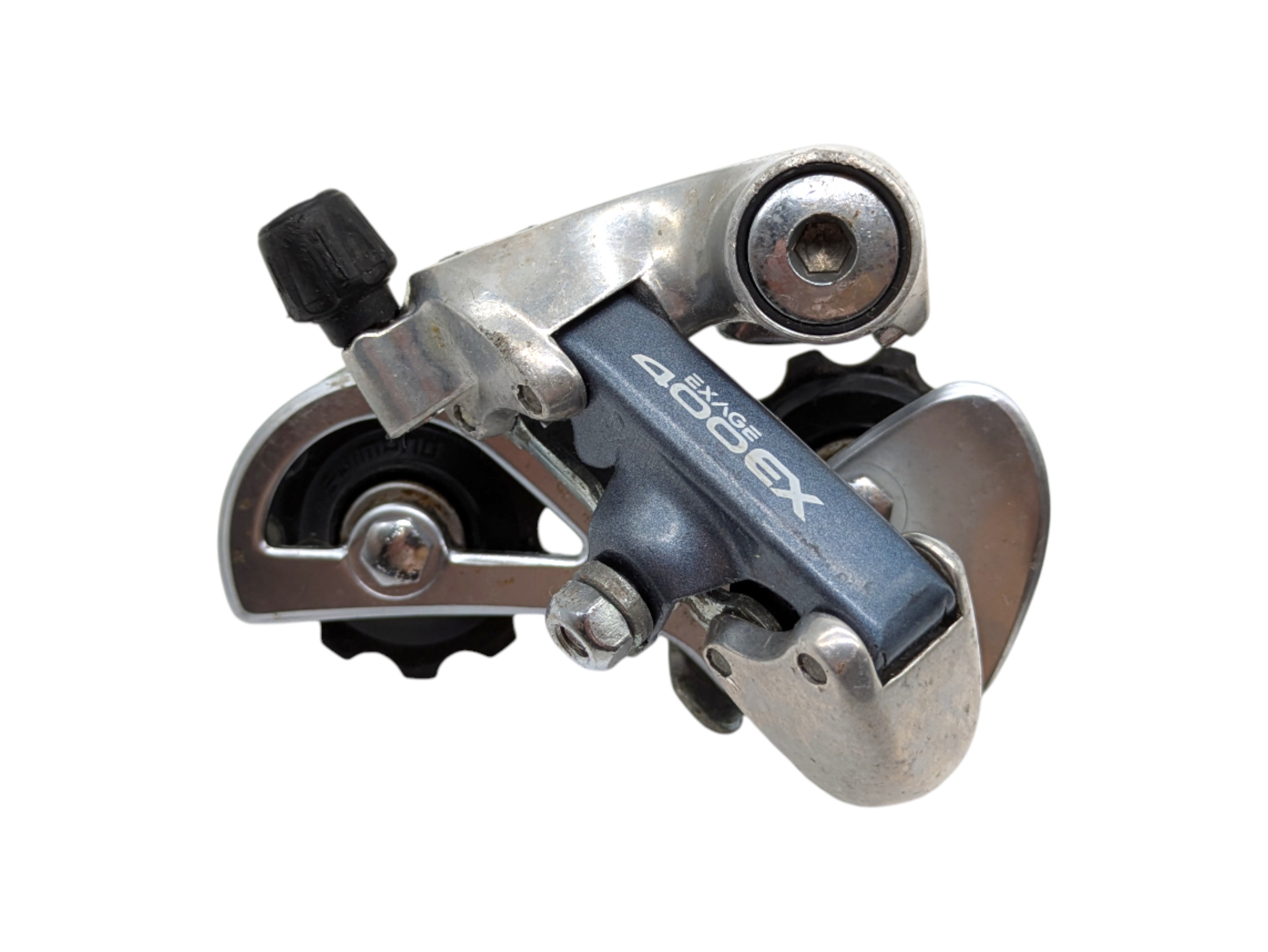 Shimano Exage 400 EX rear derailleur, designed for 7-speed drivetrains. Made in Japan in the early 1990s, this Short Cage model offers reliable, accurate shifting and solid construction. Suitable for classic road bikes and vintage setups where original Shimano performance and durability are required.