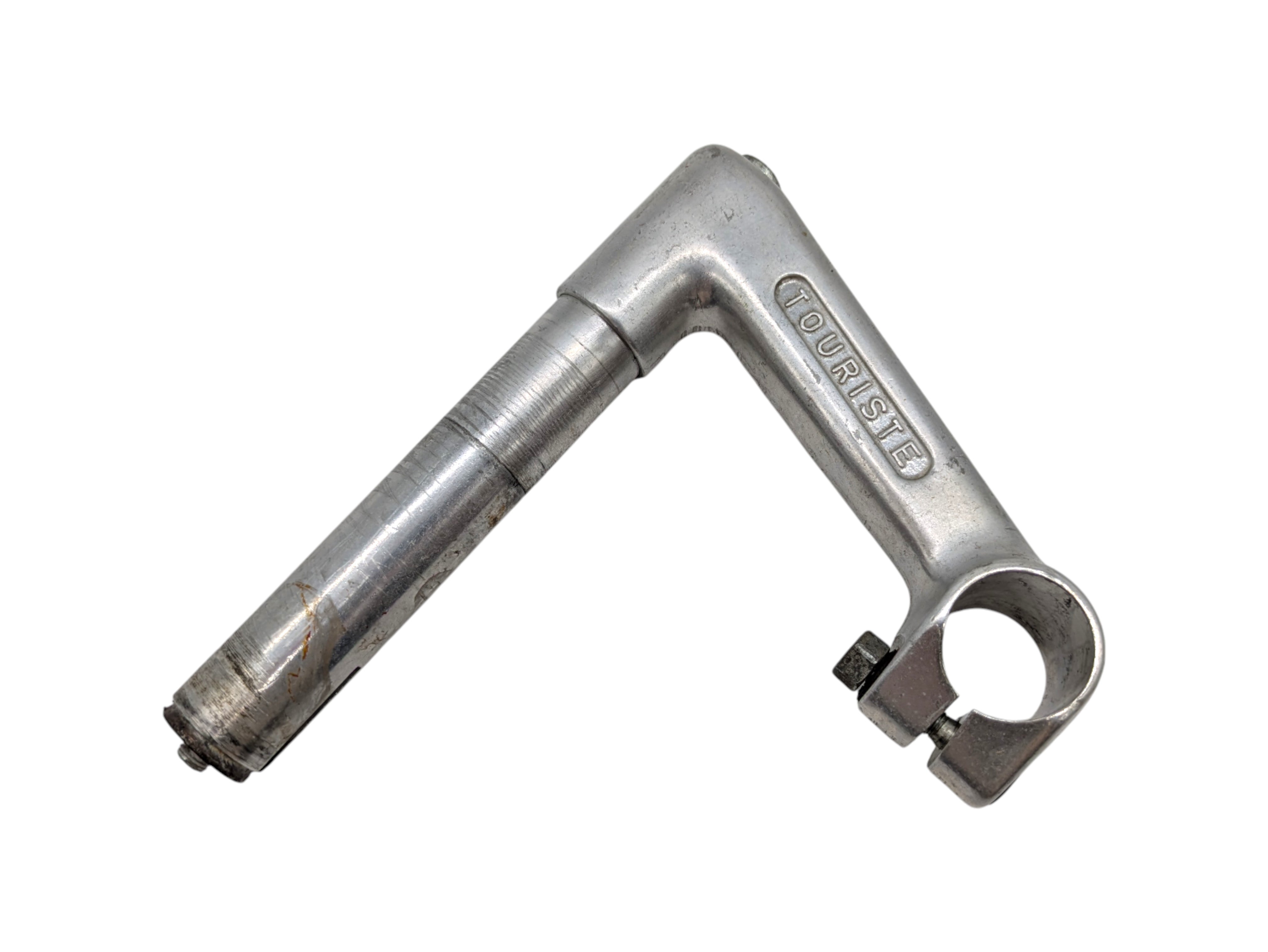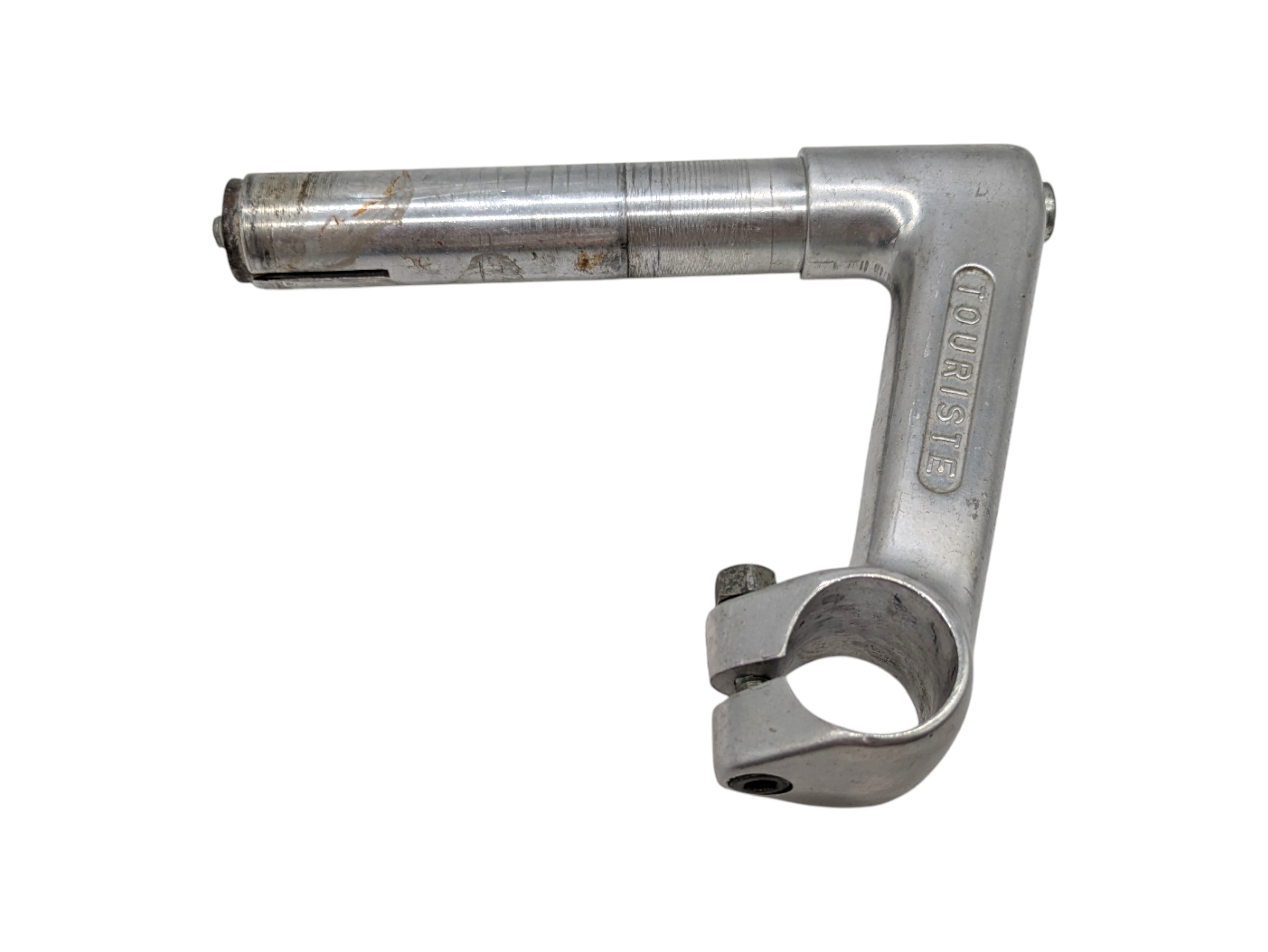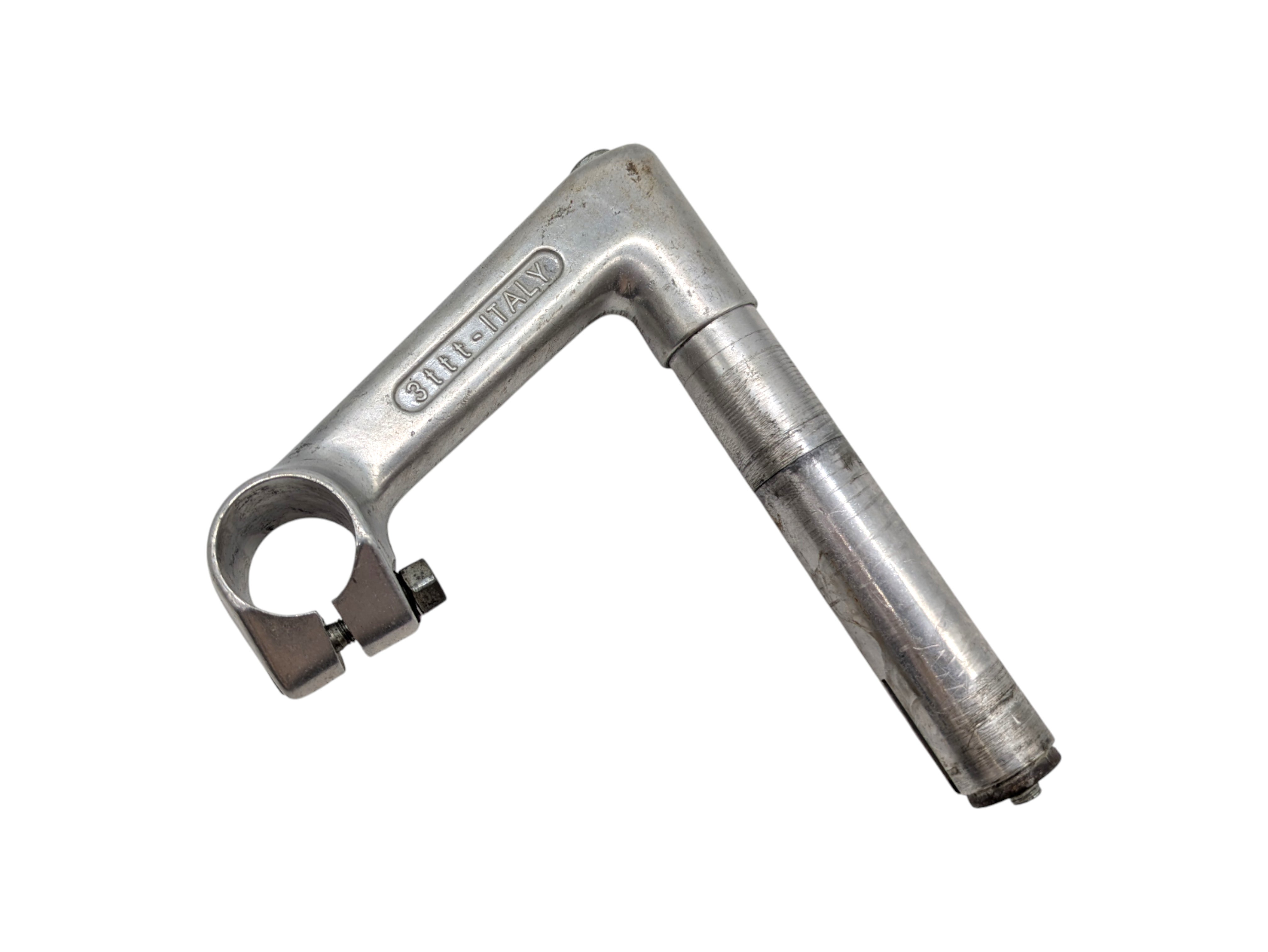 3TTT Touriste stem with 115 mm extension, 26 mm handlebar clamp, 22,2 mm shaft diameter, and 105 mm shaft length. Made in Italy, this stem represents classic design and reliable construction. A suitable component for vintage road bike restorations and authentic Italian steel builds.