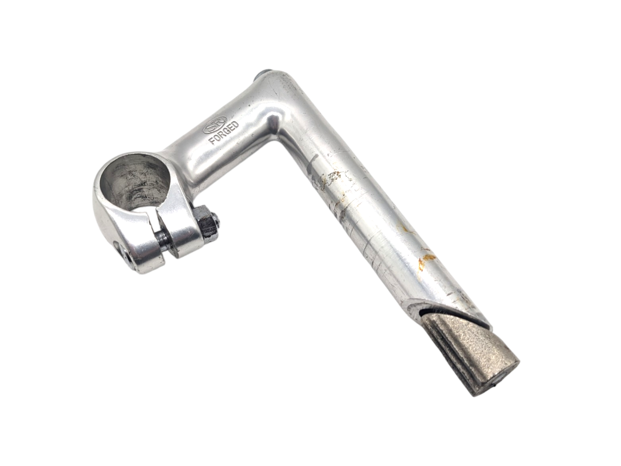 SR Sakae forged stem in silver, 80 mm length with 25.4 mm clamp, 22.2 mm quill and 150 mm shaft. Cleaned and fully functional, this Japanese classic is a reliable choice for vintage restorations and steel road bike projects.