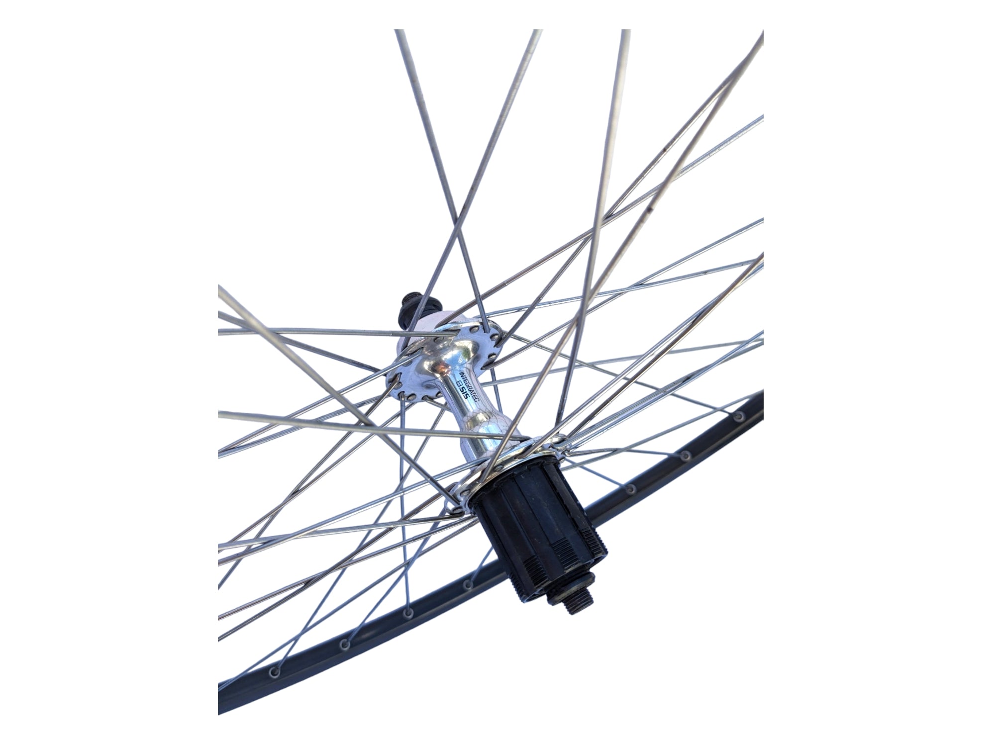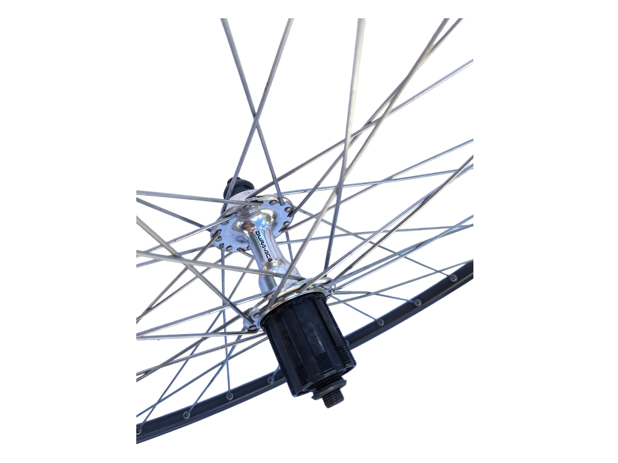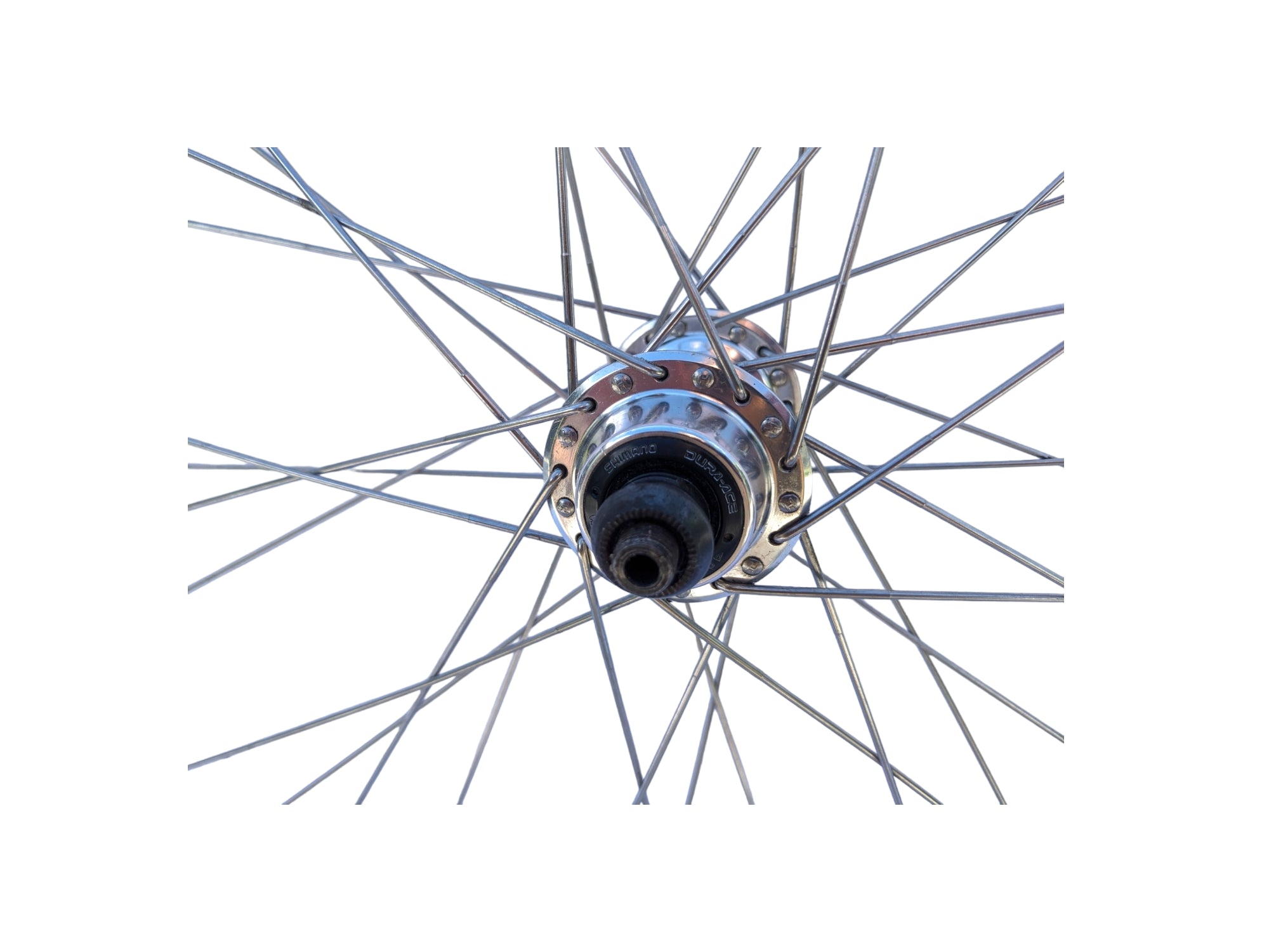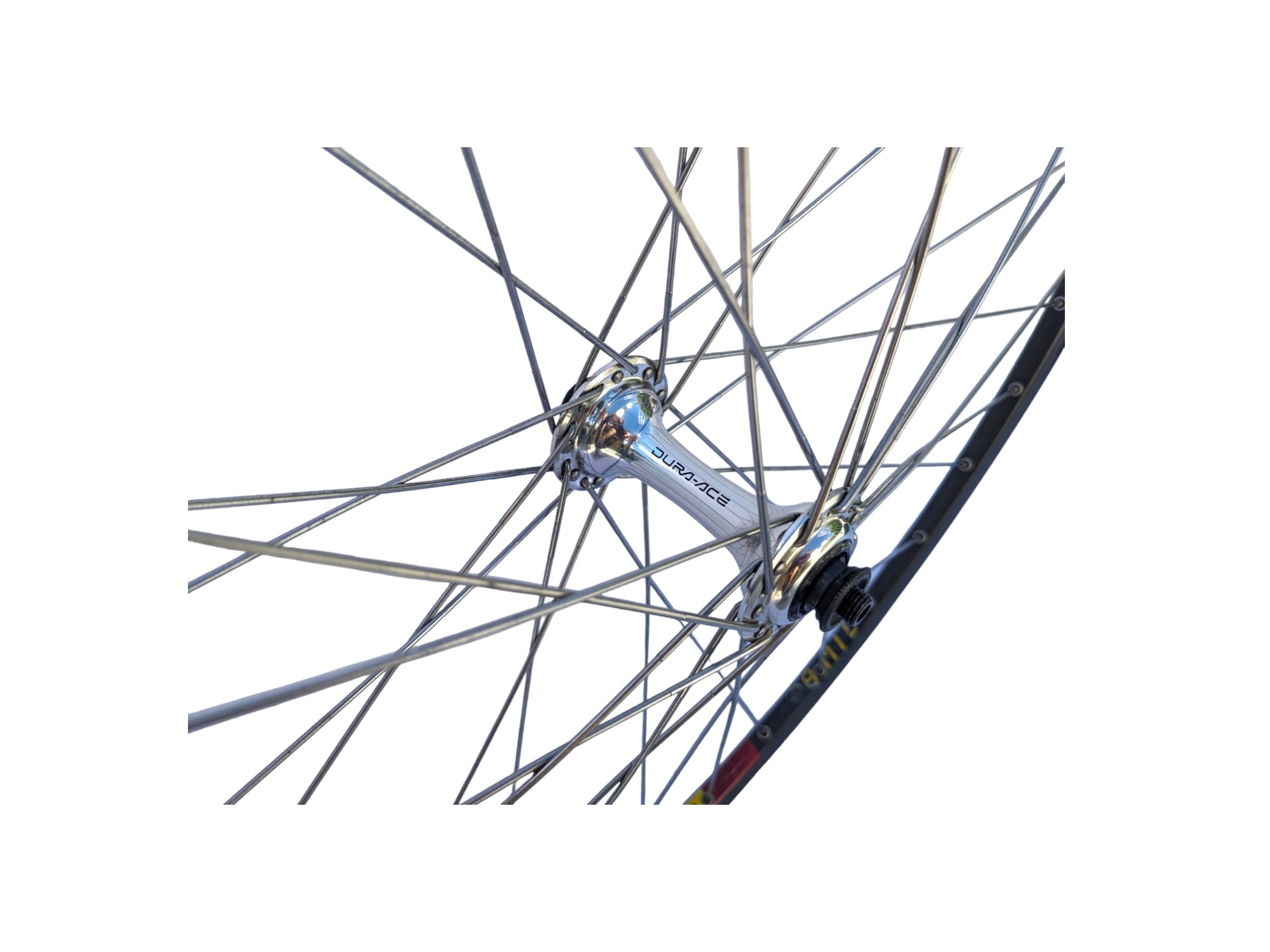Mavic SUP Ceramic wheelset with Shimano Dura Ace 7402 hubs, 28″ (622) clincher, 100 / 130 mm spacing and 13/19 mm rim width. Used, cleaned and fully functional — a French classic wheelset that enhances vintage road bikes and steel frame restorations.