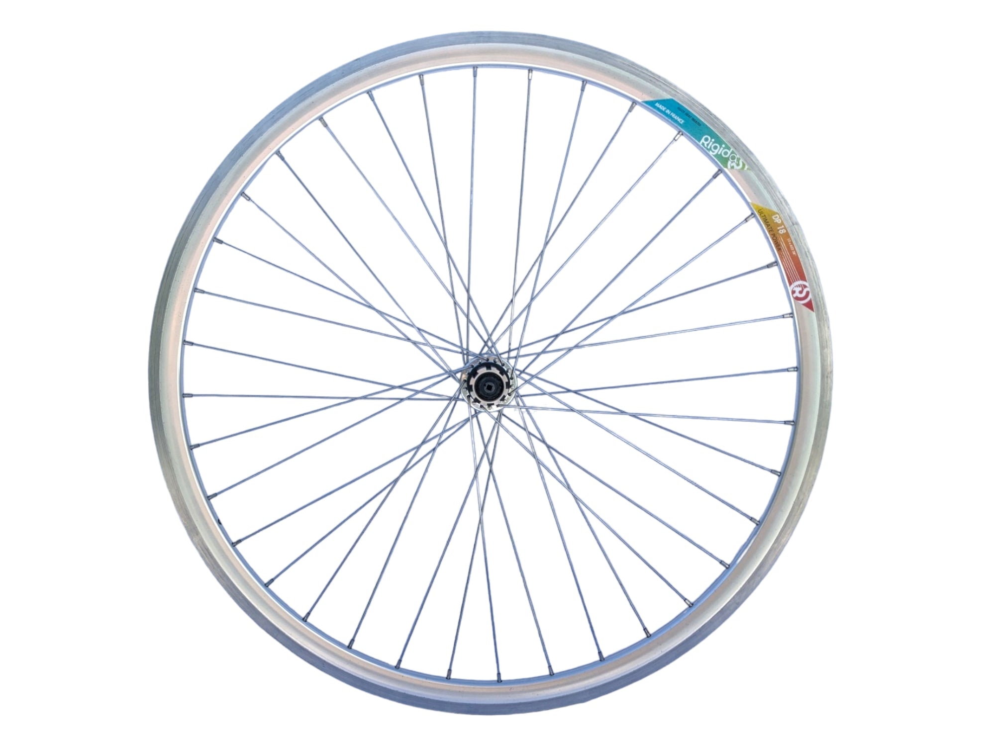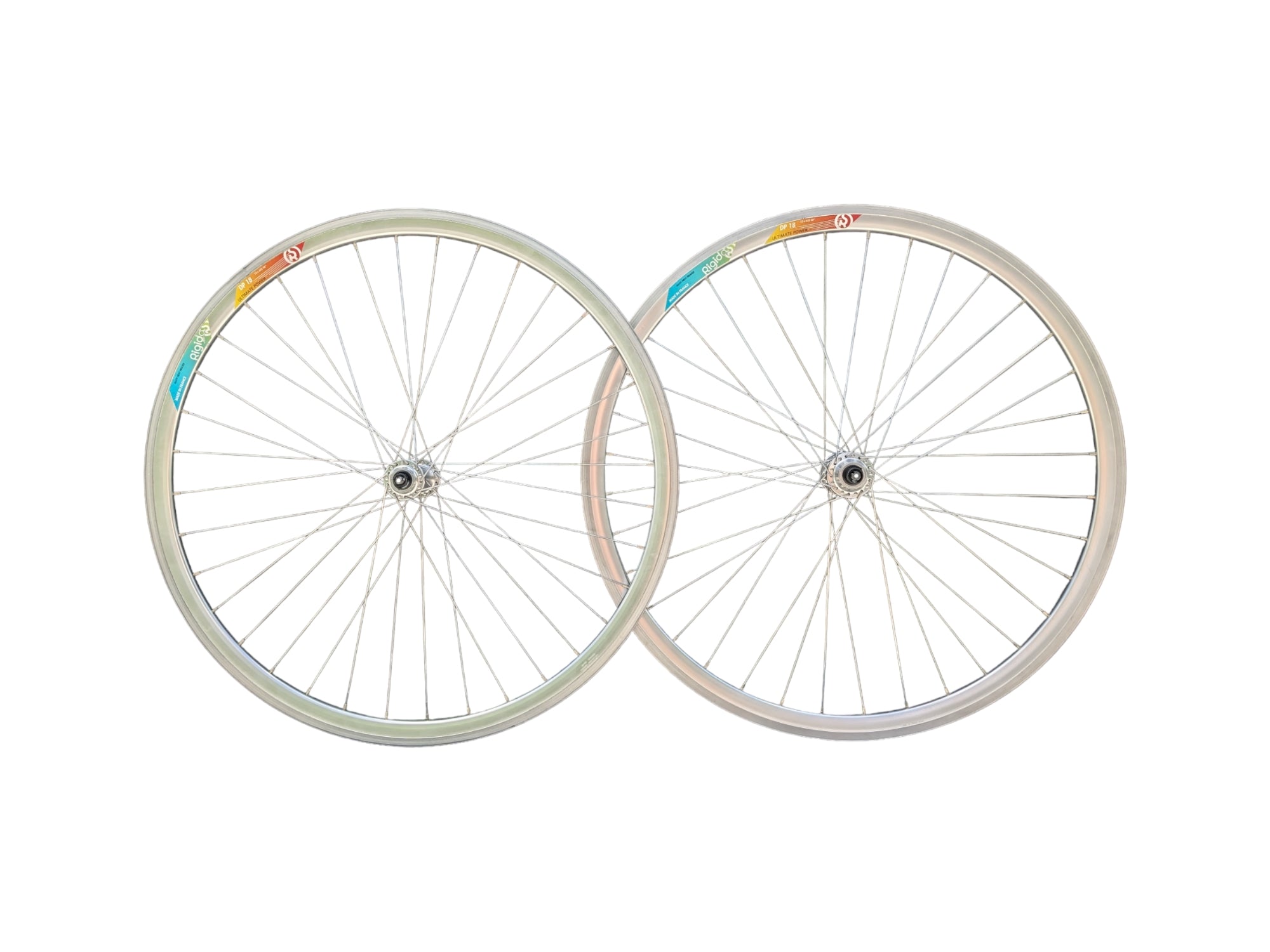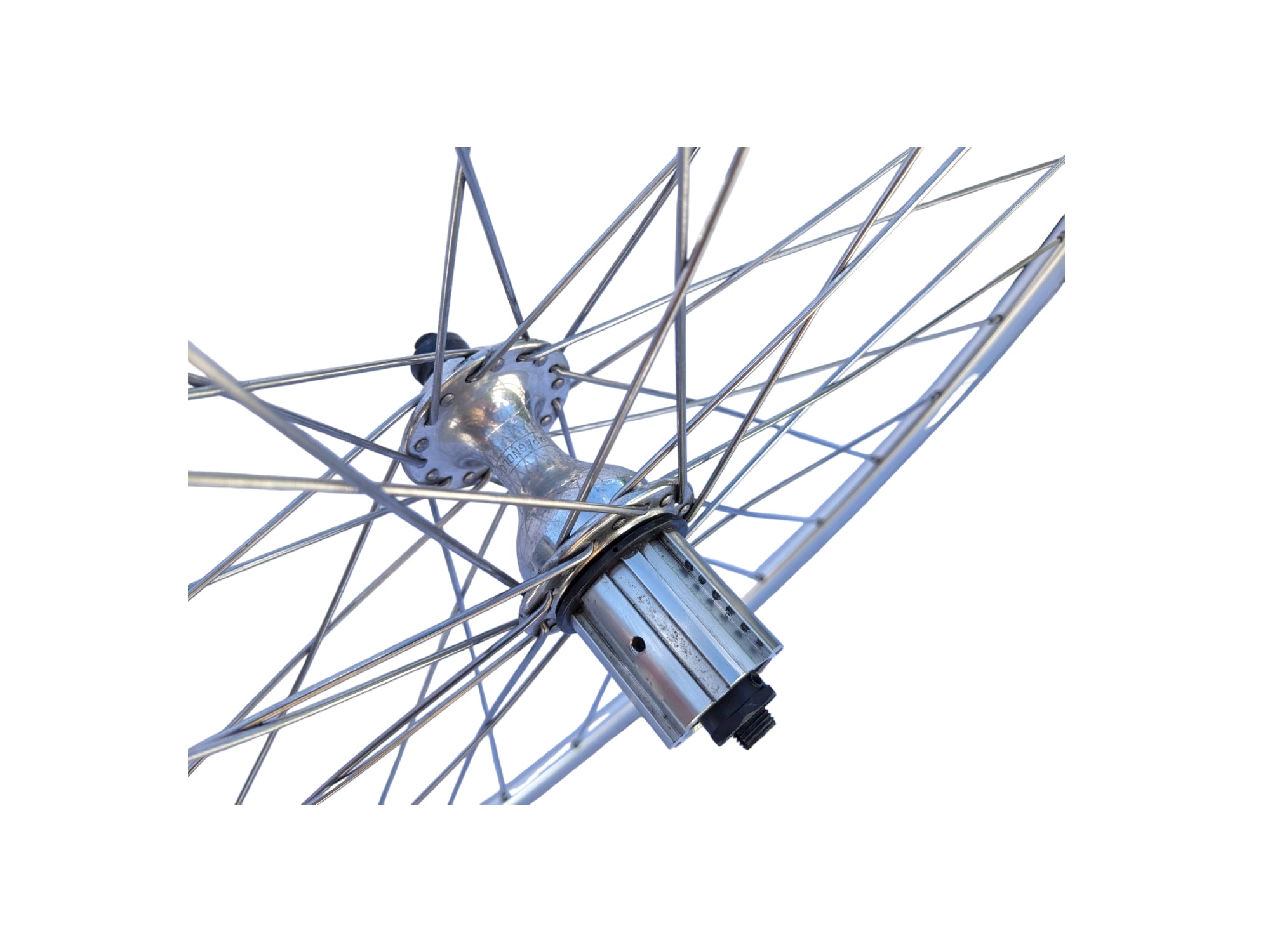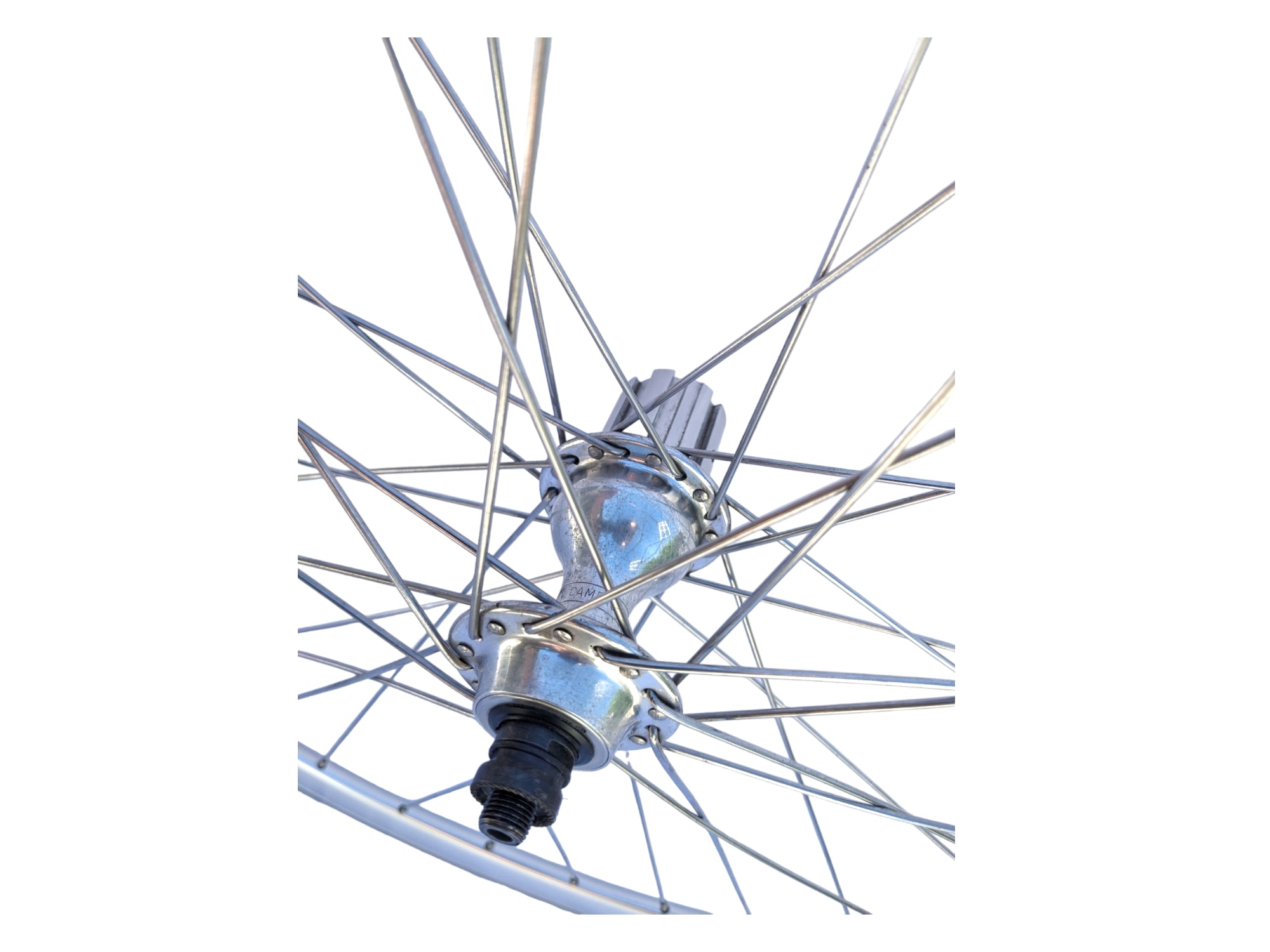 Rigida DP18 wheelset with Campagnolo hubs, 28″ clincher 622 mm, 100/130 mm spacing and 13/19 mm rim width. Fully functional — a French-Italian classic, perfect for authentic road restorations and steel frame projects.