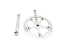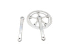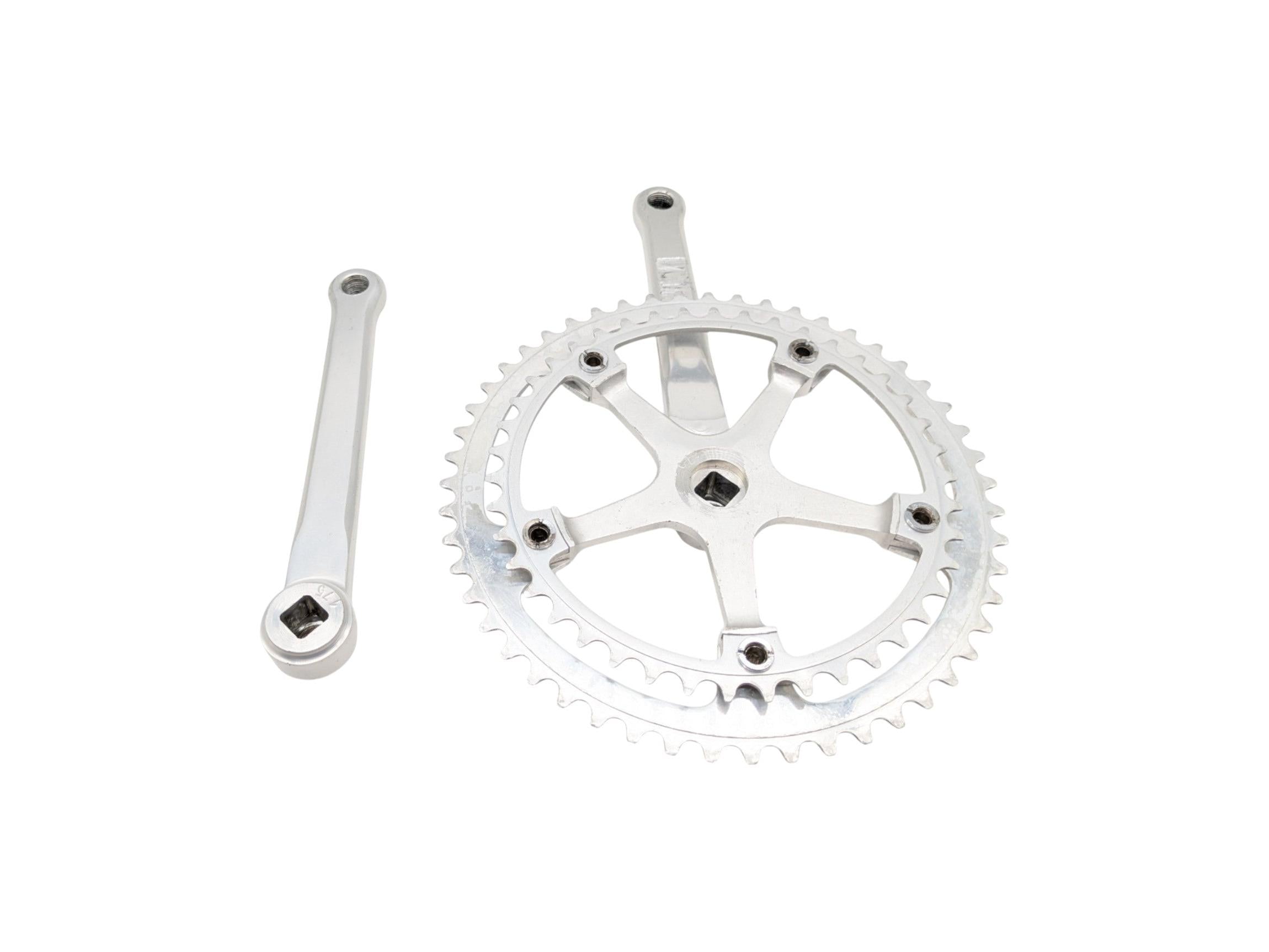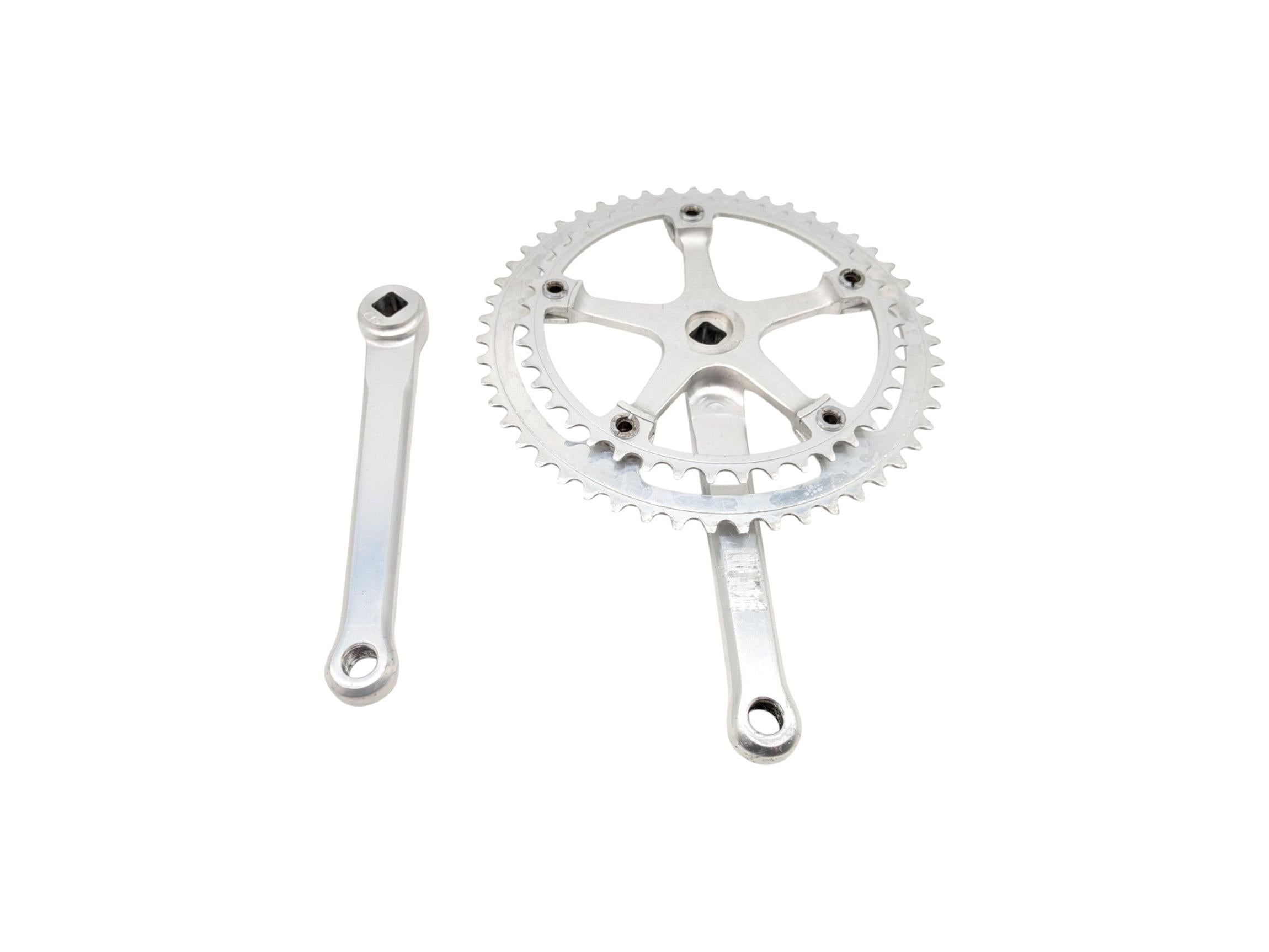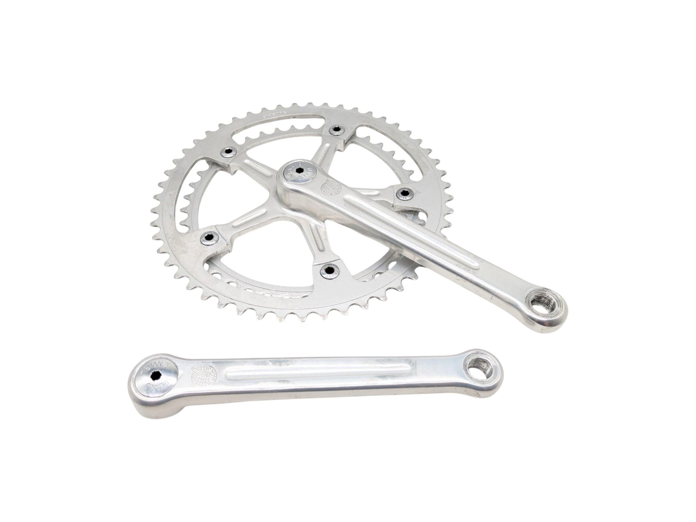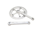Hochwertige französische Kurbelgarnitur, hergestellt von Spécialités TA unter dem Namen Tevano. Kompatibel mit 144 BCD-Kettenblättern und beliebt bei Liebhabern hochwertiger Vintage-Rennräder.
