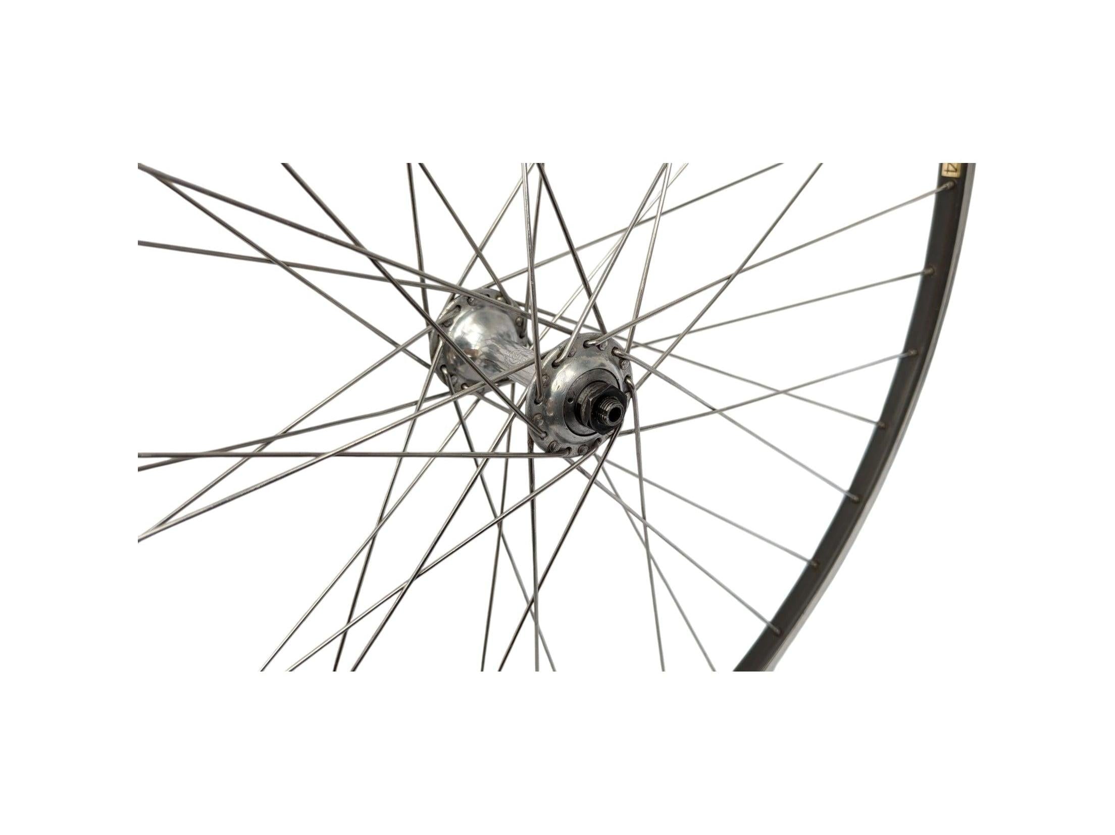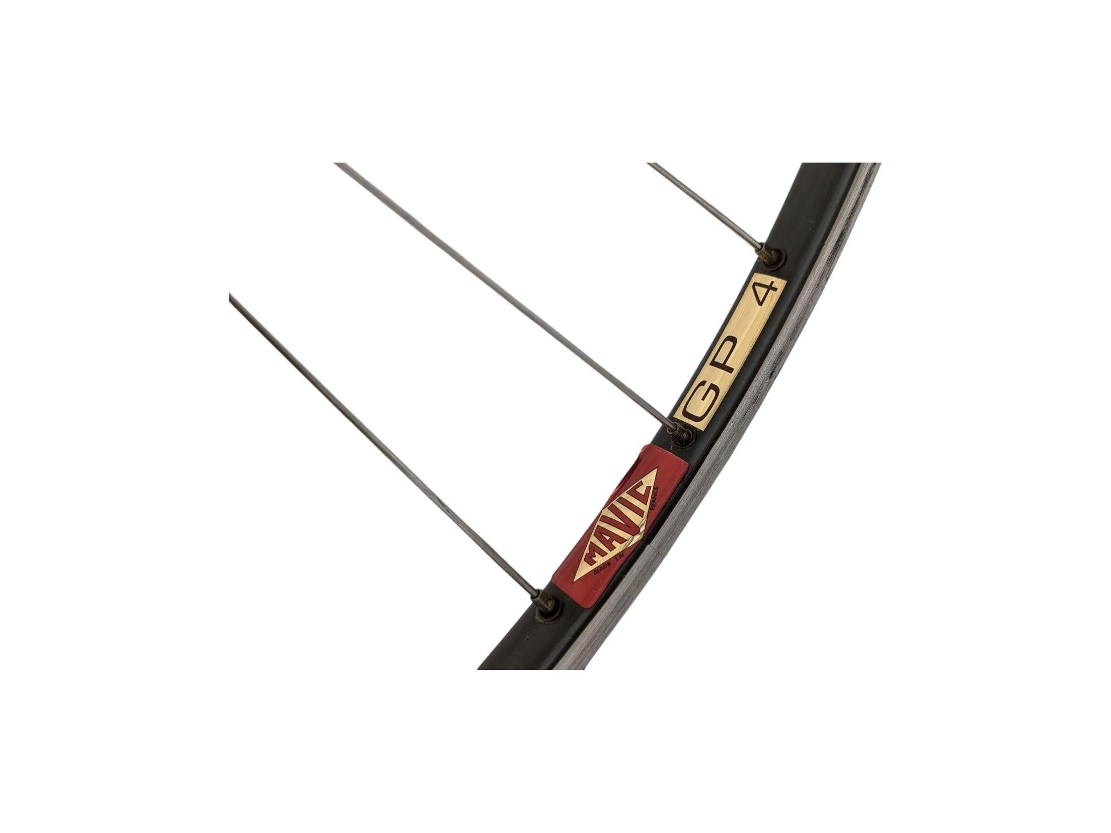 Mavic GP4-Vorderrad mit einer Campagnolo Nuovo Tipo-Nabe – ein klassisches röhrenförmiges Vorderrad im Rennstil für Konstruktionen aus der Eroica-Zeit.