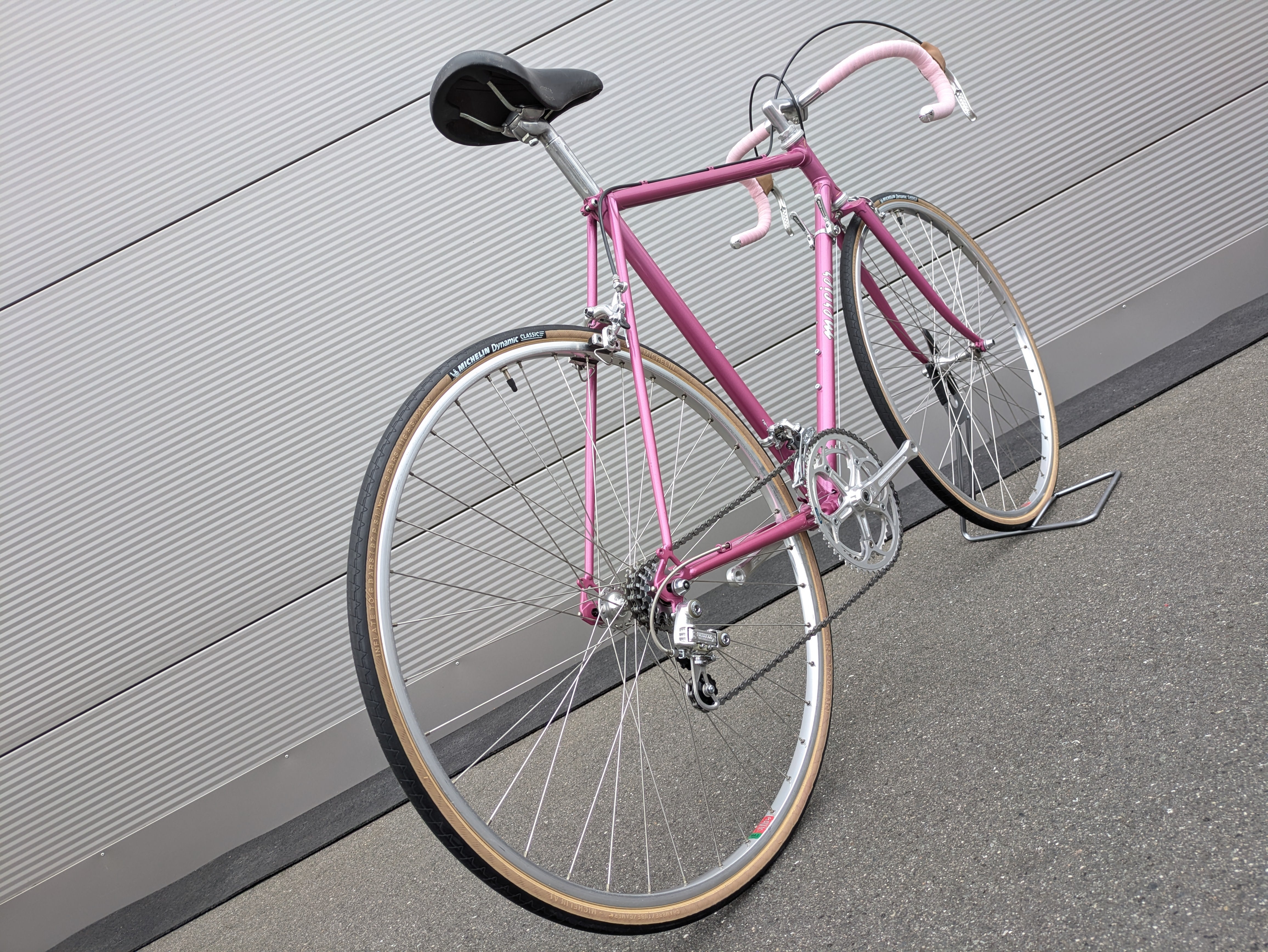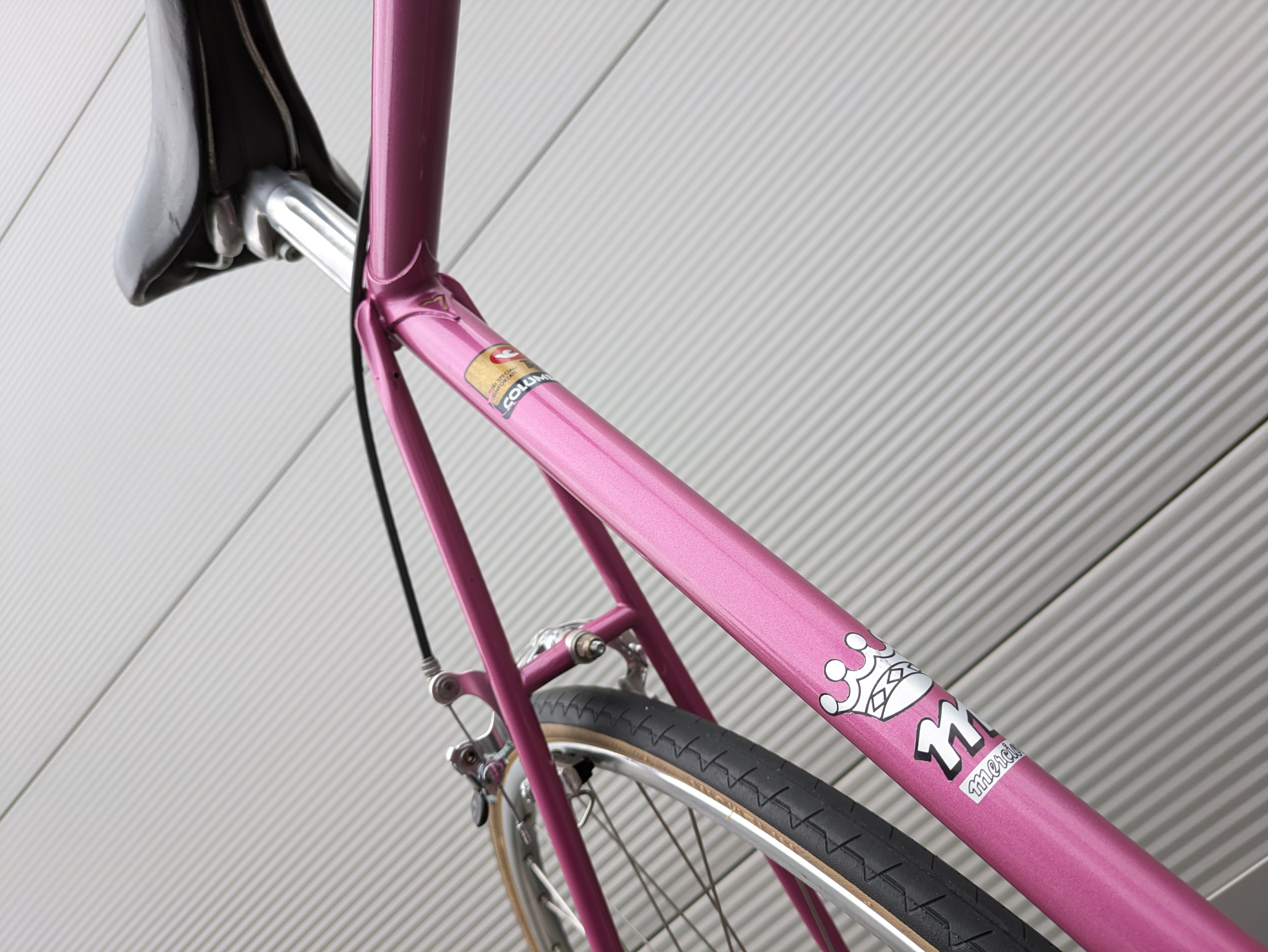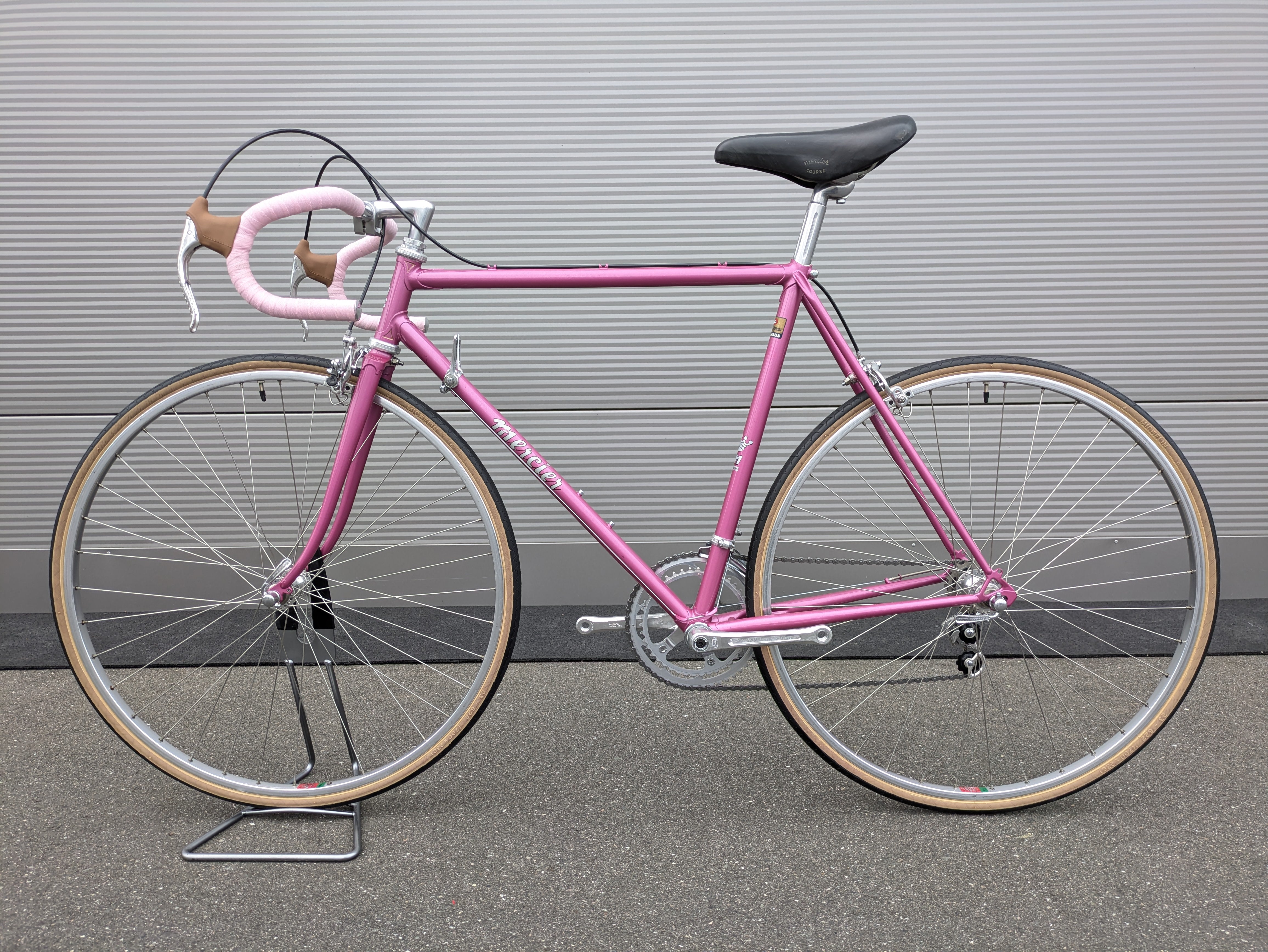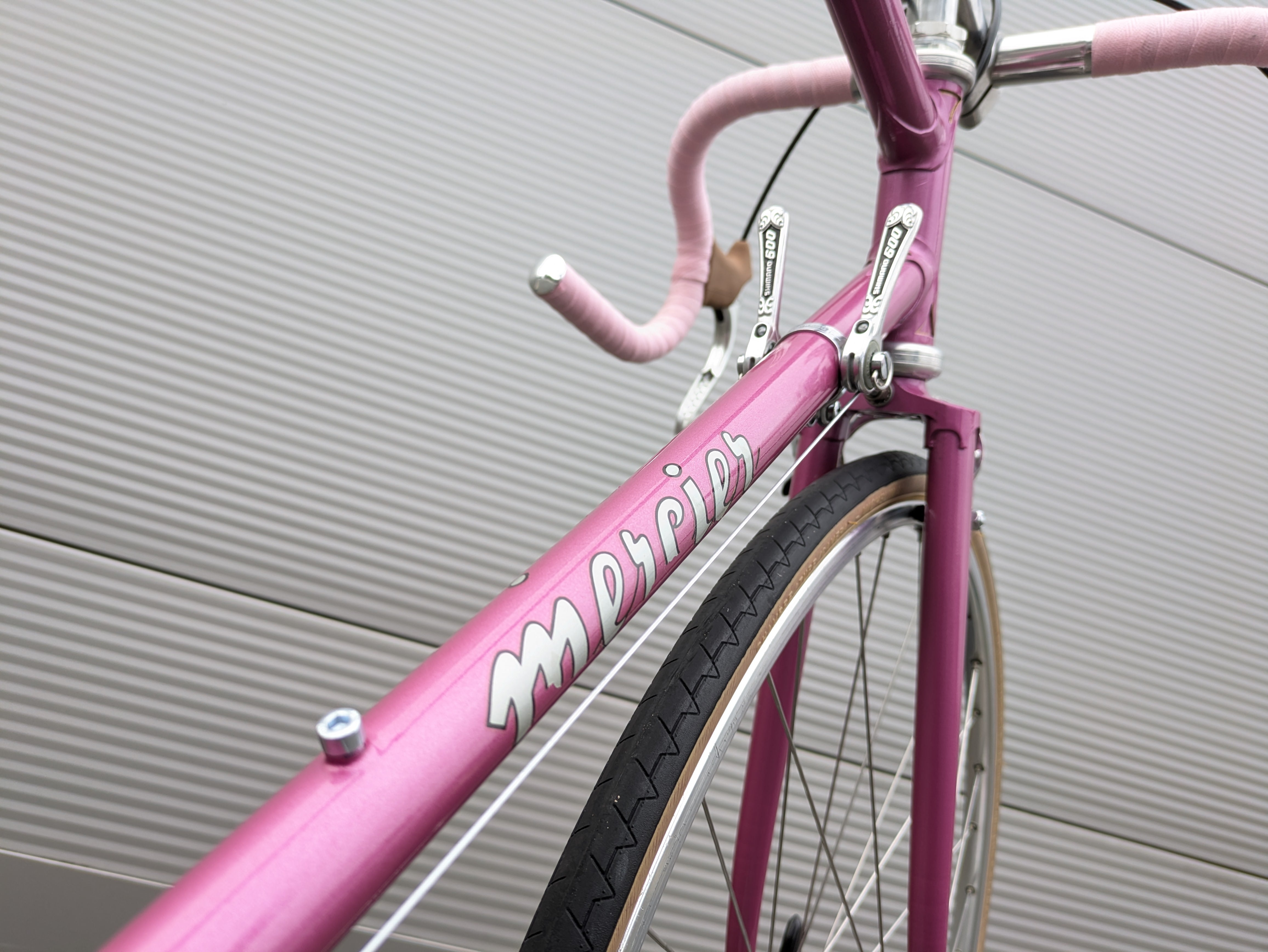Dieses Mercier aus den frühen 1980er-Jahren ist ein wunderschön erhaltenes Beispiel französischer Rahmenbaukunst. Der Rahmen besteht aus hochwertigem Columbus-Stahl, der für seine ideale Kombination aus Steifigkeit und Komfort bekannt ist, und trägt den originalen rosafarbenen Lack – elegant, klassisch und typisch Mercier. Die klaren Linien und die feinen Übergänge der Muffen spiegeln die präzise Handarbeit wider, für die Mercier berühmt war.