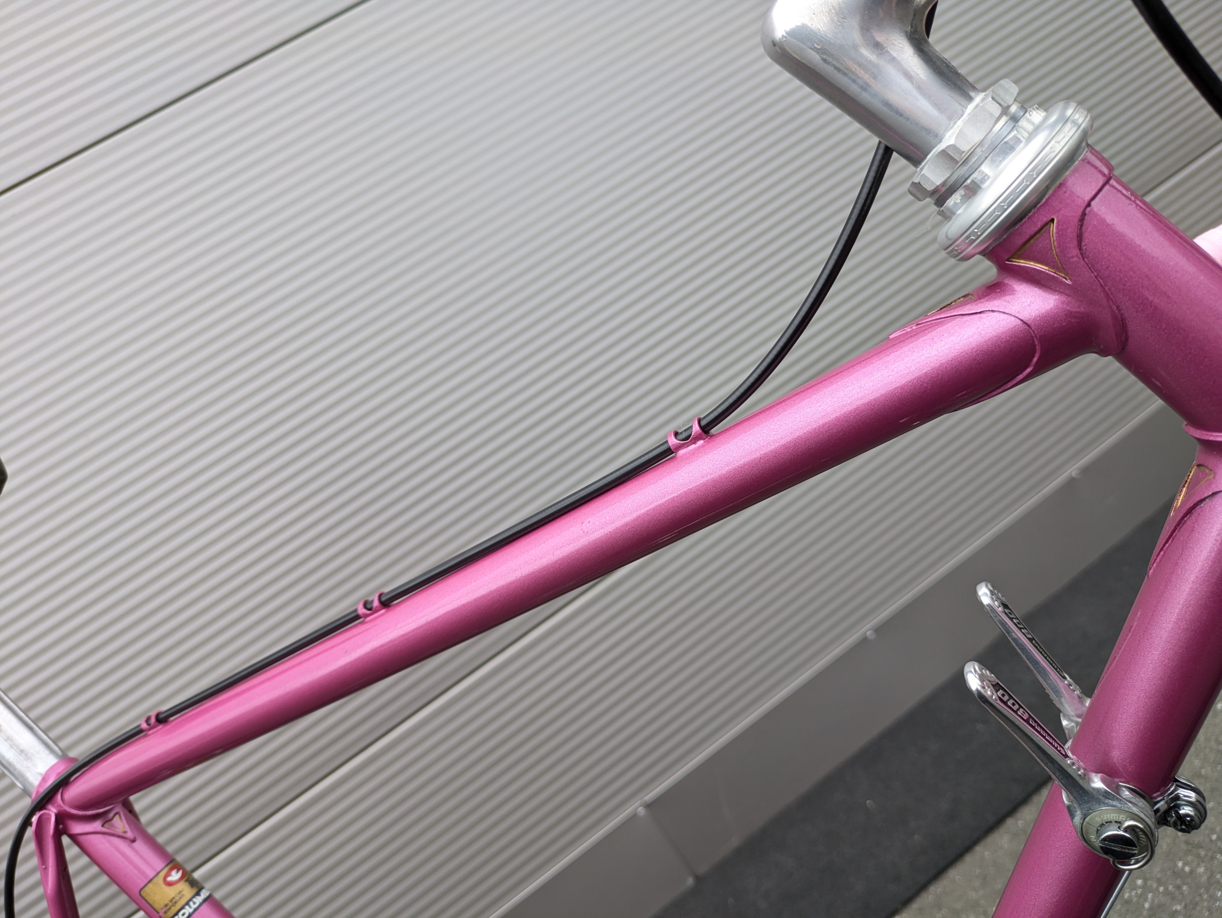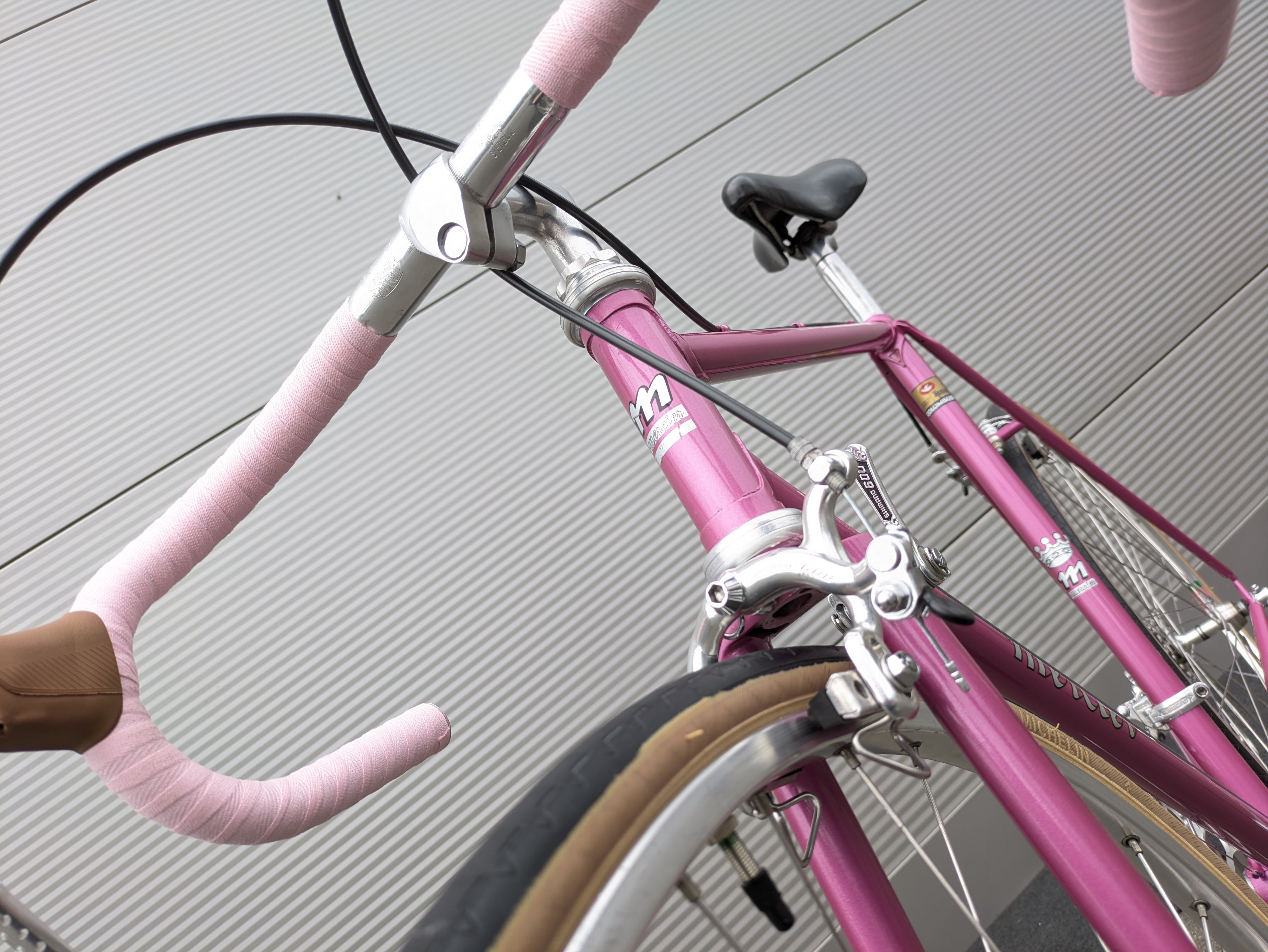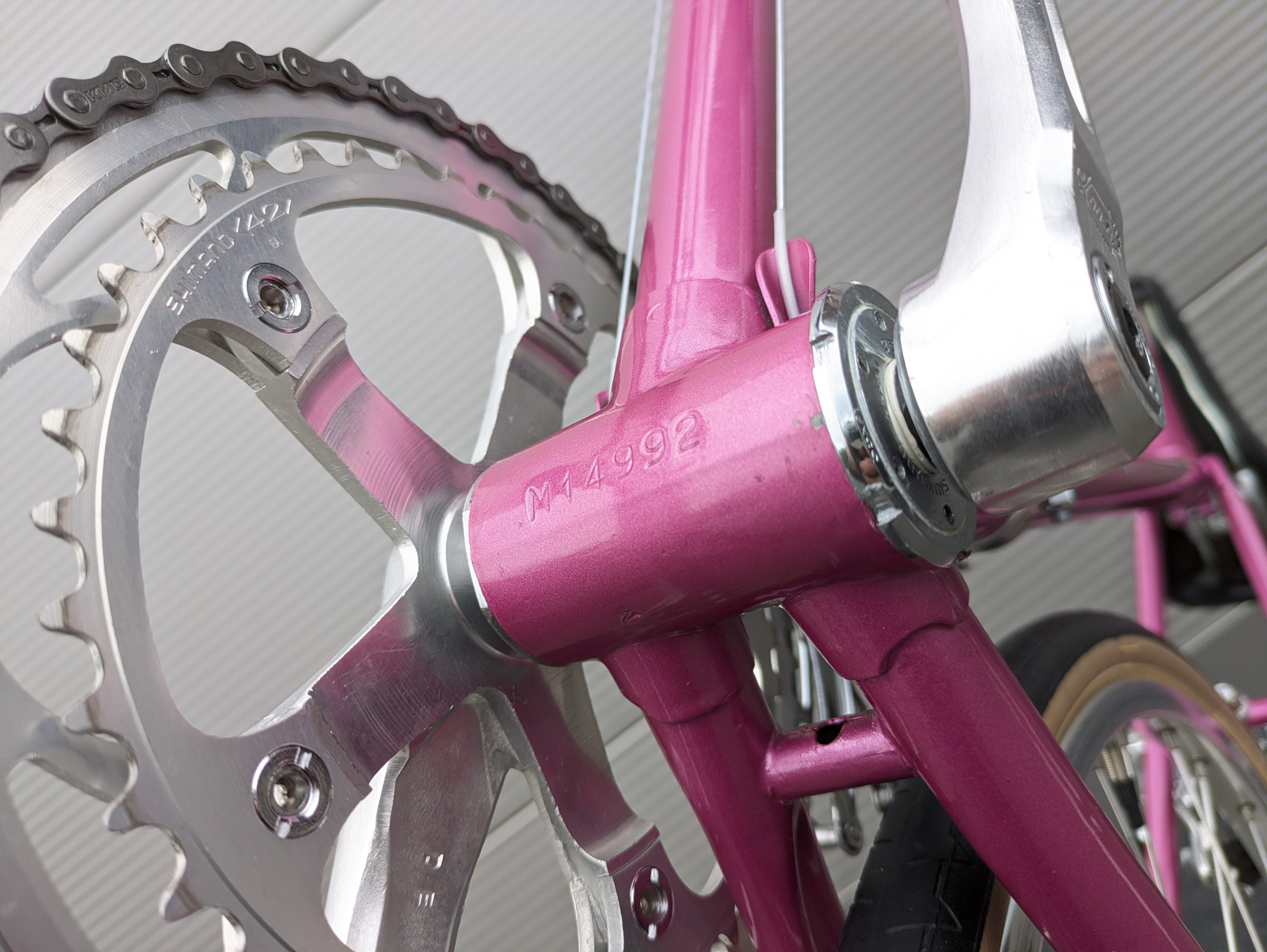 Dieses Mercier aus den frühen 1980er-Jahren ist ein wunderschön erhaltenes Beispiel französischer Rahmenbaukunst. Der Rahmen besteht aus hochwertigem Columbus-Stahl, der für seine ideale Kombination aus Steifigkeit und Komfort bekannt ist, und trägt den originalen rosafarbenen Lack – elegant, klassisch und typisch Mercier. Die klaren Linien und die feinen Übergänge der Muffen spiegeln die präzise Handarbeit wider, für die Mercier berühmt war.