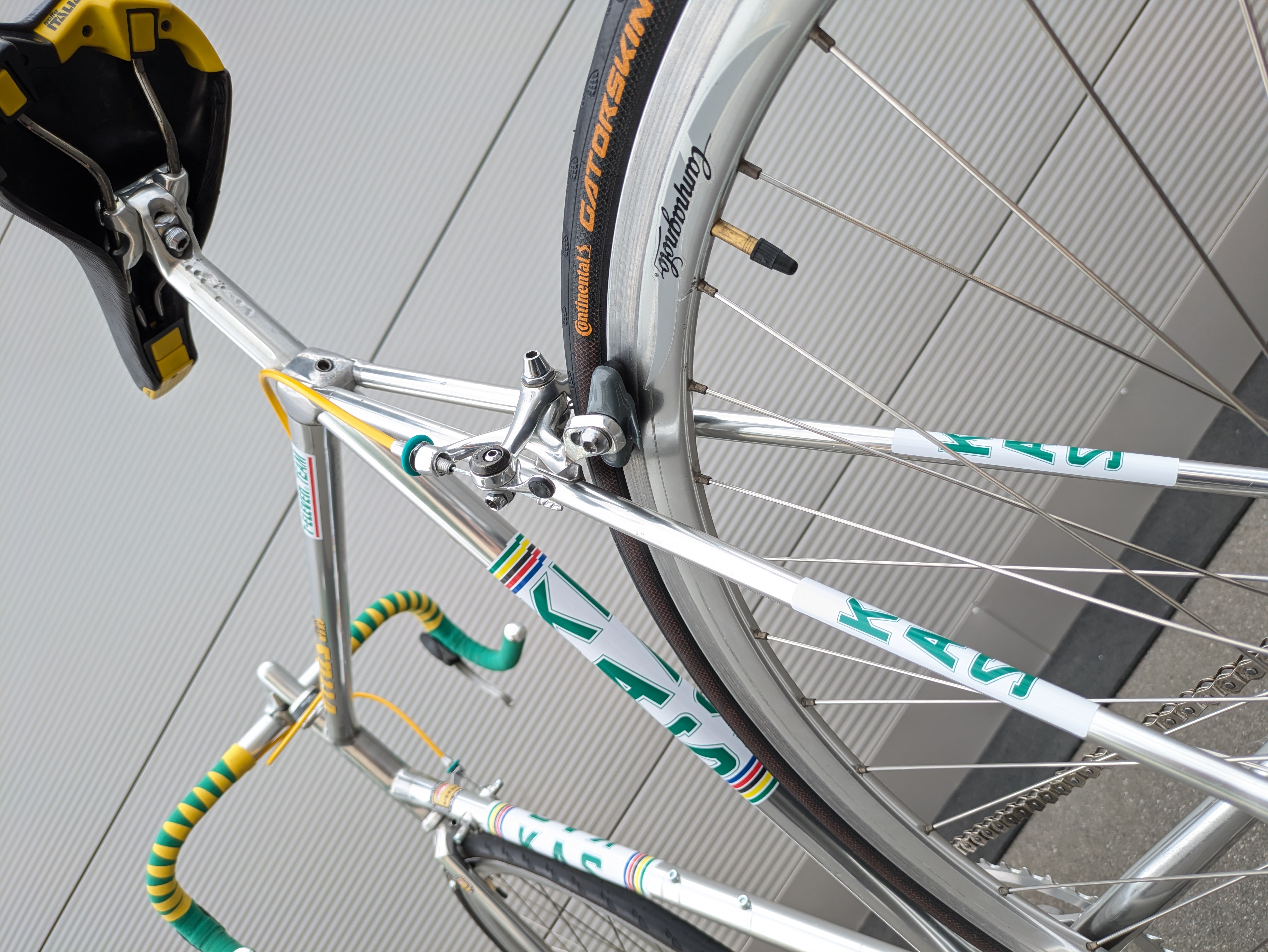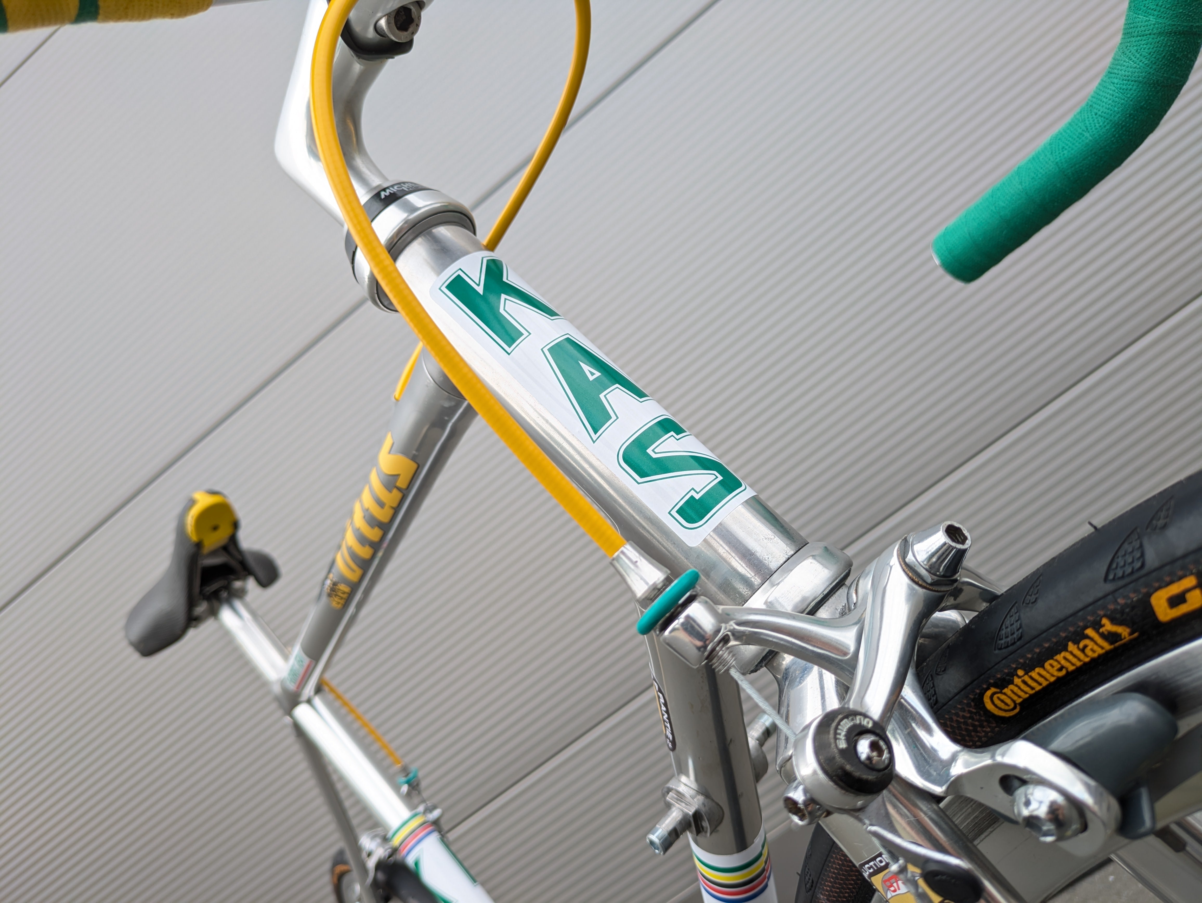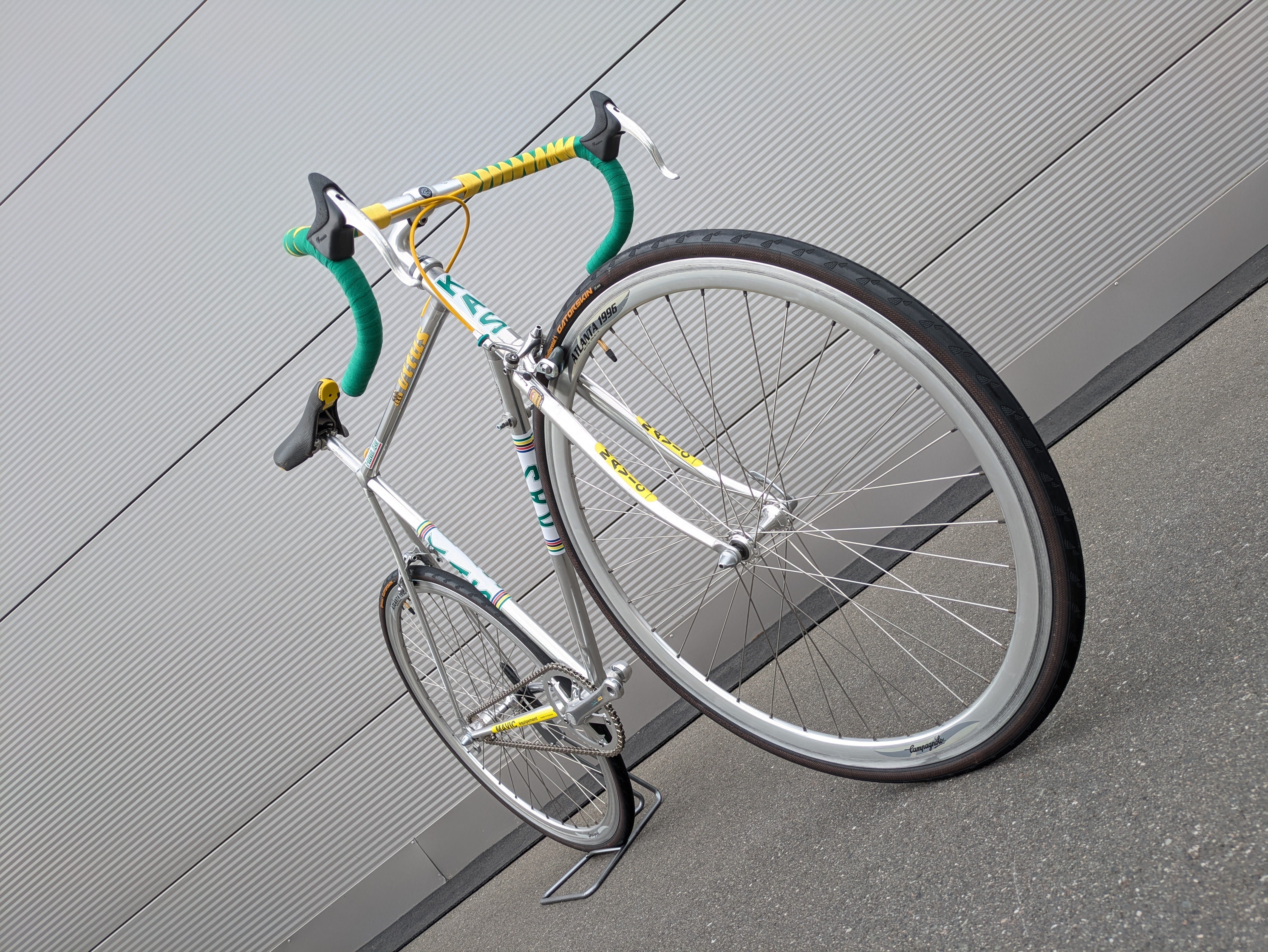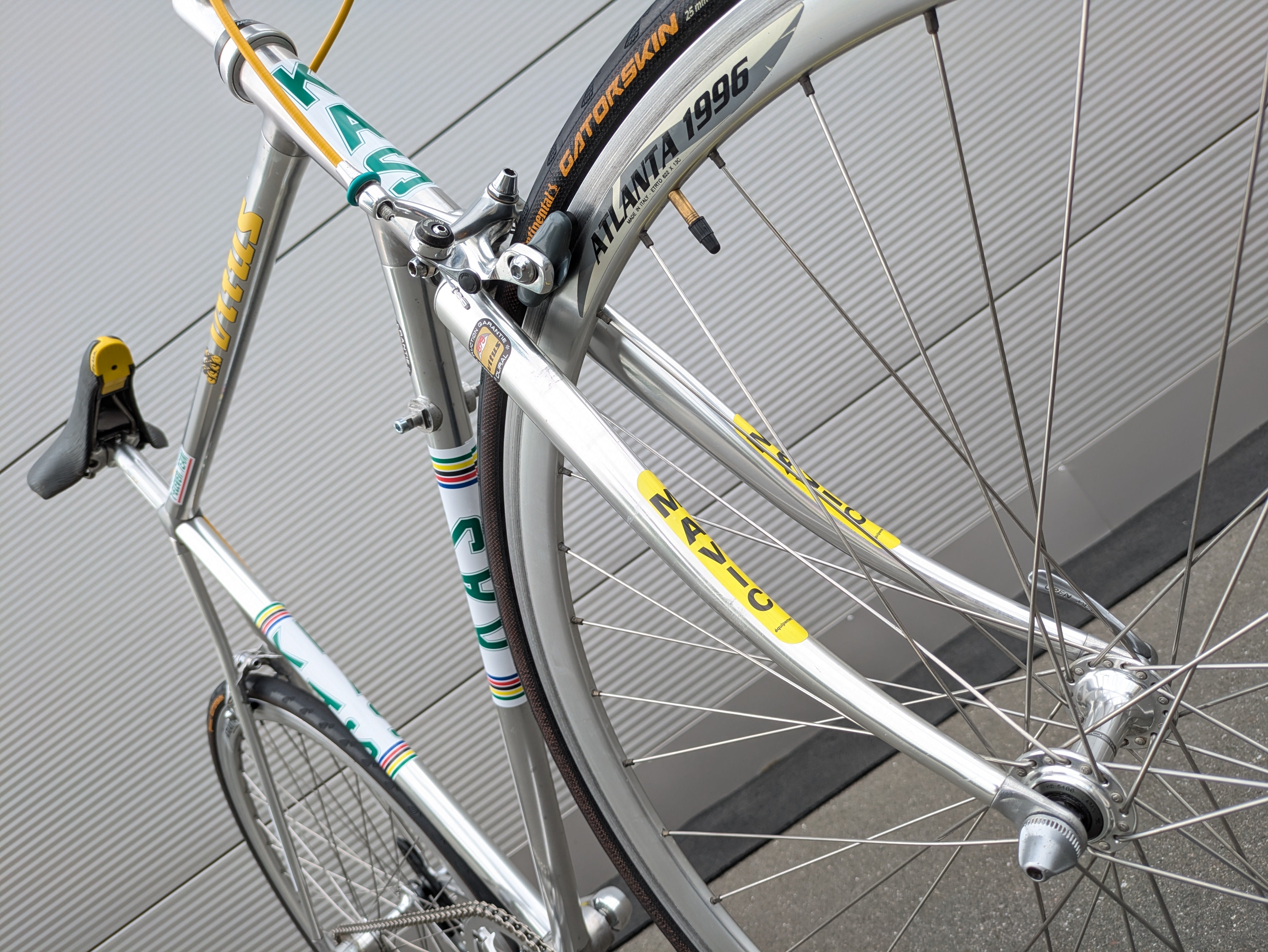 Los componentes Shimano Dura-Ace de alta calidad fueron cuidadosamente seleccionados por su precisión, fiabilidad y rendimiento, complementando a la perfección el cuadro tanto estética como funcionalmente. La bicicleta se completa con un juego de llantas Campagnolo Atlanta 1996, que realzan su aspecto clásico de bicicleta de carreras. Esta bicicleta es un homenaje a la época del equipo KAS, combinando un diseño icónico con una manejabilidad moderna.