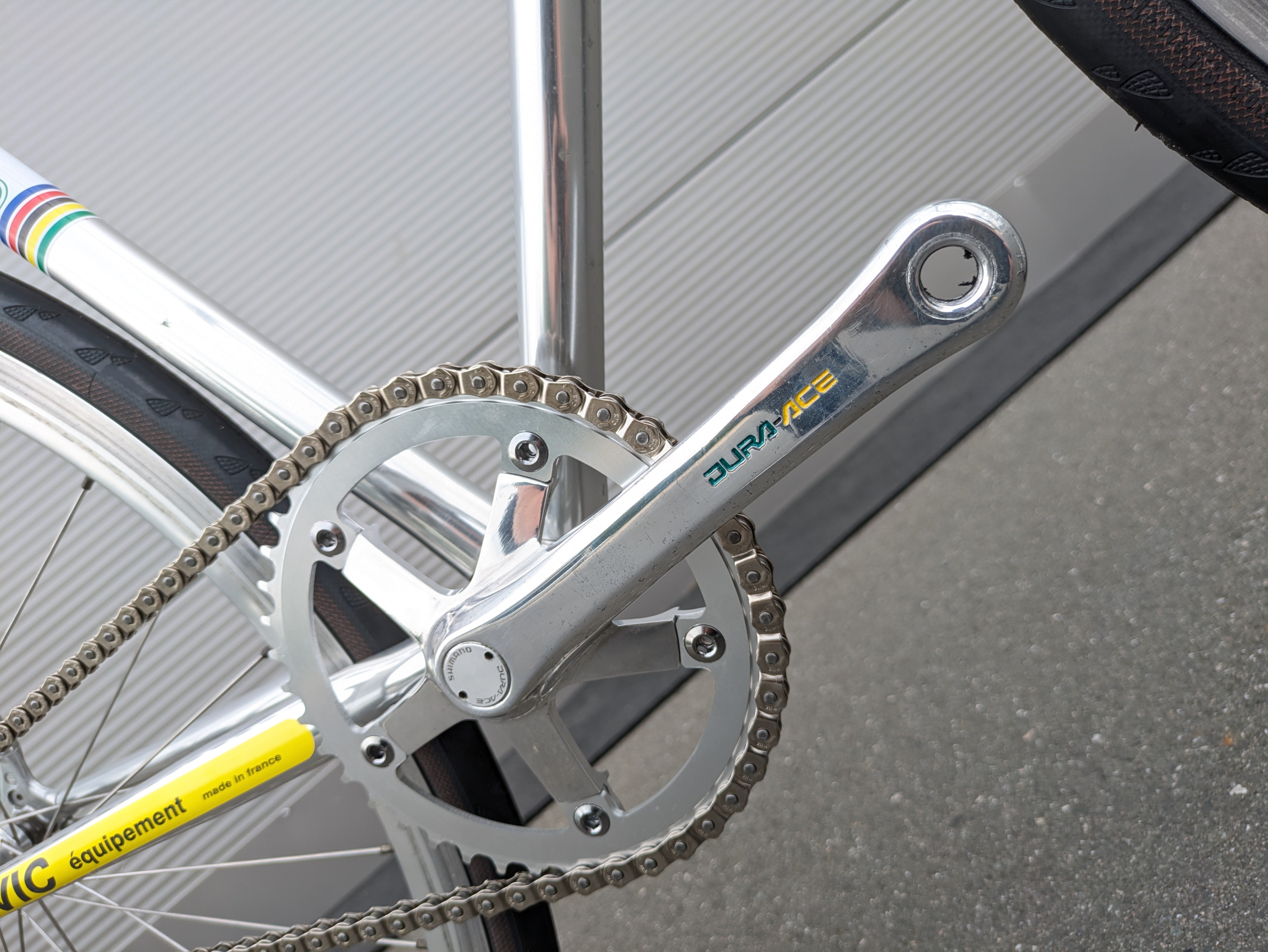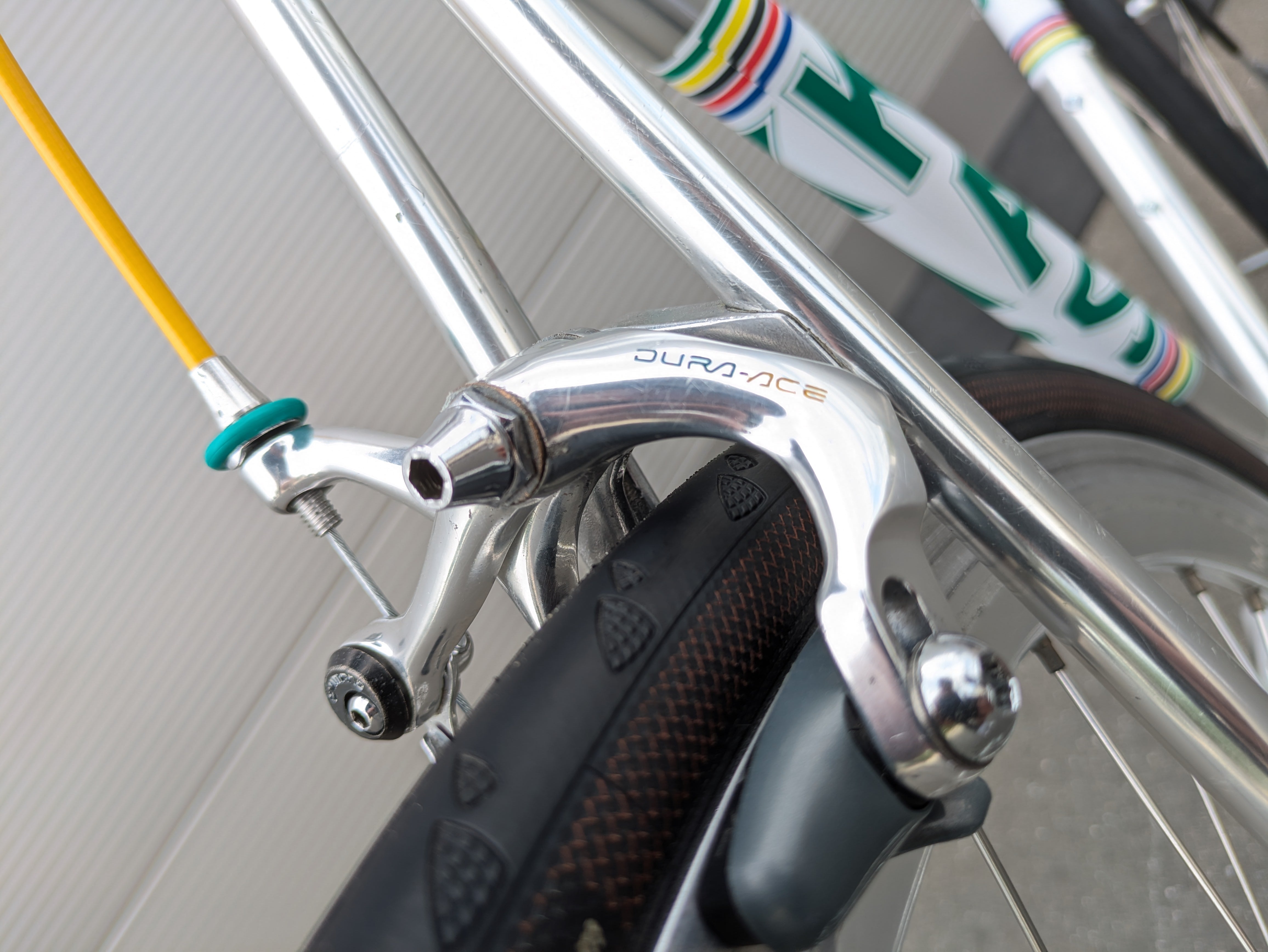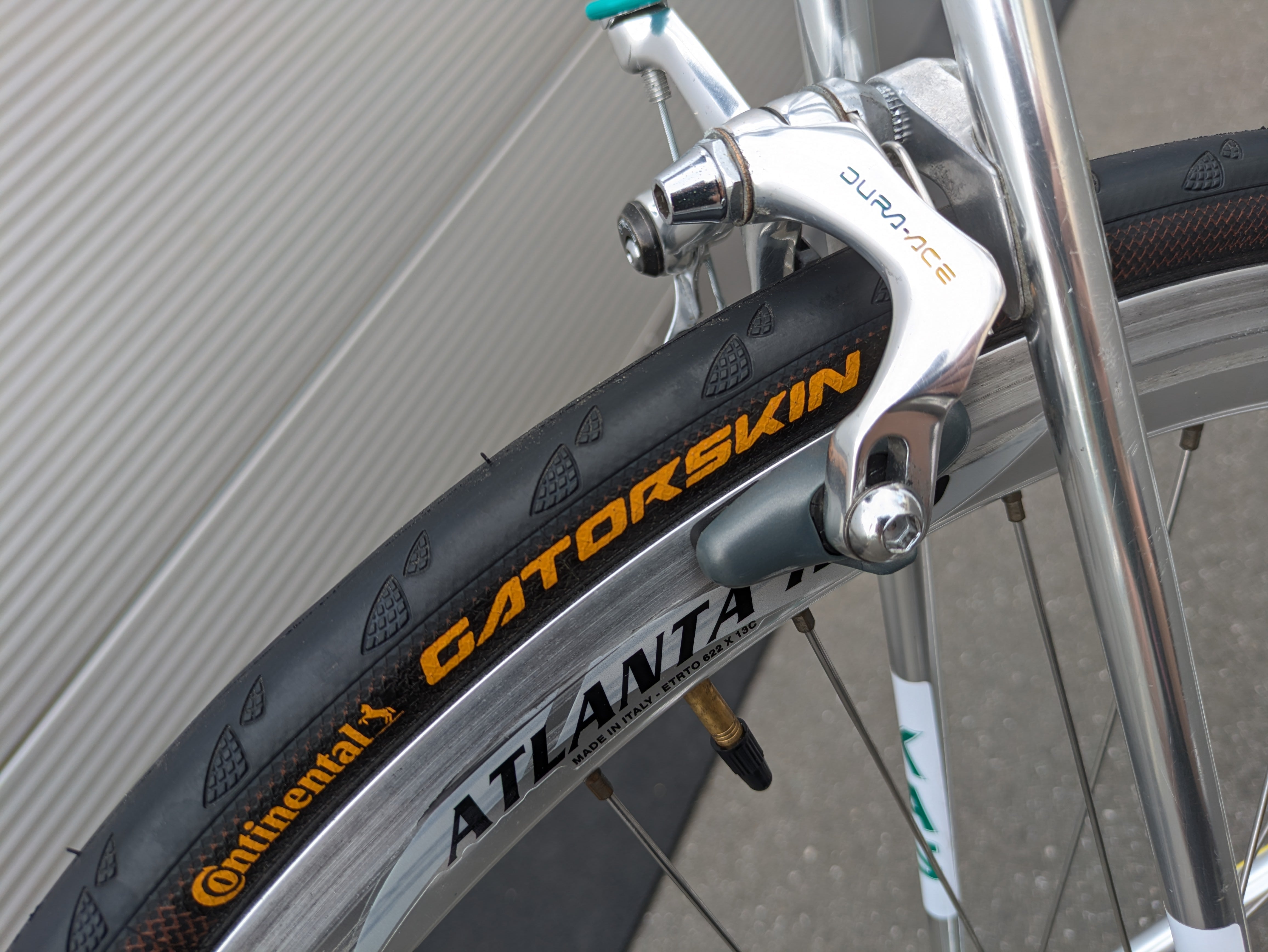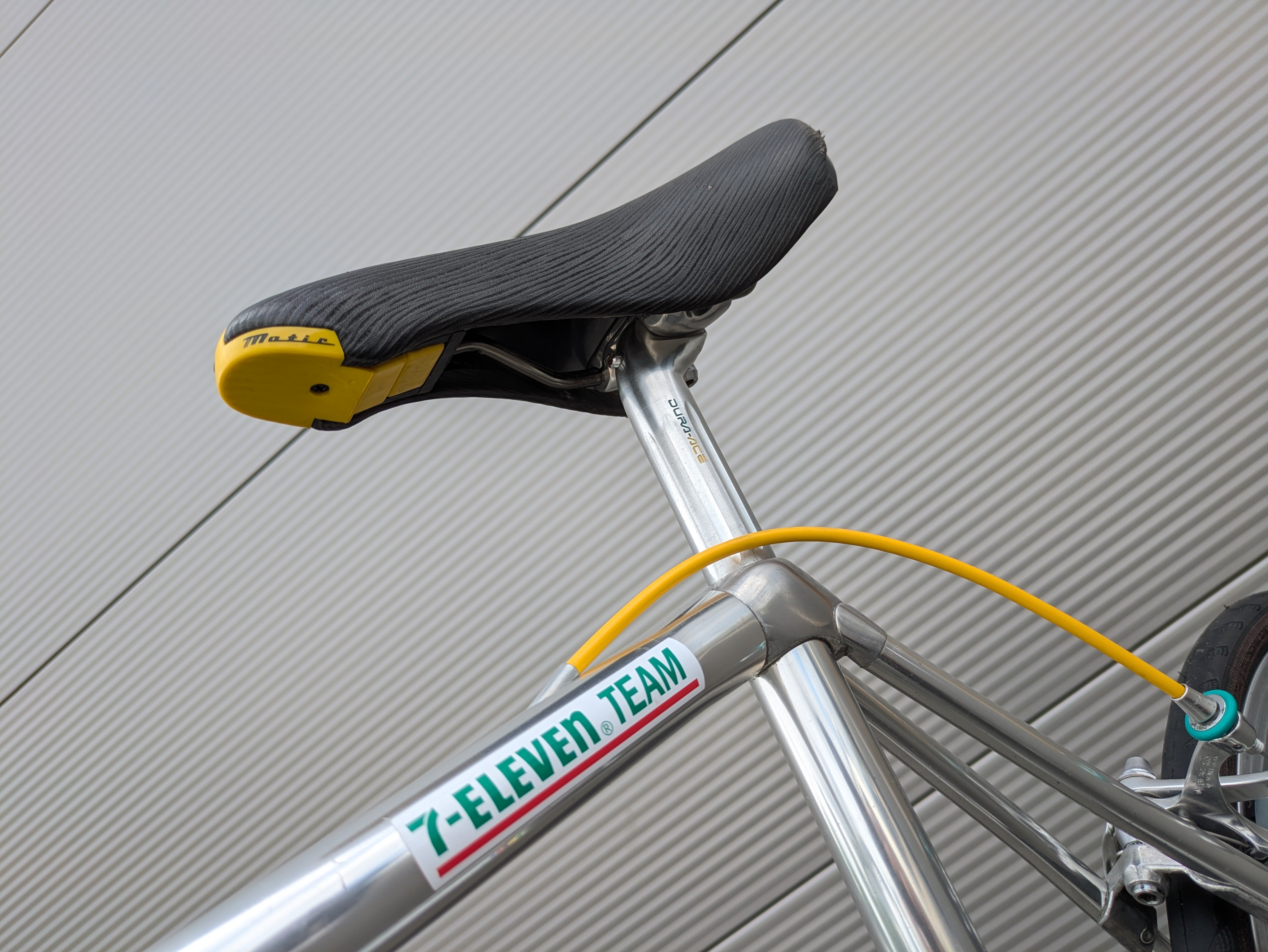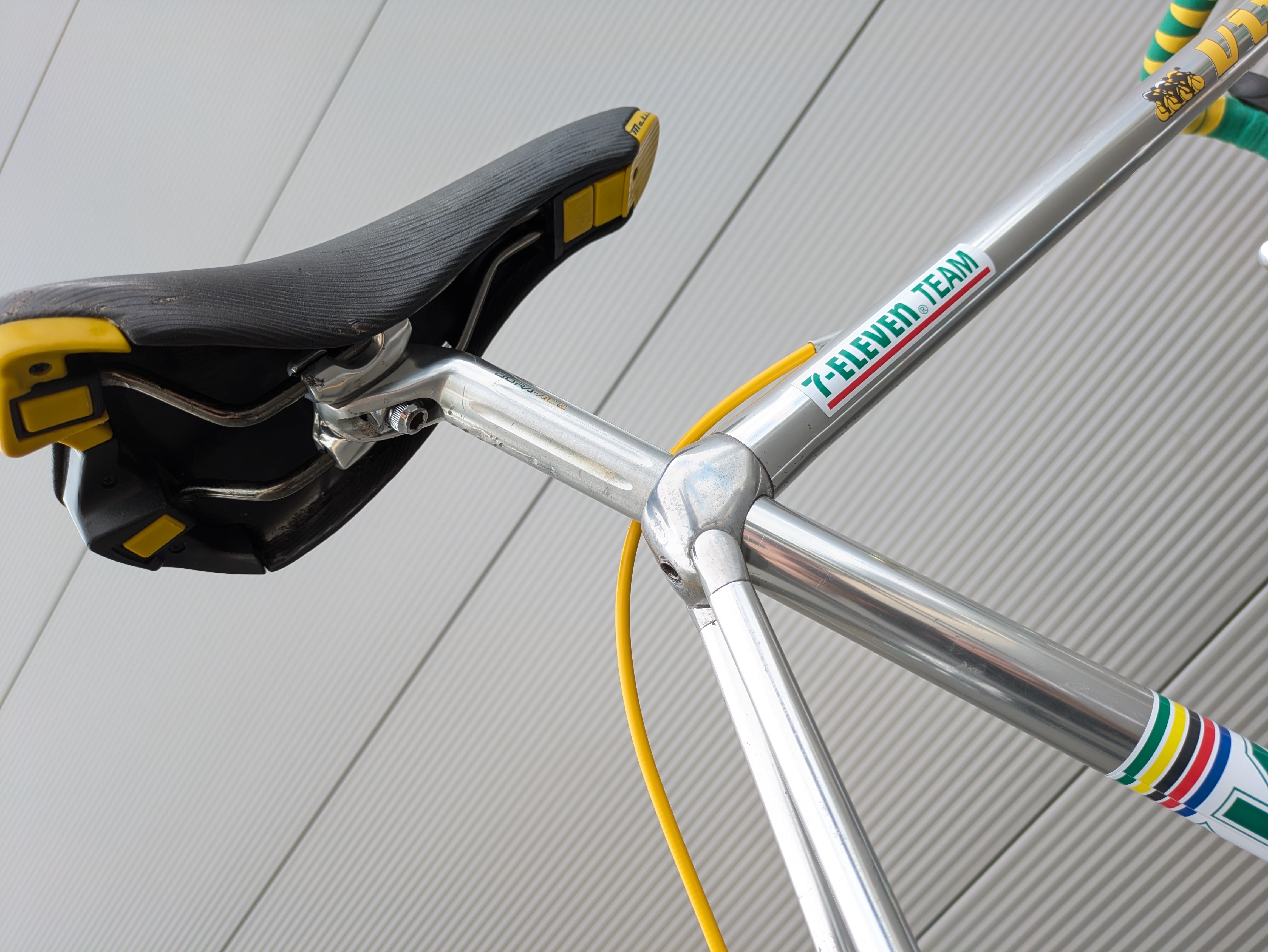 Los componentes Shimano Dura-Ace de alta calidad fueron cuidadosamente seleccionados por su precisión, fiabilidad y rendimiento, complementando a la perfección el cuadro tanto estética como funcionalmente. La bicicleta se completa con un juego de llantas Campagnolo Atlanta 1996, que realzan su aspecto clásico de bicicleta de carreras. Esta bicicleta es un homenaje a la época del equipo KAS, combinando un diseño icónico con una manejabilidad moderna.