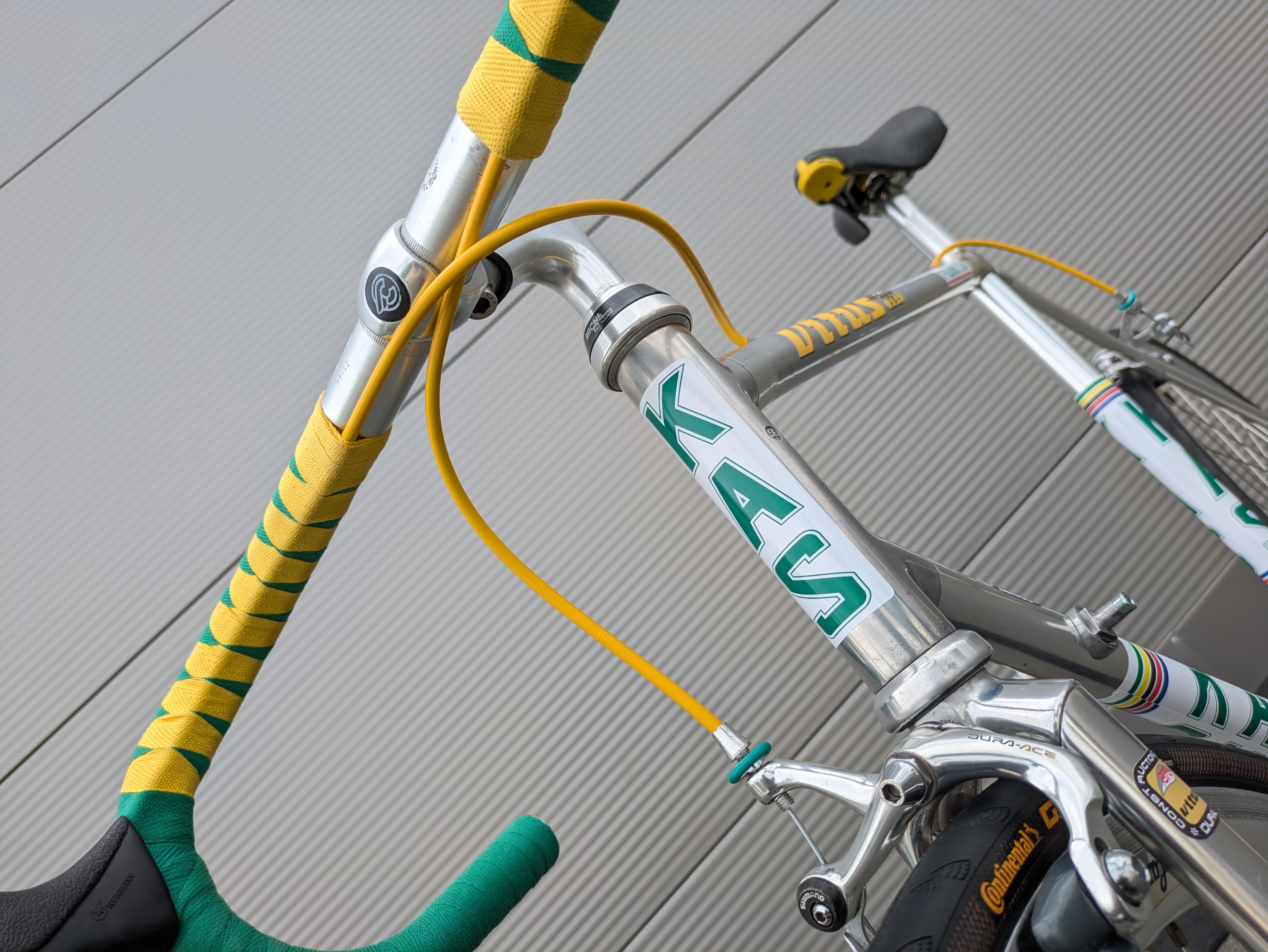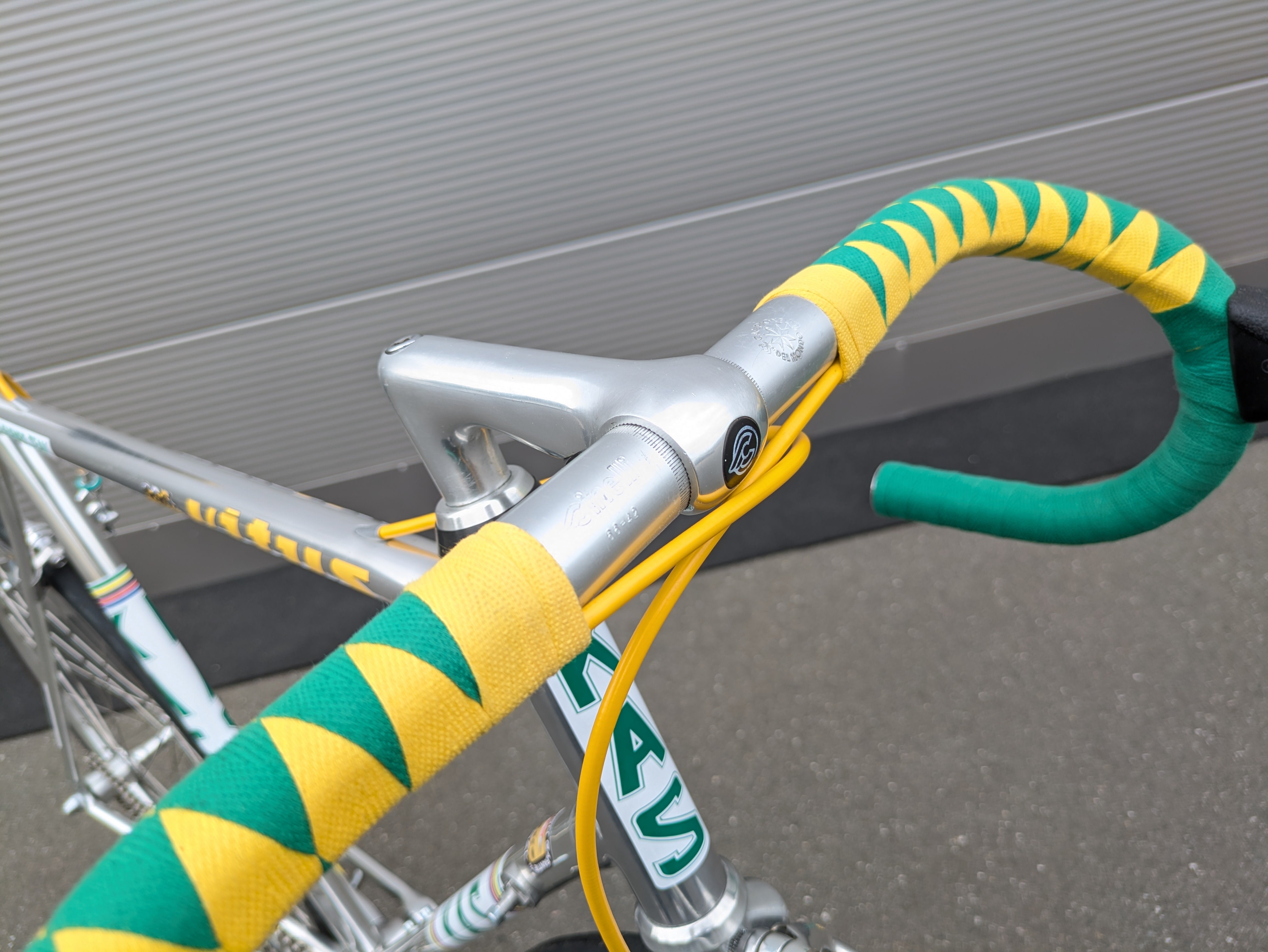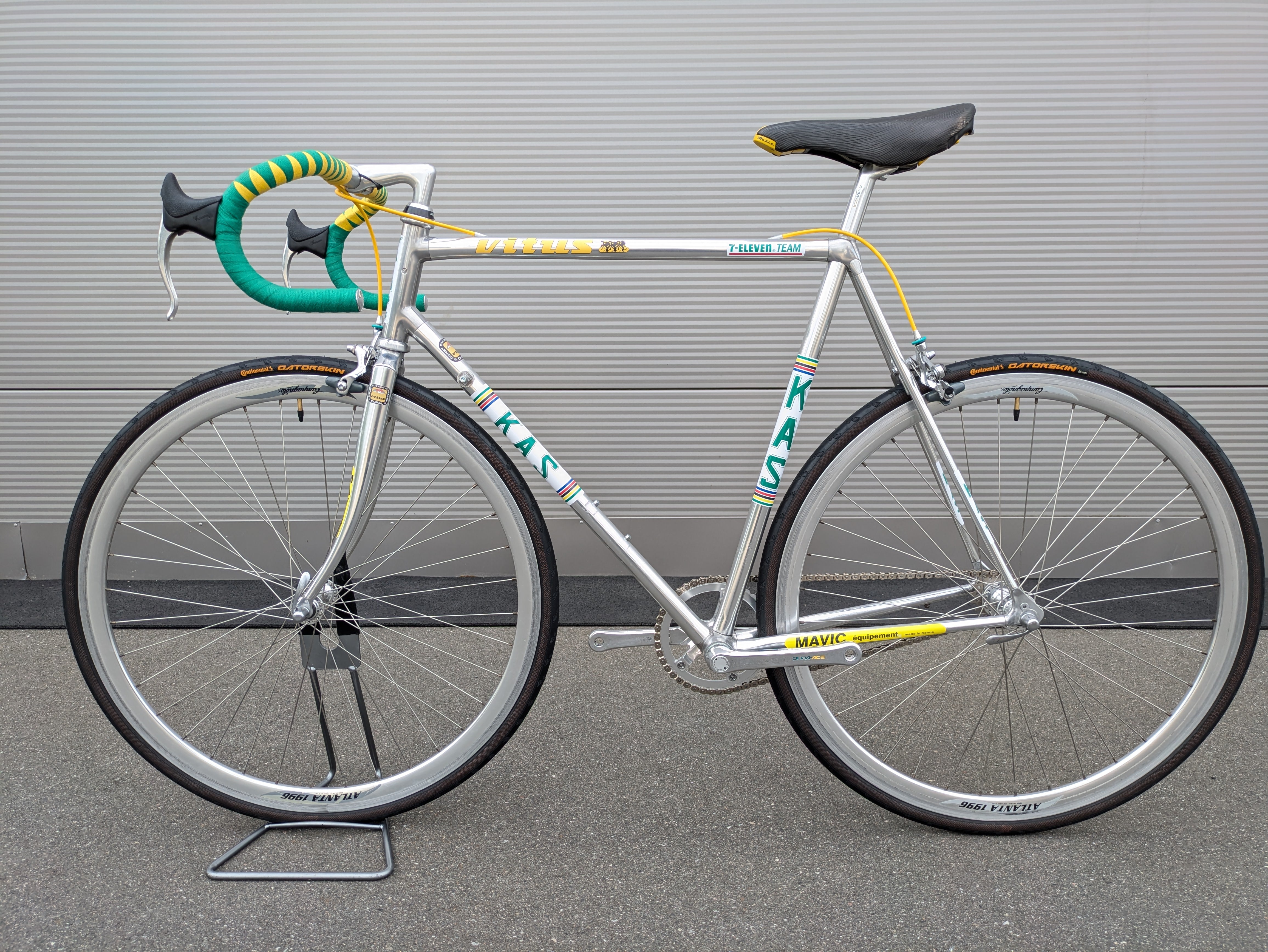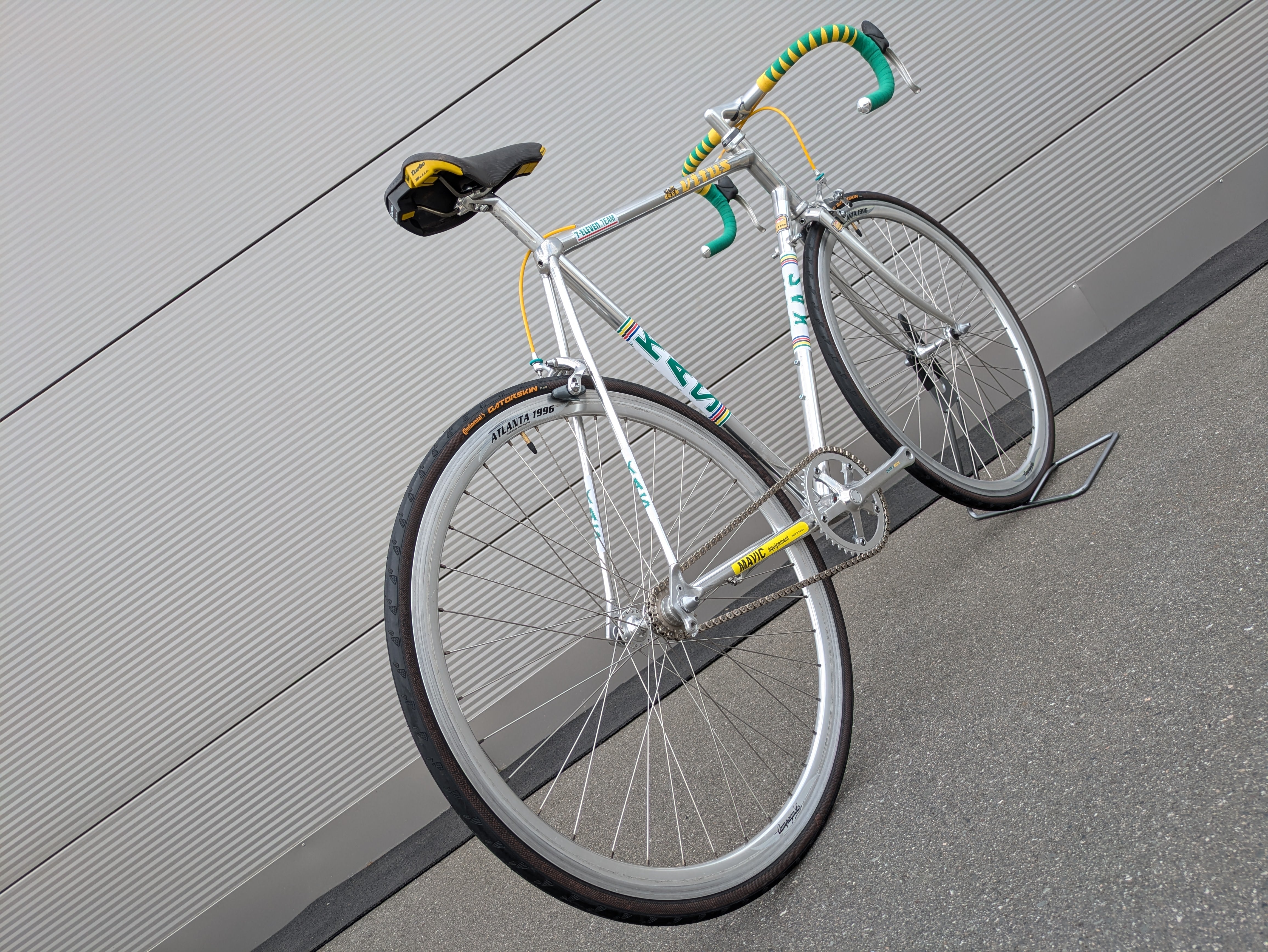 Esta bicicleta de una sola velocidad está construida sobre el legendario cuadro Vitus 979 y ensamblada con esmero y atención al detalle, al estilo del equipo KAS. Las distintivas calcomanías KAS se aplicaron posteriormente, convirtiendo la bicicleta en una réplica fiel del estilo KAS. Cuenta con un manillar de carretera clásico, envuelto en una cinta verde y amarilla estilo Harlequin, un diseño visualmente impactante que requiere una artesanía experta.