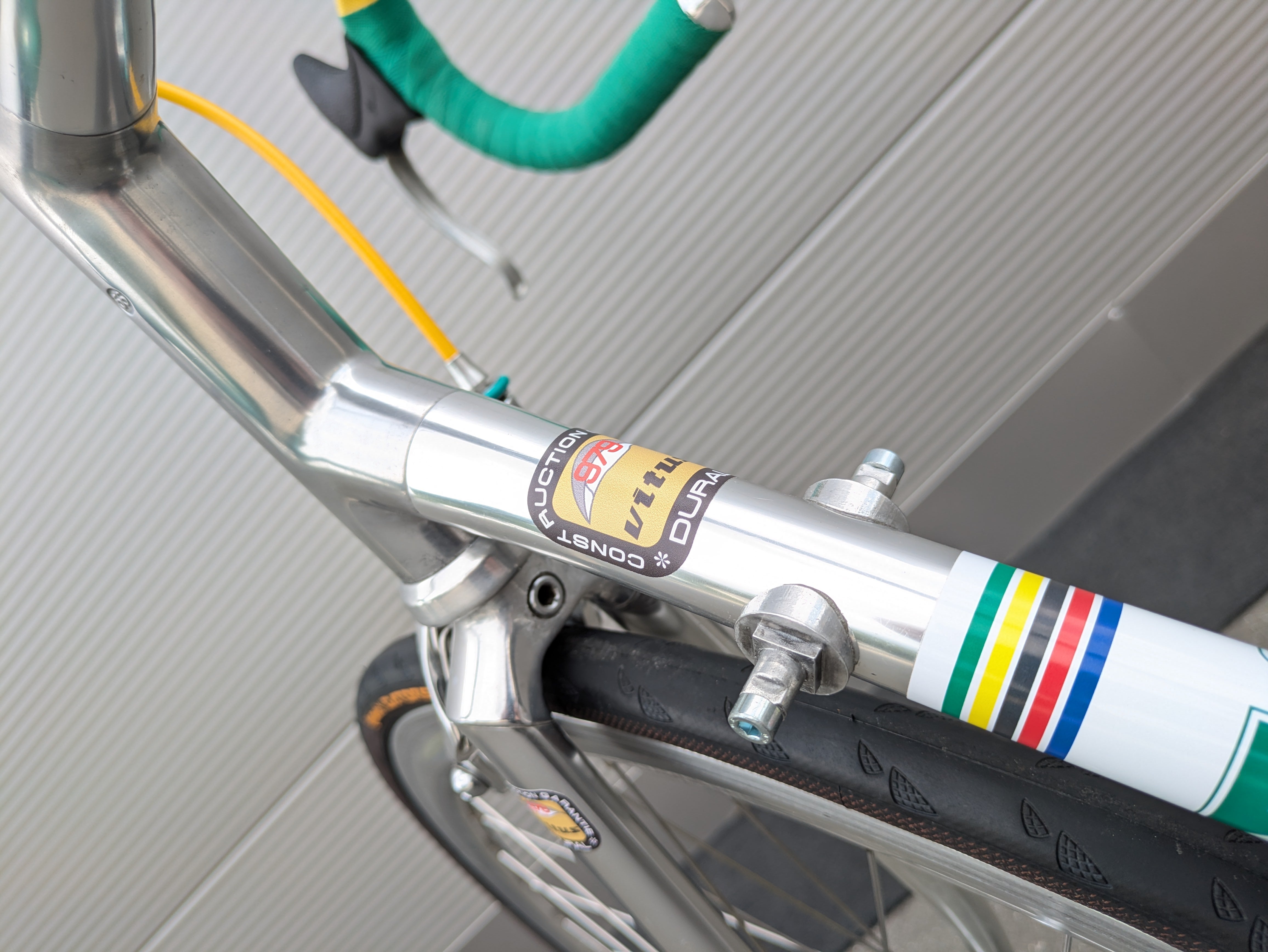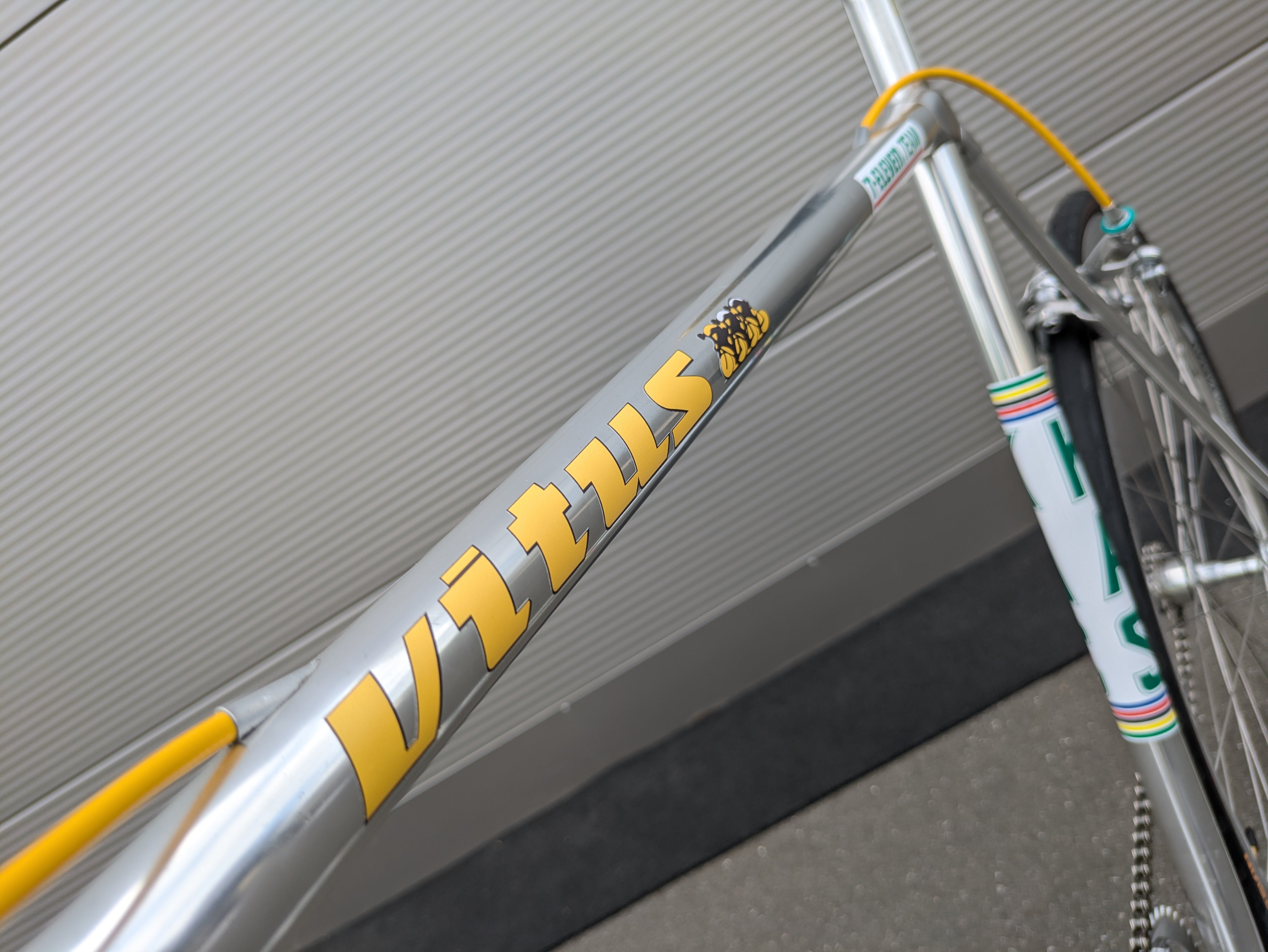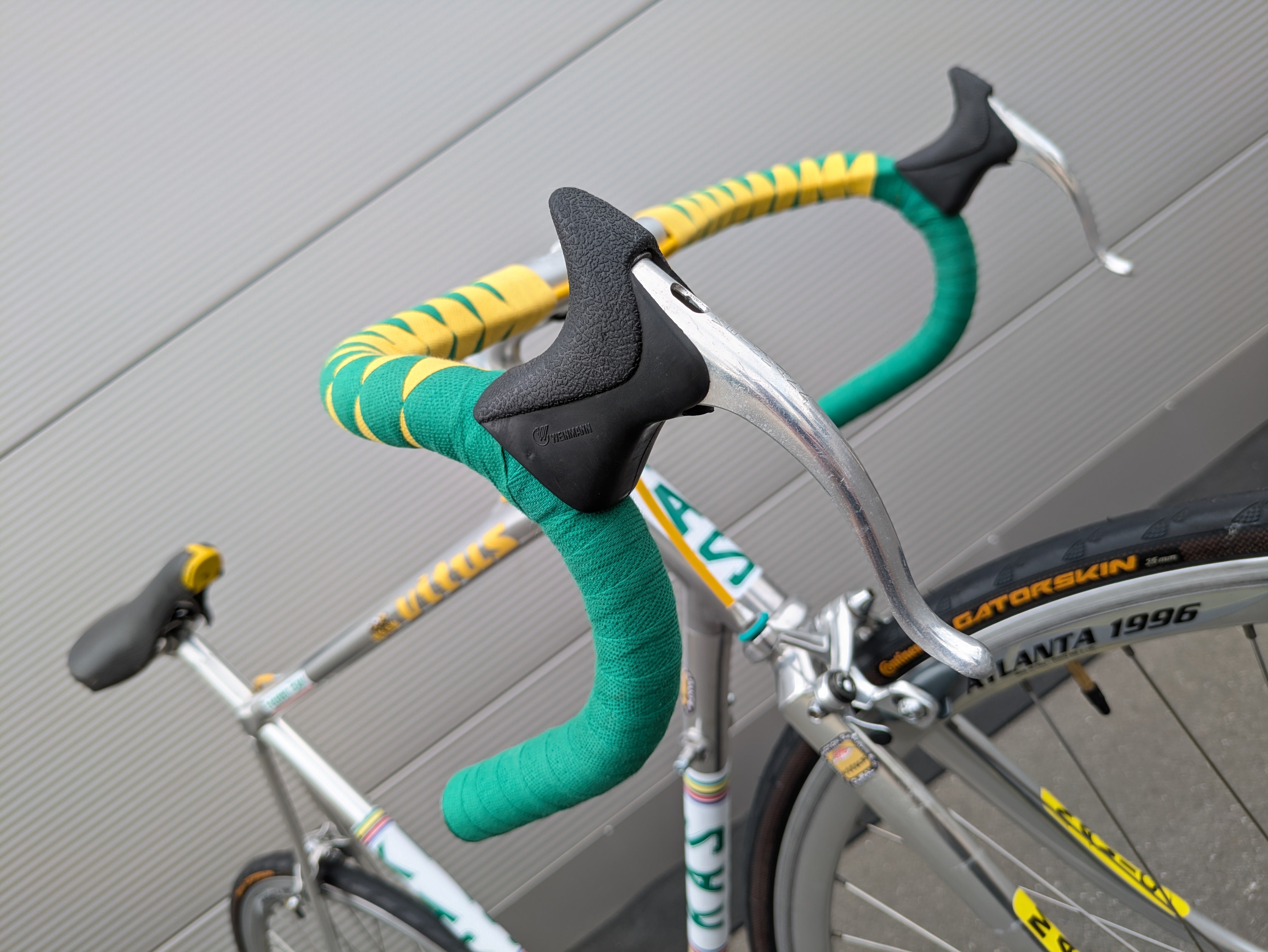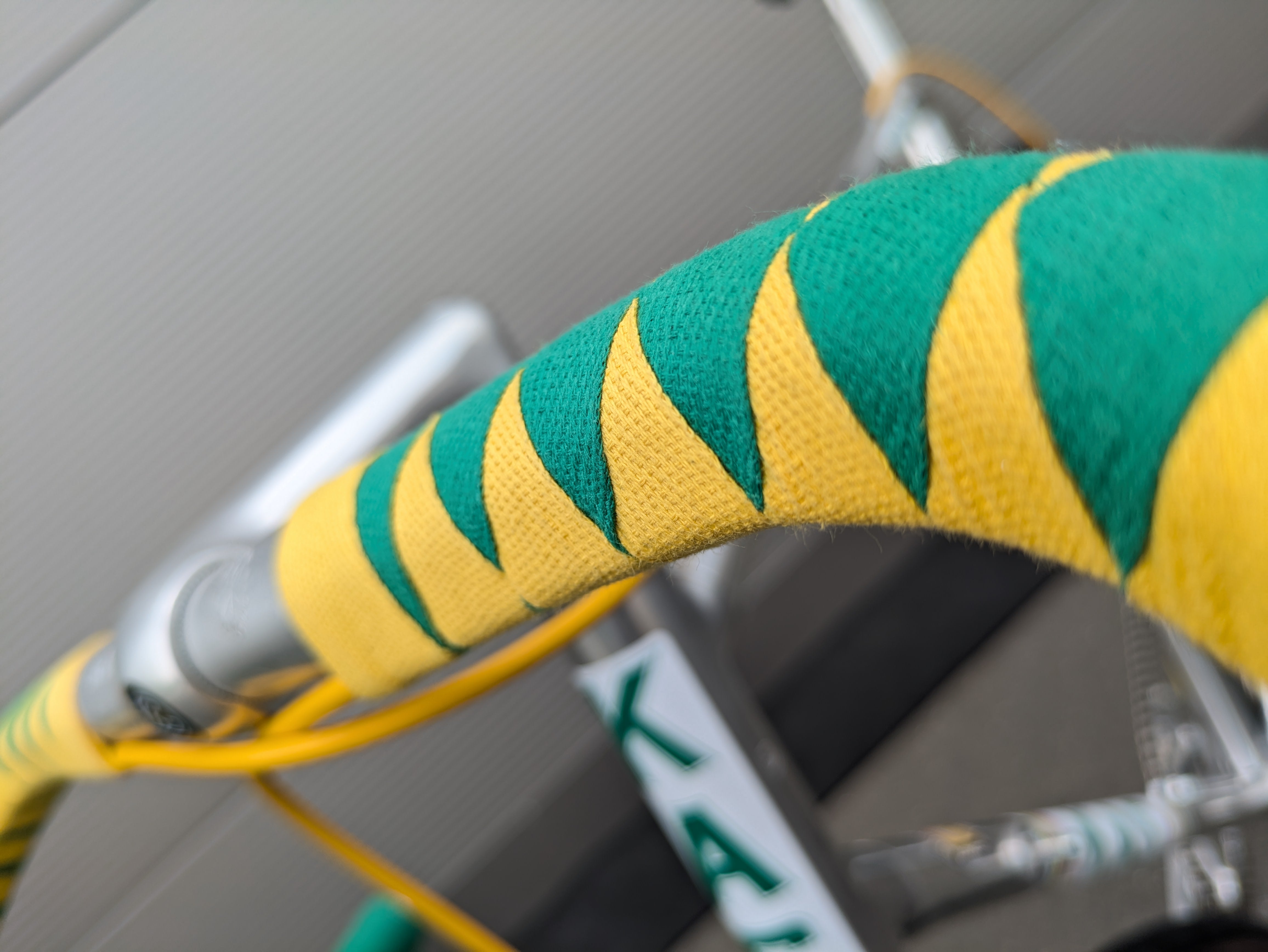 Esta bicicleta de una sola velocidad está construida sobre el legendario cuadro Vitus 979 y ensamblada con esmero y atención al detalle, al estilo del equipo KAS. Las distintivas calcomanías KAS se aplicaron posteriormente, convirtiendo la bicicleta en una réplica fiel del estilo KAS. Cuenta con un manillar de carretera clásico, envuelto en una cinta verde y amarilla estilo Harlequin, un diseño visualmente impactante que requiere una artesanía experta.