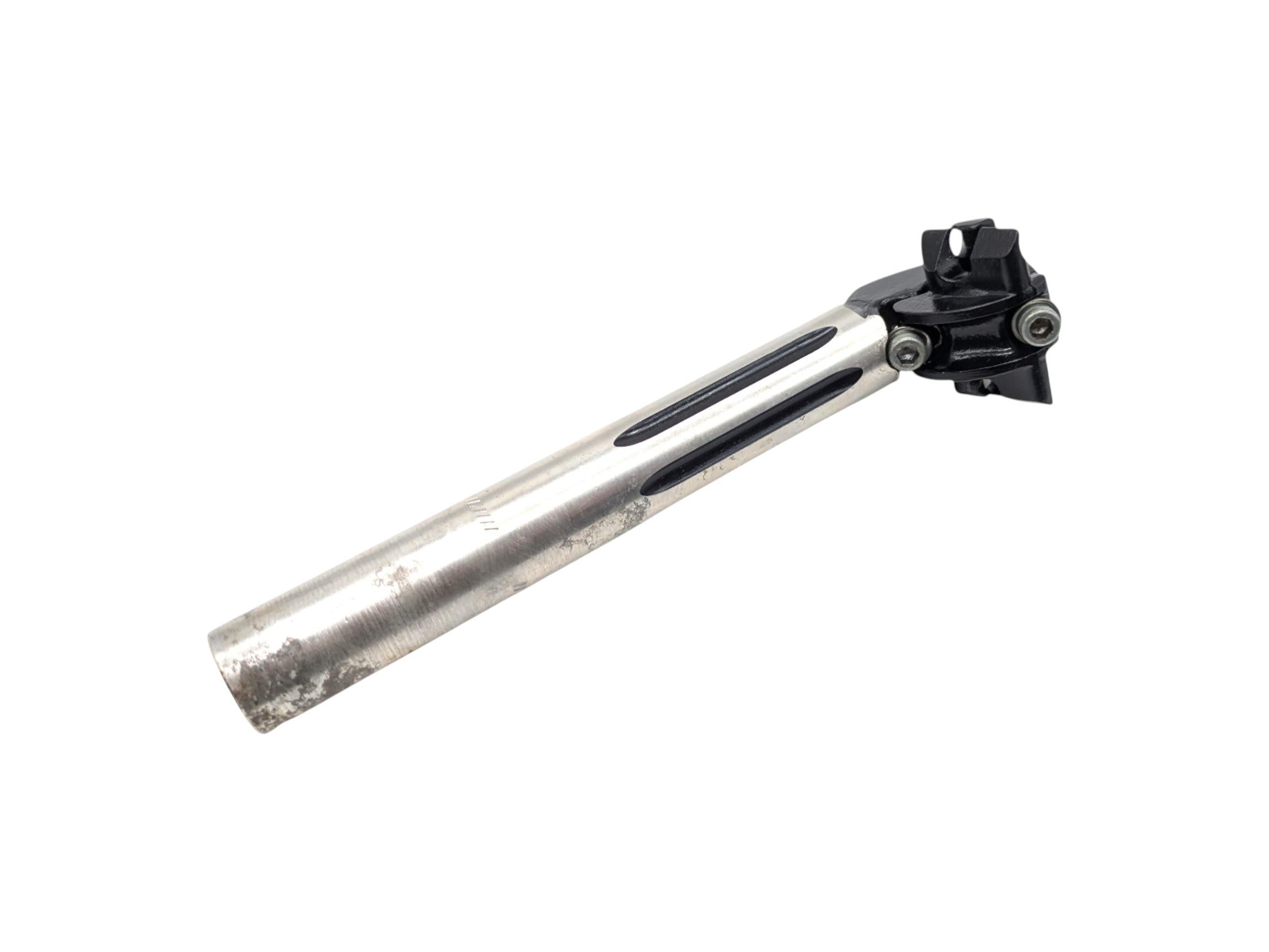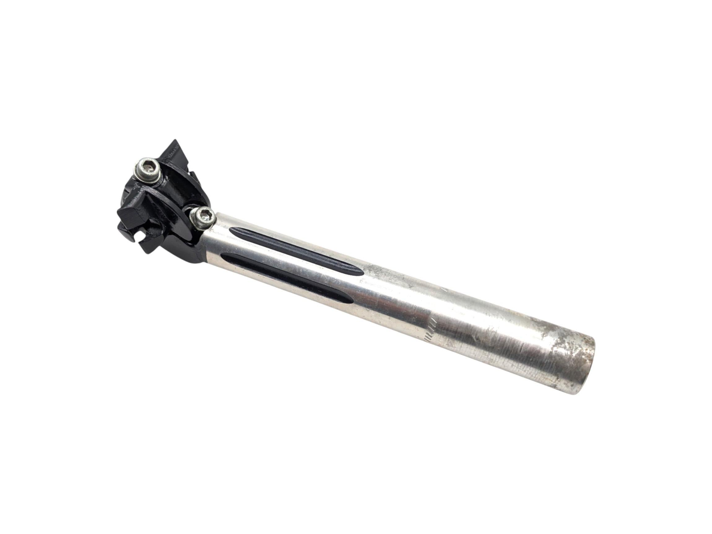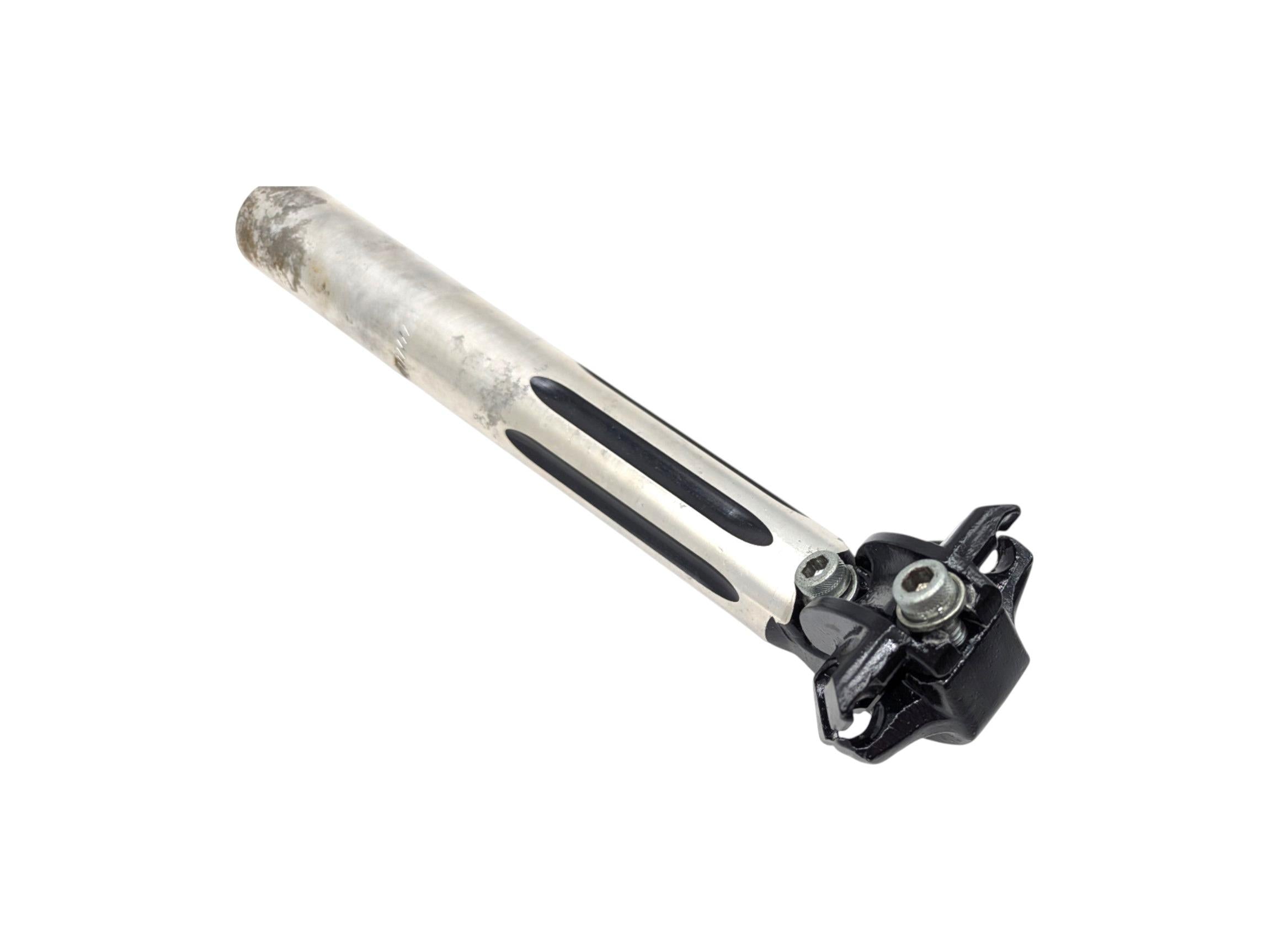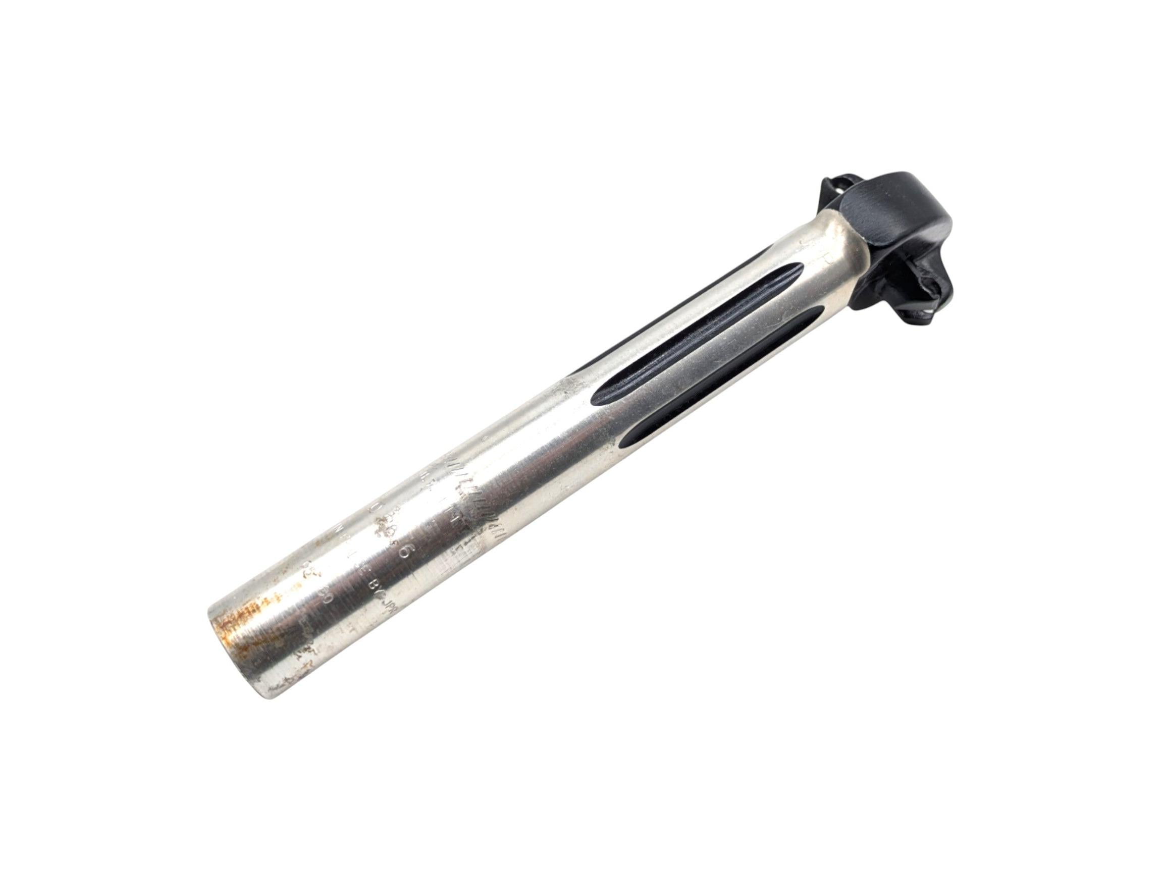 Tija de sillín JPR de 26,6 mm de diámetro y acabado negro/plata. Un componente francés ligero de los años 80, perfecto para cuadros de acero clásicos que requieren esta medida específica.