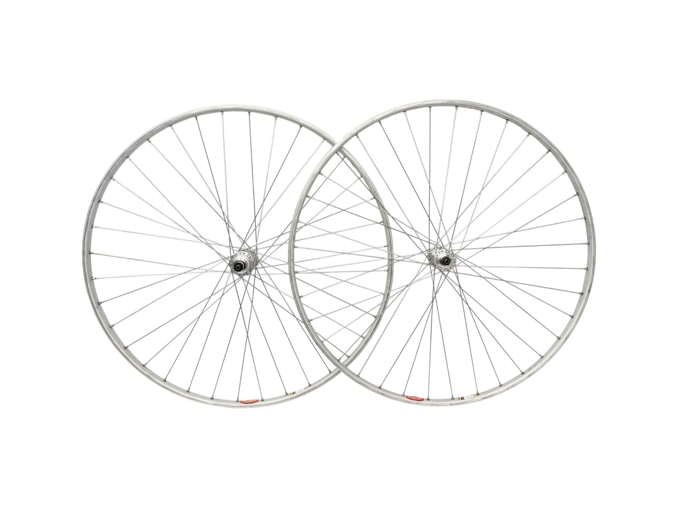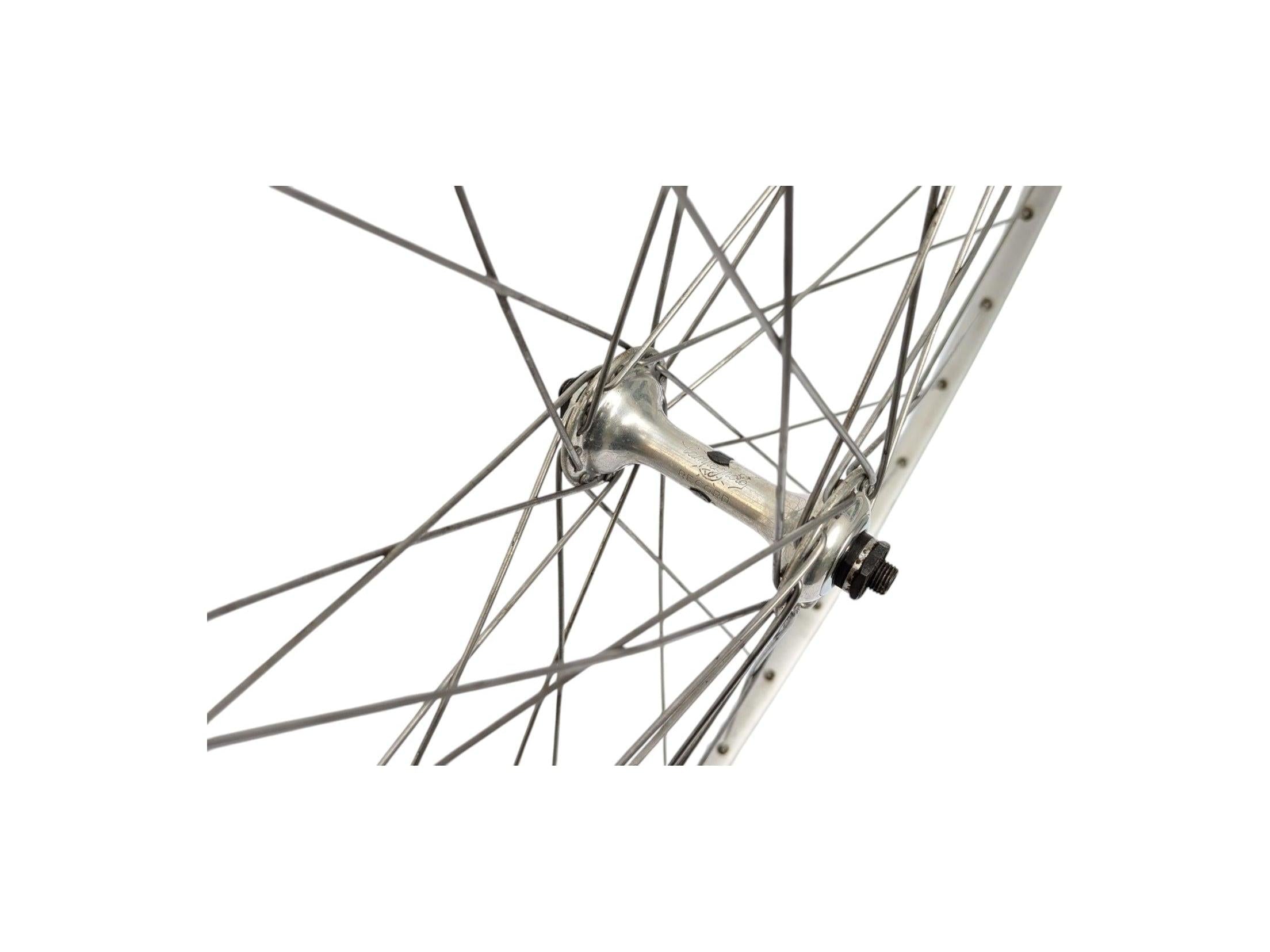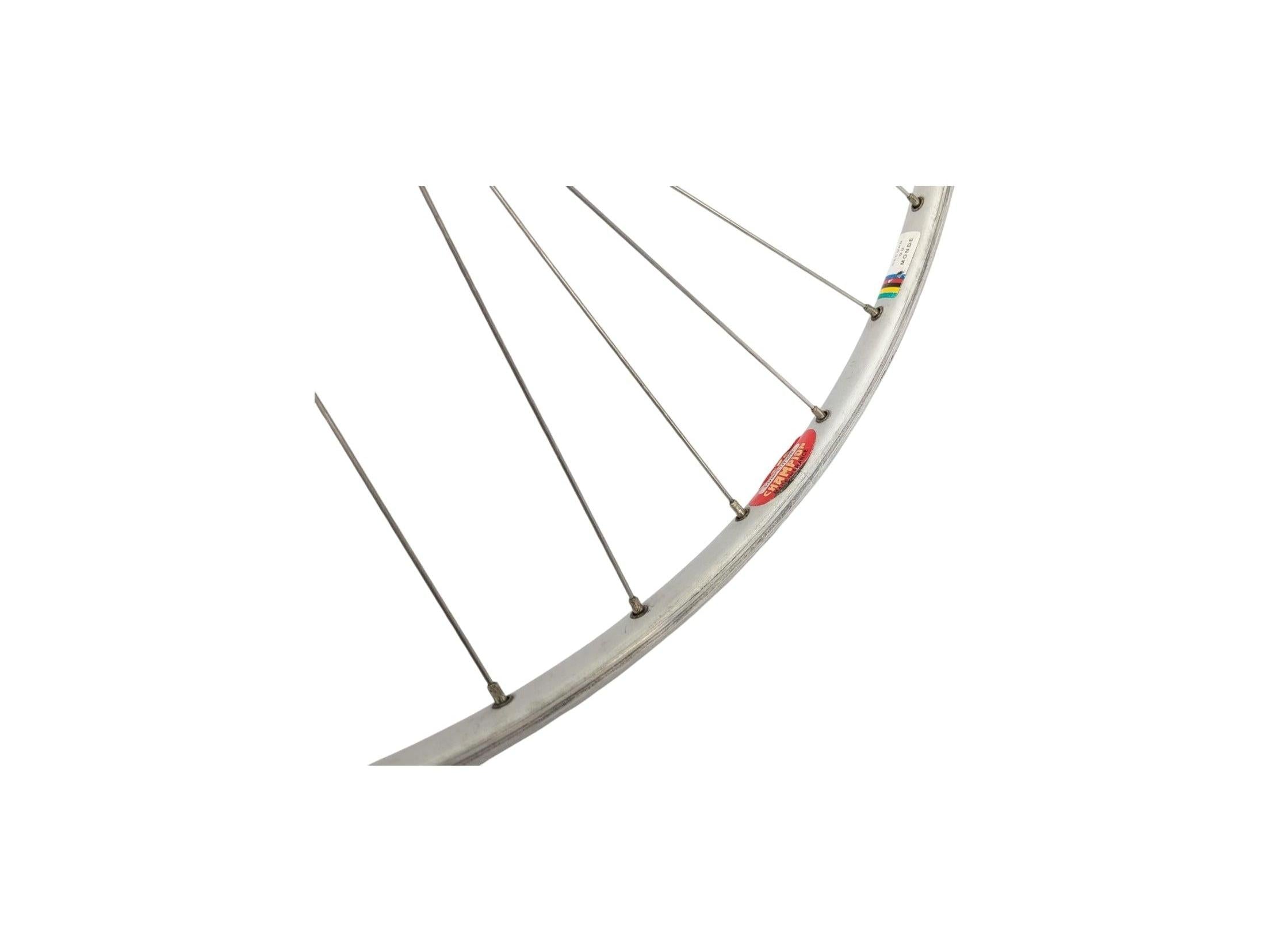 Juego de ruedas Super Champion Competition combinado con bujes Campagnolo Record: una configuración tubular clásica para bicicletas de carretera vintage.